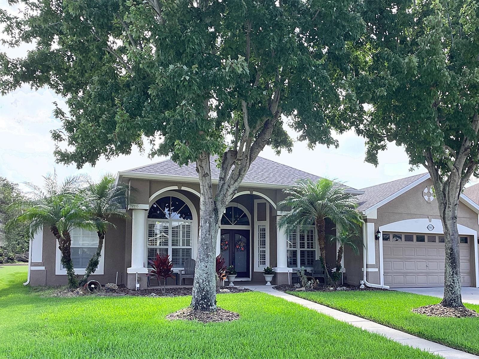 Congratulations!…you found a BIG price reduction and LITTLE HOA at only $257.50 a year! Yes, a YEAR! The CDD bond is all paid off and the maintenance fee of $257 already included in property taxes. New roof installed on 11 /22/23...Algae and stain-resistant architectural shingles rated 130+ mph! with a 40-year limited lifetime warranty. This home is well-maintained and to further ensure your confidence, the owners are offering a Platinum 13-month home warranty! Here is a rare chance to own a a sprawling one-story, 2581 sf Bimini floorplan in the Oaks, located on the 15th fairway of the golf club community - Oaks National. This rare spacious architectural achievement offers amazing sunset views on the wide, deep tranquil rolling expanse of the Oaks National Golf Course. As you enter from the double doors from the huge covered front porch, find the many exquisite design details including plantation shutters, 12 ft. high ceilings in main living area, tray ceilings with crown molding inserts in all three secondary bedrooms, chair rail in living and dining rooms, high bullnose plant shelves with electrical outlets, decorative columns, built-in shelving and gorgeous palladium windows. Enjoy family and friend gatherings in the huge open floorplan while you listen to the hi-tech surround sound system and create gourmet meals from the open kitchen. Kitchen area features a breakfast bar, center island, large pantry, staggered cabinets with crown molding, bottom cabinets with pull out shelving, French door refrigerator, and much more! Feast in the formal dining room or have your casual meals in the nook. Enjoy the great Florida outdoors from the comfort of your large screened lanai featuring security/sunshade screens and two ceiling fans. Tons of storage areas including 2 walk-in closets in the spacious primary bedroom with vaulted ceilings, designer paint and French doors to lanai. The adjoining primary bathroom boasts dual sinks, jetted Roman tub, 5’ x 5’ walk in shower and separate commode area. From the 4 ft. extended garage, enter the Laundry room, featuring built-in ironing board, cabinets and utility sink. AC replaced in 2016 and serviced annually. Outside flowerbed features electrical outlet with indoor switch. 2 gutters also have electrical outlets with indoor switch. The Oaks community features a public 18-hole golf course, tennis and pickleball courts, basketball court, playground and picnic area, optional boat lift and optional RV/boat storage area and many beautiful ponds and landscaping throughout. This must see home is close to local grocery stores, schools, The Loop shopping and dining area, Disney and attractions and Orlando International Airport! So hurry and make this amazing home yours while you can!