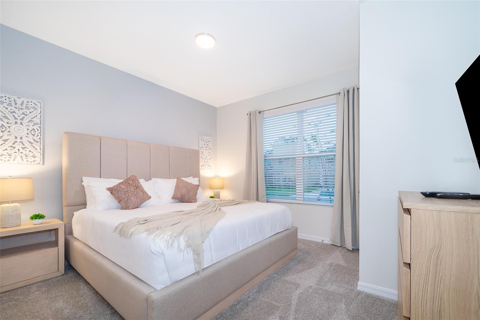 FULLY FURNISHED, beautifully designed, *4 BED / 4.5 BATH* POOL HOME in SOLARA RESORT. This OPEN CONCEPT floor plan, distributed throughout 2,090 SqFt under a/c. Walk in through the front porch and be amazed by this unique TOWN HOME, with ample spaces and an oversized LANAI and POOL DECK. One of the highlights of this floor plan is that it has TWO MASTER BEDROOMS, one is conveniently located on the main floor, and the other one on the second floor. The KITCHEN is equipped with all STAINLESS STEEL APPLIANCES, such as refrigerator with ice-maker and water dispenser, range with glass cooktop, microwave, dishwasher and offers plenty of storage space with its 42" cabinetry and GRANITE COUNTERTOPS. The extended ISLE offers DOUBLE SINK and plenty of sitting spaces. The Kitchen flows into the DINNING ROOM and overlooks the POOL area with sliding doors. This great space that combines kitchen, dinning room and GATHERING ROOM is ideal for friends and family to get together and have a good time! The pool deck area with covered and spacious LANAI offers a large HEATED POOL, screen enclosure and brick pavers. Going up to the second floor, the LOFT is ideal for privacy and is surrounded by the other 3 BEDROOMS. The spacious MASTER BEDROOM with WALK-IN CLOSET offers a bathroom with double vanity with granite counters and stand-up shower with glass enclosure. Within just minutes from Orlando world-famous theme parks and attractions, this community has an extensive list of amenities, from an on-site restaurant and coffee bar to a zero-entry pool, pool bar, fitness center, basketball court, soccer field, volleyball court, gaming stations, playground, splash pad, waterslides and Flowrider.