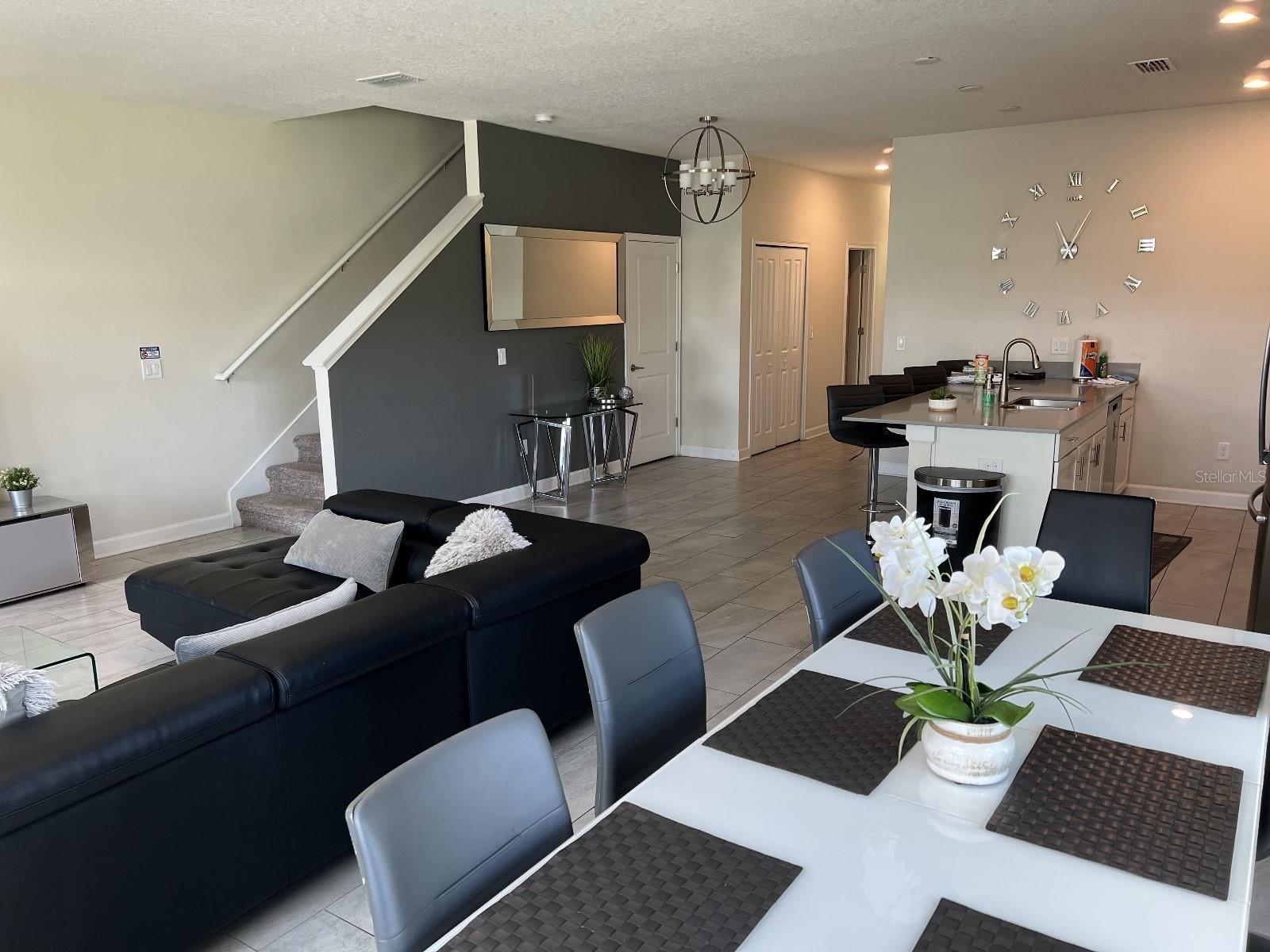 Here's your opportunity to own a piece of PARADISE just 4 miles from DISNEY! This IMMACULATE 5 Bedroom 4 Full Bath Townhome is located in the highly desirable resort community of Storey Lake, is being offered FULLY FURNISHED and is ready to start generating immediate rental income. This amazing property receives consistent rave & glowing reviews in regards to location and condition. The kitchen comes equipped with stainless appliances, granite countertops, breakfast bar and hardwood cabinets with crown moulding. There are two spacious bedrooms located on the first floor as well as a full bath with dual sinks. As you proceed through the living area you walk out onto the screened patio and pool deck with a BBQ Grill and plenty of seating for hours of enjoyment for friends and family. Upstairs you will find the spacious primary bedroom and the two remaining guest bedrooms, one being EN-SUITE. This AMAZING townhome has been optimized for short-term rental, and can also be used as a primary residence or a second home. Fireside Park with picnic tables and a BBQ grill , Storey Lake Resort features the Hideaway Club, a state of the art clubhouse amenities for active families. Amenities include multiple sports courts, a playground as well as a resort-style swimming pool with splash park, Tiki Hut with Pool Bar and a state of the art Fitness Center. This property is just a short walk to those amazing amenities.