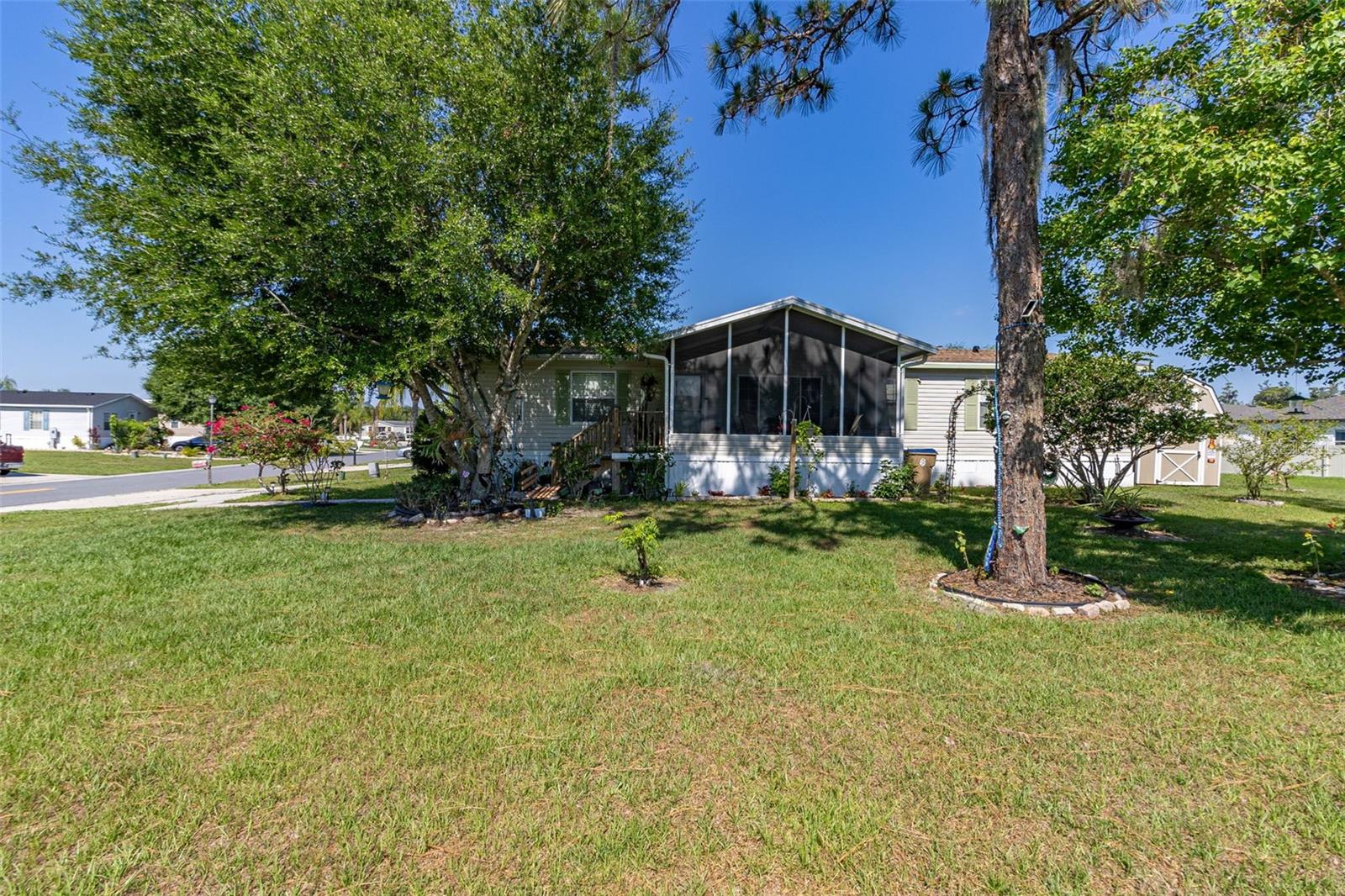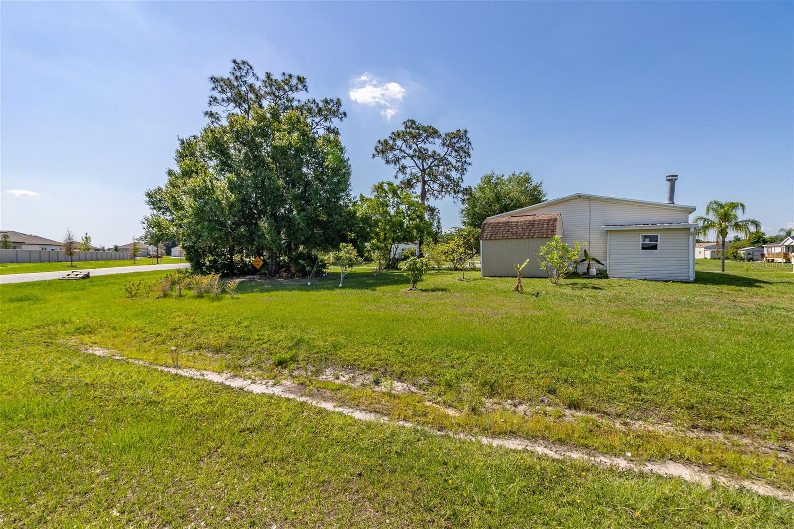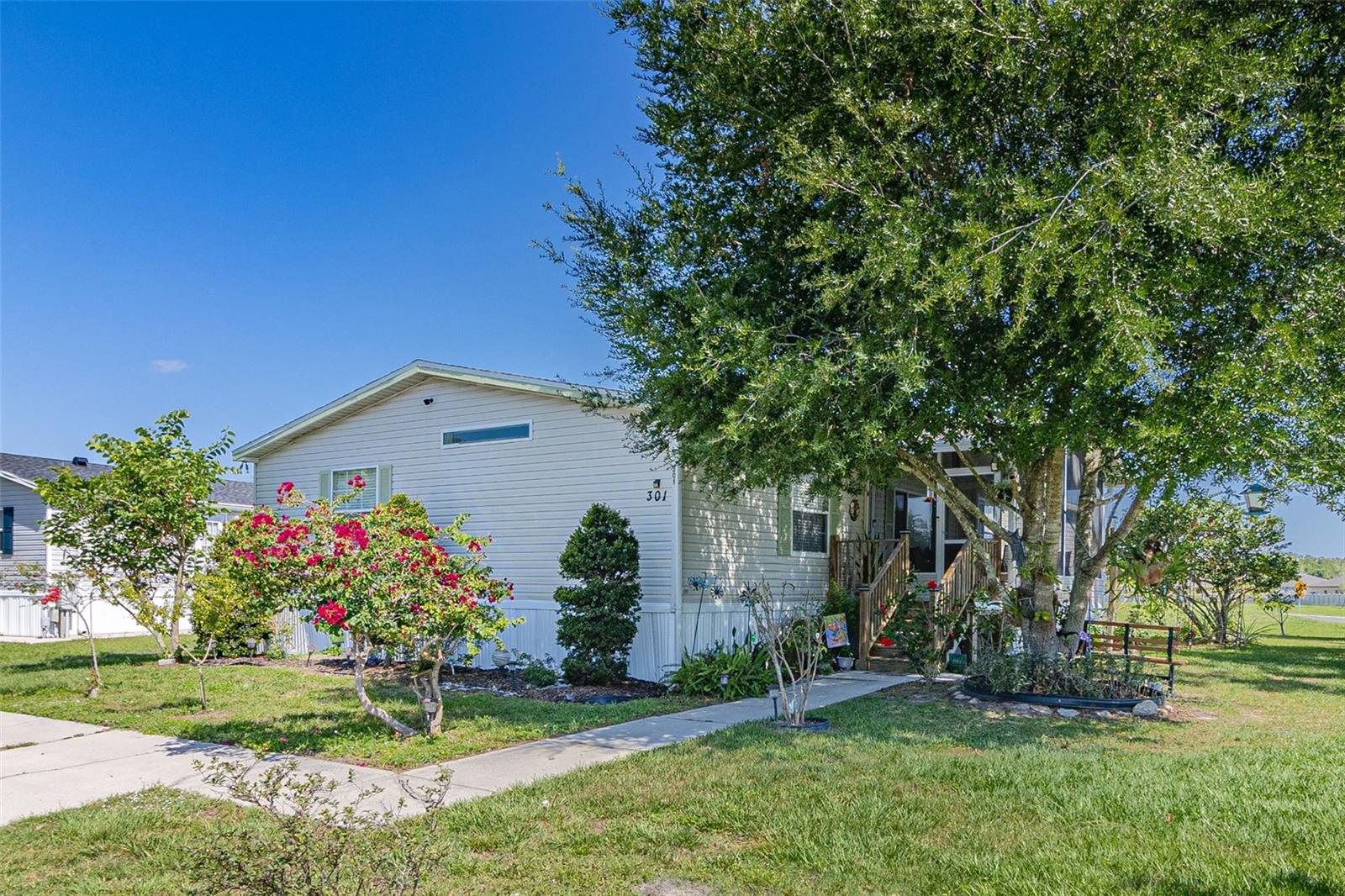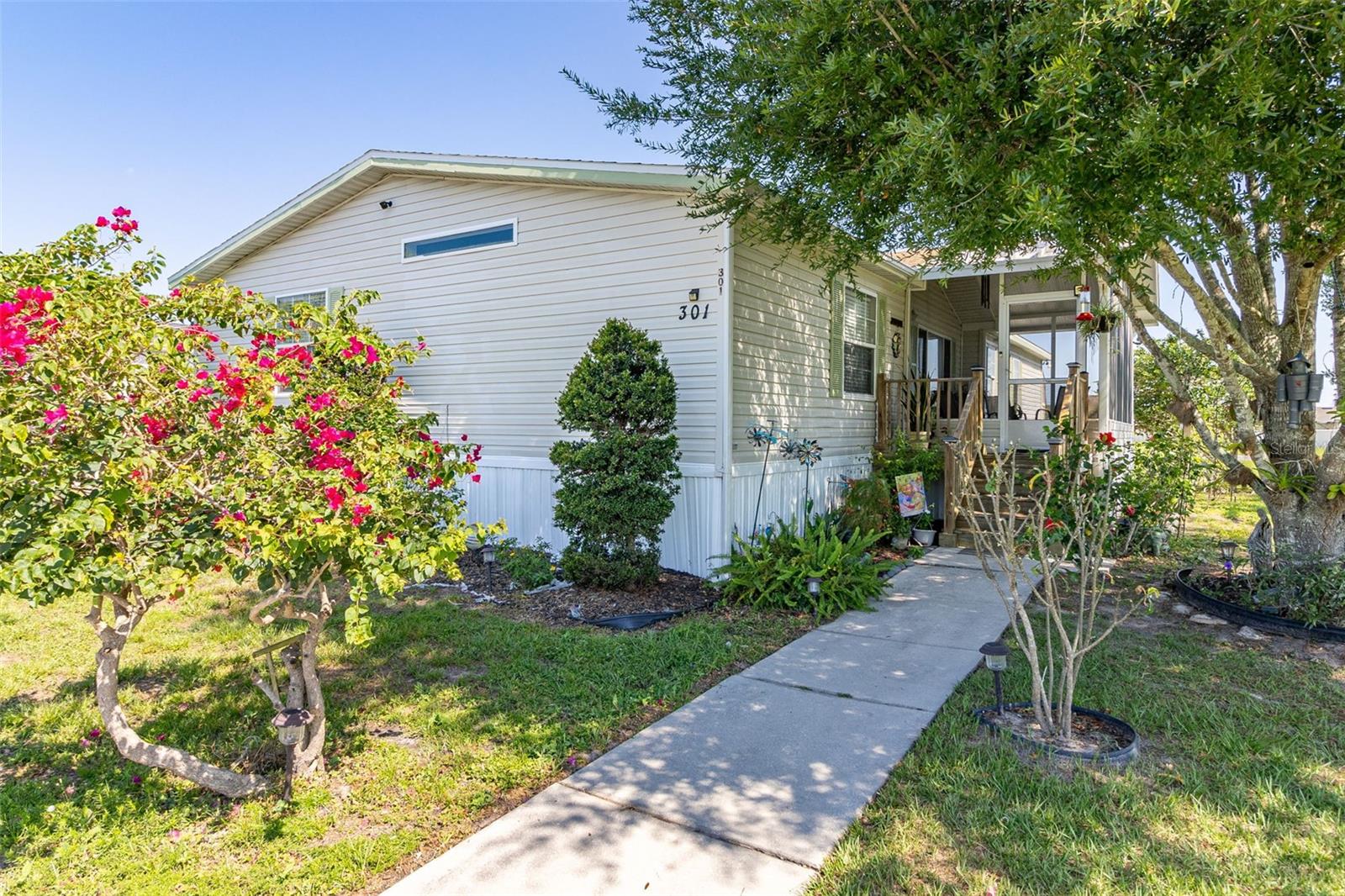 Welcome to this cozy updated home on a Spacious CORNER LOT with beautiful trees! Upon entrance relish in the OPEN FLOOR PLAN with LAMINATE floors and Vaulted Ceilings, updated light fixtures and fans. The flow of living room, dining room, family room and kitchen all in one open space gives you plenty of room for entertaining for you and the family. Having the Screened In Lanai allows expanding the living area, enjoy a morning coffee listening to the birds or relaxing in the evening after a long day. The Spacious kitchen is equipped with gorgeous epoxy countertops (which look like granite or quartz), plenty of White Cabinets with black hardware complimenting the newer black appliances. The WOOD Burning Fireplace with Wallpaper for a Decorative Feature and is a nice touch for those few Florida cold nights furthermore, the Expansive Nook is large enough for those who love the massive Flat Screened TVs. Enjoy the Spacious Primary Suite with a Spacious en suite bathroom, dual vanity, walk in shower and walk in closet. The other 2 bedrooms are at the back of the home with a little office/bonus/study area. With NO Rear Neighbors, enjoy the peace and quite offered on this expansive CORNER LOT with it's fruit trees including Mango, Passion Fruit, Citrus Fruit, Cherry Trees just to name a few. Not forgetting the lovely tropical flower (Orchids do not convey). The roof was replaced in 2020 and gutters and the HVAC in 2020. Additionally, .The backyard features an open space and a shed that conveys with the sale for even more storage. Located close is the Poinciana Sun rail, stores and schools. The community also offers landscaping, lawn maintenance with the HOA dues. This fantastic gem can be delighted in immediately, all this home needs is YOU!