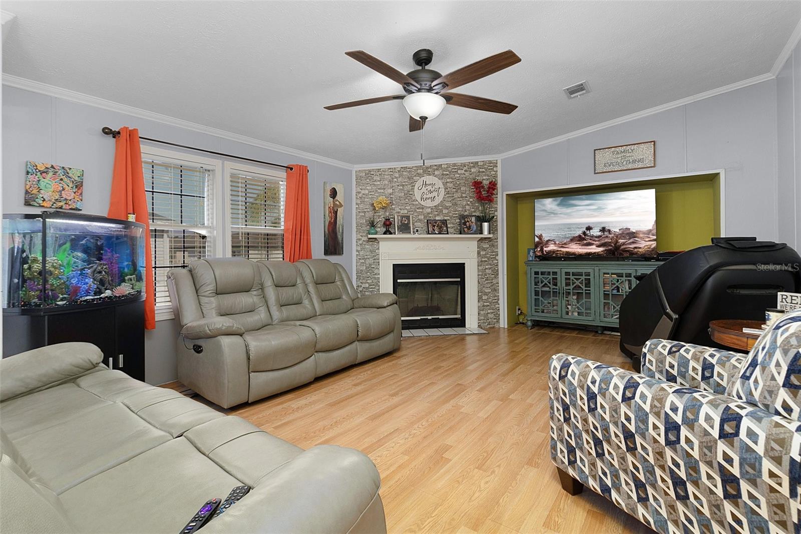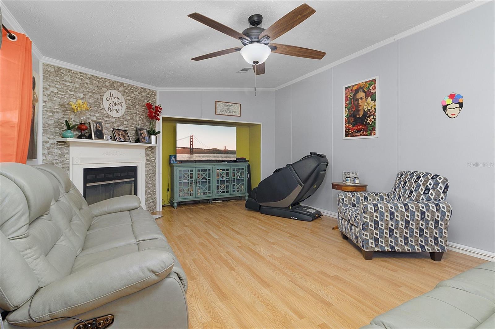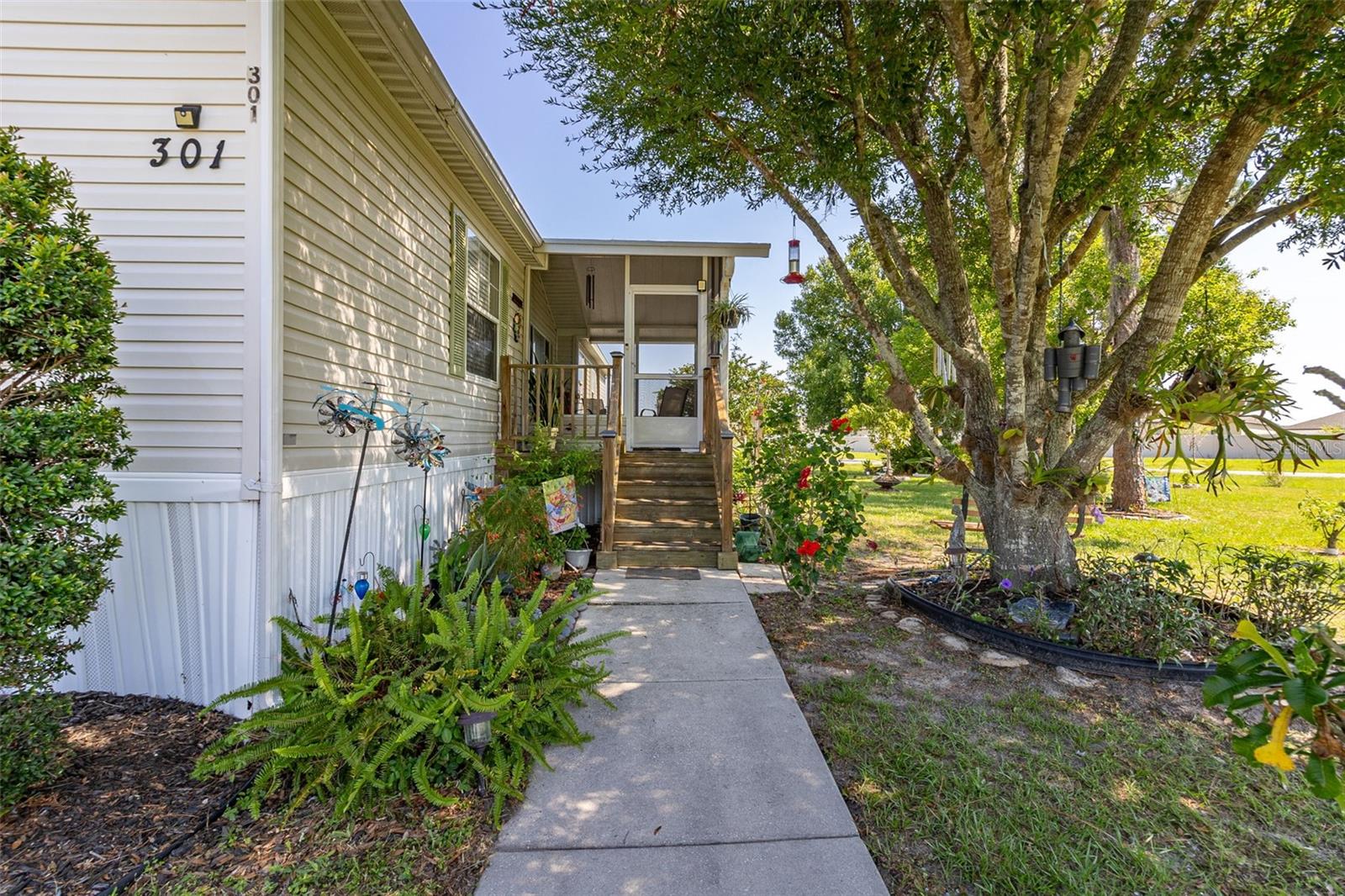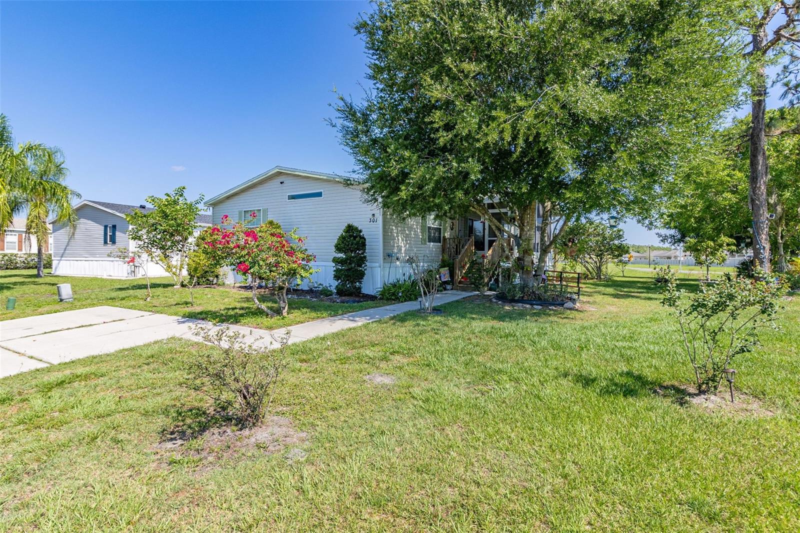 Welcome to this cozy updated home on a Spacious CORNER LOT with beautiful trees! Upon entrance relish in the OPEN FLOOR PLAN with LAMINATE floors and Vaulted Ceilings, updated light fixtures and fans. The flow of living room, dining room, family room and kitchen all in one open space gives you plenty of room for entertaining for you and the family. Having the Screened In Lanai allows expanding the living area, enjoy a morning coffee listening to the birds or relaxing in the evening after a long day. The Spacious kitchen is equipped with gorgeous epoxy countertops (which look like granite or quartz), plenty of White Cabinets with black hardware complimenting the newer black appliances. The WOOD Burning Fireplace with Wallpaper for a Decorative Feature and is a nice touch for those few Florida cold nights furthermore, the Expansive Nook is large enough for those who love the massive Flat Screened TVs. Enjoy the Spacious Primary Suite with a Spacious en suite bathroom, dual vanity, walk in shower and walk in closet. The other 2 bedrooms are at the back of the home with a little office/bonus/study area. With NO Rear Neighbors, enjoy the peace and quite offered on this expansive CORNER LOT with it's fruit trees including Mango, Passion Fruit, Citrus Fruit, Cherry Trees just to name a few. Not forgetting the lovely tropical flower (Orchids do not convey). The roof was replaced in 2020 and gutters and the HVAC in 2020. Additionally, .The backyard features an open space and a shed that conveys with the sale for even more storage. Located close is the Poinciana Sun rail, stores and schools. The community also offers landscaping, lawn maintenance with the HOA dues. This fantastic gem can be delighted in immediately, all this home needs is YOU!