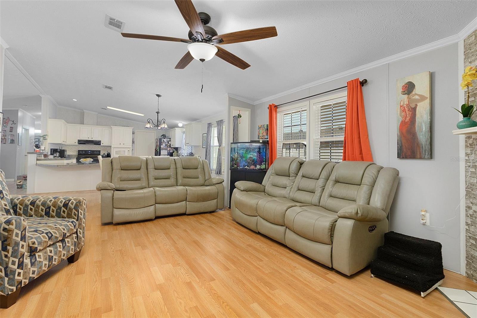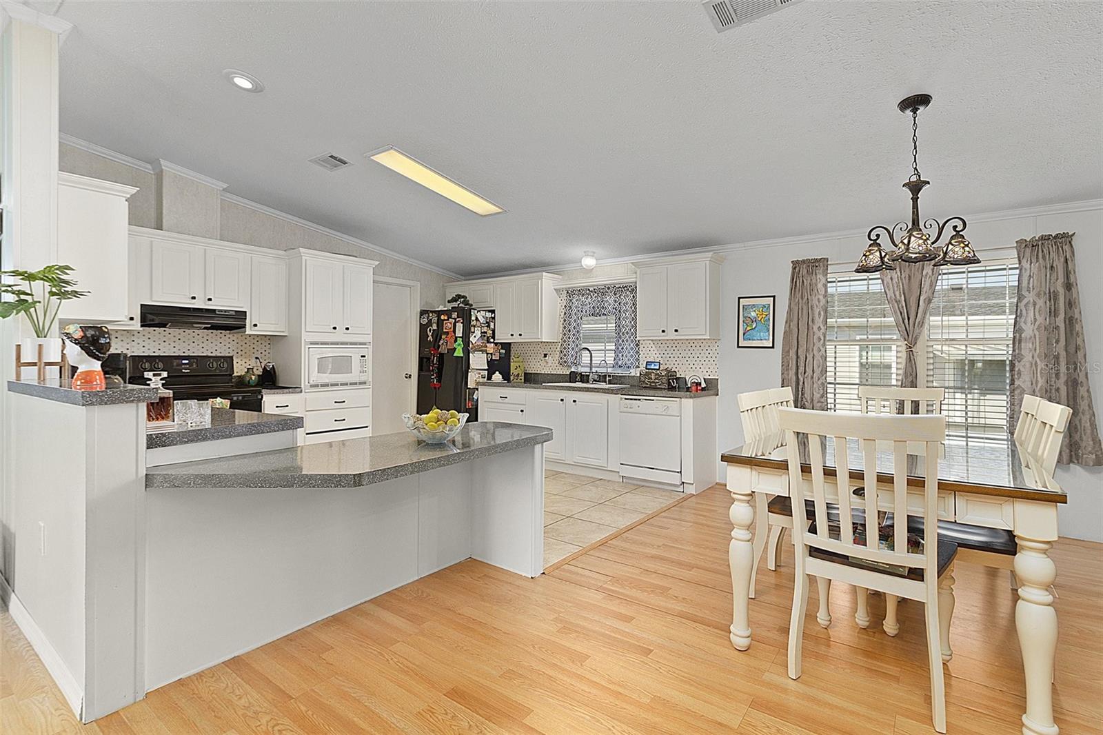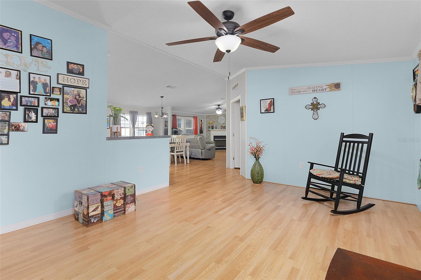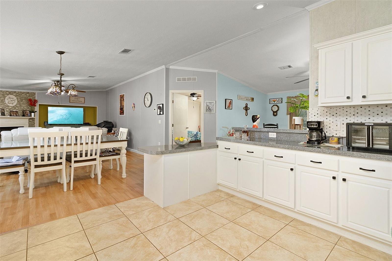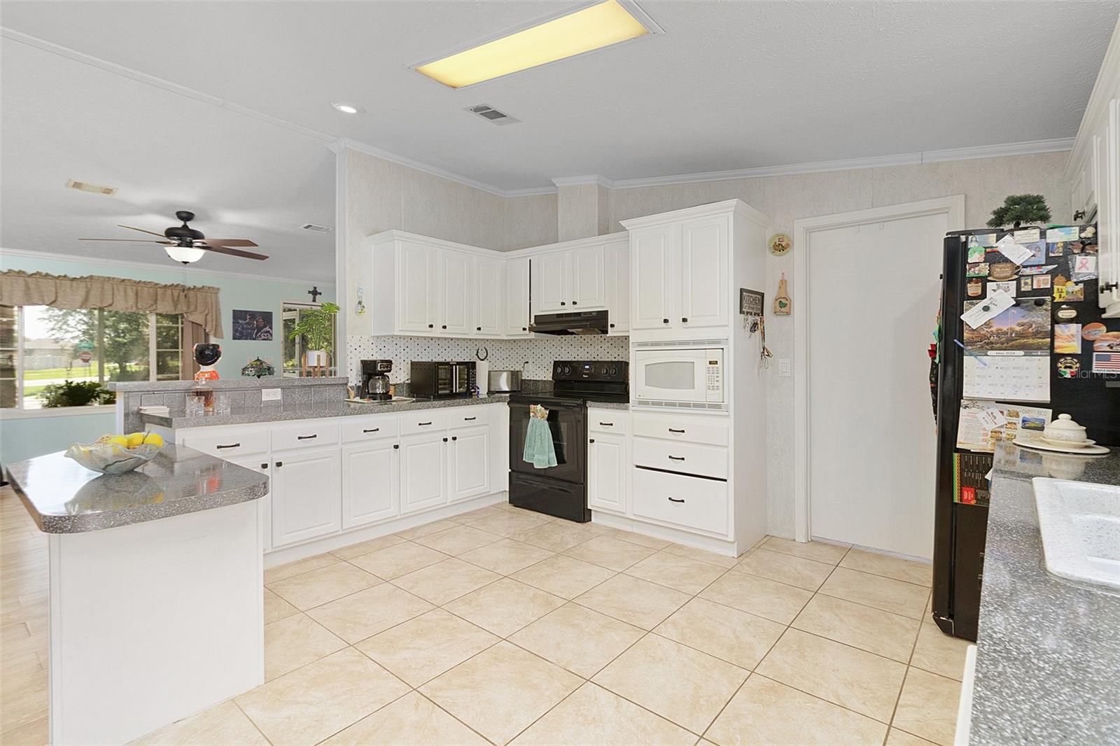 Welcome to this cozy updated home on a Spacious CORNER LOT with beautiful trees! Upon entrance relish in the OPEN FLOOR PLAN with LAMINATE floors and Vaulted Ceilings, updated light fixtures and fans. The flow of living room, dining room, family room and kitchen all in one open space gives you plenty of room for entertaining for you and the family. Having the Screened In Lanai allows expanding the living area, enjoy a morning coffee listening to the birds or relaxing in the evening after a long day. The Spacious kitchen is equipped with gorgeous epoxy countertops (which look like granite or quartz), plenty of White Cabinets with black hardware complimenting the newer black appliances. The WOOD Burning Fireplace with Wallpaper for a Decorative Feature and is a nice touch for those few Florida cold nights furthermore, the Expansive Nook is large enough for those who love the massive Flat Screened TVs. Enjoy the Spacious Primary Suite with a Spacious en suite bathroom, dual vanity, walk in shower and walk in closet. The other 2 bedrooms are at the back of the home with a little office/bonus/study area. With NO Rear Neighbors, enjoy the peace and quite offered on this expansive CORNER LOT with it's fruit trees including Mango, Passion Fruit, Citrus Fruit, Cherry Trees just to name a few. Not forgetting the lovely tropical flower (Orchids do not convey). The roof was replaced in 2020 and gutters and the HVAC in 2020. Additionally, .The backyard features an open space and a shed that conveys with the sale for even more storage. Located close is the Poinciana Sun rail, stores and schools. The community also offers landscaping, lawn maintenance with the HOA dues. This fantastic gem can be delighted in immediately, all this home needs is YOU!