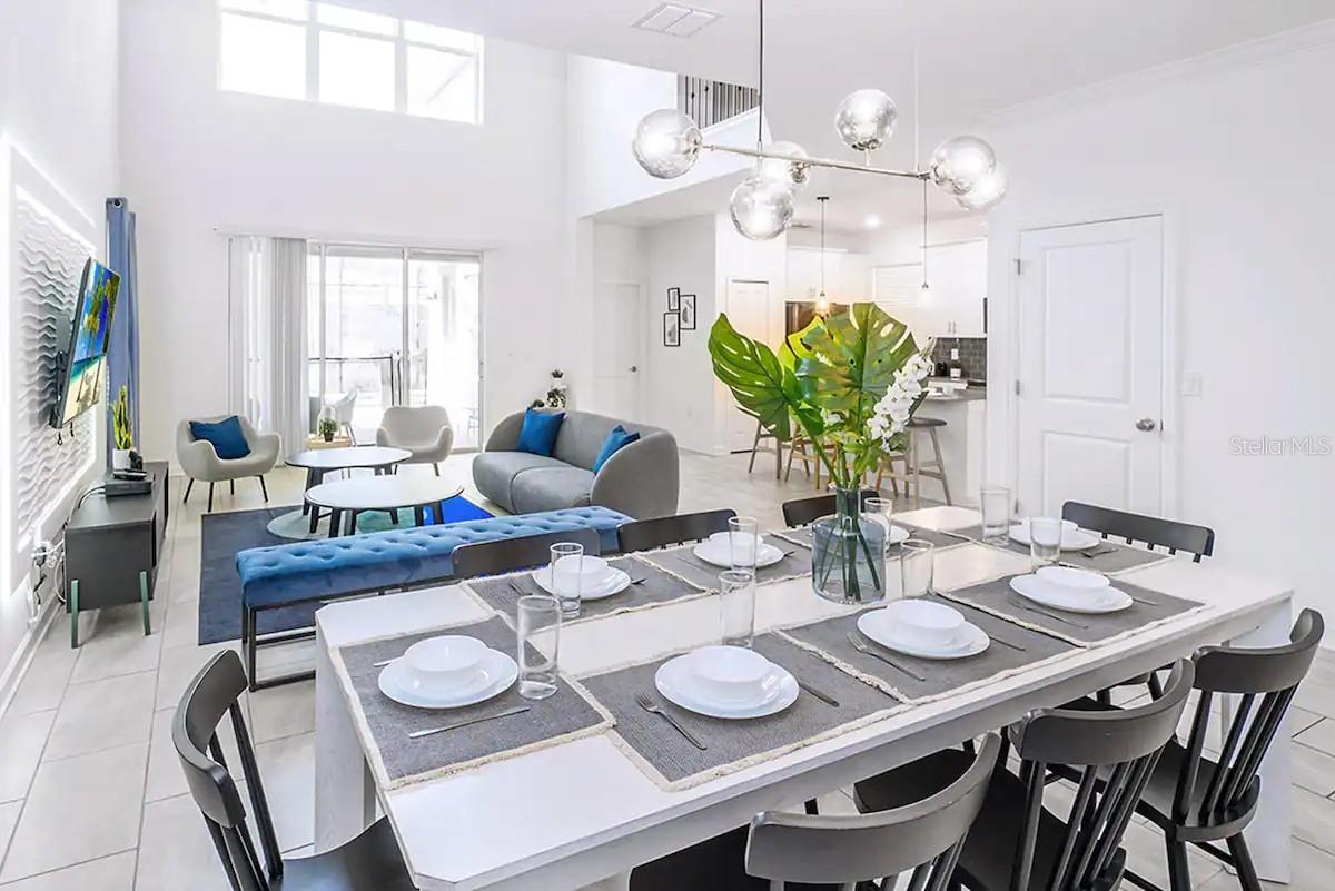 Beautiful and stylish fully furnished 5 bedroom, 5 bath, 2996 sq. ft. house with private pool and Jacuzzi located in the exclusive Cove at Storey Lake Resort gated community. Designed for entertainment and leisure time with high quality materials, the house features a spacious family room with dining area open to kitchen with center island and breakfast bar. Master suite and one bedroom are located on first floor. Large loft on the second floor is set up as a second family room central to the 3 other bedrooms, one of which is an additional master. Screened pool deck with covered eating and lounging area. Game room themed as THE MARVEL AVENGERS in the one-car garage. Laundry room adjacent to kitchen. Tile flooring on first floor, carpet on second floor and stone countertops throughout. Extensive community amenities including a large clubhouse with bar, resort pool with lazy river, water slide, splash pad and mini-golf. Also fitness center, volleyball and basketball courts, cook-out area and dock with kayak rentals. Just minutes from Disney and other attractions, restaurants and shopping. Short term vacation rental permitted which allows for a great income opportunity. Seller offers $5,000 toward closing costs.