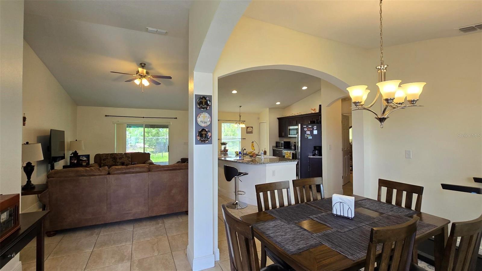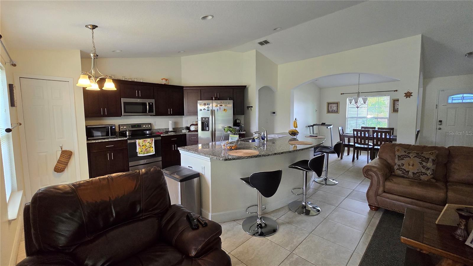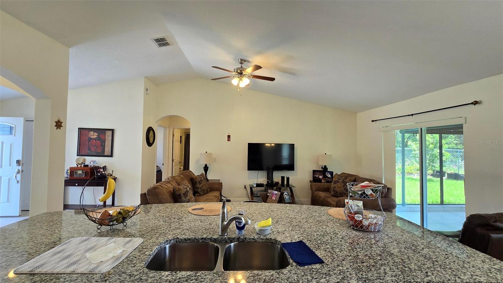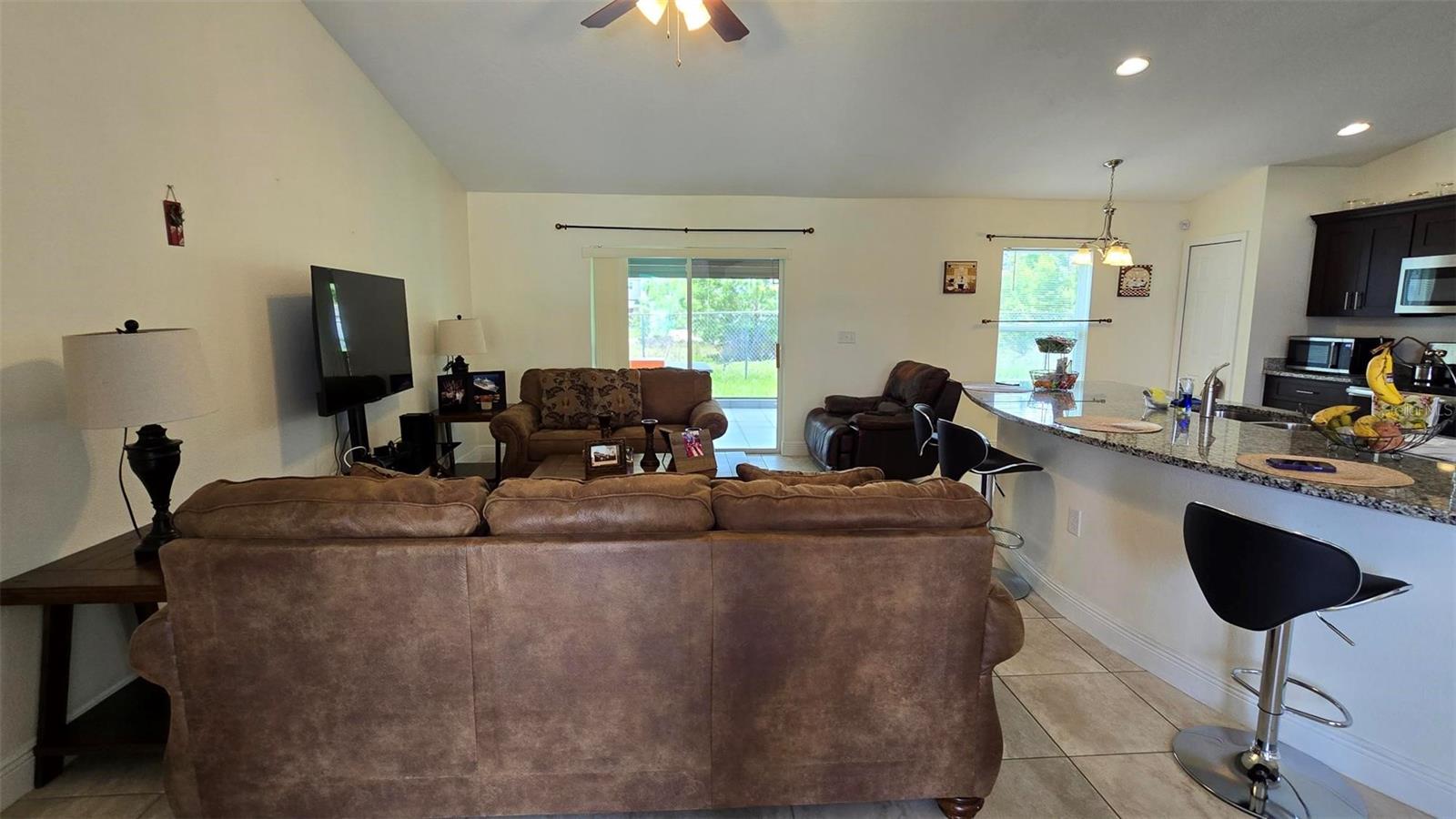 Welcome home to this immaculate, beautiful, and upgraded residential property boasting solar panels, a huge granite kitchen island, and dark wood cabinets. As you walk up to this home you are greeted with gorgeous flowers and impressive greenery that lead you to the covered front porch and through your front door into the foyer and dining room. As you walk inside, you quickly feel comfortable in this home's spacious and inviting open concept layout overlooking the conservation in the backyard. Continue the tour through the arched hallway to the large owner's suite, featuring elegant tray ceilings, dual vanities, his and her walk-in closets, and a separate standing shower and garden tub. Additional beauty lies in the vaulted ceilings, ceramic tile flooring throughout entire house, a large family room, and a grandiose kitchen great for cooking and entertaining. The yard is completely fenced and has mature landscaping including tons of pineapple trees, an olive tree, peach tree, and other herbal plants. Great location in Poinciana near schools, medical centers, hospital, shopping, plus easy access to Haines City and Davenport. With the solar powered low electric cost of only about $40 per month and being constructed only 7 years ago, this home is sure to be energy efficient and low maintenance for many years, saving the new homeowner a lot of money! The rear cozy screened in porch, rain gutters, sprinkler system, and long driveway make this home complete and move in ready! Additionally, the HOA is low and has cable and internet included, plus association amenities such as beautiful pools, tennis courts, clubhouse and so much more! Great primary home or rental investment! Ask about special financing opportunities available. Call to inquire and see this gem for yourself today! “This home can be purchased with no money down”.