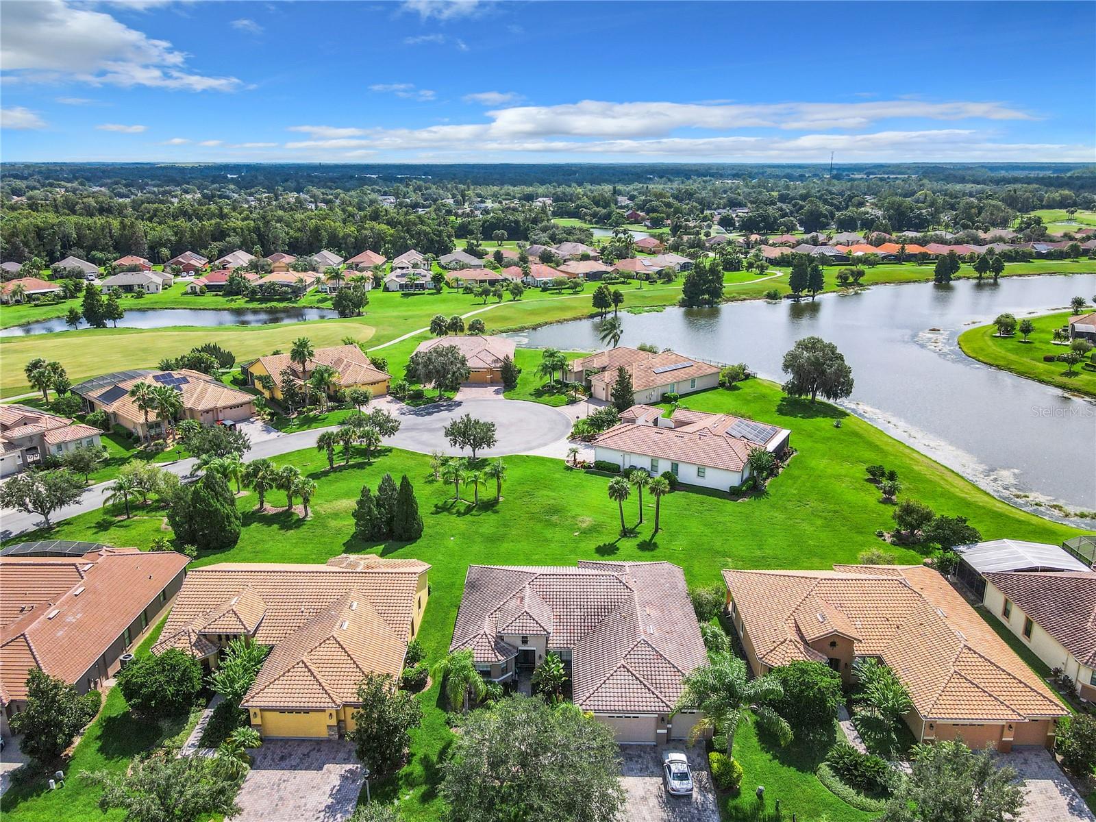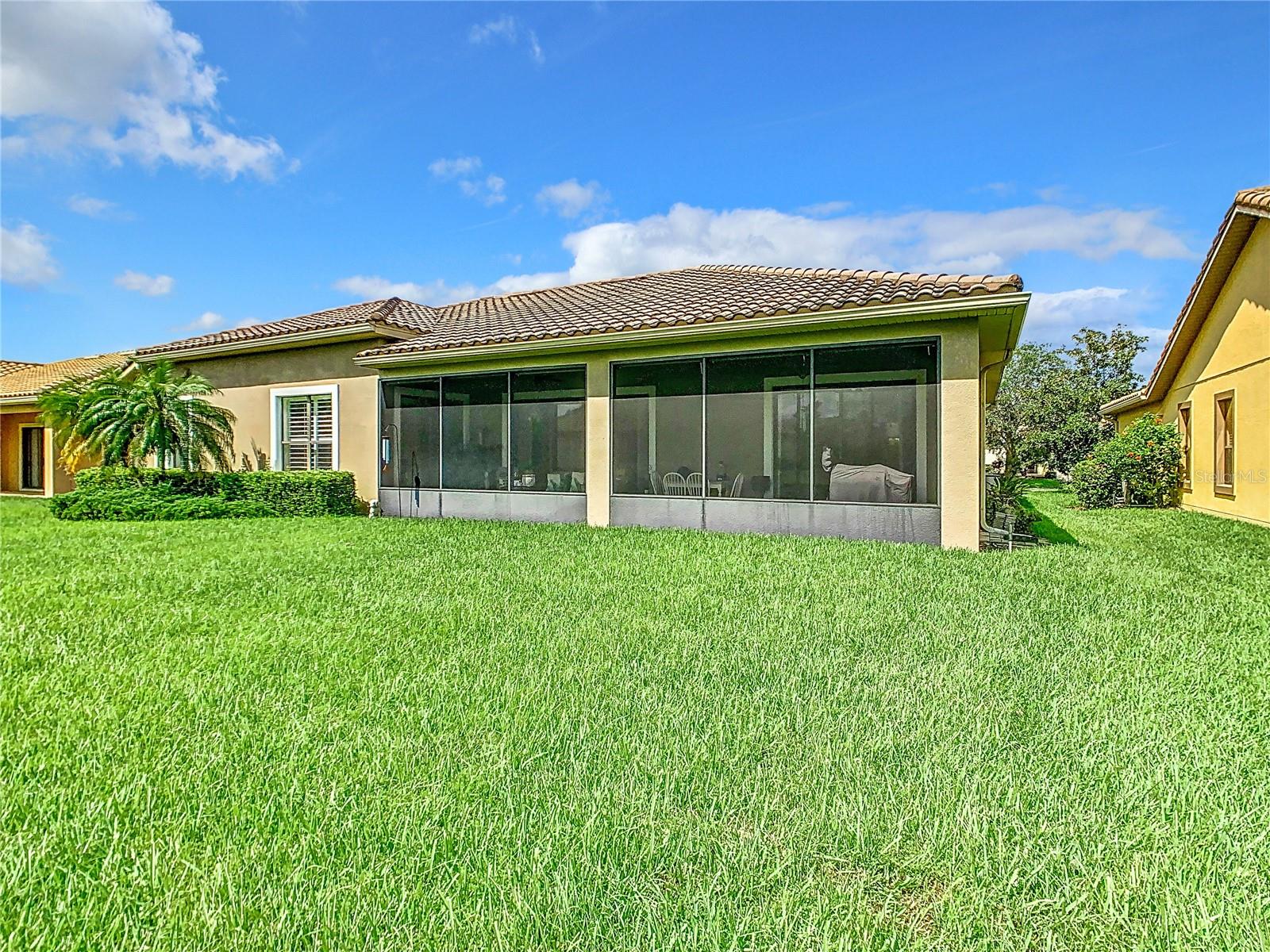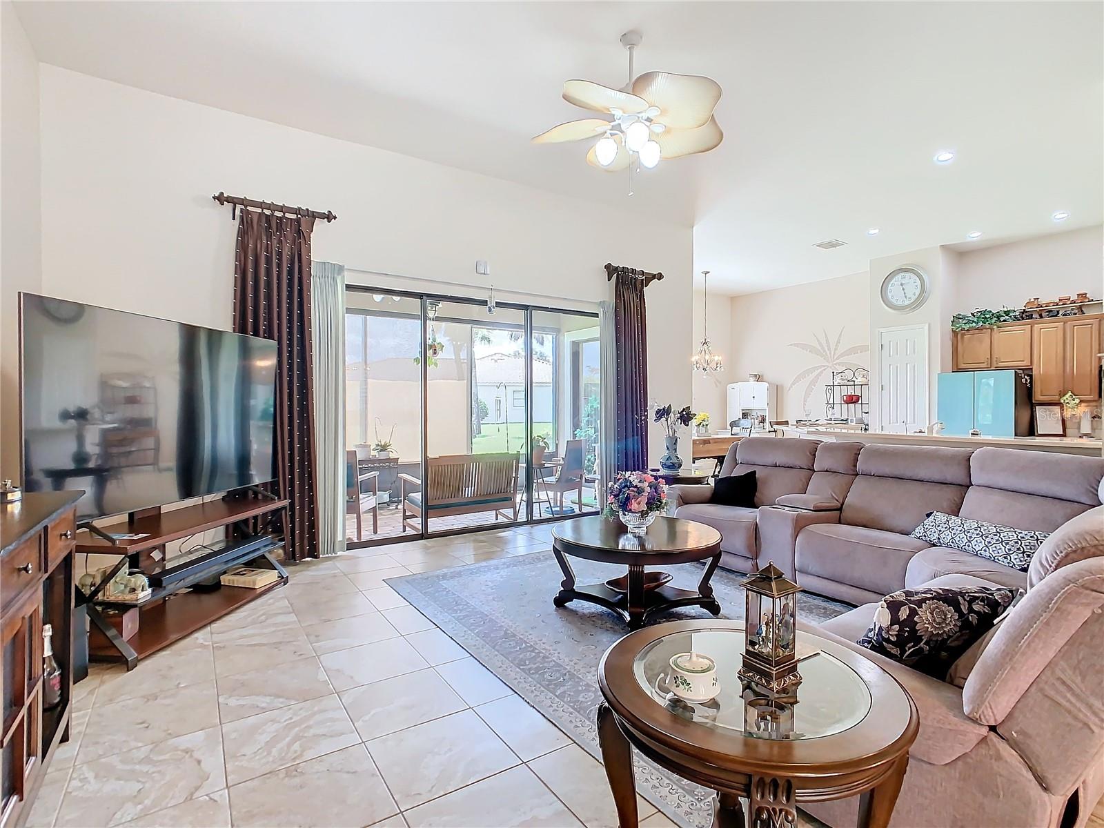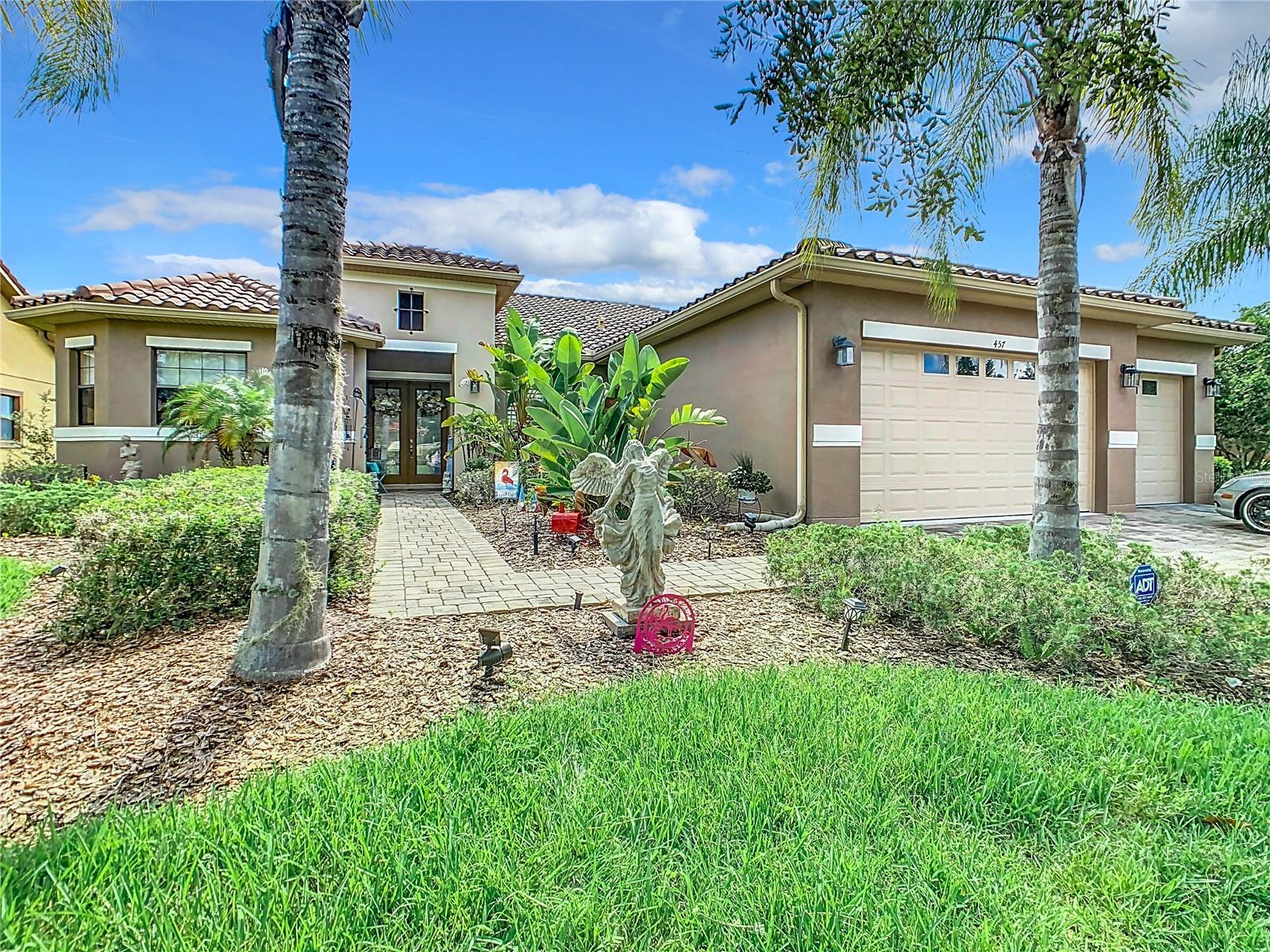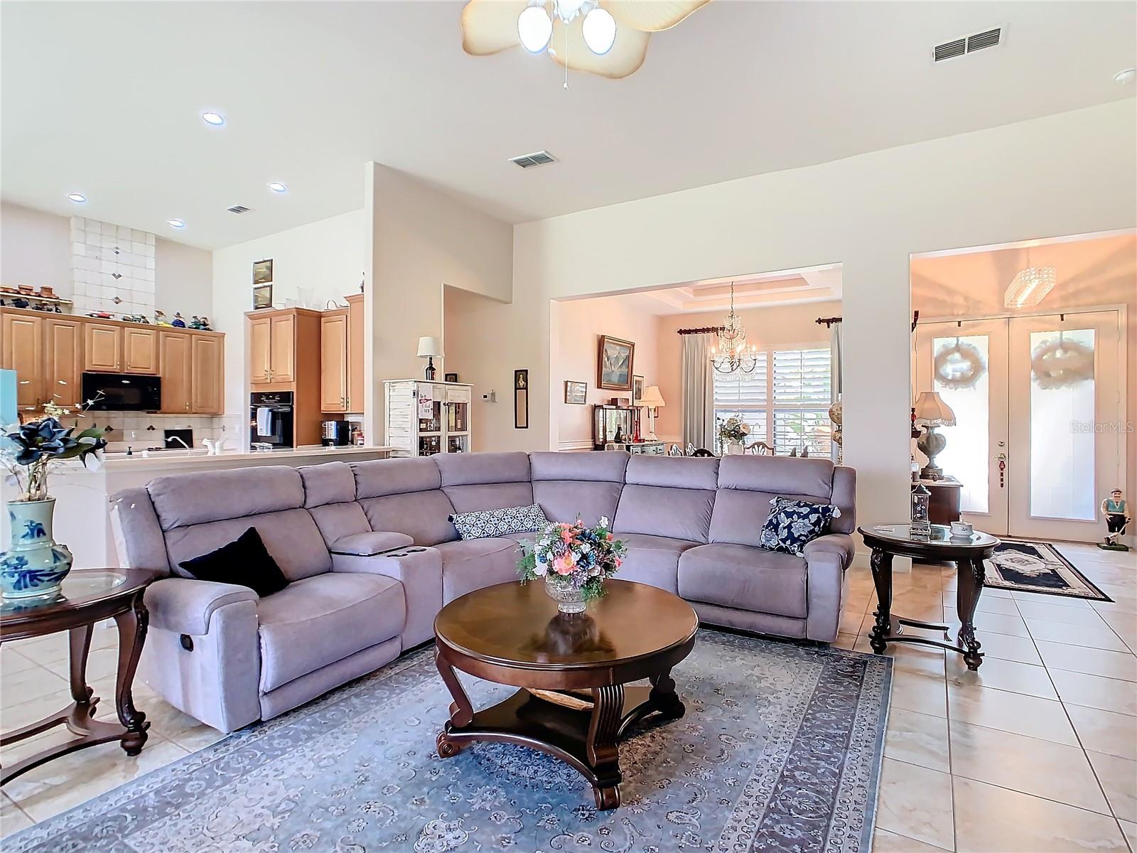 MOST POPULAR VENETIAN MODEL, located in the Bella Viana Neighborhood of Solivita. This LARGE, lovely, open concept floor plan, with 2580 air conditioned sq ft, has 3 Bedrooms plus Den, 3.5 baths, OVERSIZED 3 CAR GARAGE and overlooks a palm tree landscaped grassy area! This home welcomes you with double glass insert French doors. Once inside, you’ll love the open concept! Large Gourmet Kitchen features double oven and cooktop, 42” cabinets with lower pullouts, Corian counters and tile backsplash. Lots of cabinets for storage!!! Breakfast Bar plus Large Breakfast Nook. Separate Dining Room with tray ceiling and chair rail. The Primary Bedroom features a tray ceiling and blackout shades. The Ensuite Bath has dual vanities, a walk in shower with separate tub, linen closet and dual custom designed closets. Sliding glass doors from the Nook and Great Room lead to the covered, screened Lanai. The laundry room has a built-in sink, cabinets, and shelves for extra storage. Upgraded lighting throughout. The two Guest Bedrooms have private baths and the Powder Room is conveniently located off the living areas. The garage has side entry door and includes 2 refrigerators. Some wonderful options are 8’ doors, rounded corners, 5 ¼” baseboards, tile floors in the main living areas with carpeting in the bedrooms and den. Plantation shutters throughout the home. There is a Whole House Water Softener. The exterior of the home was painted in April 2021. 6 month home warranty included. Solivita is an Award Winning, Master Planned and Gated 55 Plus Golf Cart Community in Central Florida. 4,300 acres of pure luxury with ponds, conservation, 2 18 Hole PGA Golf Courses, tennis and pickleball courts, 14 temperature controlled pools, 2 State of the Art Amenity Centers complete with trainers, classes and the latest equipment. Play softball, horseshoes or bocce ball. Solivita has something for everyone! A downtown Village Center with restaurants, activities, a hometown pharmacy/sundries store, library, art studio, meeting rooms, and a pro shop. Enjoy top notch entertainment in the ballroom or take a class or a seminar at Solivita University. Ride your golf cart to the park, enjoy the butterfly garden or grow veggies in the community garden. You can take at golf lesson at Stonegate Golf Club, drive balls at our aquatic driving range or take your “best friend” to the dog park. Join any of over 200 clubs, visit with friends and neighbors. Solivita is convenient to shopping, houses of worship and a great place to live. Don’t wait…schedule an appointment to see this home today and start enjoying the Solivita Lifestyle!