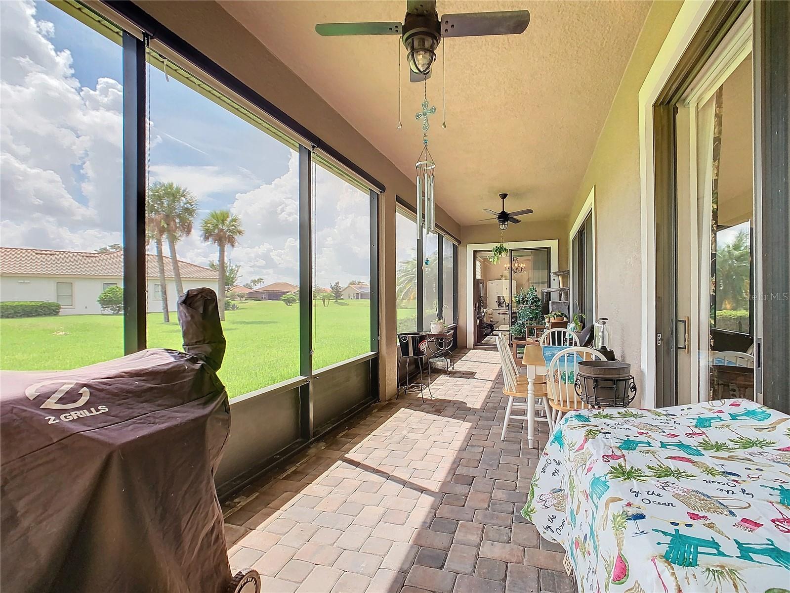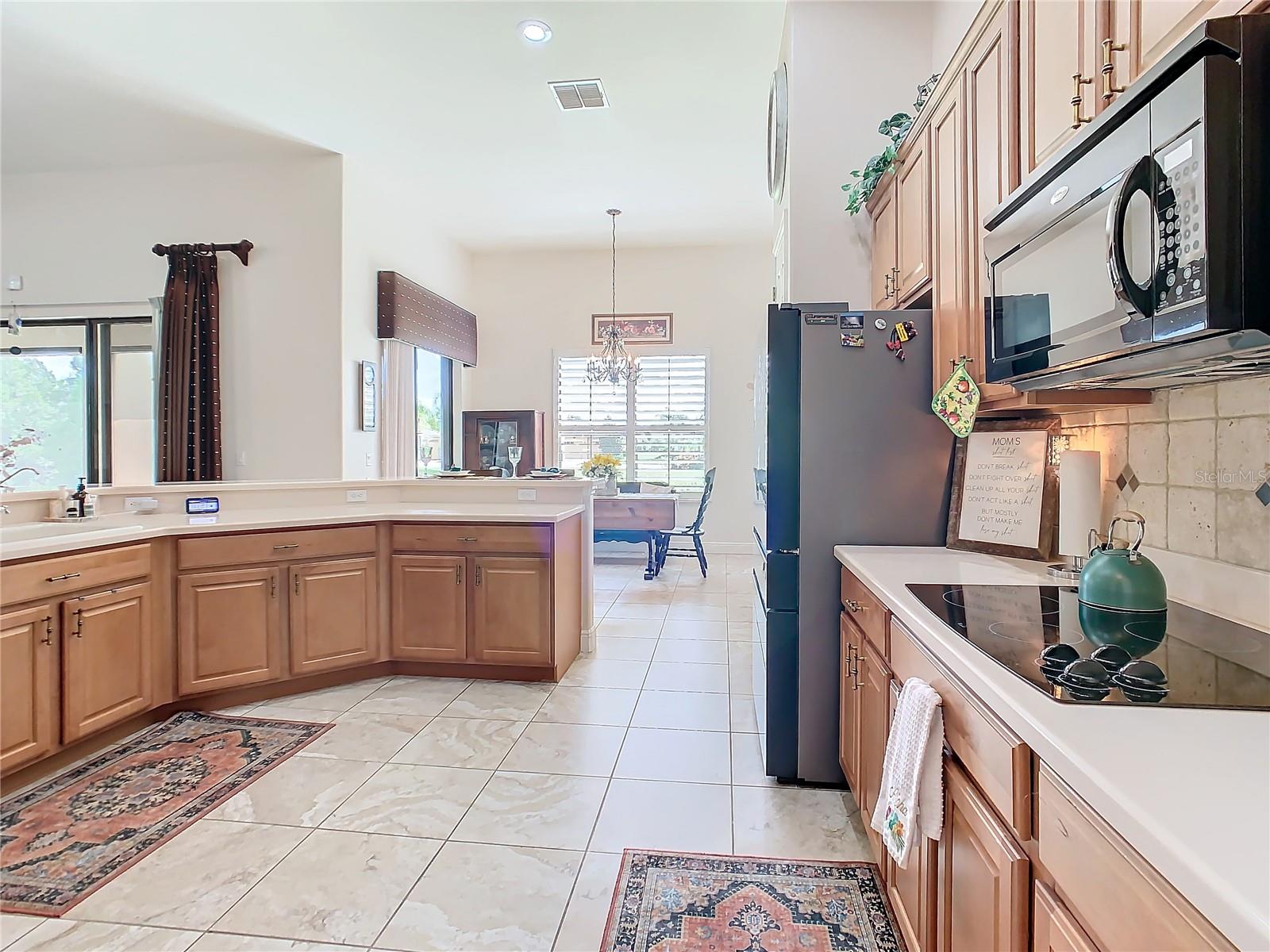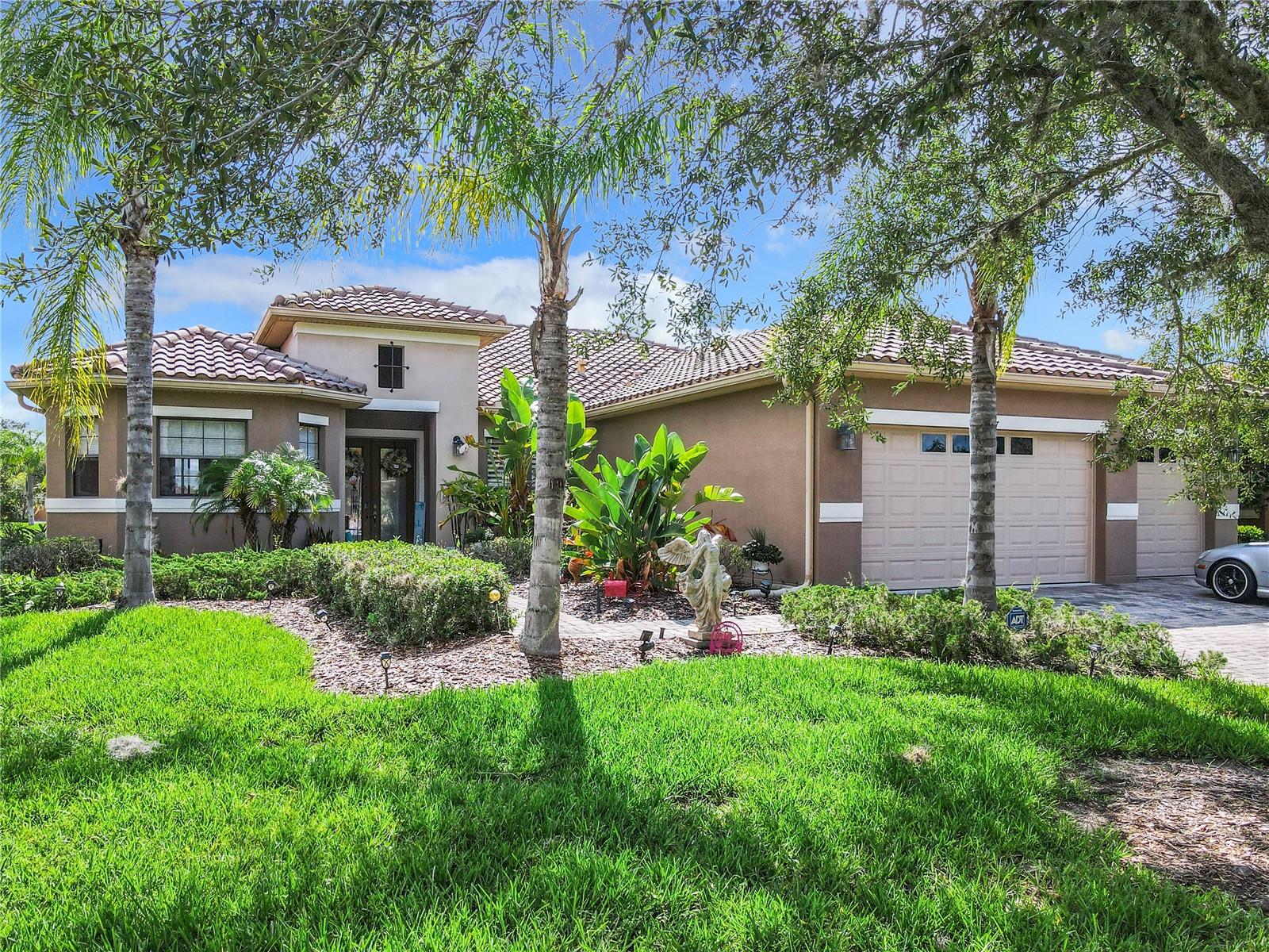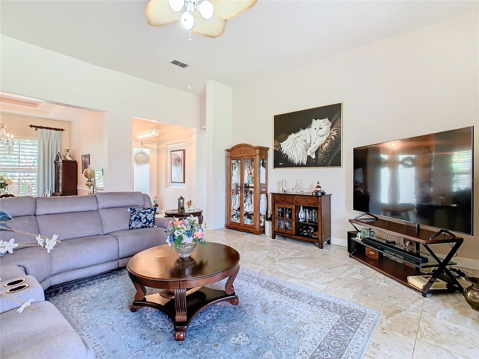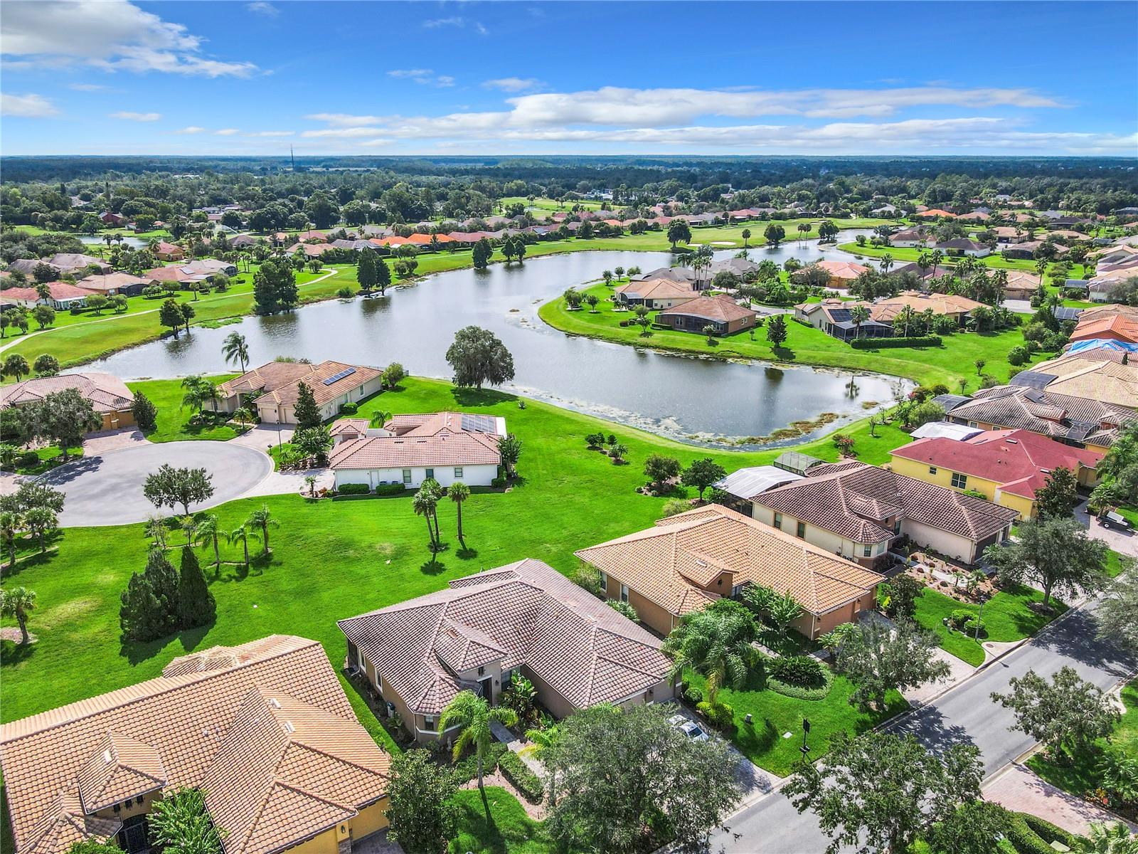 MOST POPULAR VENETIAN MODEL, located in the Bella Viana Neighborhood of Solivita. This LARGE, lovely, open concept floor plan, with 2580 air conditioned sq ft, has 3 Bedrooms plus Den, 3.5 baths, OVERSIZED 3 CAR GARAGE and overlooks a palm tree landscaped grassy area! This home welcomes you with double glass insert French doors. Once inside, you’ll love the open concept! Large Gourmet Kitchen features double oven and cooktop, 42” cabinets with lower pullouts, Corian counters and tile backsplash. Lots of cabinets for storage!!! Breakfast Bar plus Large Breakfast Nook. Separate Dining Room with tray ceiling and chair rail. The Primary Bedroom features a tray ceiling and blackout shades. The Ensuite Bath has dual vanities, a walk in shower with separate tub, linen closet and dual custom designed closets. Sliding glass doors from the Nook and Great Room lead to the covered, screened Lanai. The laundry room has a built-in sink, cabinets, and shelves for extra storage. Upgraded lighting throughout. The two Guest Bedrooms have private baths and the Powder Room is conveniently located off the living areas. The garage has side entry door and includes 2 refrigerators. Some wonderful options are 8’ doors, rounded corners, 5 ¼” baseboards, tile floors in the main living areas with carpeting in the bedrooms and den. Plantation shutters throughout the home. There is a Whole House Water Softener. The exterior of the home was painted in April 2021. 6 month home warranty included. Solivita is an Award Winning, Master Planned and Gated 55 Plus Golf Cart Community in Central Florida. 4,300 acres of pure luxury with ponds, conservation, 2 18 Hole PGA Golf Courses, tennis and pickleball courts, 14 temperature controlled pools, 2 State of the Art Amenity Centers complete with trainers, classes and the latest equipment. Play softball, horseshoes or bocce ball. Solivita has something for everyone! A downtown Village Center with restaurants, activities, a hometown pharmacy/sundries store, library, art studio, meeting rooms, and a pro shop. Enjoy top notch entertainment in the ballroom or take a class or a seminar at Solivita University. Ride your golf cart to the park, enjoy the butterfly garden or grow veggies in the community garden. You can take at golf lesson at Stonegate Golf Club, drive balls at our aquatic driving range or take your “best friend” to the dog park. Join any of over 200 clubs, visit with friends and neighbors. Solivita is convenient to shopping, houses of worship and a great place to live. Don’t wait…schedule an appointment to see this home today and start enjoying the Solivita Lifestyle!