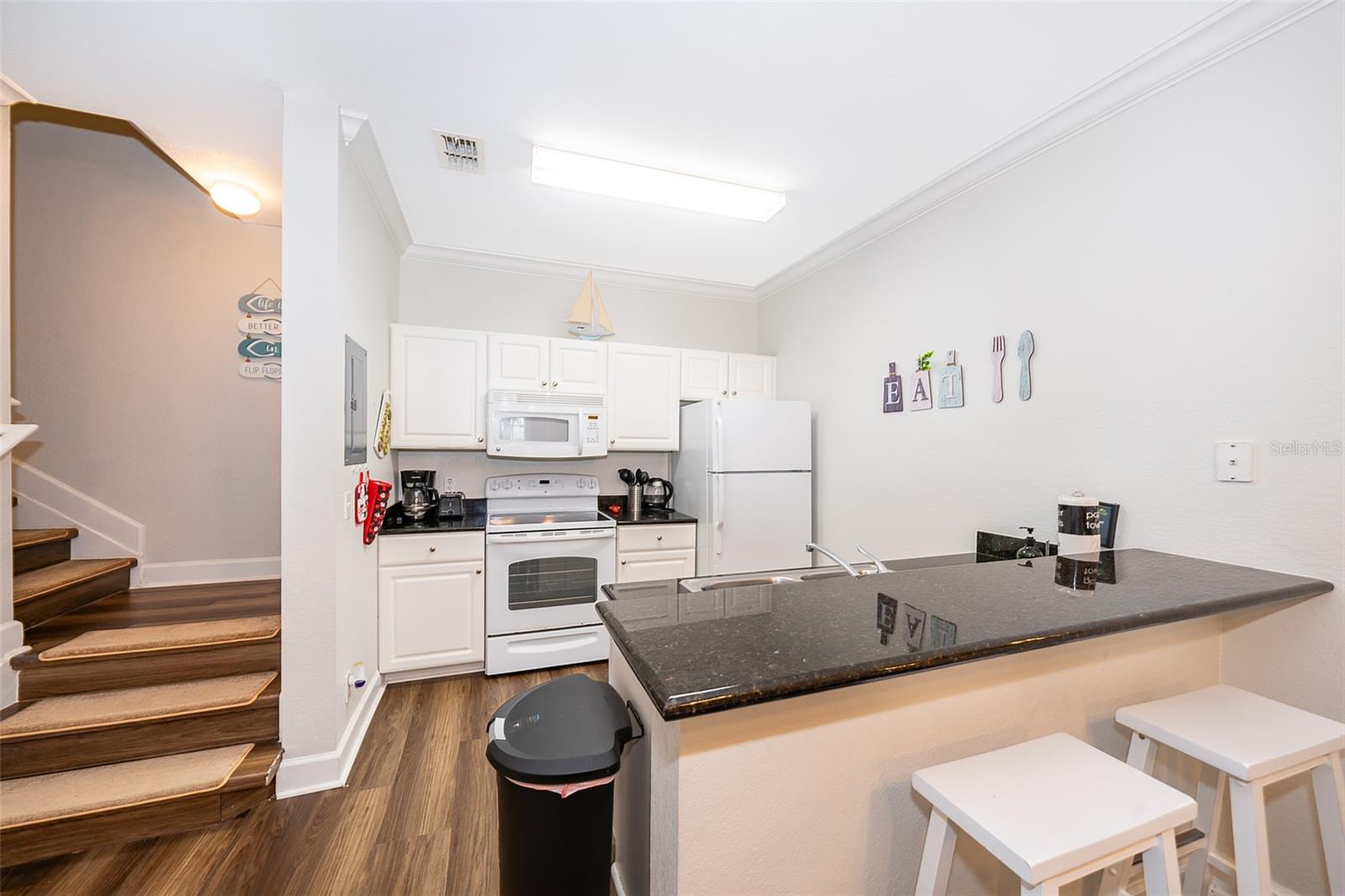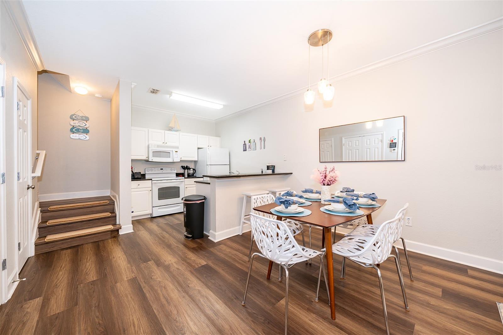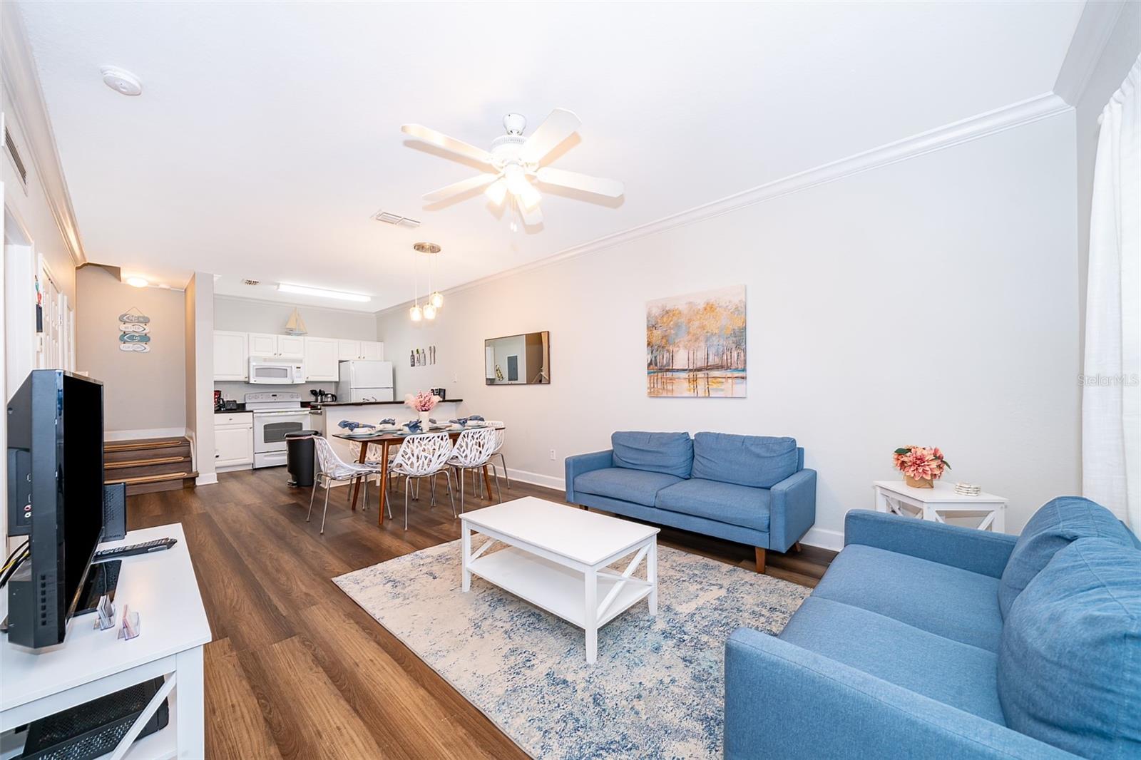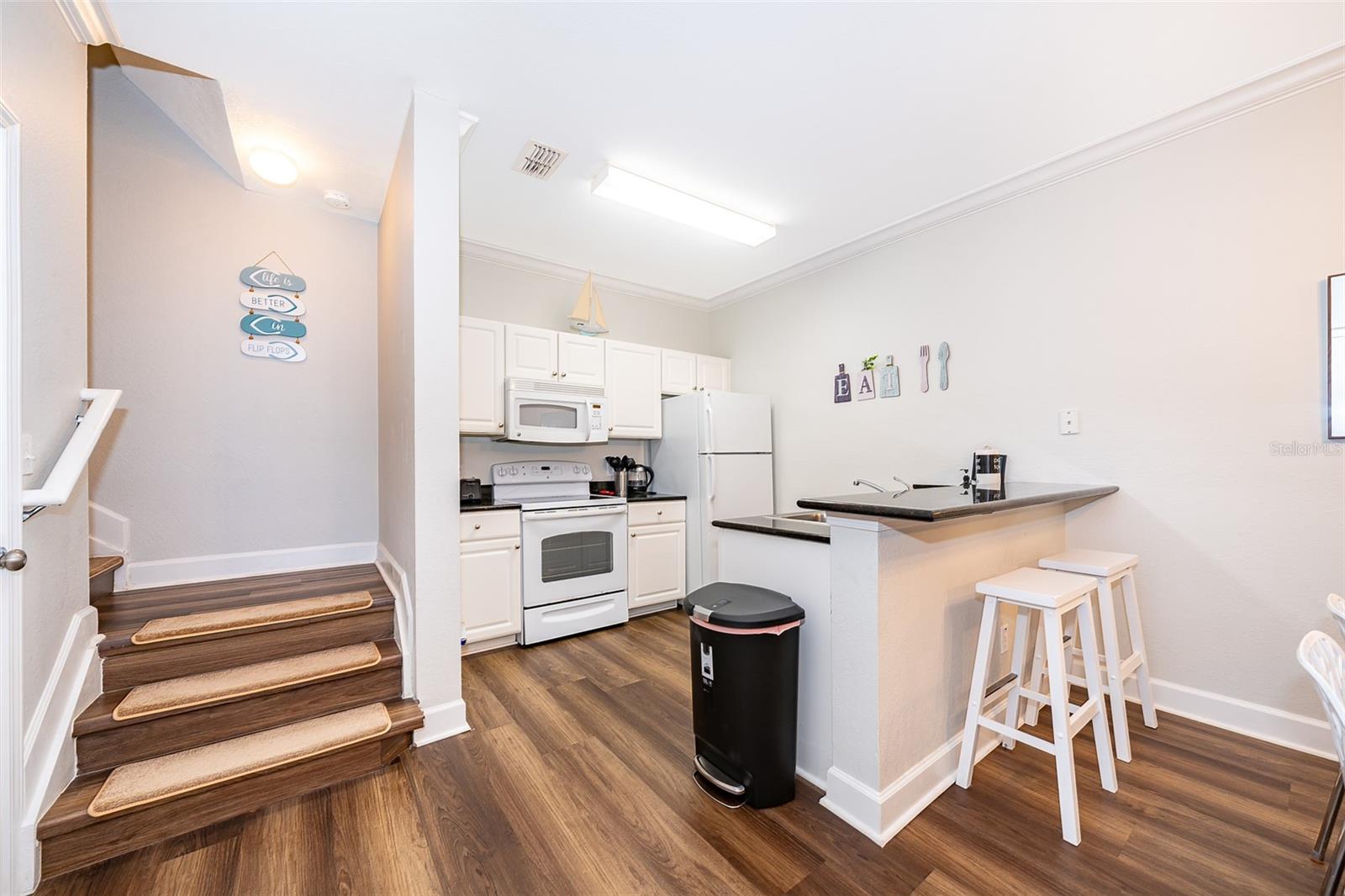 Discover this inviting 3-bedroom, 2-bathroom townhome in the sought-after Lucaya Village Resort, perfectly positioned just moments from major theme parks, shopping areas and many restaurants. Whether you're looking for a lucrative investment property for short or long-term rentals, or a beautiful primary residence, this home fits the bill. Nestled in a secure, gated community with lush tropical landscaping, this townhome offers a spacious first-floor living and dining area, an open kitchen, and a master suite complete with a luxurious en suite bathroom featuring a bathtub and dual sinks. Upstairs, you'll find two additional well-appointed bedrooms and a shared bathroom. Recent upgrades enhance the home's appeal, including new large mirrors in both bathrooms, fresh LVP flooring throughout, a new AC compressor, a new dishwasher, GE washer/dryer, and nearly-new furniture. Plus, all major appliances—range, microwave, and refrigerator—are included. The community itself offers resort-style amenities such as a clubhouse with a business center, a fitness room, a sparkling pool, a hot tub, an indoor playroom, video game stations, concierge services, and an on-site convenience store. The HOA fees are comprehensive, covering cable, phone, internet, exterior maintenance, landscaping, and building upkeep. This property is a turnkey investment opportunity, fully equipped and ready to generate income on Airbnb or to serve as your dream home!