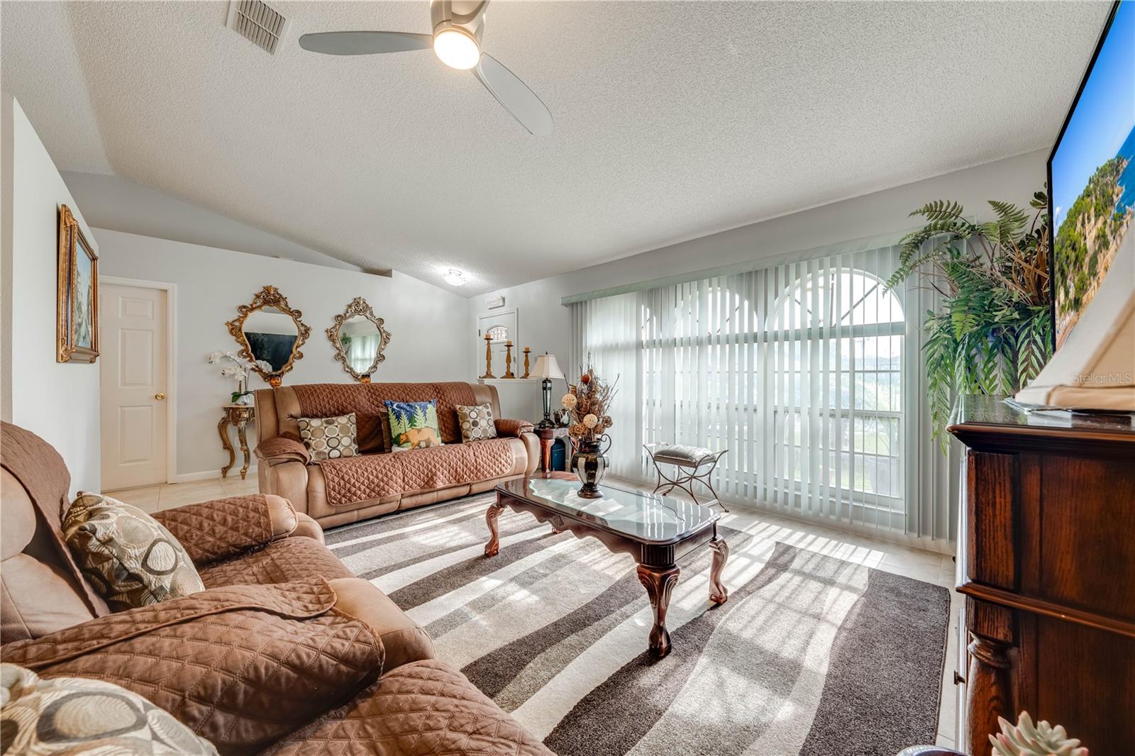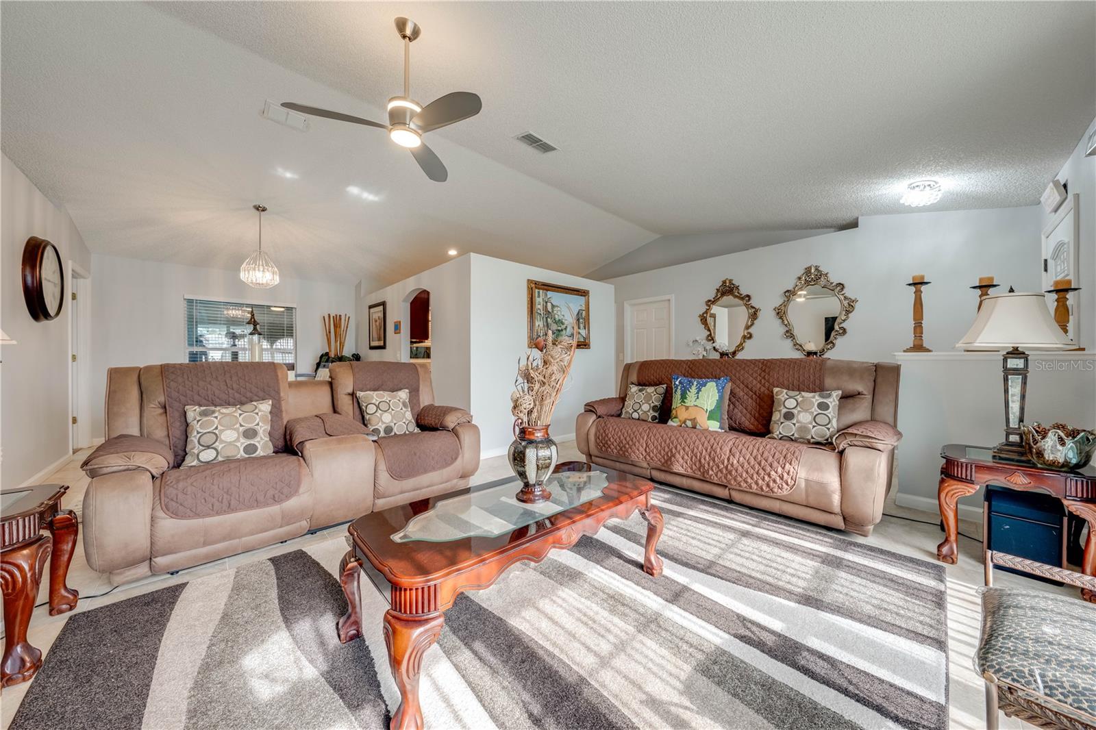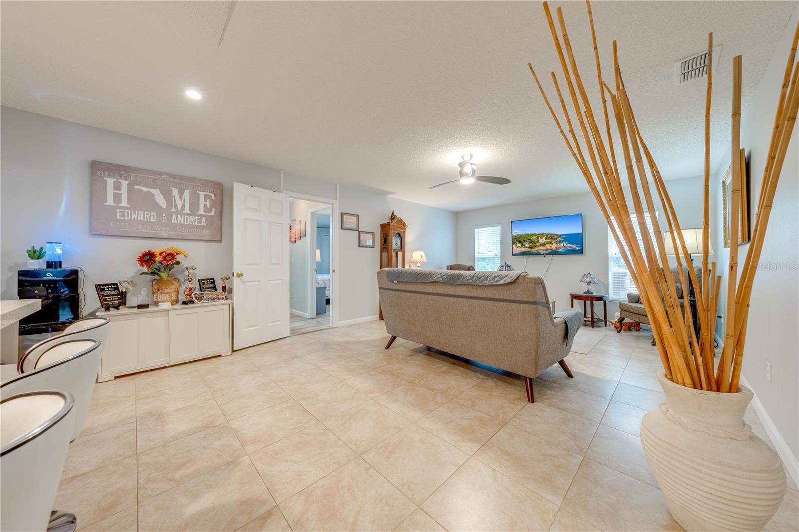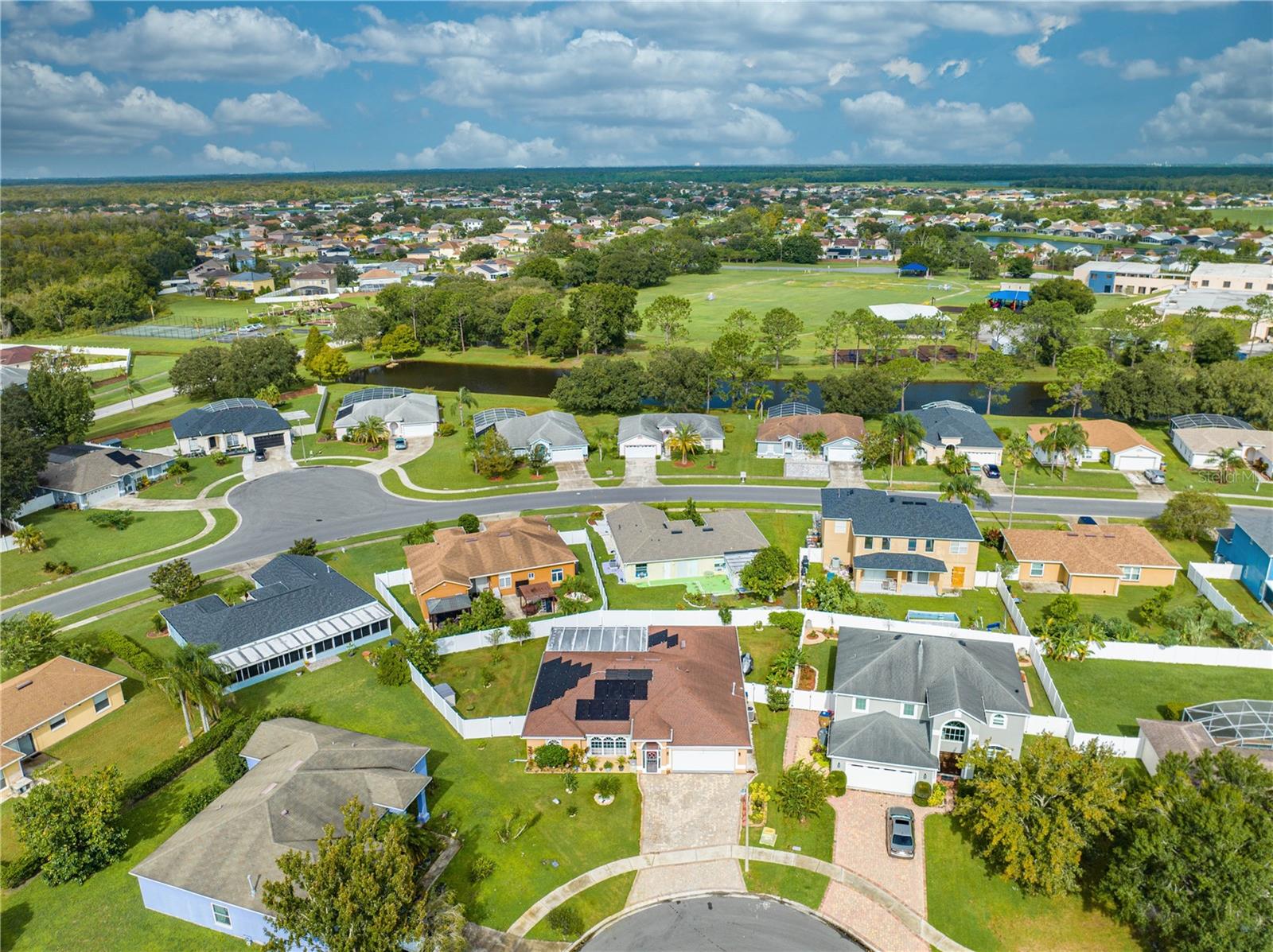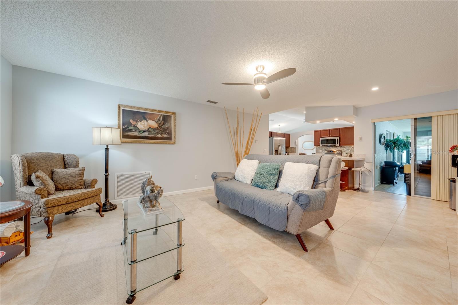 This beautifully updated home features a split floor plan with ceramic tile in the main living areas and new water-resistant laminate flooring in all bedrooms. The formal living room, dining room, family room, and updated kitchen with newer stainless steel appliances provide ample living space.Additional updates include a new tankless water heater installed in July 2024 and a roof replacement in 2017. Enjoy the large sunroom (30x12) and screened-in enclosure (30x16), perfect for outdoor relaxation. The backyard is fully fenced with white vinyl fencing for privacy, and the spacious paver driveway offers plenty of parking. The garage includes a new retractable garage door screen and an AC wall unit, which will stay with the home. Located in the Crescent Lakes subdivision, residents enjoy access to two playgrounds, tennis courts, a park, and a basketball court, with lighted walkways around the ponds. Close to schools, shopping, restaurants, and theme parks, this home offers convenience and community amenities.**Solar Panels are transferable**
