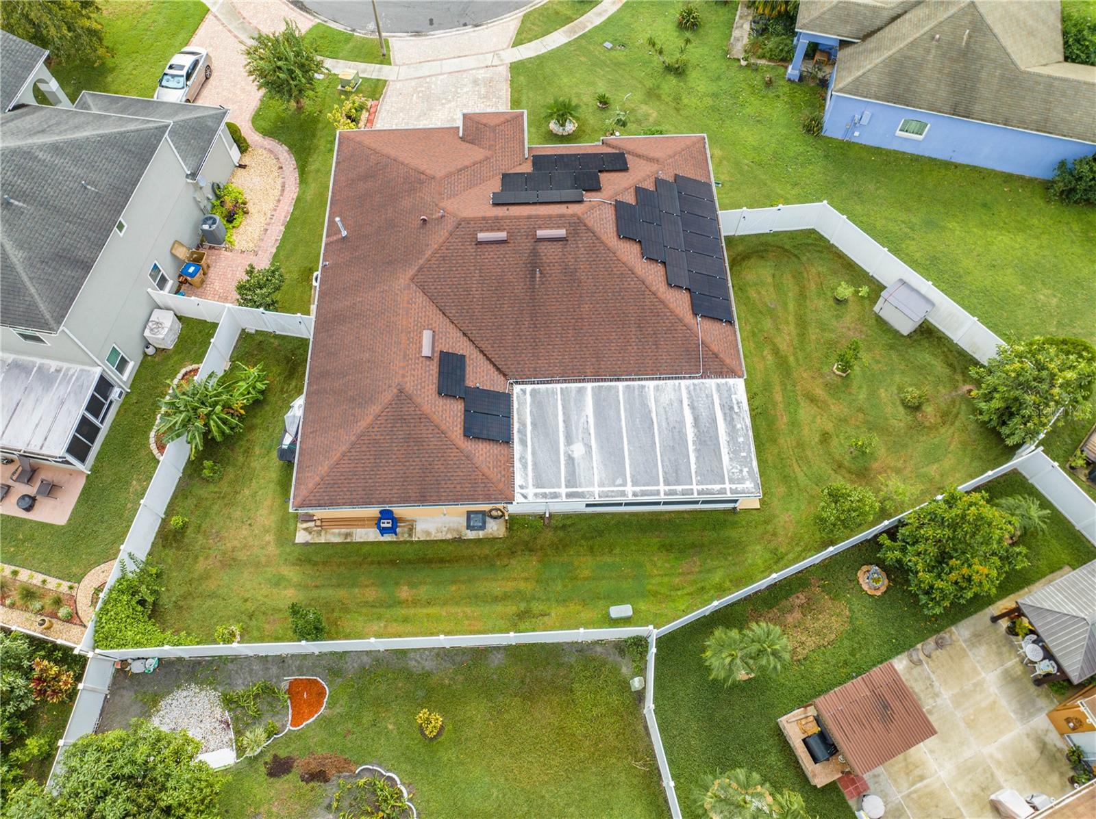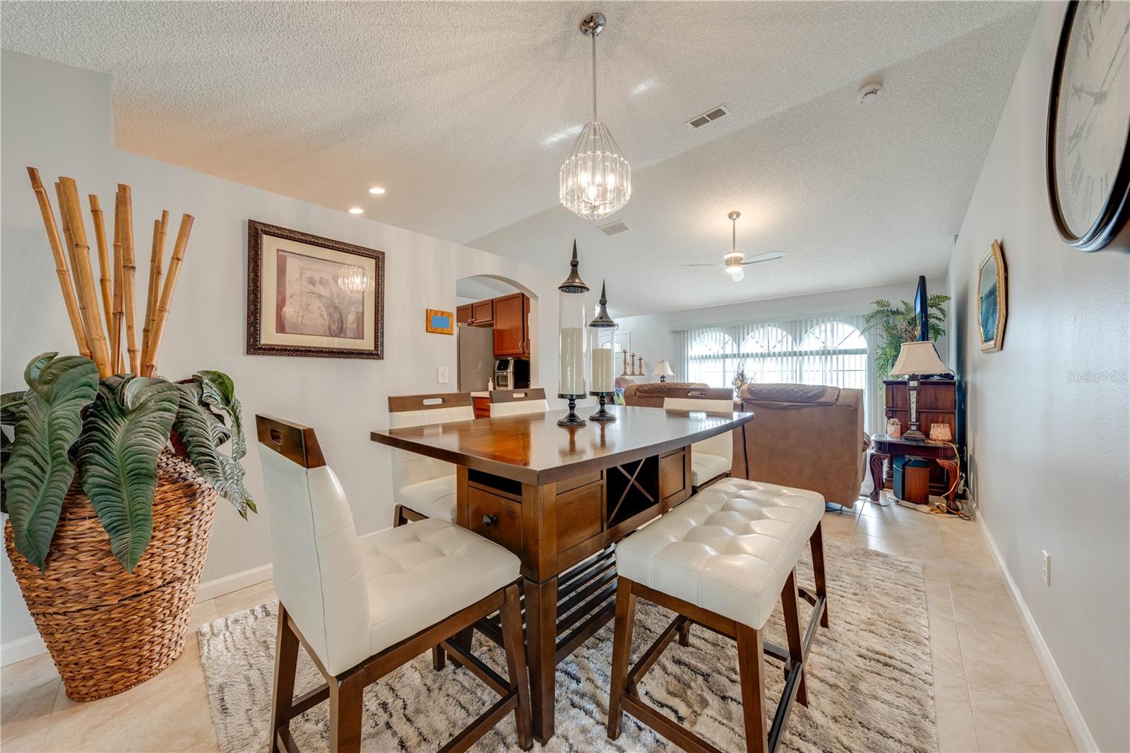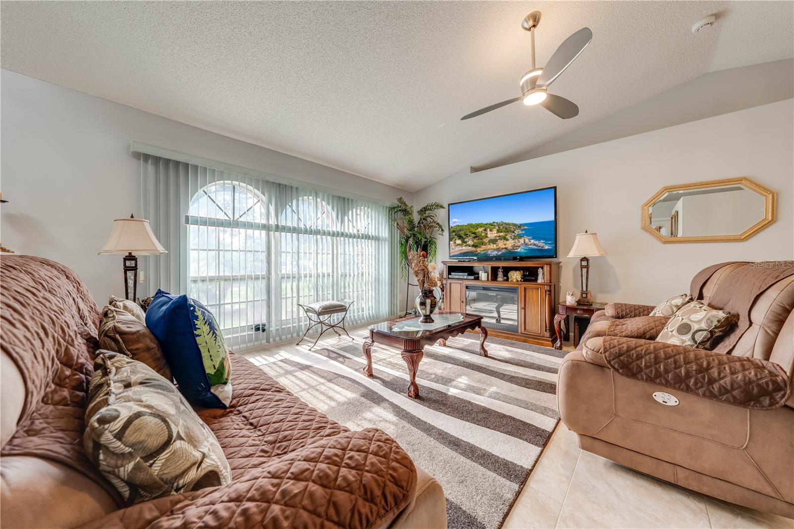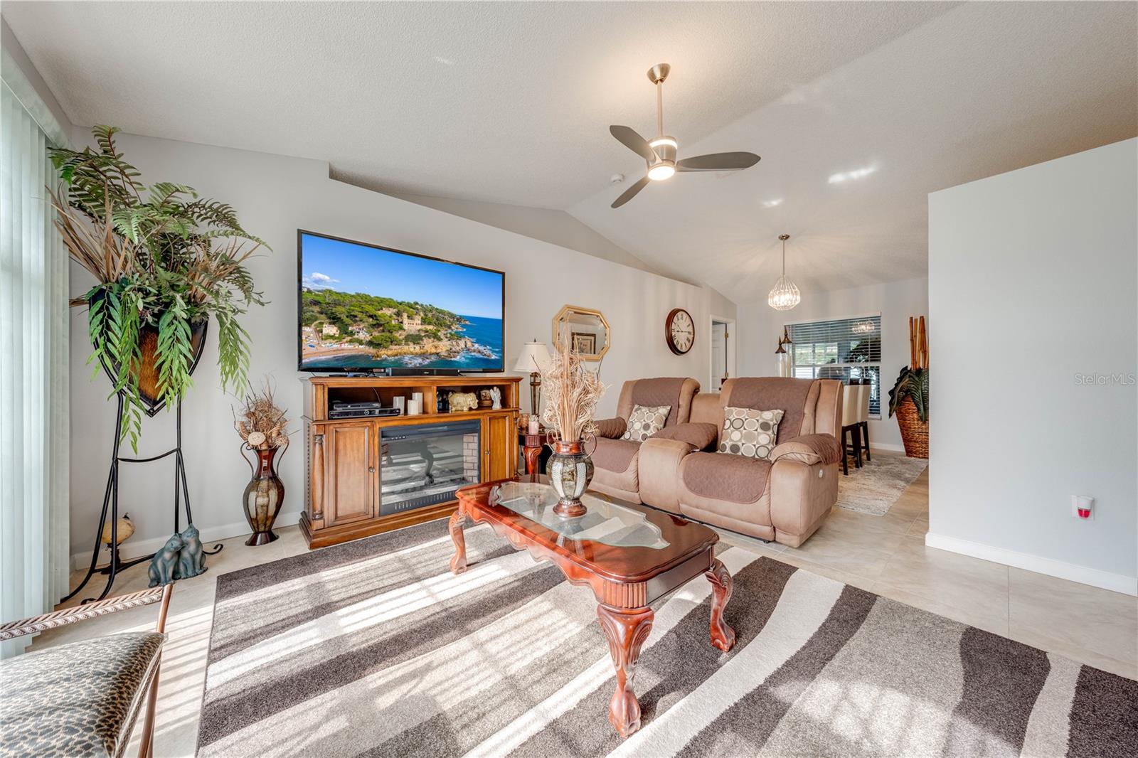 This beautifully updated home features a split floor plan with ceramic tile in the main living areas and new water-resistant laminate flooring in all bedrooms. The formal living room, dining room, family room, and updated kitchen with newer stainless steel appliances provide ample living space.Additional updates include a new tankless water heater installed in July 2024 and a roof replacement in 2017. Enjoy the large sunroom (30x12) and screened-in enclosure (30x16), perfect for outdoor relaxation. The backyard is fully fenced with white vinyl fencing for privacy, and the spacious paver driveway offers plenty of parking. The garage includes a new retractable garage door screen and an AC wall unit, which will stay with the home. Located in the Crescent Lakes subdivision, residents enjoy access to two playgrounds, tennis courts, a park, and a basketball court, with lighted walkways around the ponds. Close to schools, shopping, restaurants, and theme parks, this home offers convenience and community amenities.**Solar Panels are transferable**