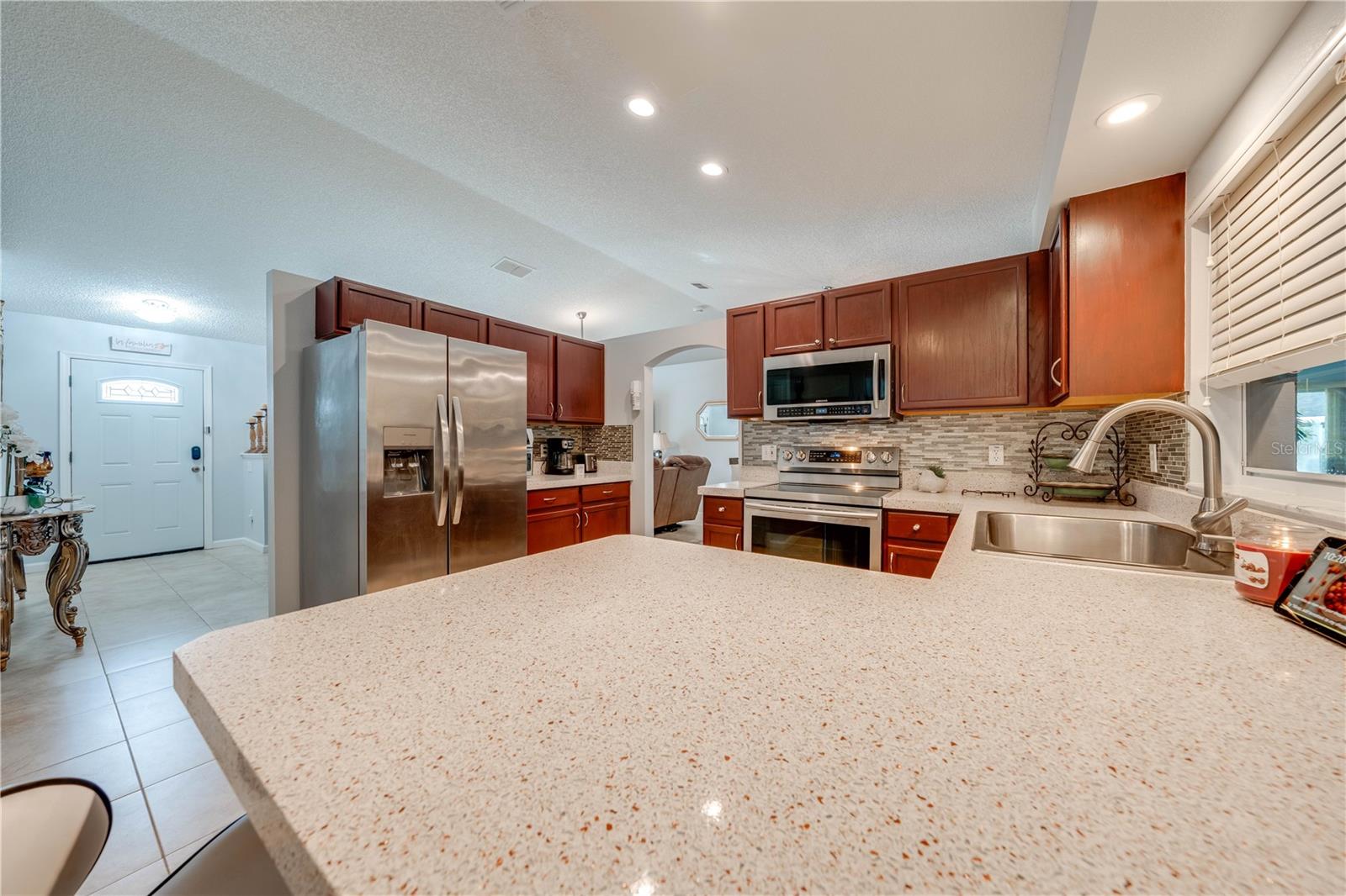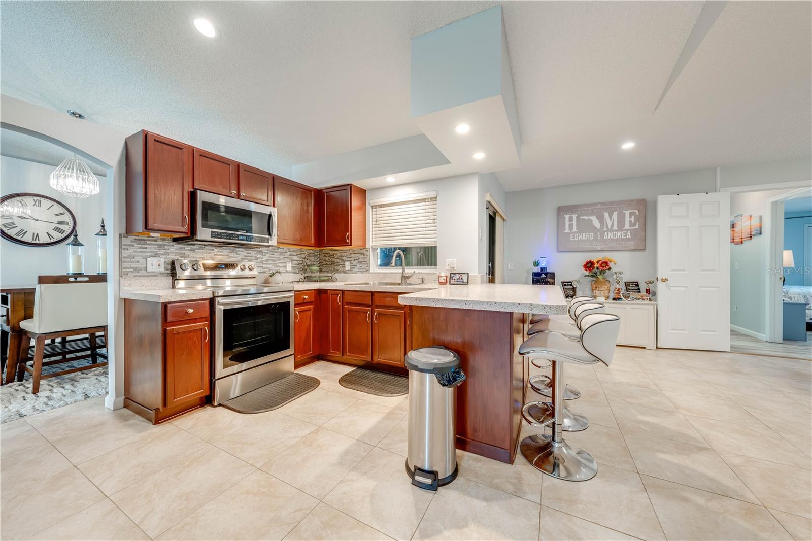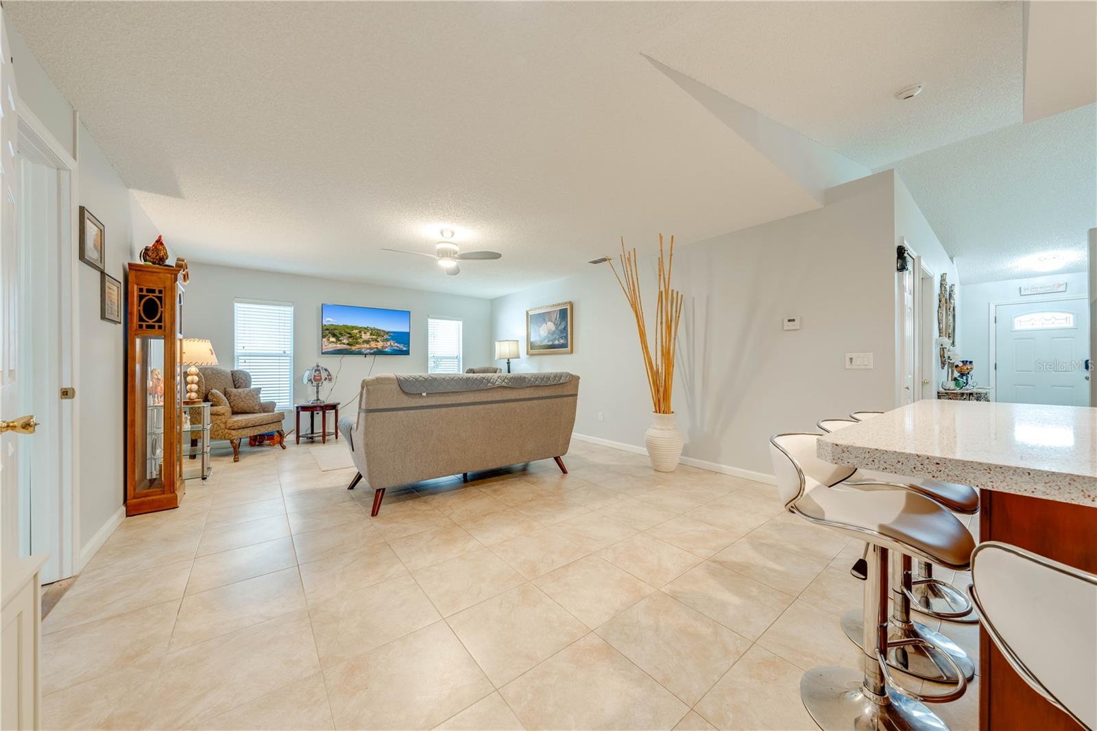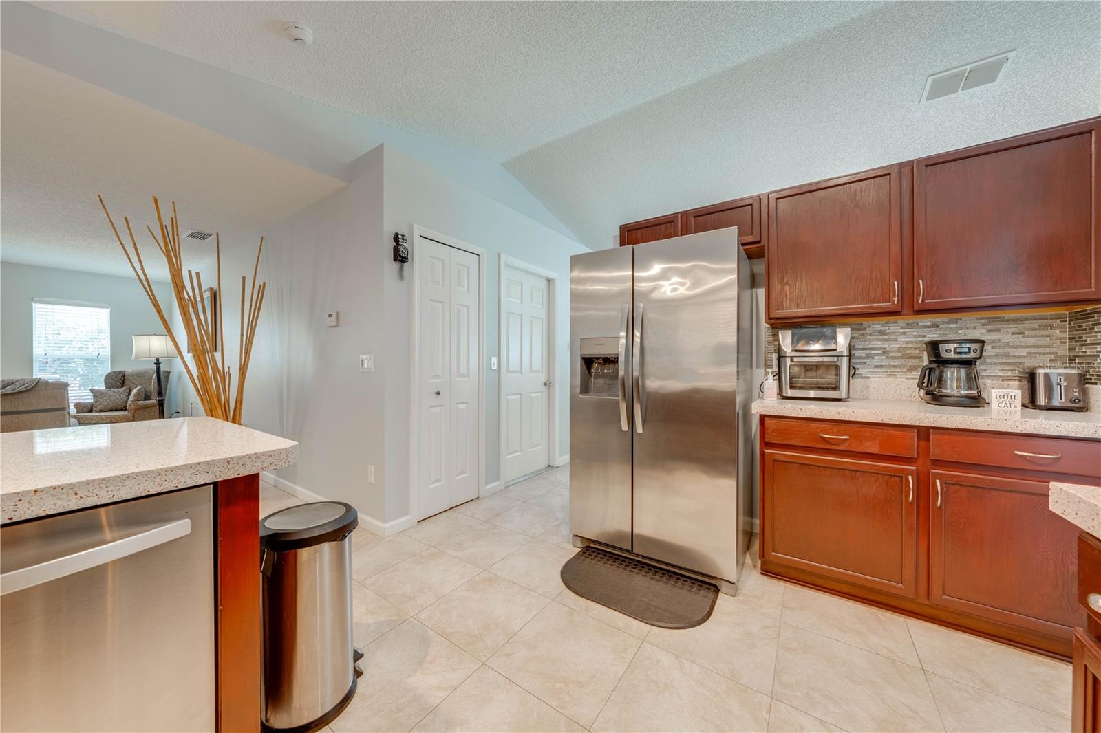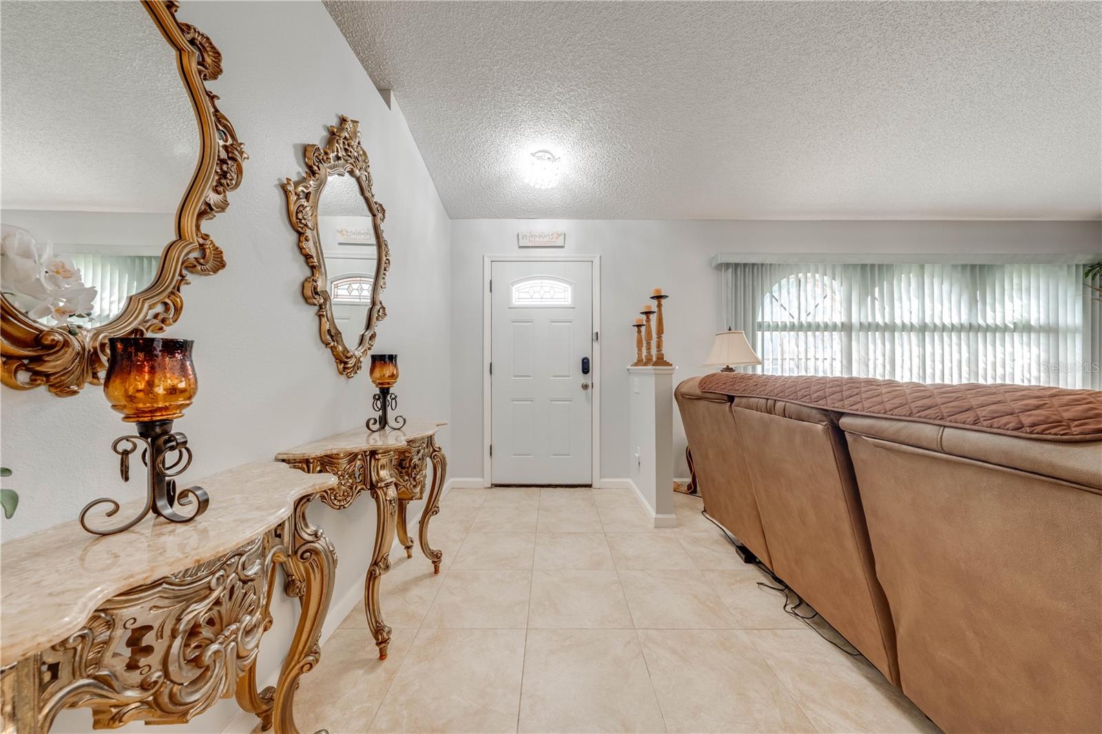 This beautifully updated home features a split floor plan with ceramic tile in the main living areas and new water-resistant laminate flooring in all bedrooms. The formal living room, dining room, family room, and updated kitchen with newer stainless steel appliances provide ample living space.Additional updates include a new tankless water heater installed in July 2024 and a roof replacement in 2017. Enjoy the large sunroom (30x12) and screened-in enclosure (30x16), perfect for outdoor relaxation. The backyard is fully fenced with white vinyl fencing for privacy, and the spacious paver driveway offers plenty of parking. The garage includes a new retractable garage door screen and an AC wall unit, which will stay with the home. Located in the Crescent Lakes subdivision, residents enjoy access to two playgrounds, tennis courts, a park, and a basketball court, with lighted walkways around the ponds. Close to schools, shopping, restaurants, and theme parks, this home offers convenience and community amenities.**Solar Panels are transferable**