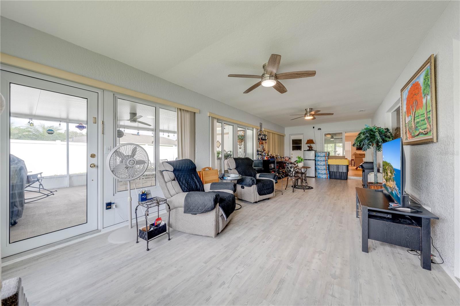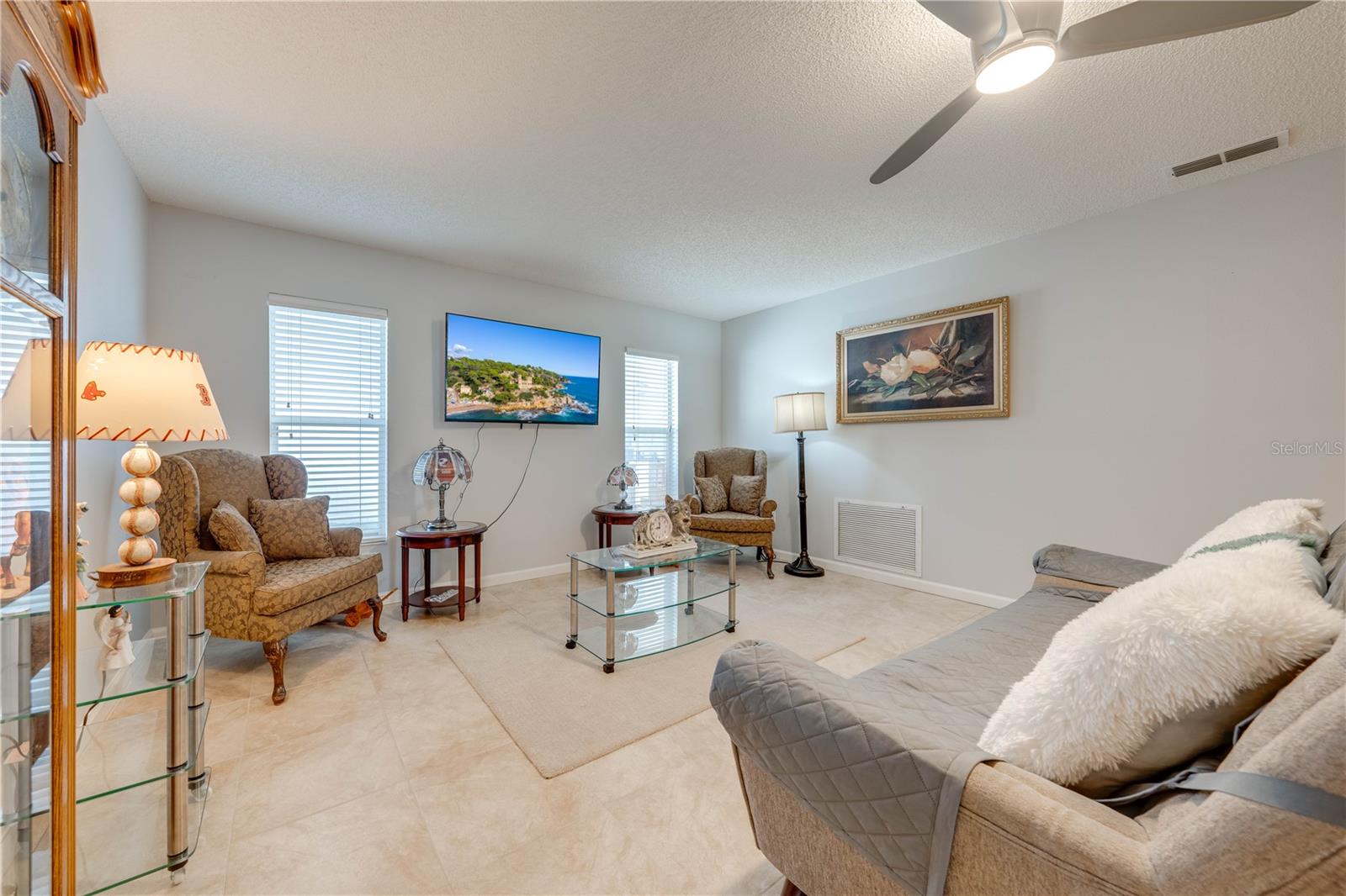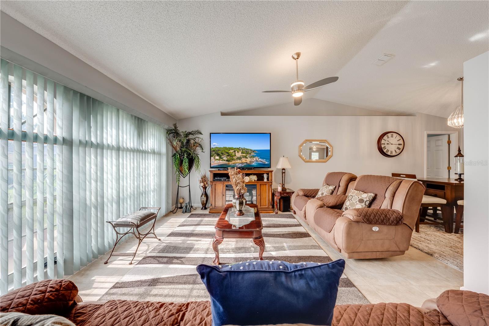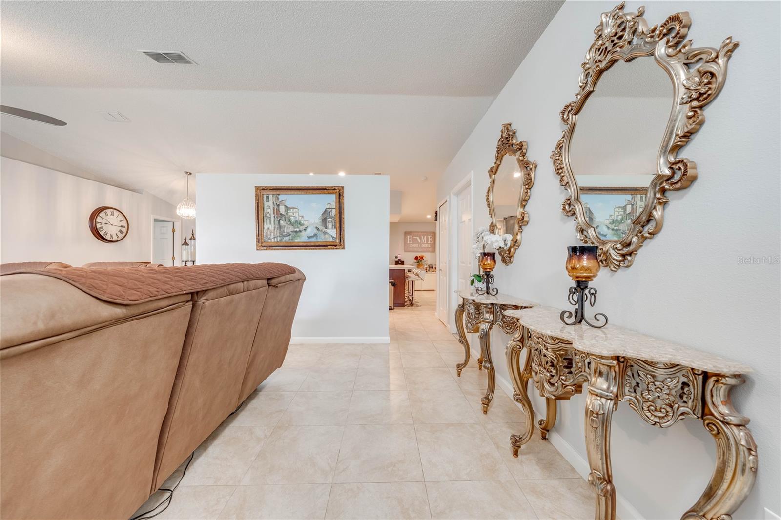 This beautifully updated home features a split floor plan with ceramic tile in the main living areas and new water-resistant laminate flooring in all bedrooms. The formal living room, dining room, family room, and updated kitchen with newer stainless steel appliances provide ample living space.Additional updates include a new tankless water heater installed in July 2024 and a roof replacement in 2017. Enjoy the large sunroom (30x12) and screened-in enclosure (30x16), perfect for outdoor relaxation. The backyard is fully fenced with white vinyl fencing for privacy, and the spacious paver driveway offers plenty of parking. The garage includes a new retractable garage door screen and an AC wall unit, which will stay with the home. Located in the Crescent Lakes subdivision, residents enjoy access to two playgrounds, tennis courts, a park, and a basketball court, with lighted walkways around the ponds. Close to schools, shopping, restaurants, and theme parks, this home offers convenience and community amenities.**Solar Panels are transferable**