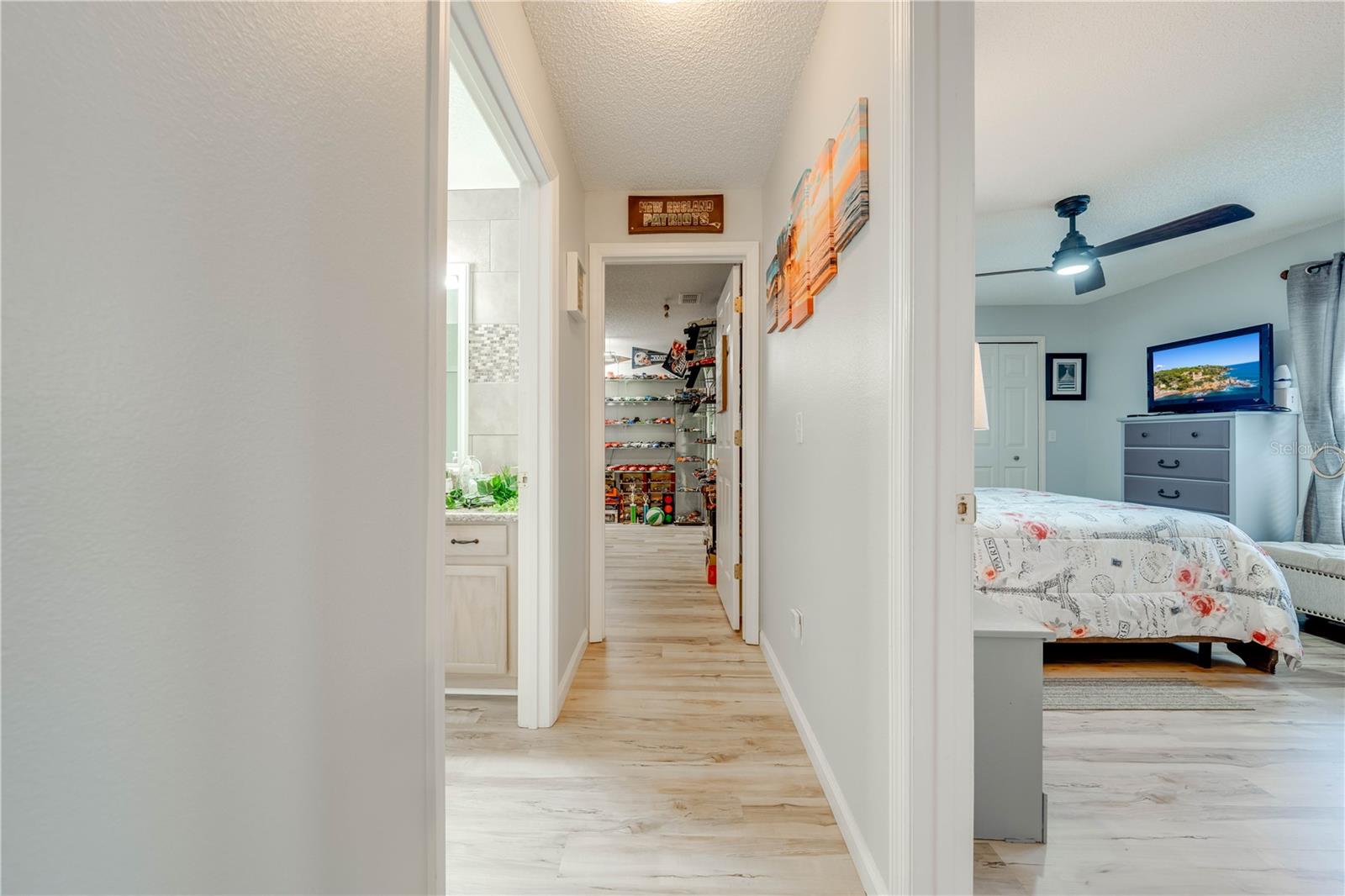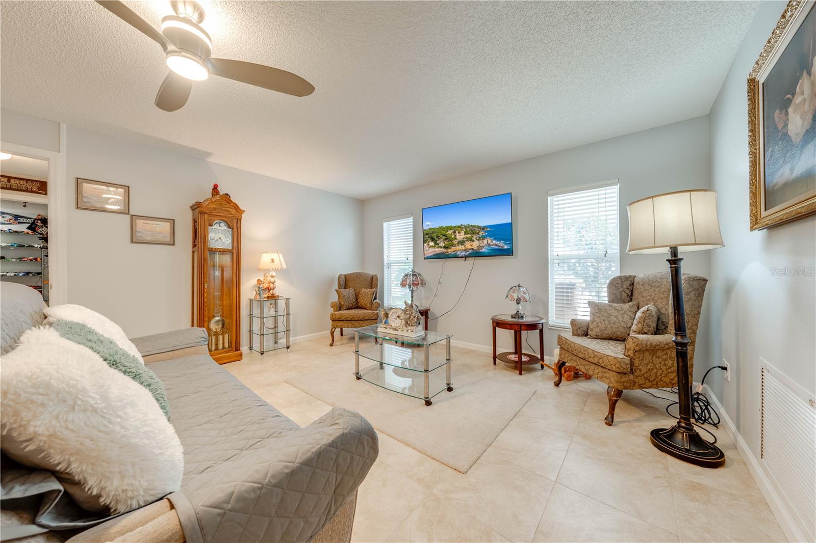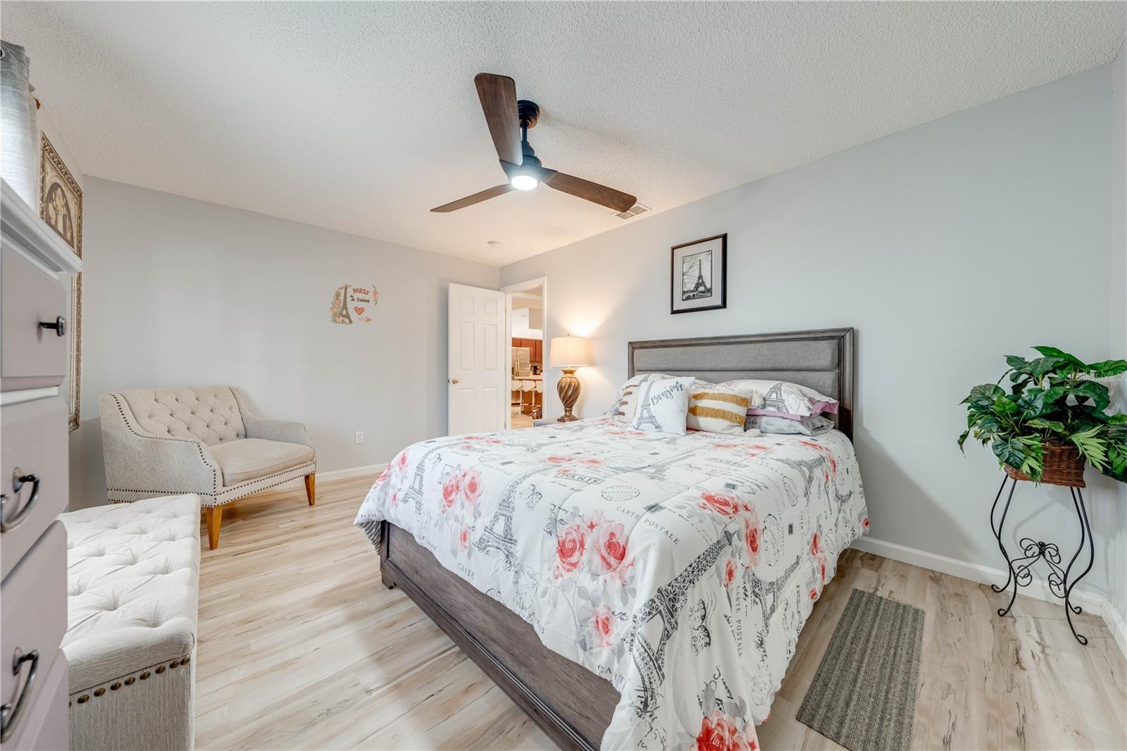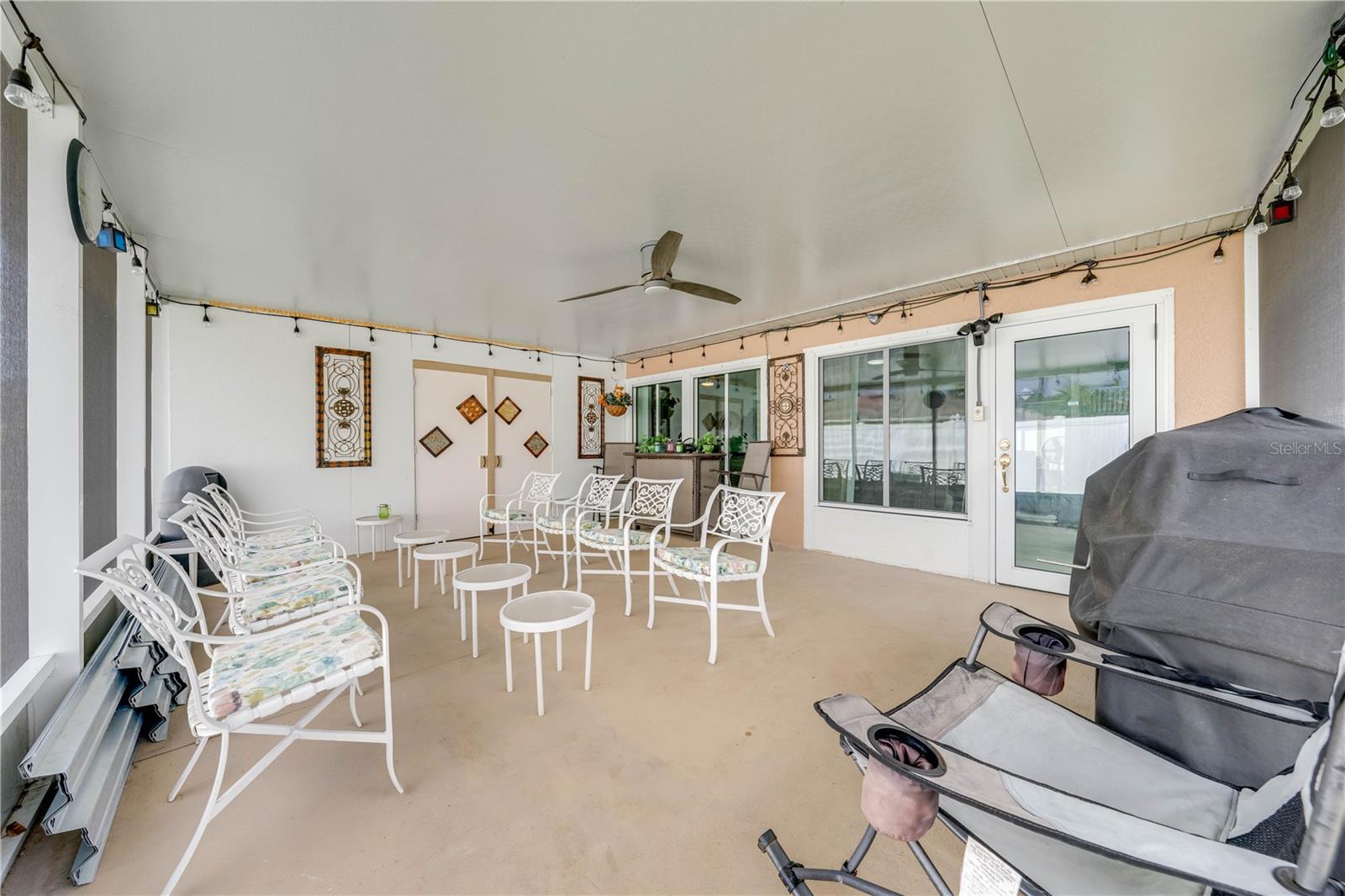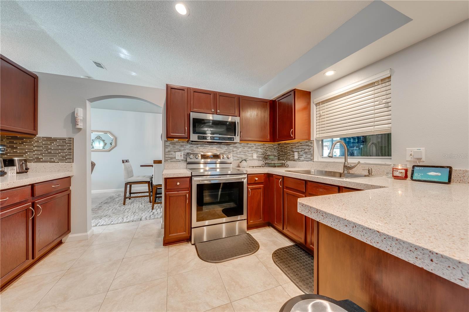 This beautifully updated home features a split floor plan with ceramic tile in the main living areas and new water-resistant laminate flooring in all bedrooms. The formal living room, dining room, family room, and updated kitchen with newer stainless steel appliances provide ample living space.Additional updates include a new tankless water heater installed in July 2024 and a roof replacement in 2017. Enjoy the large sunroom (30x12) and screened-in enclosure (30x16), perfect for outdoor relaxation. The backyard is fully fenced with white vinyl fencing for privacy, and the spacious paver driveway offers plenty of parking. The garage includes a new retractable garage door screen and an AC wall unit, which will stay with the home. Located in the Crescent Lakes subdivision, residents enjoy access to two playgrounds, tennis courts, a park, and a basketball court, with lighted walkways around the ponds. Close to schools, shopping, restaurants, and theme parks, this home offers convenience and community amenities.**Solar Panels are transferable**