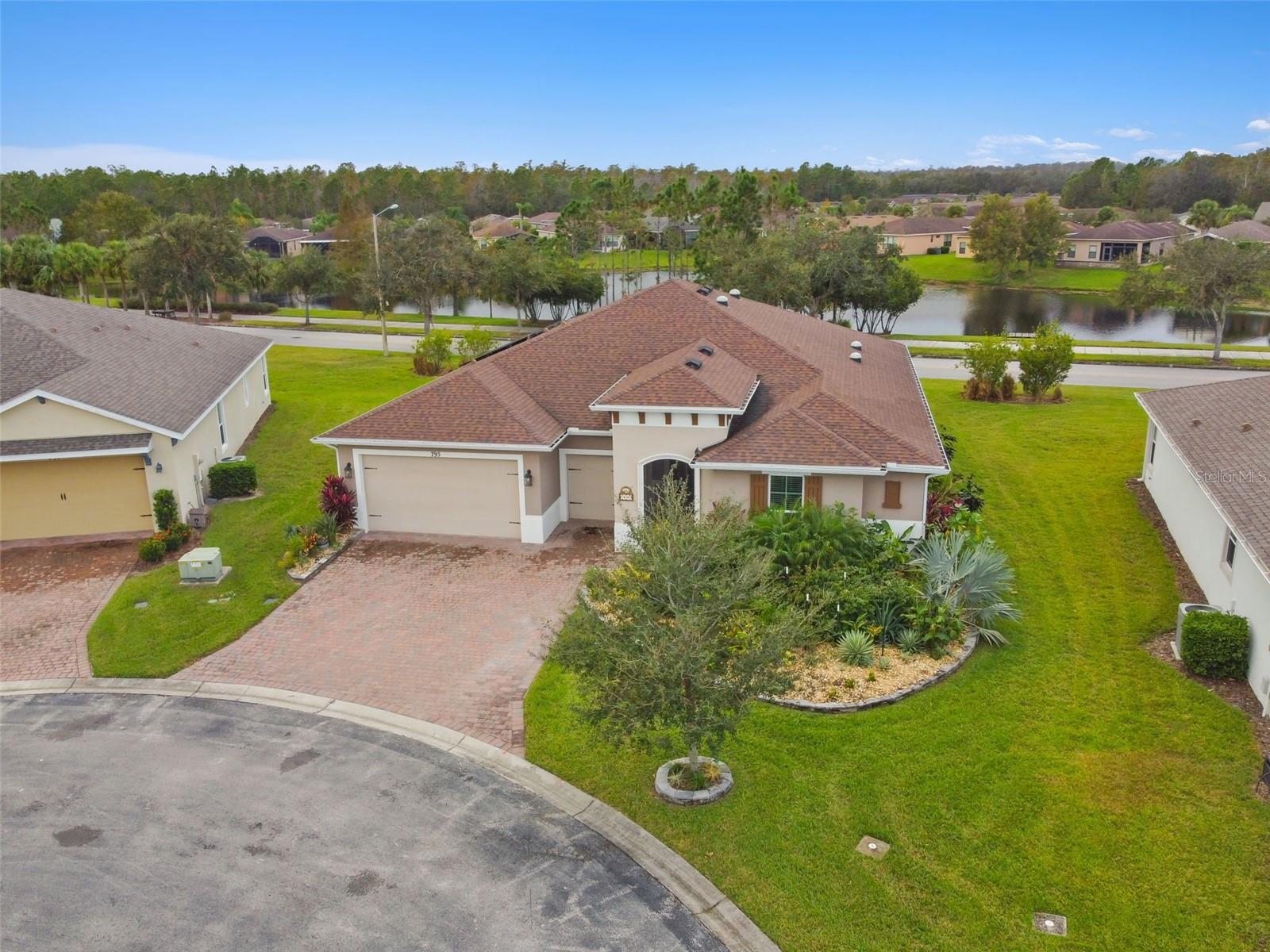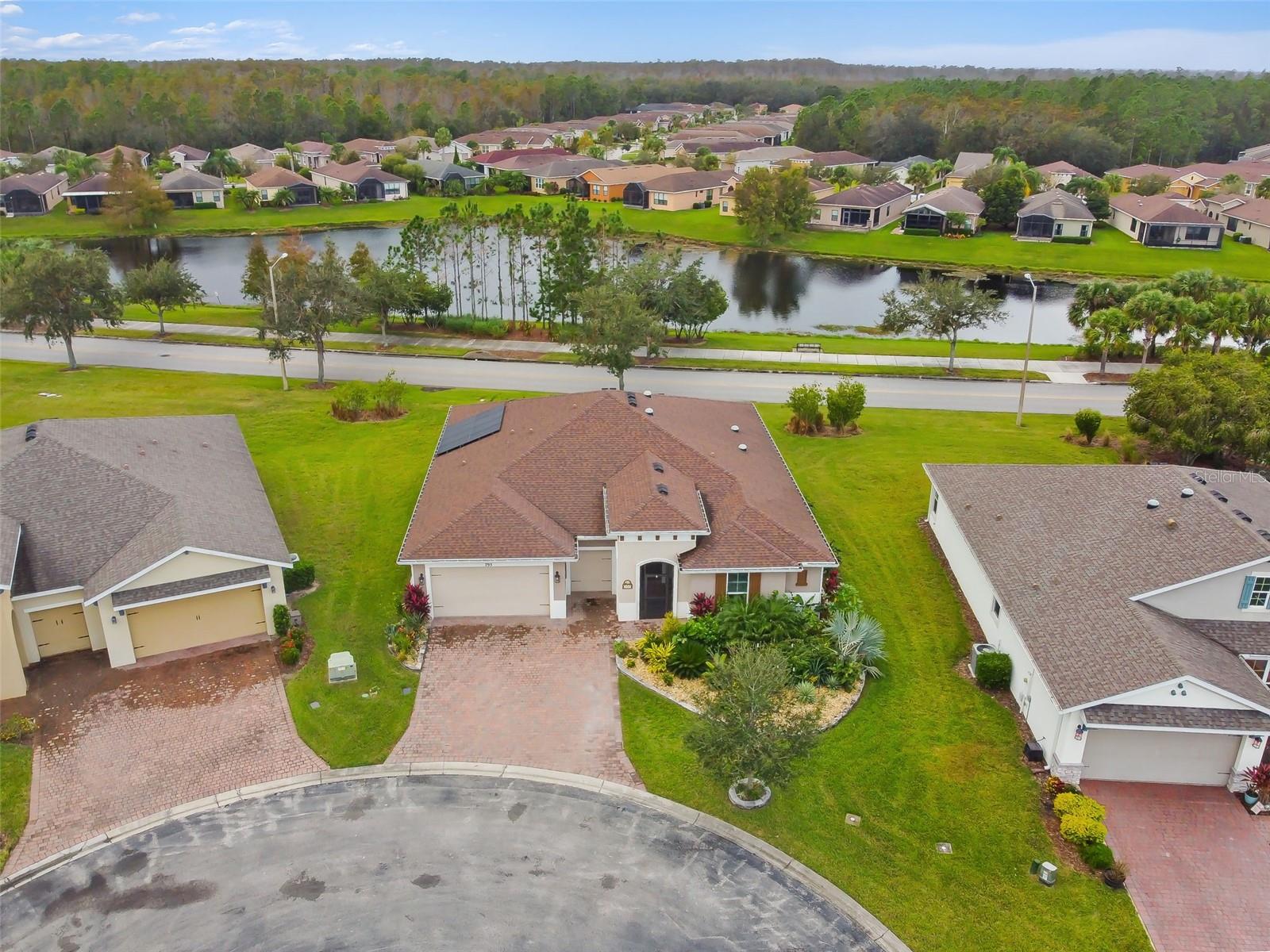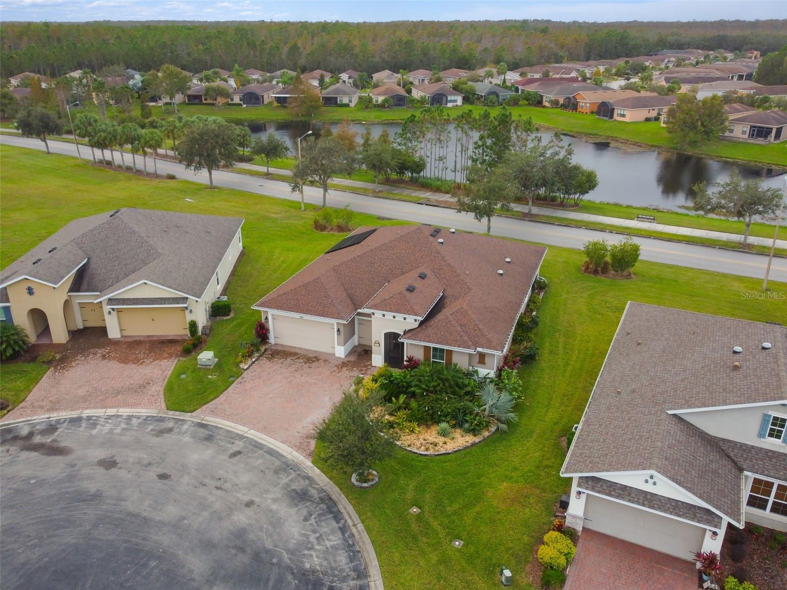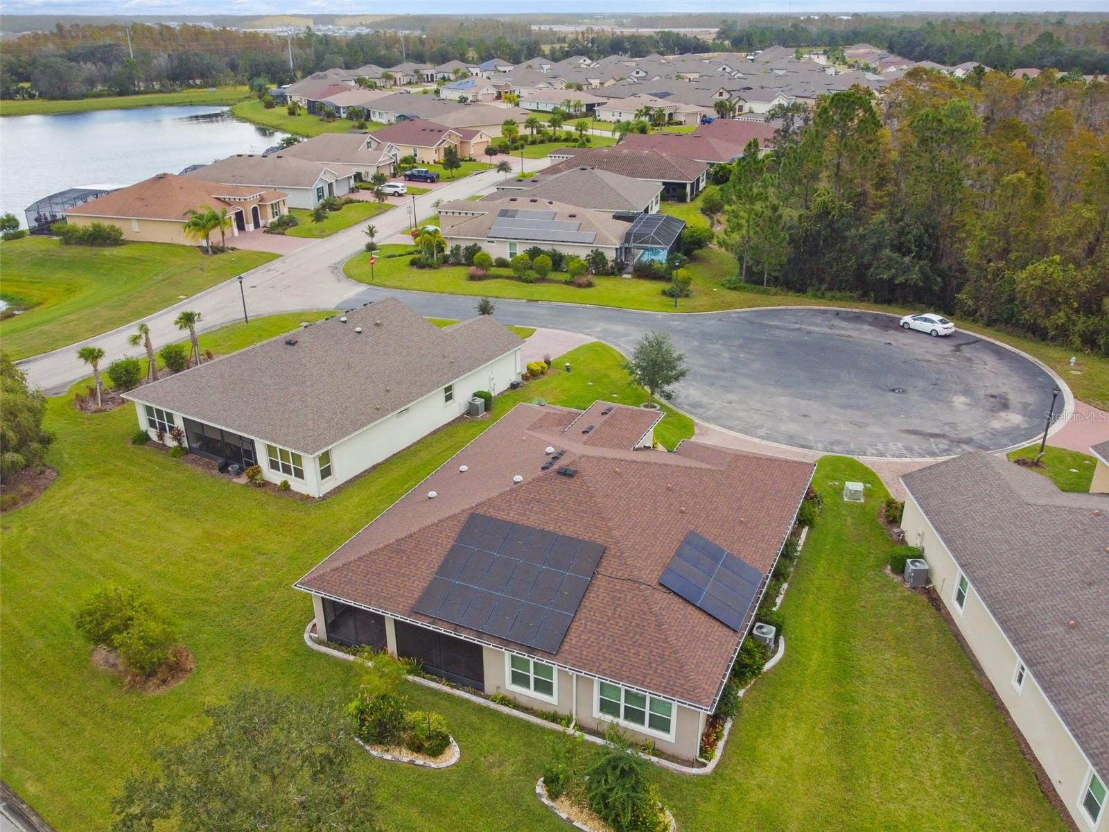 HUGE PRICE REDUCTION! Welcome to this exquisite 2020 Siena Model home, perfectly situated on a serene cul-de-sac, offering both privacy and tranquility. This stunning residence features custom landscaping that enhances its curb appeal and provides a picturesque water view that adds to the overall charm. The Paid SOLAR PANELS keep your power bills below $30 per month. Inside, you will find a spacious 3-bedroom, 2.5-bathroom layout, complemented by a versatile den/study that can easily adapt to your lifestyle needs, whether as a home office, craft room, or reading nook. The open concept design creates a seamless flow between the living spaces, making it ideal for both everyday living and entertaining guests. As you enter, you are greeted by a screened front entryway adorned with a beautiful leaded glass door, welcoming you into a bright and airy great room. This inviting space features a stunning tray ceiling and strategically placed solar tubes that allow natural light to flood the area, creating a warm and welcoming atmosphere. The gourmet kitchen is a true highlight of the home, perfect for culinary enthusiasts. It boasts an eat-at bar, elegant granite countertops, and a stylish tile backsplash that catches the eye. The kitchen is equipped with a high-quality stove top, a double oven for all your baking needs, and a generously sized walk-in pantry that provides ample storage space. Retreat to the extra-large primary bedroom, where comfort meets elegance. This sanctuary features a lighted crown molding feature that adds a touch of sophistication, along with two spacious walk-in closets to accommodate your wardrobe. The primary bathroom is equally impressive, offering a large shower and double sinks, providing both luxury and convenience. The home includes two additional guest bedrooms, each with walk-in closets, ensuring that family and friends have plenty of space for their belongings. A thoughtfully designed laundry room adds to the home's functionality, complete with custom cabinets and a sink, making laundry day a breeze. For those who enjoy outdoor living, the 2-car garage comes with an additional golf cart garage, providing plenty of storage for your vehicles and recreational equipment. Step outside to the screened lanai, where you can relax and unwind while taking in the breathtaking sunset views. This outdoor space is perfect for morning coffees or evening gatherings, allowing you to connect with nature right from your home. An added bonus of this remarkable property is its energy efficiency. The Solar Panels keep your power bills below $30 per month. This not only contributes to significant savings but this home qualifies for NEW HOME insurance discounts, making it a smart investment for the future. All this in one of the top 55+ communities in America. Solovita offers residents access to state of the art amenities and work out facilities, dance and aerobics studios, a business center, 14 heated swimming pools, 2 heated spas, tennis courts, pickleball courts, shuffleboard, bocce ball, billiards room, art gallery, 3 restaurants and 2 championship 18-hole golf courses, driving range and putting course. Don't miss out on the opportunity to have a first class lifestyle. Check out the Matterport 3D Tour link