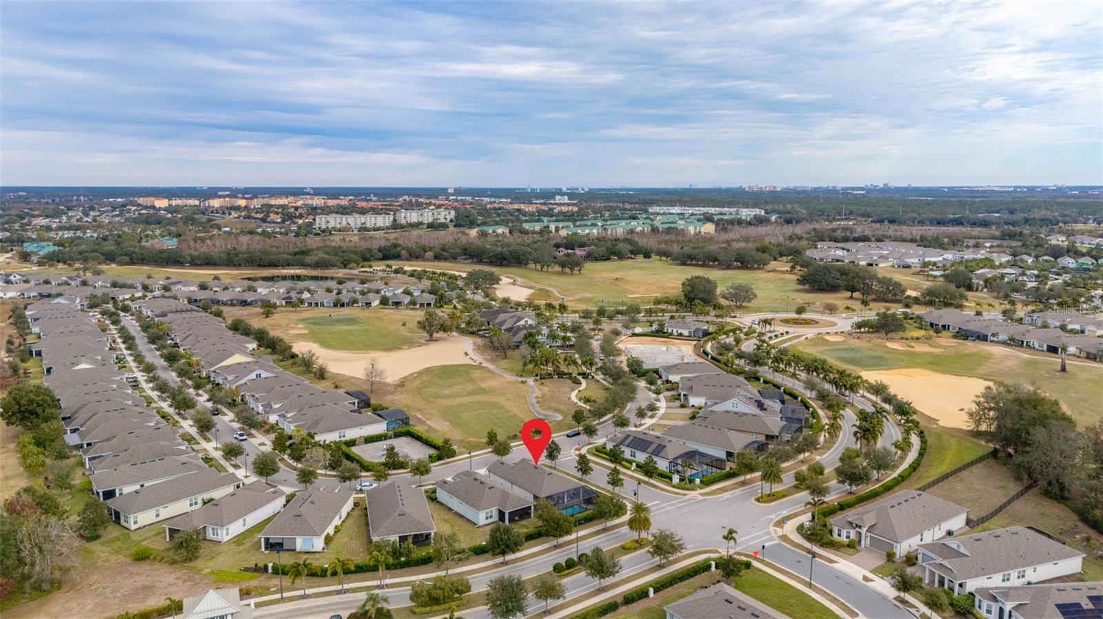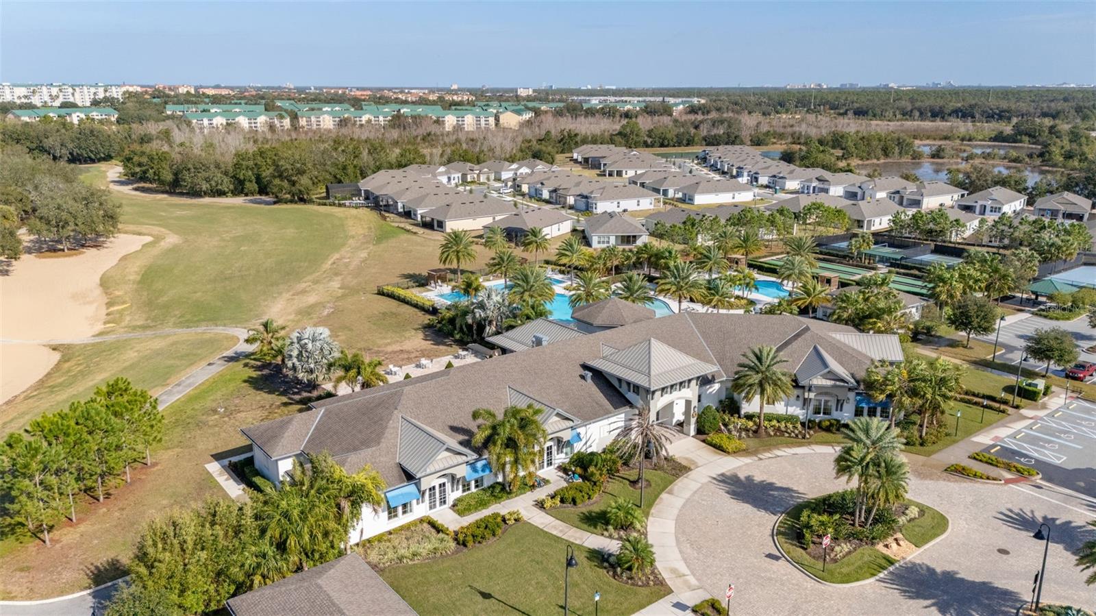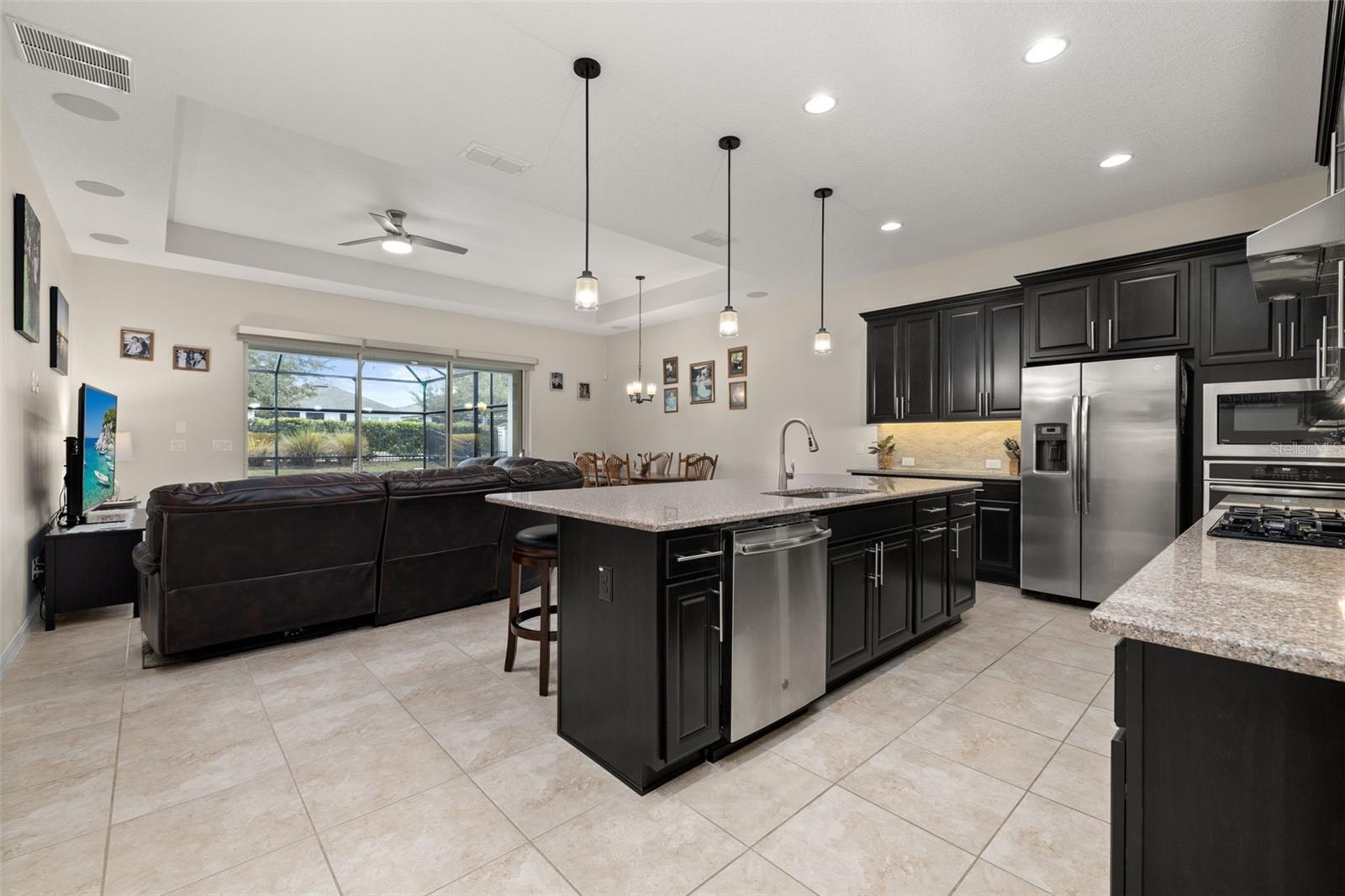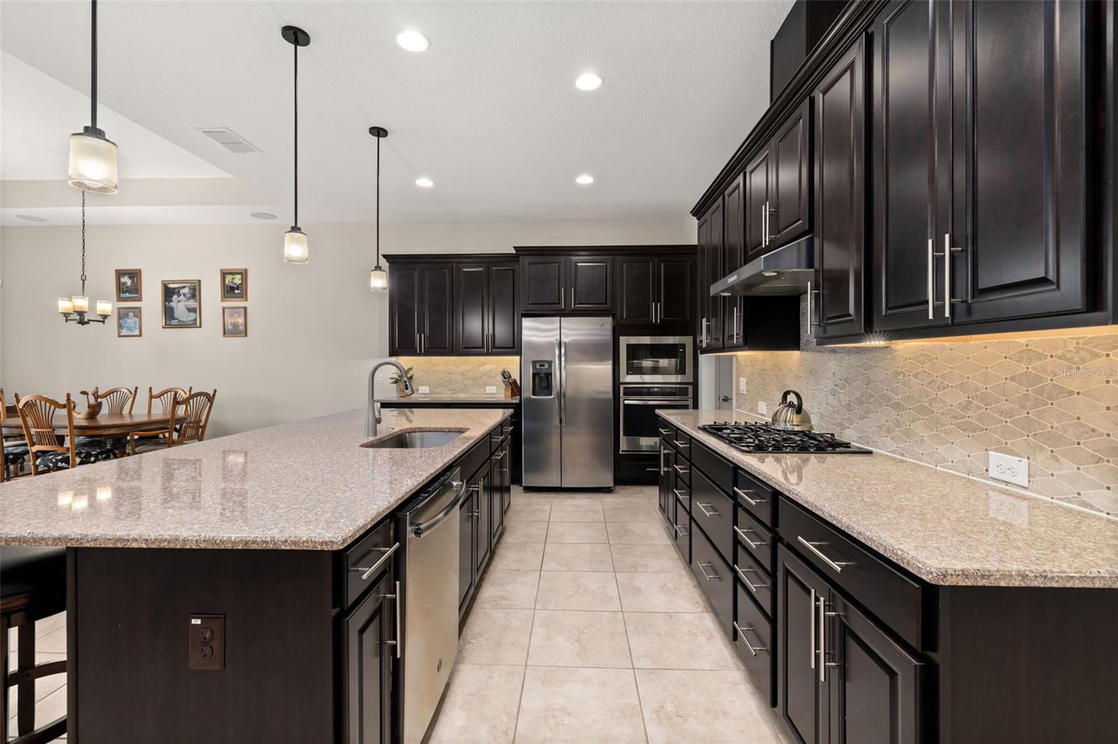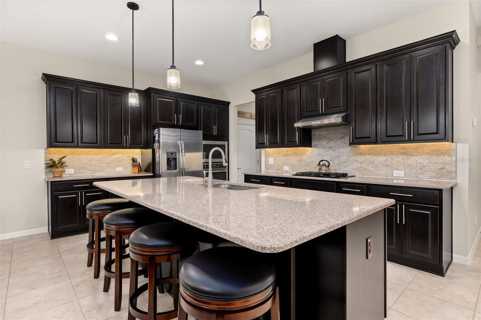 Nestled in the heart of Four Seasons Orlando, this beautifully designed corner lot residence offers a HEATED POOL with screen enclosure, southern exposure, Generac Home Generator and high ceilings which create a bright and inviting atmosphere. As you step inside, one discovers a thoughtfully designed interior with 16x16 ceramic tile flooring, high baseboards, large windows and recessed lighting throughout. The open kitchen is a chef's delight, equipped with a 4 burner GE Profile gas stove with vented hood and stacked drawers, Aristokraft mocha colored solid wood cabinets with soft close drawers, desert brown colored granite counters with single basin stainless steel undermount sink, single handle pulldown faucet, brushed nickel pulls, undermount lighting and polished diamond mosaic tile backsplash. GE Profile stainless steel built in oven and microwave, refrigerator and dishwasher completes this look. The oversized living/dining room combo with tray ceiling overlooks the pool area through the 3 panel sliding glass doors. The spacious screened-in lanai and heated pool area is accented by turquoise colored tile coping and stone paver pool deck with French drains, perfect for entertaining or al fresco dining. The master suite features a tray ceiling, luxurious ensuite bathroom and generously sized walk-in closet. The frameless shower enclosure features rainfall showerhead, shower seat, shower nook, handheld showerhead and transom window for natural light. The gentlemen's height dual vanity is complete with soft close stacked drawers and cabinets, desert brown colored granite countertops, rectangular ceramic undermount sinks and brushed nickel single handle faucets. Located in the Four Seasons Active Adult Community, this home offers a sophisticated lifestyle with all the modern conveniences. Included is a resort style clubhouse with pickleball, bocce ball and tennis courts, zero entry pool, billiards room, game room, art room and ball room as well as a 24 hour guard gate. Just a few miles from Disney, Celebration and all that Central Florida has to offer, experience luxury living at its finest.