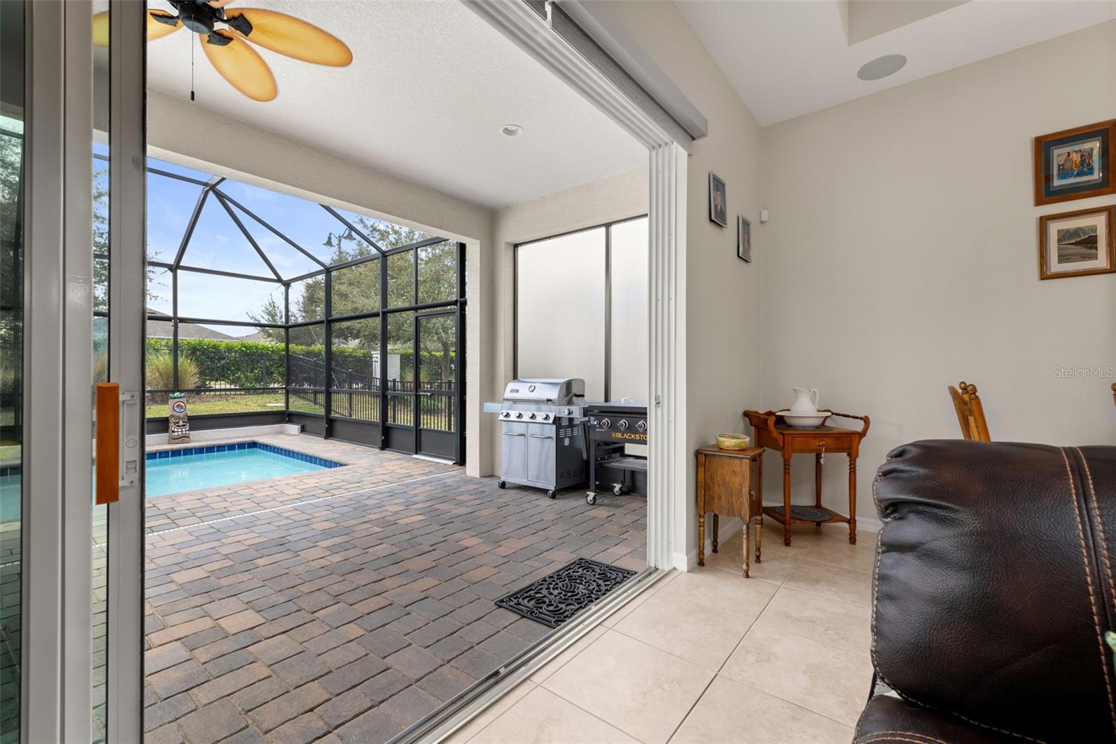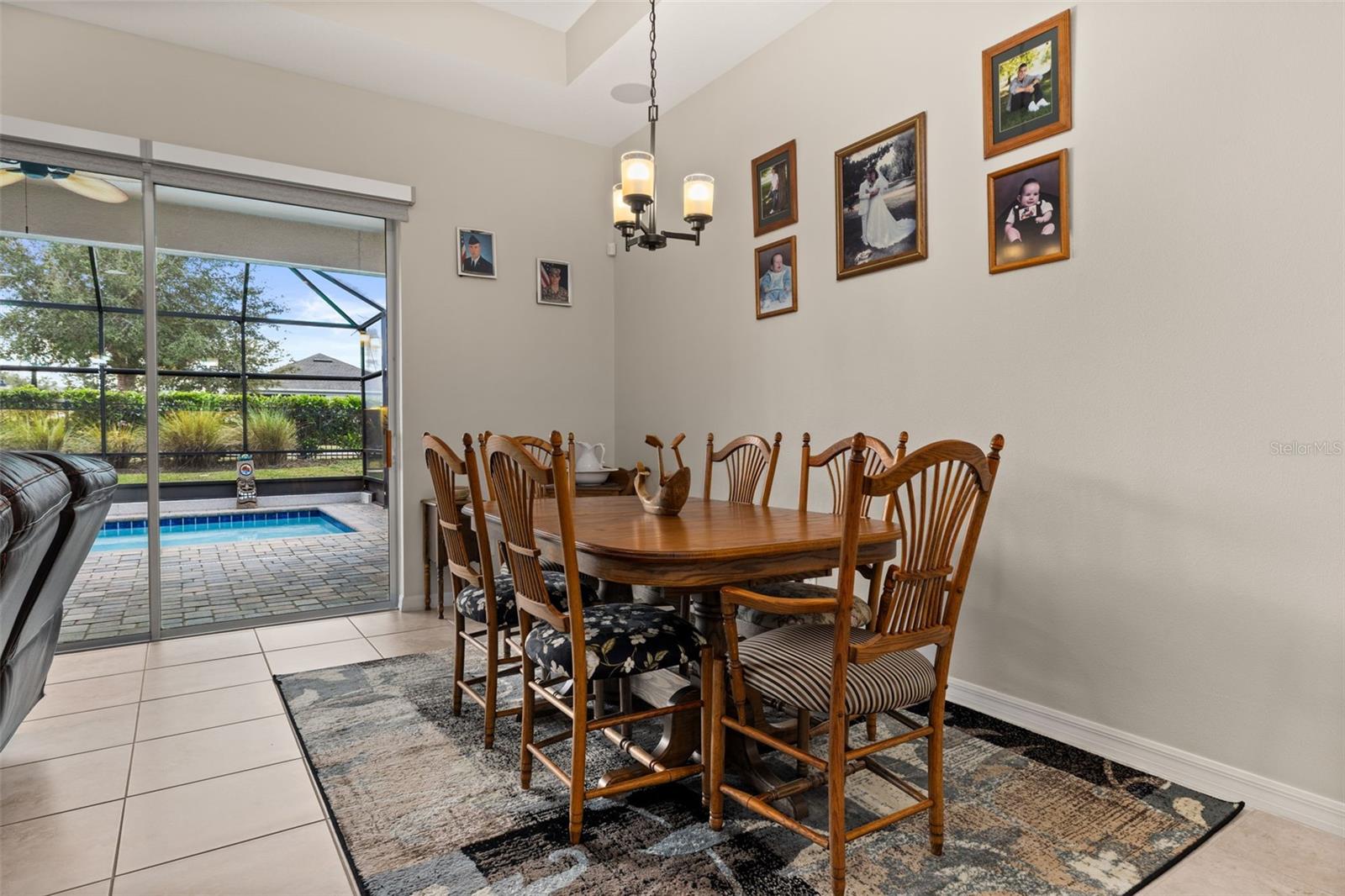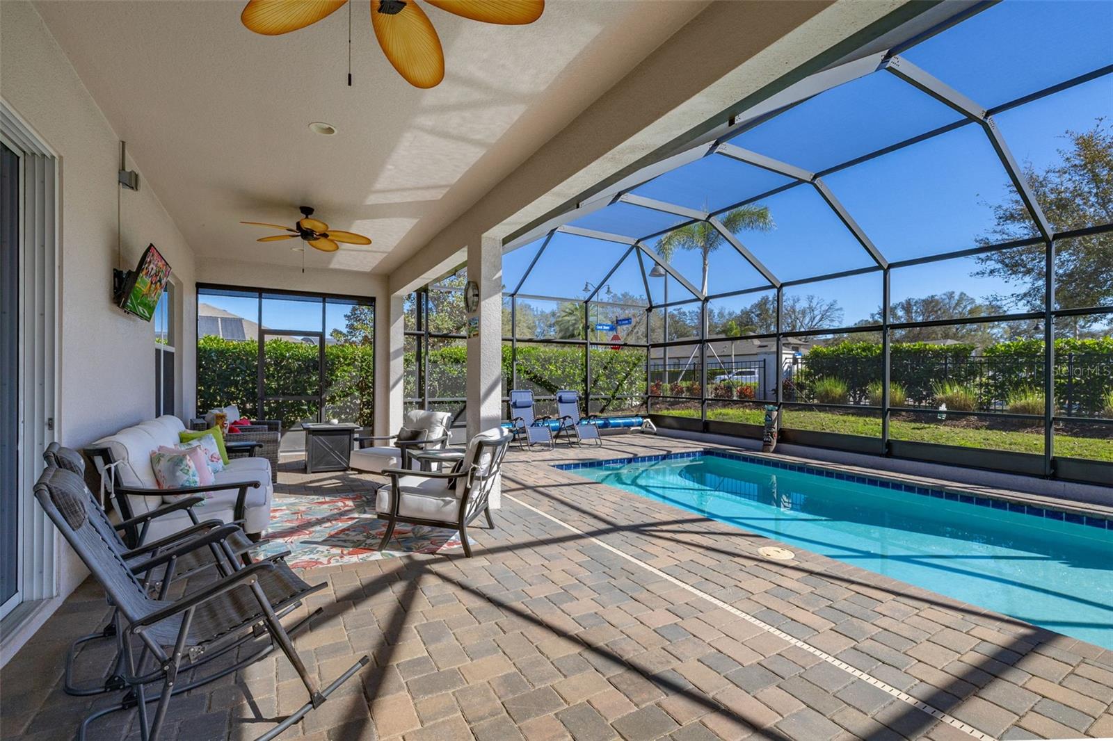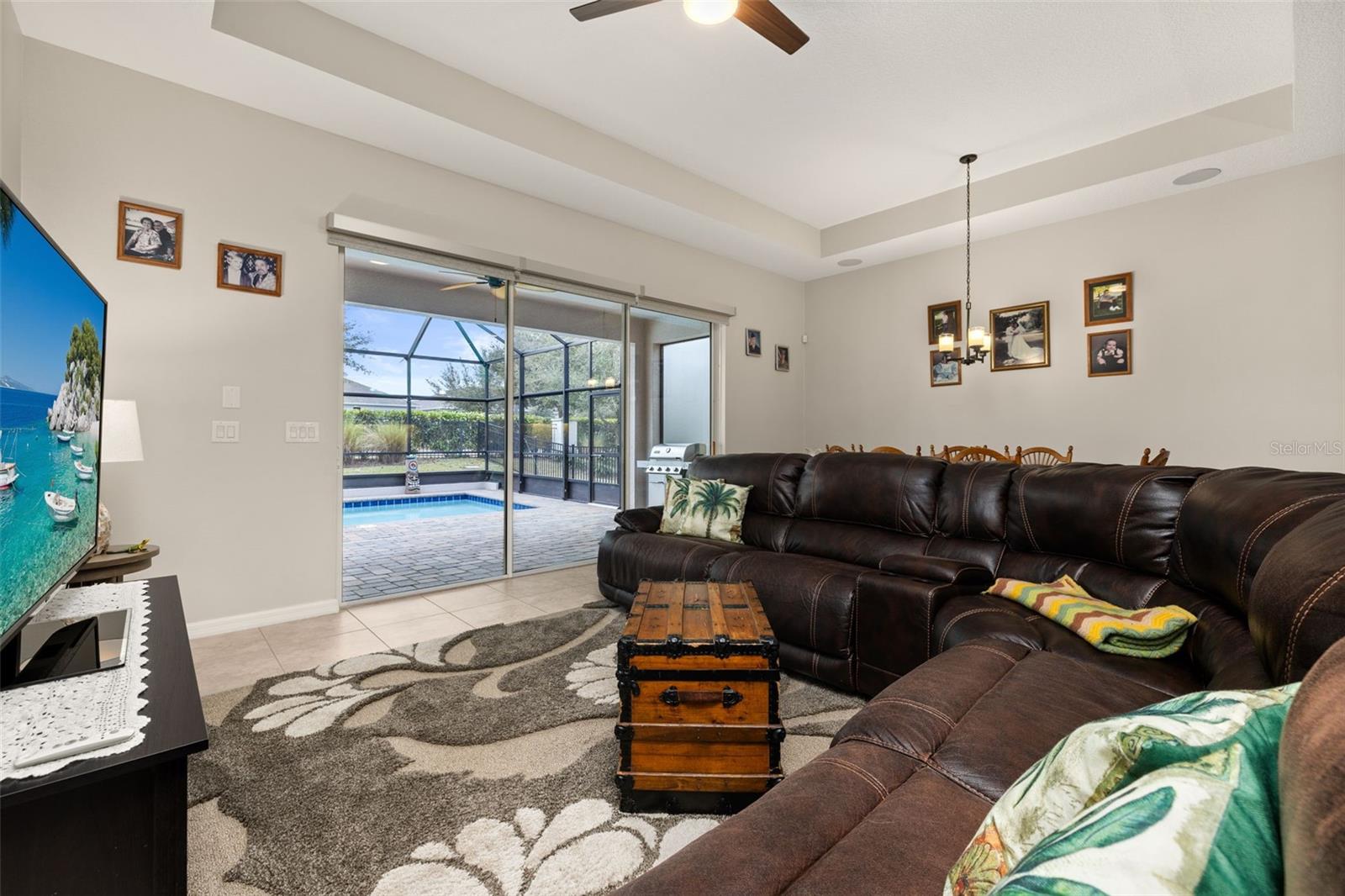 Nestled in the heart of Four Seasons Orlando, this beautifully designed corner lot residence offers a HEATED POOL with screen enclosure, southern exposure, Generac Home Generator and high ceilings which create a bright and inviting atmosphere. As you step inside, one discovers a thoughtfully designed interior with 16x16 ceramic tile flooring, high baseboards, large windows and recessed lighting throughout. The open kitchen is a chef's delight, equipped with a 4 burner GE Profile gas stove with vented hood and stacked drawers, Aristokraft mocha colored solid wood cabinets with soft close drawers, desert brown colored granite counters with single basin stainless steel undermount sink, single handle pulldown faucet, brushed nickel pulls, undermount lighting and polished diamond mosaic tile backsplash. GE Profile stainless steel built in oven and microwave, refrigerator and dishwasher completes this look. The oversized living/dining room combo with tray ceiling overlooks the pool area through the 3 panel sliding glass doors. The spacious screened-in lanai and heated pool area is accented by turquoise colored tile coping and stone paver pool deck with French drains, perfect for entertaining or al fresco dining. The master suite features a tray ceiling, luxurious ensuite bathroom and generously sized walk-in closet. The frameless shower enclosure features rainfall showerhead, shower seat, shower nook, handheld showerhead and transom window for natural light. The gentlemen's height dual vanity is complete with soft close stacked drawers and cabinets, desert brown colored granite countertops, rectangular ceramic undermount sinks and brushed nickel single handle faucets. Located in the Four Seasons Active Adult Community, this home offers a sophisticated lifestyle with all the modern conveniences. Included is a resort style clubhouse with pickleball, bocce ball and tennis courts, zero entry pool, billiards room, game room, art room and ball room as well as a 24 hour guard gate. Just a few miles from Disney, Celebration and all that Central Florida has to offer, experience luxury living at its finest.