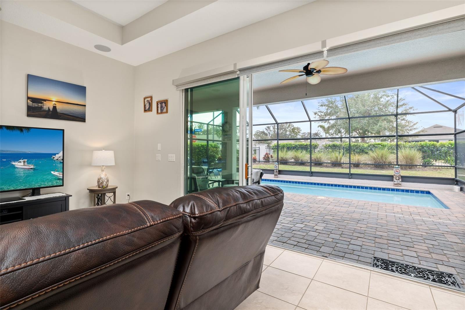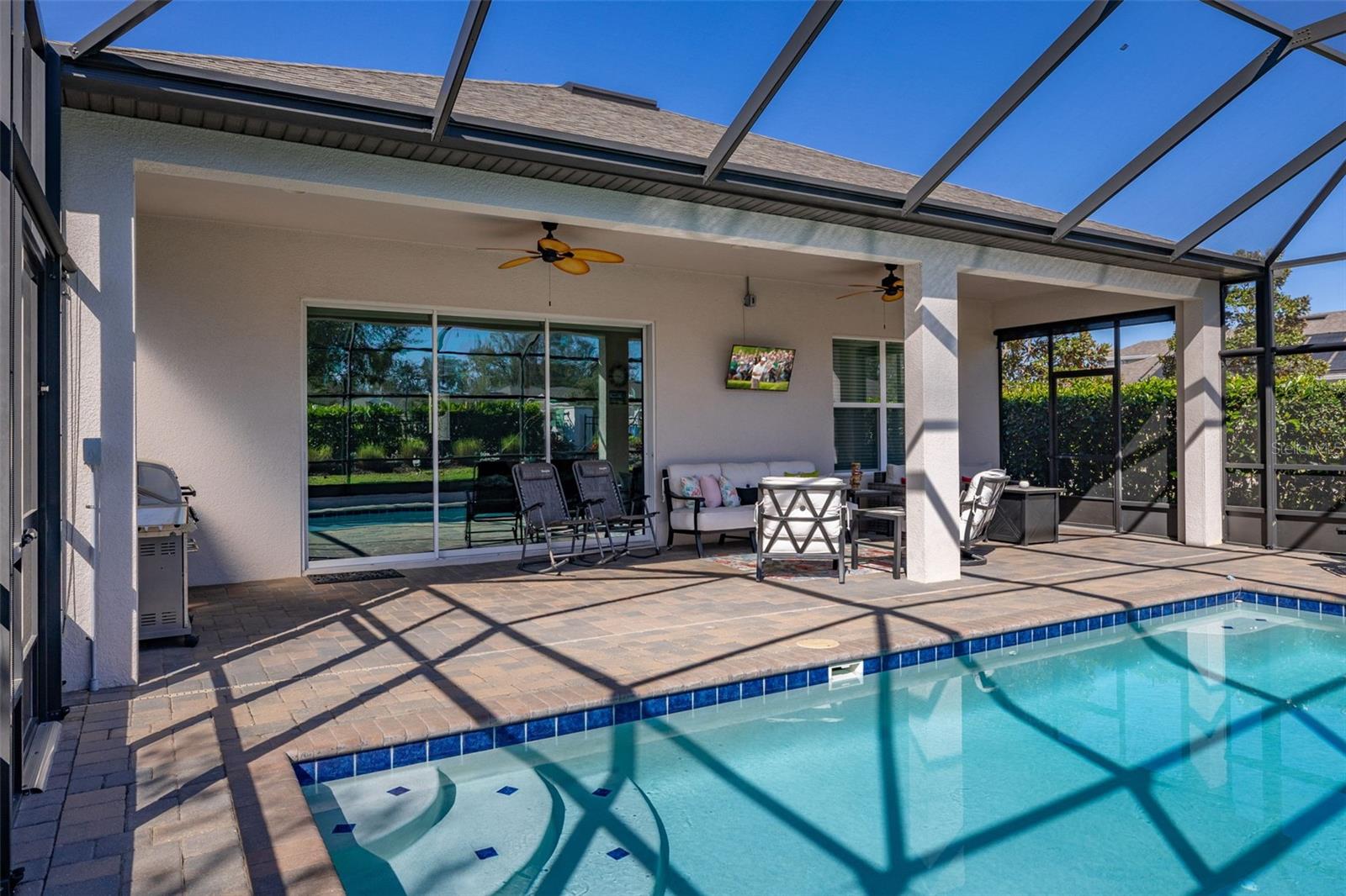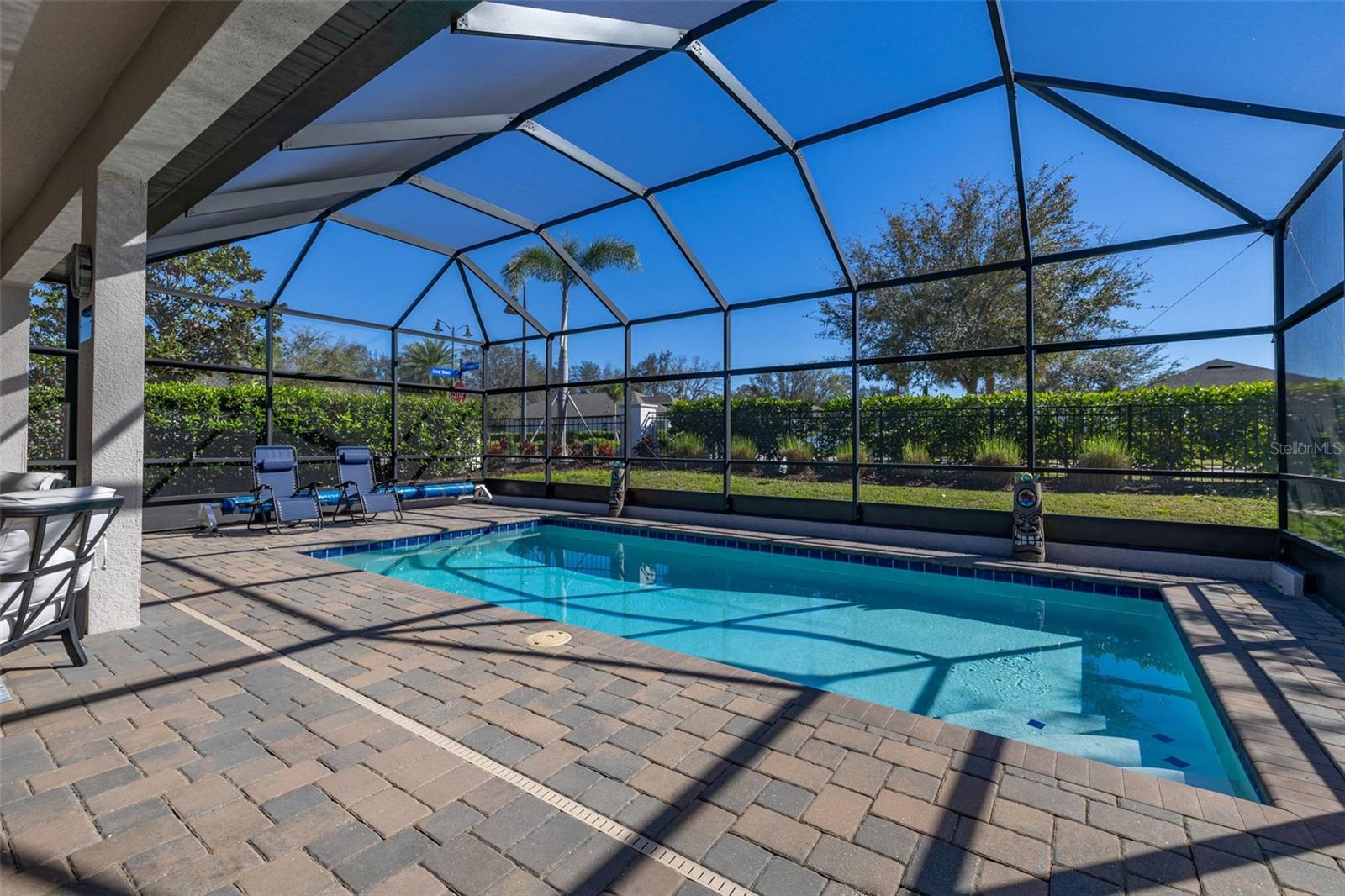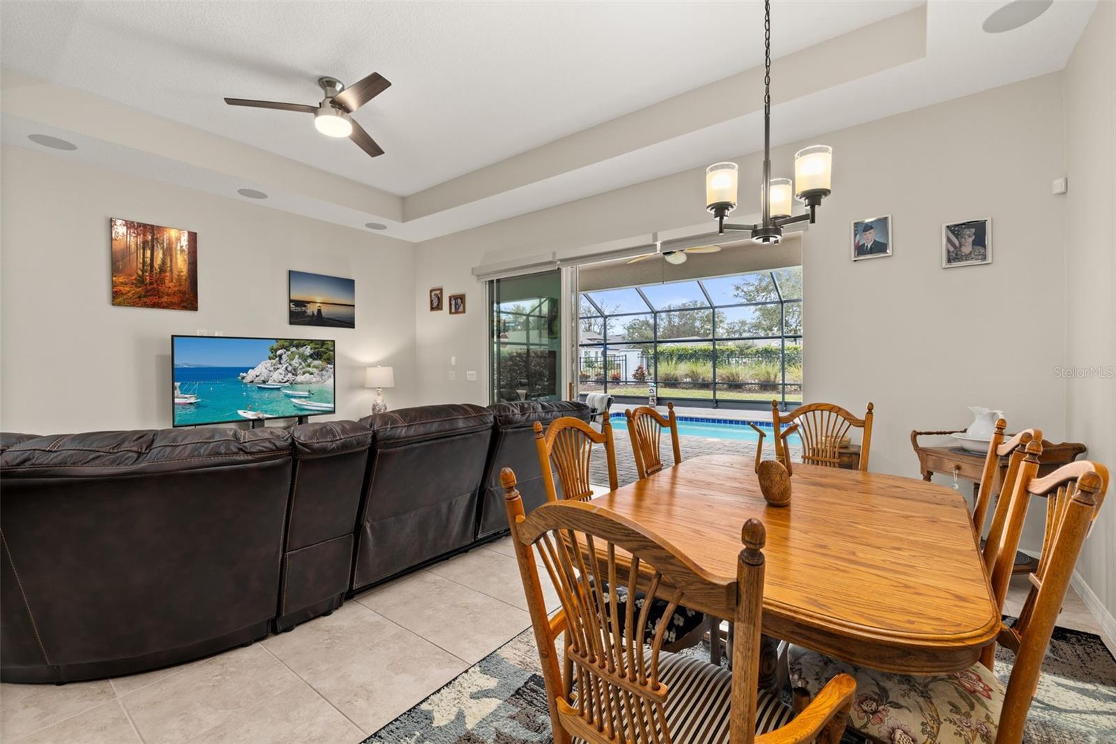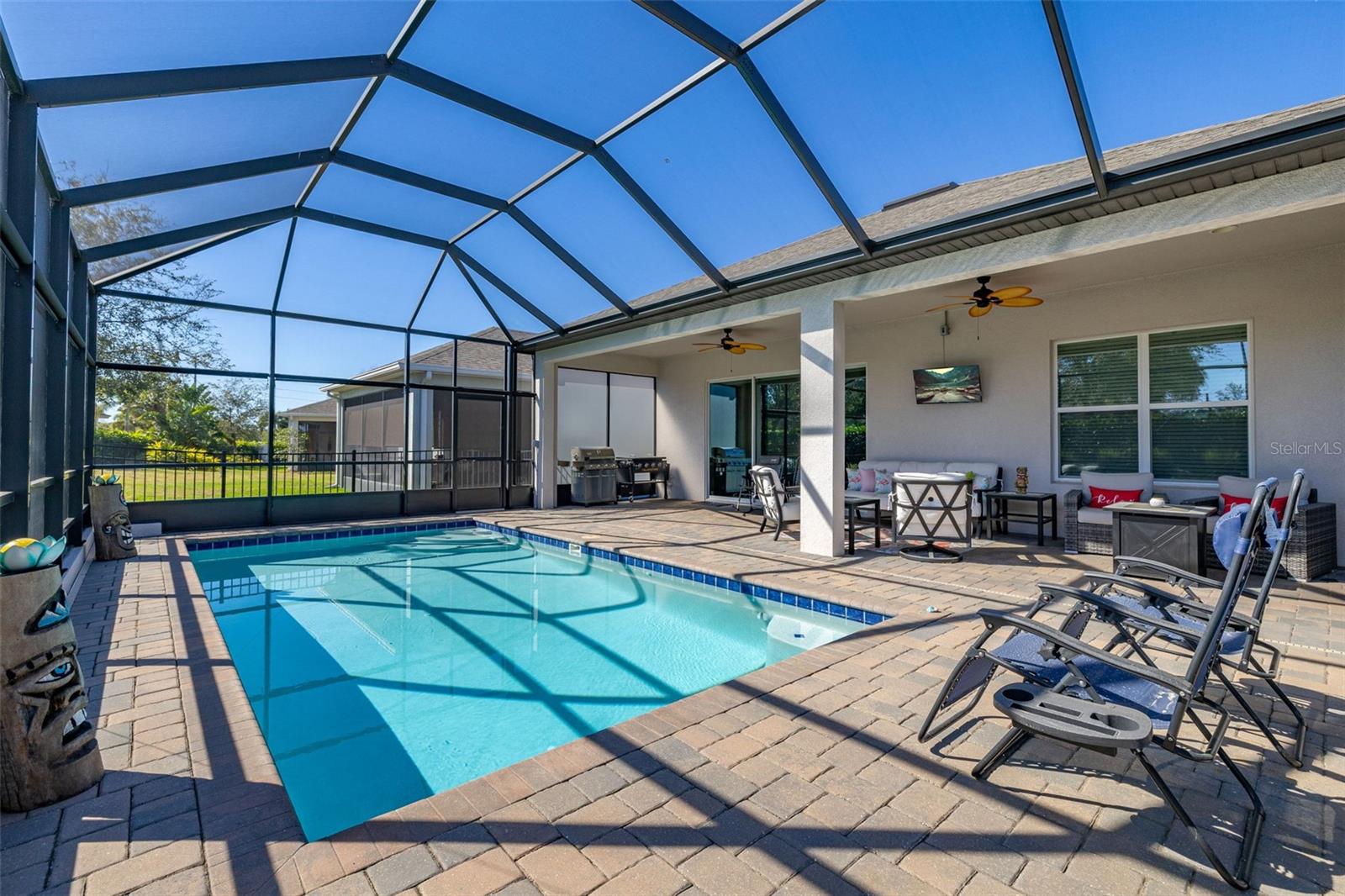 Nestled in the heart of Four Seasons Orlando, this beautifully designed corner lot residence offers a HEATED POOL with screen enclosure, southern exposure, Generac Home Generator and high ceilings which create a bright and inviting atmosphere. As you step inside, one discovers a thoughtfully designed interior with 16x16 ceramic tile flooring, high baseboards, large windows and recessed lighting throughout. The open kitchen is a chef's delight, equipped with a 4 burner GE Profile gas stove with vented hood and stacked drawers, Aristokraft mocha colored solid wood cabinets with soft close drawers, desert brown colored granite counters with single basin stainless steel undermount sink, single handle pulldown faucet, brushed nickel pulls, undermount lighting and polished diamond mosaic tile backsplash. GE Profile stainless steel built in oven and microwave, refrigerator and dishwasher completes this look. The oversized living/dining room combo with tray ceiling overlooks the pool area through the 3 panel sliding glass doors. The spacious screened-in lanai and heated pool area is accented by turquoise colored tile coping and stone paver pool deck with French drains, perfect for entertaining or al fresco dining. The master suite features a tray ceiling, luxurious ensuite bathroom and generously sized walk-in closet. The frameless shower enclosure features rainfall showerhead, shower seat, shower nook, handheld showerhead and transom window for natural light. The gentlemen's height dual vanity is complete with soft close stacked drawers and cabinets, desert brown colored granite countertops, rectangular ceramic undermount sinks and brushed nickel single handle faucets. Located in the Four Seasons Active Adult Community, this home offers a sophisticated lifestyle with all the modern conveniences. Included is a resort style clubhouse with pickleball, bocce ball and tennis courts, zero entry pool, billiards room, game room, art room and ball room as well as a 24 hour guard gate. Just a few miles from Disney, Celebration and all that Central Florida has to offer, experience luxury living at its finest.