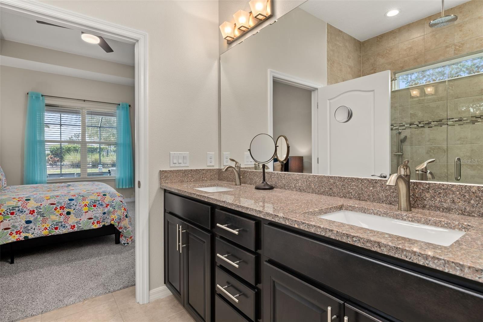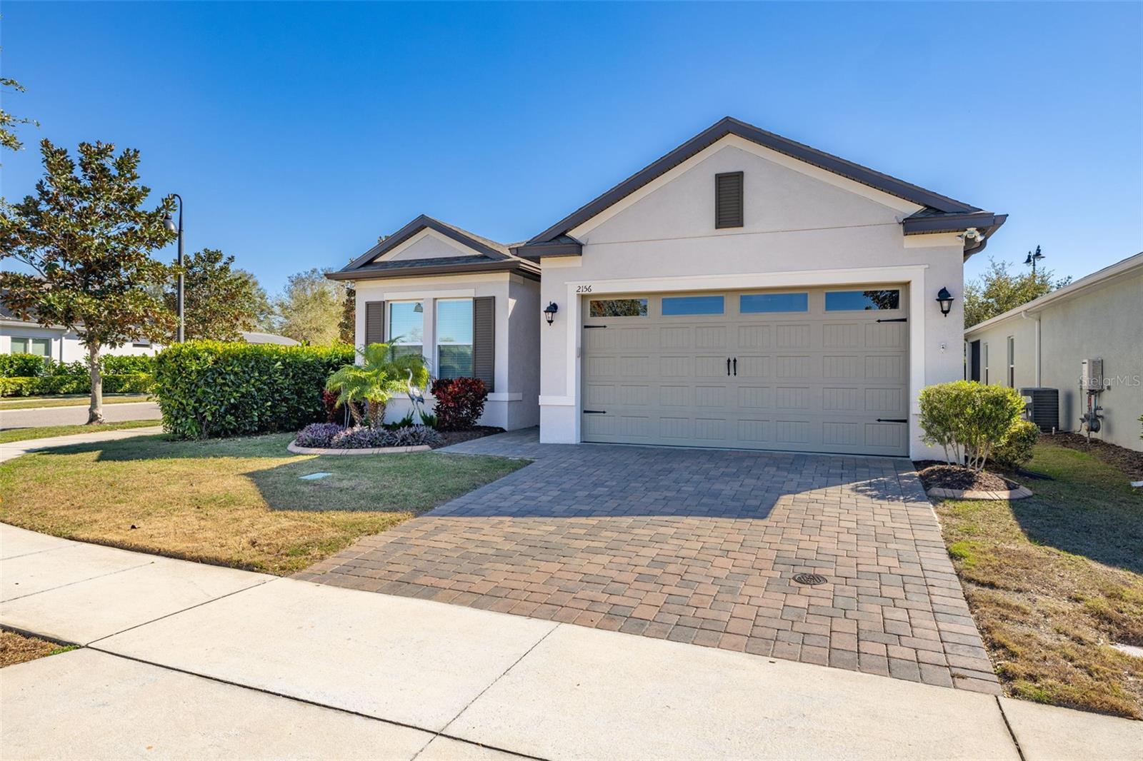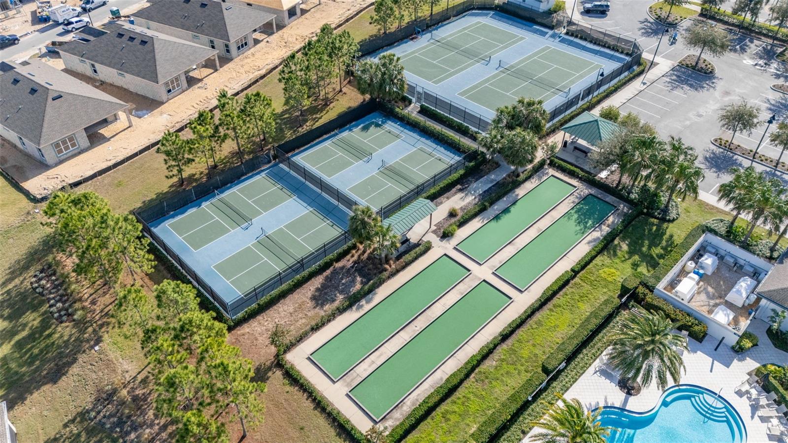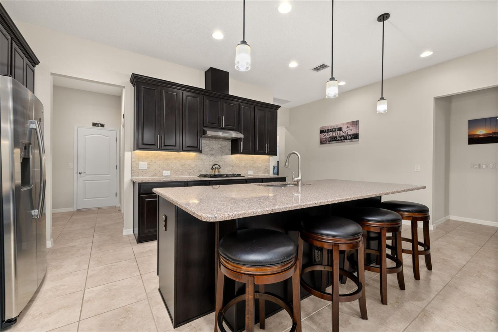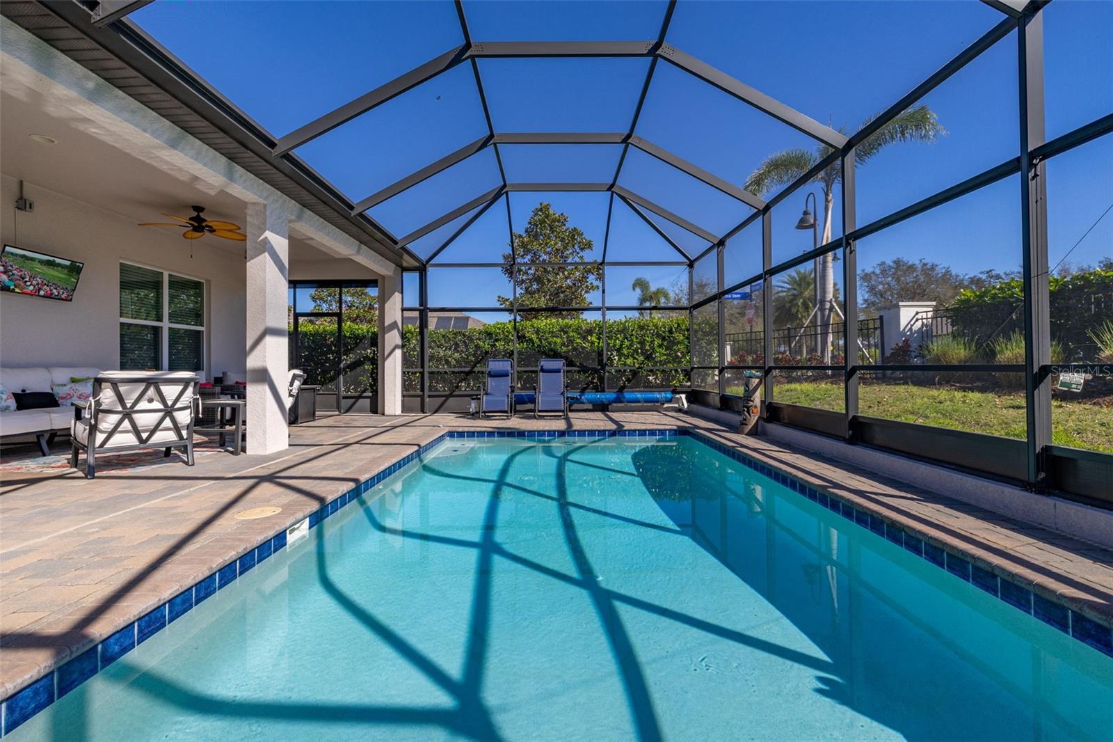 Nestled in the heart of Four Seasons Orlando, this beautifully designed corner lot residence offers a HEATED POOL with screen enclosure, southern exposure, Generac Home Generator and high ceilings which create a bright and inviting atmosphere. As you step inside, one discovers a thoughtfully designed interior with 16x16 ceramic tile flooring, high baseboards, large windows and recessed lighting throughout. The open kitchen is a chef's delight, equipped with a 4 burner GE Profile gas stove with vented hood and stacked drawers, Aristokraft mocha colored solid wood cabinets with soft close drawers, desert brown colored granite counters with single basin stainless steel undermount sink, single handle pulldown faucet, brushed nickel pulls, undermount lighting and polished diamond mosaic tile backsplash. GE Profile stainless steel built in oven and microwave, refrigerator and dishwasher completes this look. The oversized living/dining room combo with tray ceiling overlooks the pool area through the 3 panel sliding glass doors. The spacious screened-in lanai and heated pool area is accented by turquoise colored tile coping and stone paver pool deck with French drains, perfect for entertaining or al fresco dining. The master suite features a tray ceiling, luxurious ensuite bathroom and generously sized walk-in closet. The frameless shower enclosure features rainfall showerhead, shower seat, shower nook, handheld showerhead and transom window for natural light. The gentlemen's height dual vanity is complete with soft close stacked drawers and cabinets, desert brown colored granite countertops, rectangular ceramic undermount sinks and brushed nickel single handle faucets. Located in the Four Seasons Active Adult Community, this home offers a sophisticated lifestyle with all the modern conveniences. Included is a resort style clubhouse with pickleball, bocce ball and tennis courts, zero entry pool, billiards room, game room, art room and ball room as well as a 24 hour guard gate. Just a few miles from Disney, Celebration and all that Central Florida has to offer, experience luxury living at its finest.