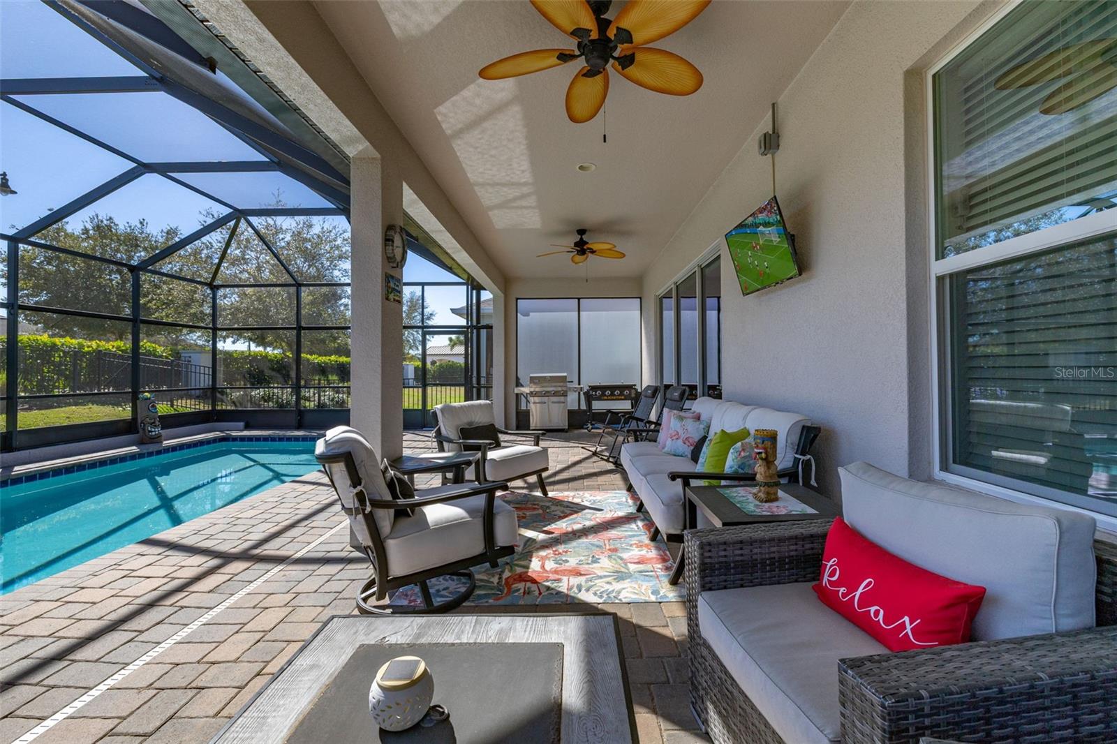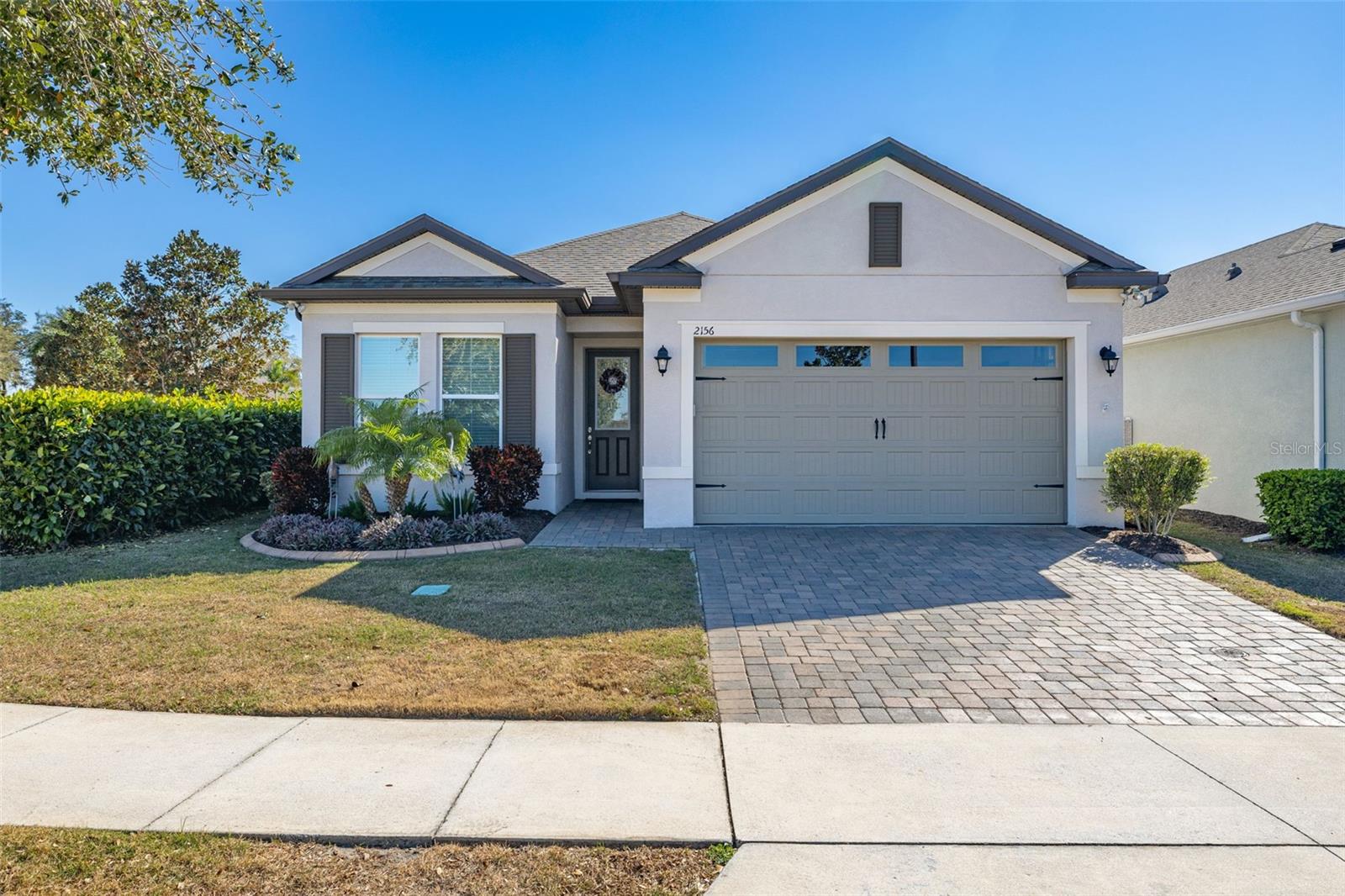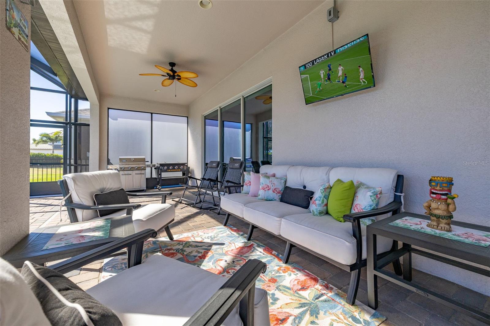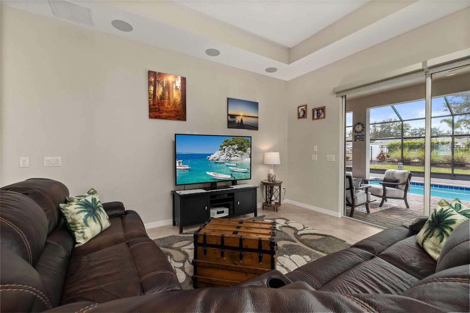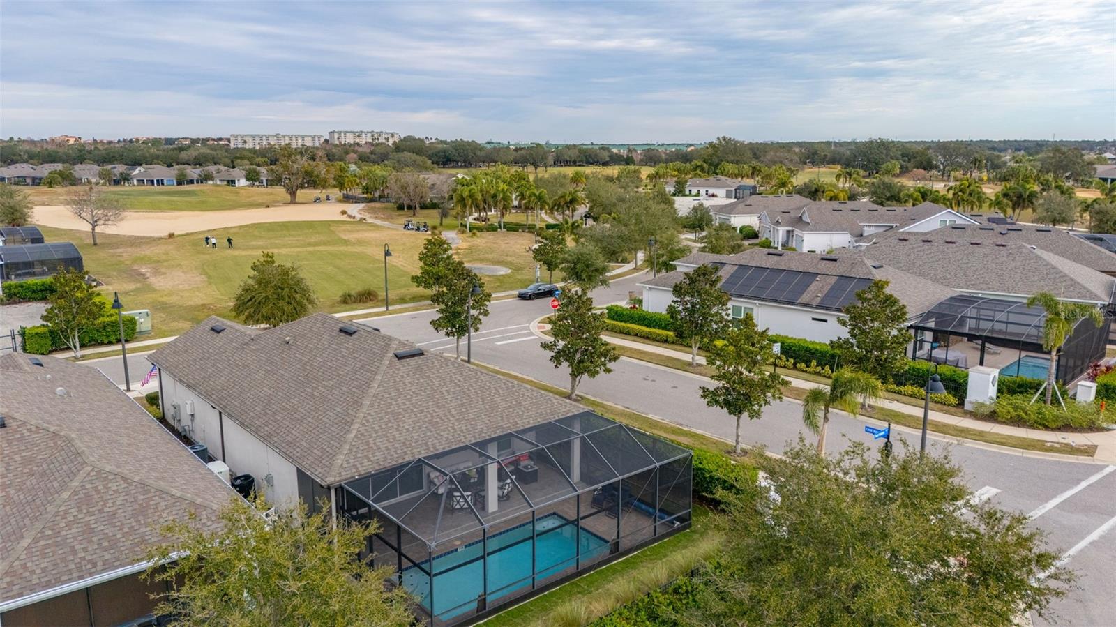 Nestled in the heart of Four Seasons Orlando, this beautifully designed corner lot residence offers a HEATED POOL with screen enclosure, southern exposure, Generac Home Generator and high ceilings which create a bright and inviting atmosphere. As you step inside, one discovers a thoughtfully designed interior with 16x16 ceramic tile flooring, high baseboards, large windows and recessed lighting throughout. The open kitchen is a chef's delight, equipped with a 4 burner GE Profile gas stove with vented hood and stacked drawers, Aristokraft mocha colored solid wood cabinets with soft close drawers, desert brown colored granite counters with single basin stainless steel undermount sink, single handle pulldown faucet, brushed nickel pulls, undermount lighting and polished diamond mosaic tile backsplash. GE Profile stainless steel built in oven and microwave, refrigerator and dishwasher completes this look. The oversized living/dining room combo with tray ceiling overlooks the pool area through the 3 panel sliding glass doors. The spacious screened-in lanai and heated pool area is accented by turquoise colored tile coping and stone paver pool deck with French drains, perfect for entertaining or al fresco dining. The master suite features a tray ceiling, luxurious ensuite bathroom and generously sized walk-in closet. The frameless shower enclosure features rainfall showerhead, shower seat, shower nook, handheld showerhead and transom window for natural light. The gentlemen's height dual vanity is complete with soft close stacked drawers and cabinets, desert brown colored granite countertops, rectangular ceramic undermount sinks and brushed nickel single handle faucets. Located in the Four Seasons Active Adult Community, this home offers a sophisticated lifestyle with all the modern conveniences. Included is a resort style clubhouse with pickleball, bocce ball and tennis courts, zero entry pool, billiards room, game room, art room and ball room as well as a 24 hour guard gate. Just a few miles from Disney, Celebration and all that Central Florida has to offer, experience luxury living at its finest.