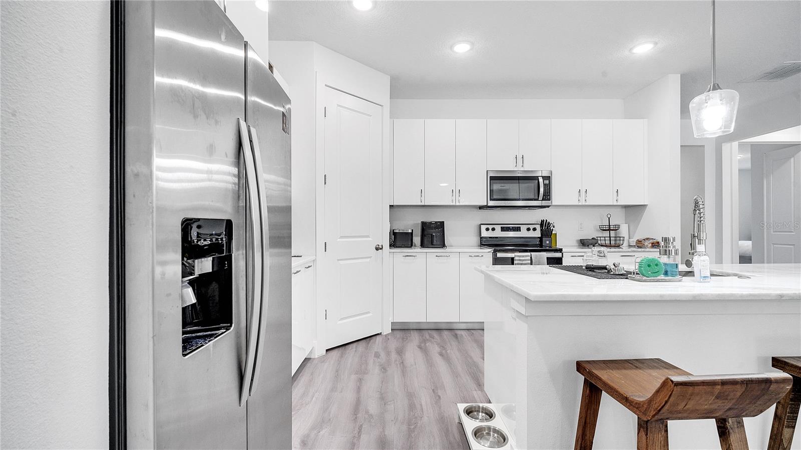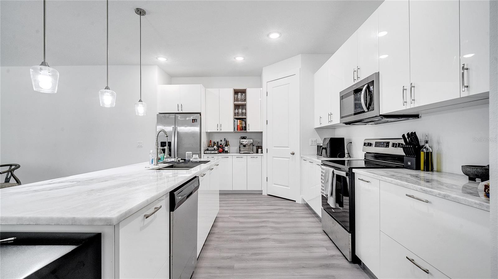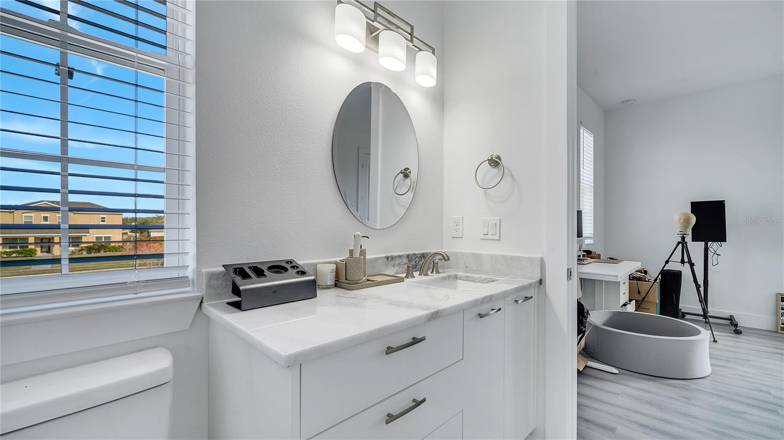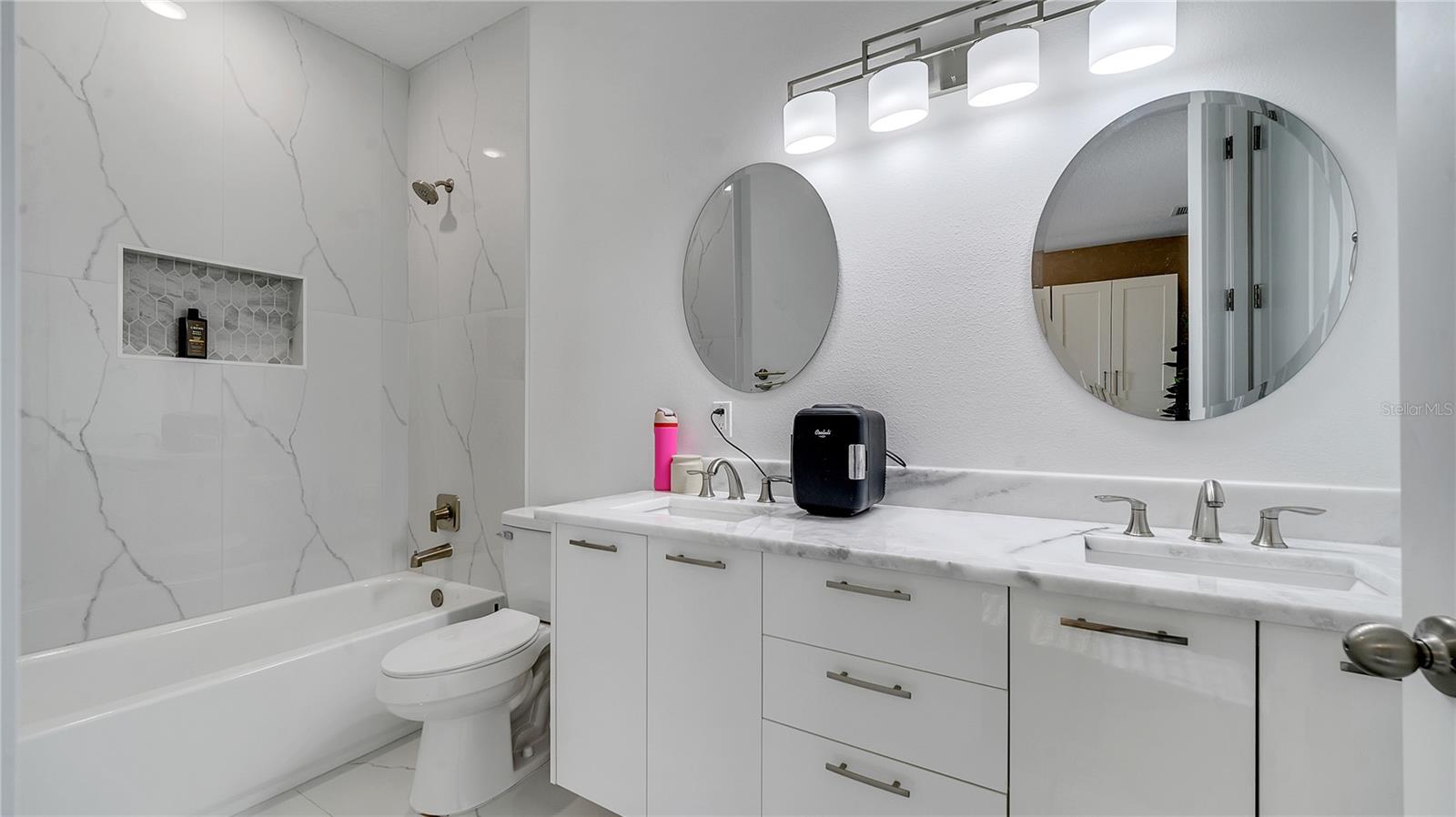 Move-In Ready! This stunning home is sure to impress! It boasts a modern kitchen with sleek stainless steel appliances, soaring ceilings, and two master suites, each featuring elegant level 5 granite countertops and floating vanities. The home offers a luxurious touch with vinyl and marble flooring throughout—no carpet anywhere! Situated in the gated Trafalgar Village community, it’s just 10 minutes from the corner of Osceola Parkway and Highway 192. Priced to sell quickly!