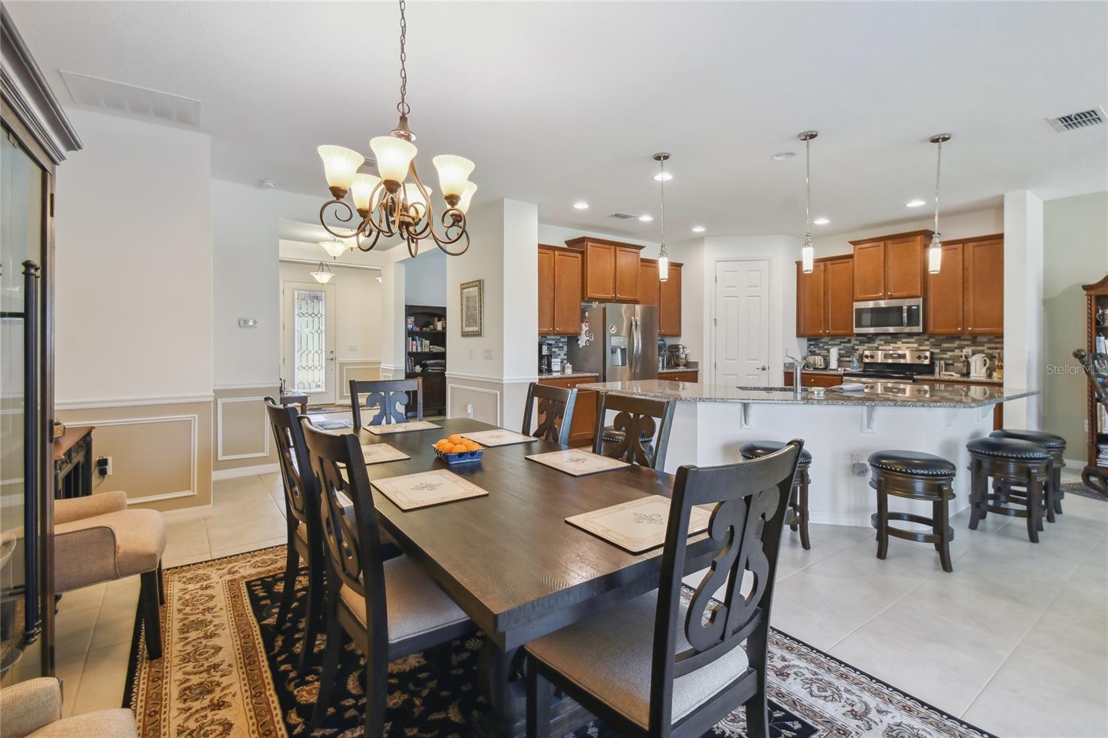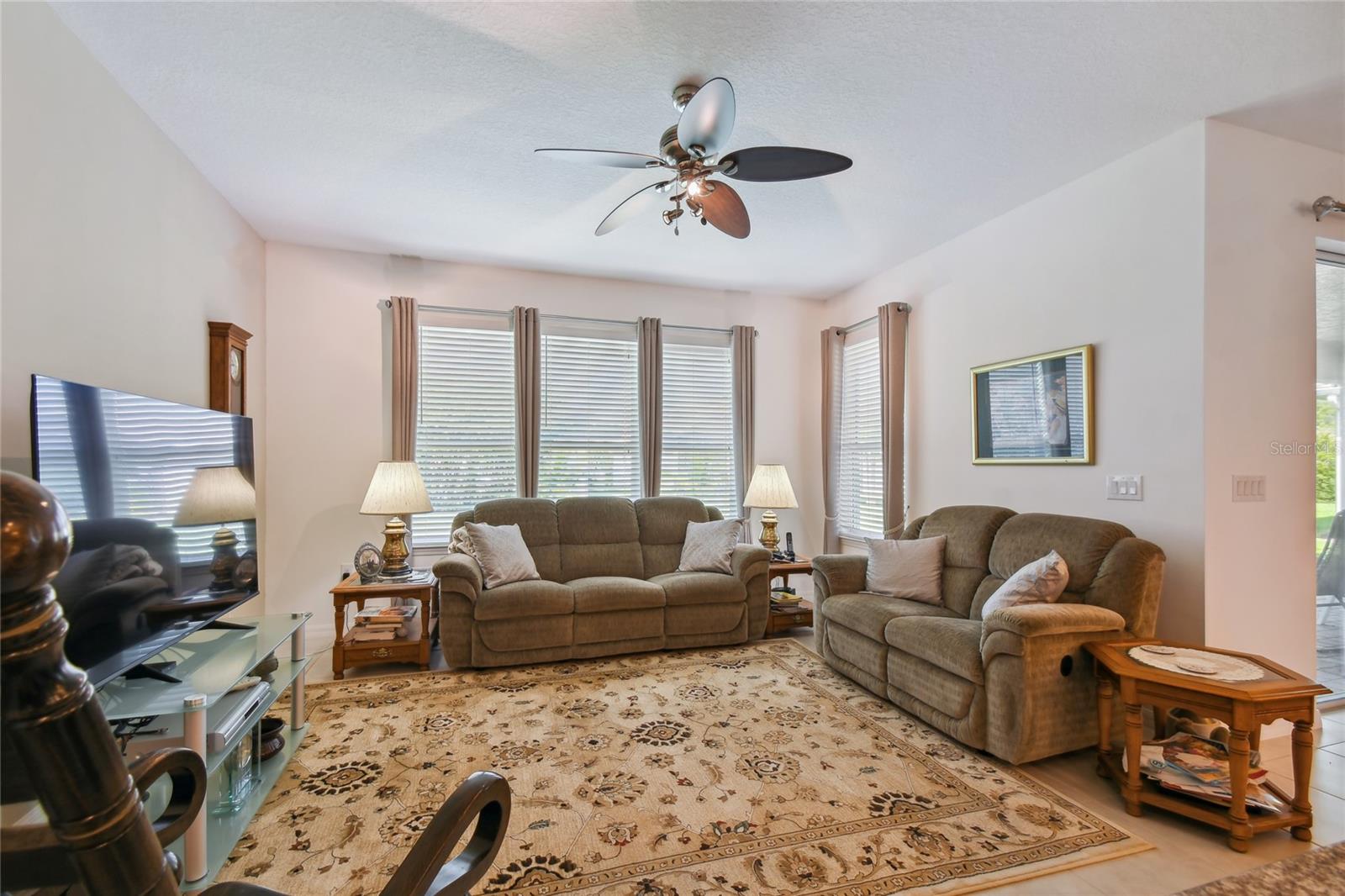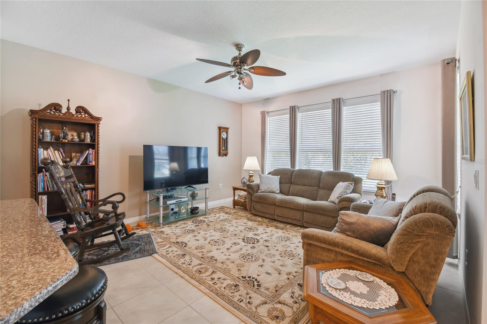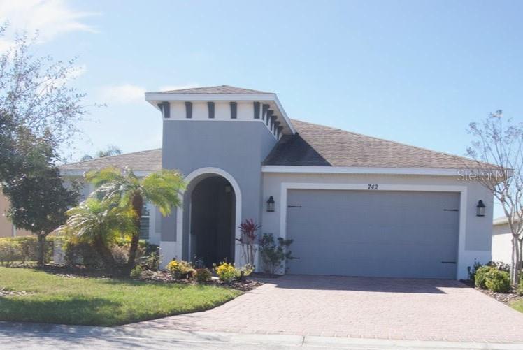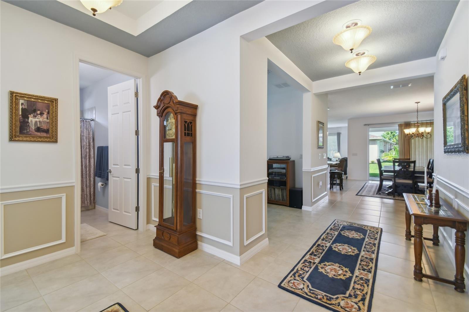 Welcome to this beautifully maintained Calabria model home. Freshly painted exterior July, 2024. A covered entryway to full view leaded glass door opens to a spacious foyer. Beautiful detail with architectural trim, upgraded lighting and contrasting ceiling paint lead to the open floor plan of this "like new" home. The Kitchen features tons of cabinets and a pantry for storage. A work area with Granite counters and tile backsplash are sure to please the cook. Glamorous pendants at the island serving, seating area make this a great home for entertaining. The dining area accommodates large table and chairs. Sliding doors to Lanai allow lots of natural light to this area. The living room also is light and bright with two walls of window. Living room and dining room can be switched to suit owner's preference. Main Bedroom Suite is a peaceful retreat with large ensuite bathroom dressing room. In it are walk-in closet, linen closet vanity with dual sinks. The Guest Bedroom and another full bathroom with tub are at opposite end of house. The den/study is a large room that can easily be changed to create a third bedroom. Solivita is a popular lifestyle community with over 250 clubs for a variety of hobbies and interests. Solivita amenities include: 14 heated pools, 17 Pickleball Courts, 2 Golf Courses, 9 Tennis Courts, 4 Bocce Courts, 4 Shuffleboard Courts, 3 Horseshoe Pits, Cornhole, Billiards Room, 2 Dog Parks, a Community Garden, and Tot Playground. The Palms fitness center was renovated in August 2024 and boasts state-of-the-art gym equipment. The Riviera fitness center has both an indoor heated pool with walking track above and an outdoor pool with hot tubs. Professional trainers teach day and evening classes. HOA provides Landscaping and Irrigation for common areas as well as home sites, provides security with gate guards and mobile patrols, provides automated gate access for residents via license plate readers. HOA maintains roads throughout community. Enjoy maintenance-free resort-style living in this friendly community only a short distance from Orlando International Airport. Brand new shopping center across from Main Gate features: Sprouts Grocery, TJMaxx, Burlington, Ross, First Watch, TD Bank, Urgent Care, and much more.