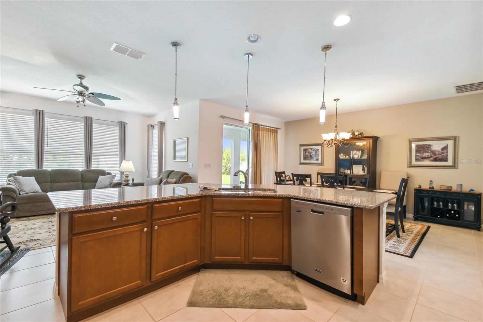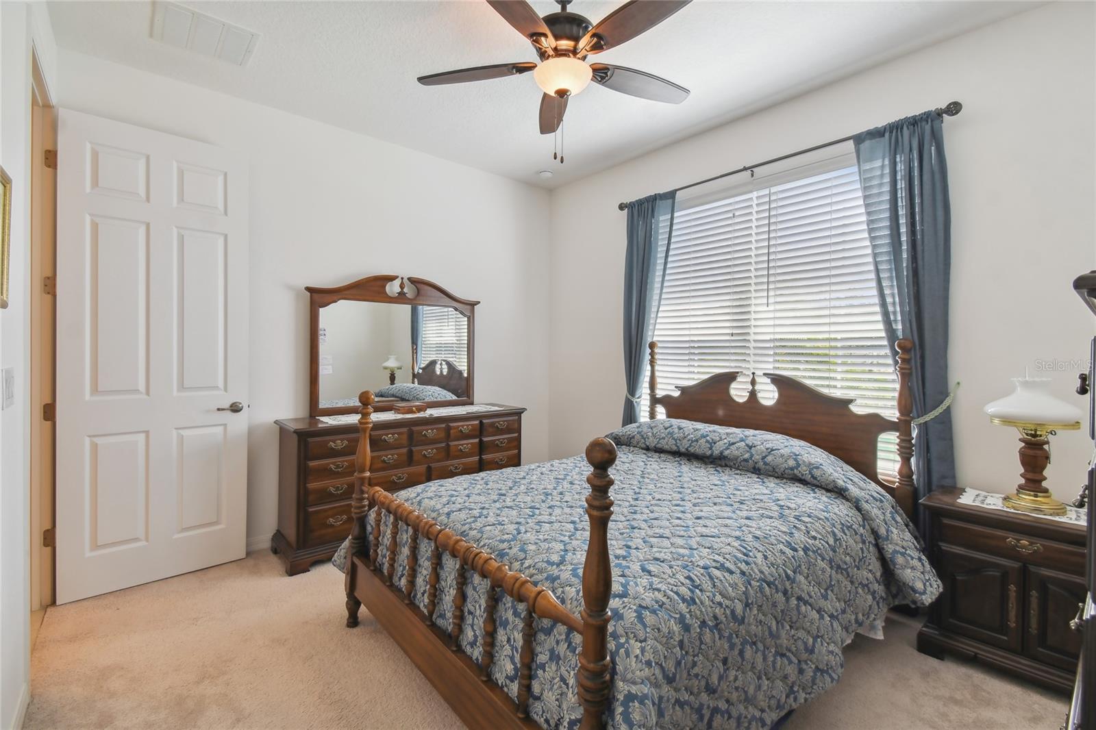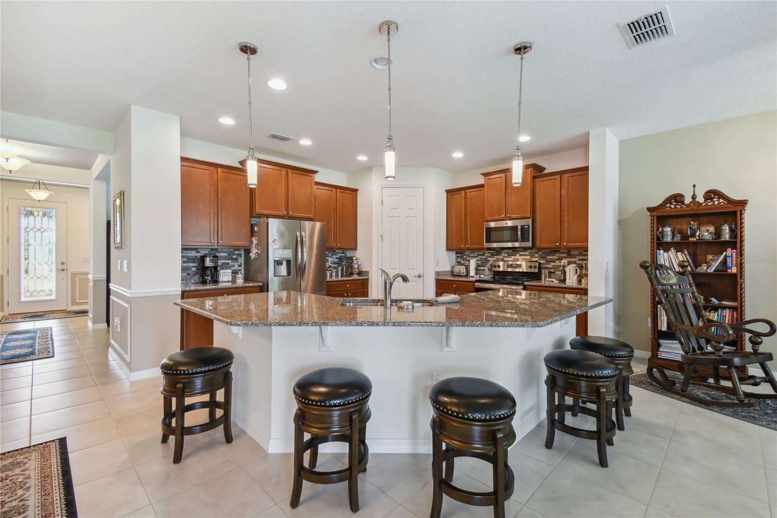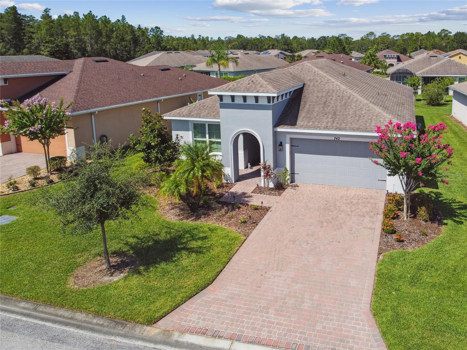Welcome to this beautifully maintained Calabria model home. Freshly painted exterior July, 2024. A covered entryway to full view leaded glass door opens to a spacious foyer. Beautiful detail with architectural trim, upgraded lighting and contrasting ceiling paint lead to the open floor plan of this "like new" home. The Kitchen features tons of cabinets and a pantry for storage. A work area with Granite counters and tile backsplash are sure to please the cook. Glamorous pendants at the island serving, seating area make this a great home for entertaining. The dining area accommodates large table and chairs. Sliding doors to Lanai allow lots of natural light to this area. The living room also is light and bright with two walls of window. Living room and dining room can be switched to suit owner's preference. Main Bedroom Suite is a peaceful retreat with large ensuite bathroom dressing room. In it are walk-in closet, linen closet vanity with dual sinks. The Guest Bedroom and another full bathroom with tub are at opposite end of house. The den/study is a large room that can easily be changed to create a third bedroom. Solivita is a popular lifestyle community with over 250 clubs for a variety of hobbies and interests. Solivita amenities include: 14 heated pools, 17 Pickleball Courts, 2 Golf Courses, 9 Tennis Courts, 4 Bocce Courts, 4 Shuffleboard Courts, 3 Horseshoe Pits, Cornhole, Billiards Room, 2 Dog Parks, a Community Garden, and Tot Playground. The Palms fitness center was renovated in August 2024 and boasts state-of-the-art gym equipment. The Riviera fitness center has both an indoor heated pool with walking track above and an outdoor pool with hot tubs. Professional trainers teach day and evening classes. HOA provides Landscaping and Irrigation for common areas as well as home sites, provides security with gate guards and mobile patrols, provides automated gate access for residents via license plate readers. HOA maintains roads throughout community. Enjoy maintenance-free resort-style living in this friendly community only a short distance from Orlando International Airport. Brand new shopping center across from Main Gate features: Sprouts Grocery, TJMaxx, Burlington, Ross, First Watch, TD Bank, Urgent Care, and much more.