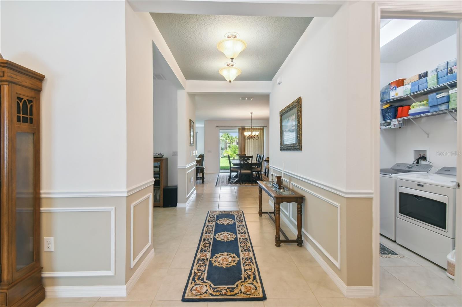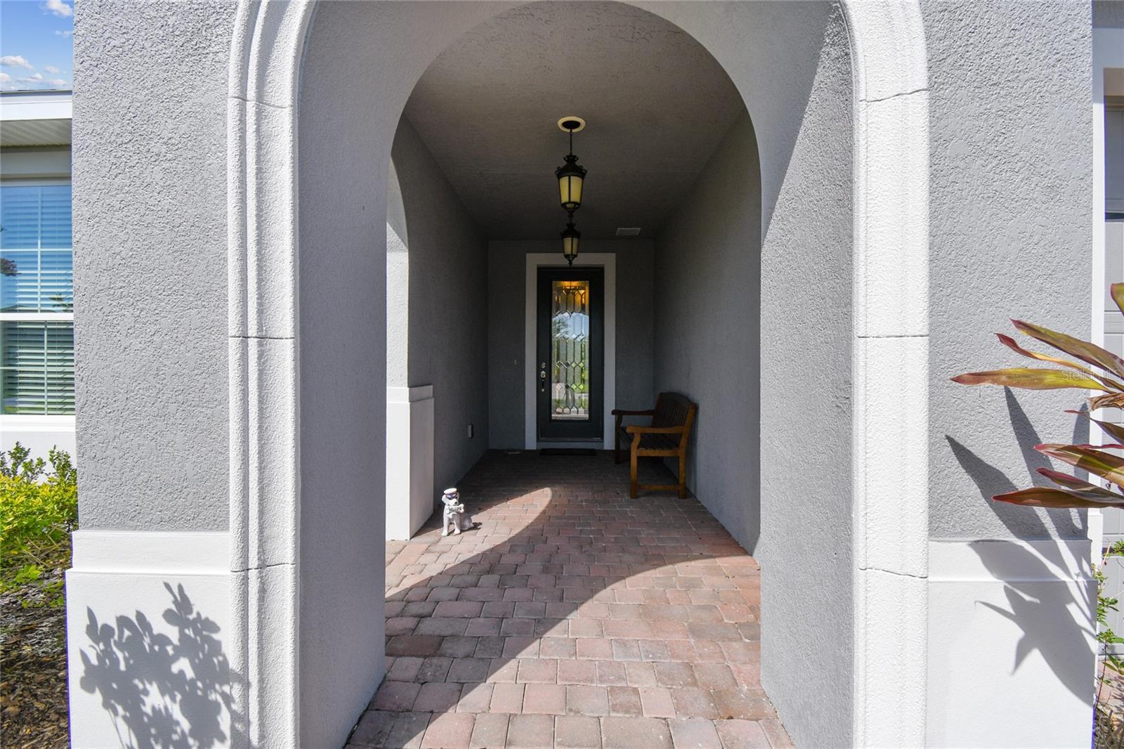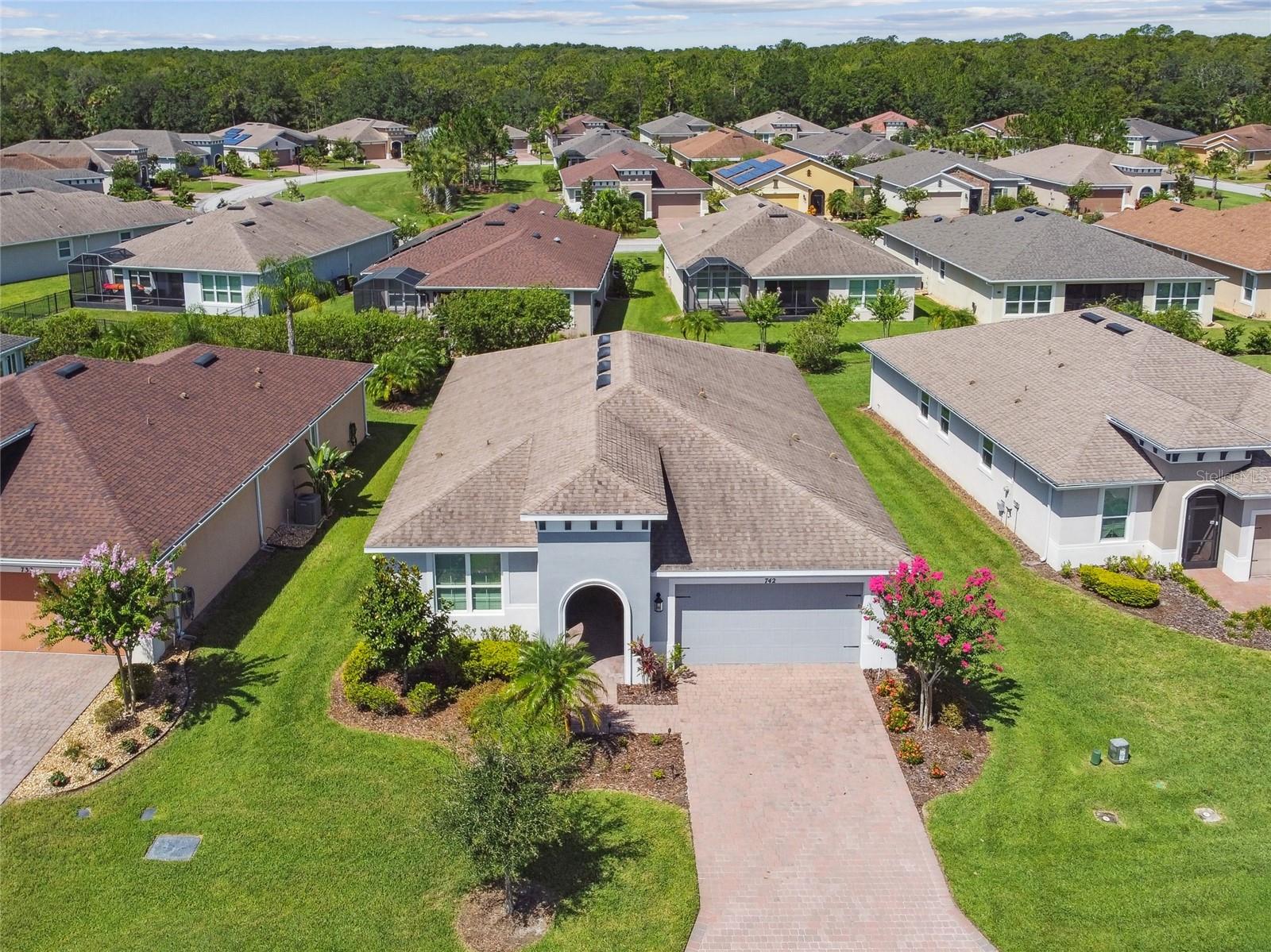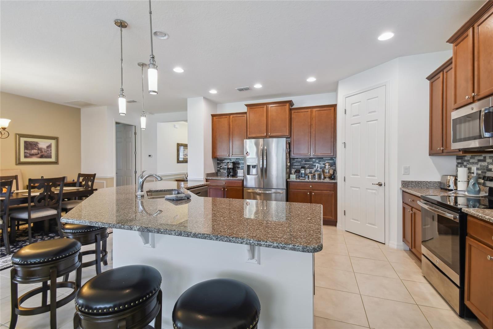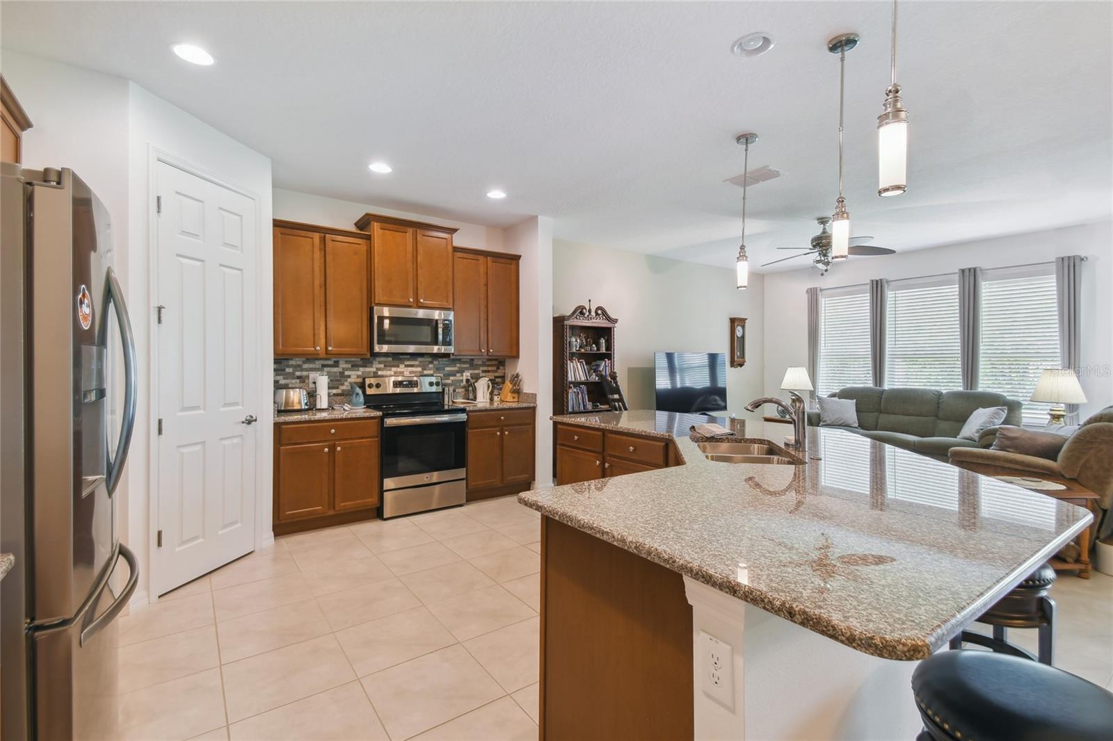 Welcome to this beautifully maintained Calabria model home. Freshly painted exterior July, 2024. A covered entryway to full view leaded glass door opens to a spacious foyer. Beautiful detail with architectural trim, upgraded lighting and contrasting ceiling paint lead to the open floor plan of this "like new" home. The Kitchen features tons of cabinets and a pantry for storage. A work area with Granite counters and tile backsplash are sure to please the cook. Glamorous pendants at the island serving, seating area make this a great home for entertaining. The dining area accommodates large table and chairs. Sliding doors to Lanai allow lots of natural light to this area. The living room also is light and bright with two walls of window. Living room and dining room can be switched to suit owner's preference. Main Bedroom Suite is a peaceful retreat with large ensuite bathroom dressing room. In it are walk-in closet, linen closet vanity with dual sinks. The Guest Bedroom and another full bathroom with tub are at opposite end of house. The den/study is a large room that can easily be changed to create a third bedroom. Solivita is a popular lifestyle community with over 250 clubs for a variety of hobbies and interests. Solivita amenities include: 14 heated pools, 17 Pickleball Courts, 2 Golf Courses, 9 Tennis Courts, 4 Bocce Courts, 4 Shuffleboard Courts, 3 Horseshoe Pits, Cornhole, Billiards Room, 2 Dog Parks, a Community Garden, and Tot Playground. The Palms fitness center was renovated in August 2024 and boasts state-of-the-art gym equipment. The Riviera fitness center has both an indoor heated pool with walking track above and an outdoor pool with hot tubs. Professional trainers teach day and evening classes. HOA provides Landscaping and Irrigation for common areas as well as home sites, provides security with gate guards and mobile patrols, provides automated gate access for residents via license plate readers. HOA maintains roads throughout community. Enjoy maintenance-free resort-style living in this friendly community only a short distance from Orlando International Airport. Brand new shopping center across from Main Gate features: Sprouts Grocery, TJMaxx, Burlington, Ross, First Watch, TD Bank, Urgent Care, and much more.