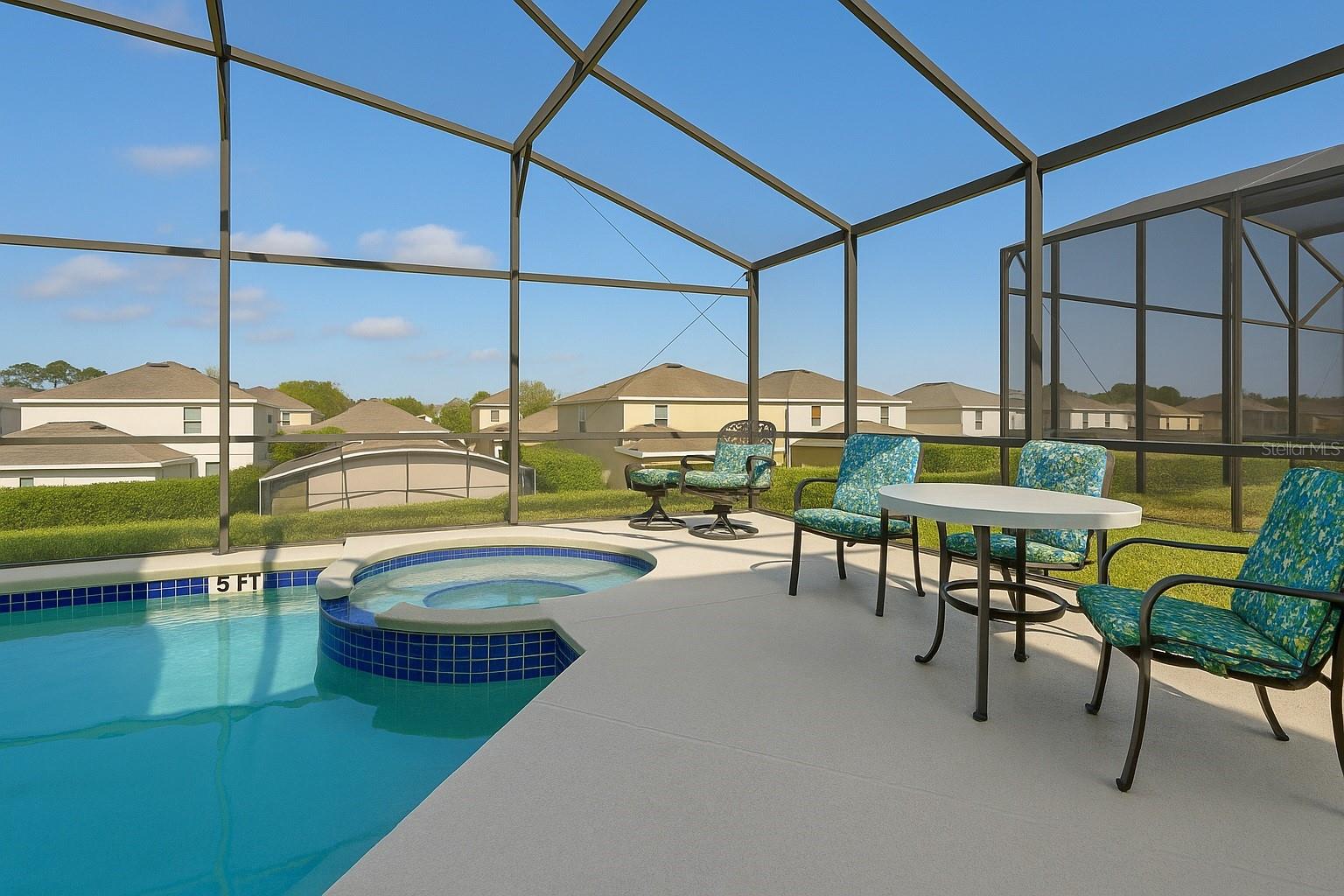 Investor Opportunity! Seller Offering Up to *** $5,000 *** Toward Closing Costs—Boost Your ROI and Secure a Profitable Property with Less Upfront Cash! *** All New Roof ***. Nestled in the heart of the highly sought-after Emerald Island Resort, this stunning Cape San Blas model offers a compelling blend of comfort, style, and resort-style amenities. Surrounded by lush conservation areas, this meticulously maintained community provides a serene and picturesque setting while being just minutes away from world-class attractions, dining, and entertainment. This exceptional villa is offered fully furnished and is in impeccable condition, making it completely move-in ready. Designed with both relaxation and functionality in mind, the spacious layout boasts five beautifully appointed bedrooms and three elegant bathrooms featuring cultured marble vanities (this model includes the optional fifth bathroom for added convenience). With over 1,950 square feet of air-conditioned living space, this home is perfect for families, vacationers, or investors looking for a prime income-generating property. A brand-new architectural shingle roof was expertly installed in February 2025, enhancing the home’s durability, weather resistance, and curb appeal for years to come. Step outside onto the expansive pool deck and embrace Florida’s year-round sunshine. The private, heated swimming pool invites you to take a refreshing dip, while the full-width safety fence ensures peace of mind for families. Unwind in the luxurious in-ground hot tub or lounge on the sun-drenched patio, ideal for entertaining or quiet relaxation. Beyond the villa, Emerald Island Resort offers an impressive array of top-tier amenities, making it more than just a community—it’s a lifestyle destination. The grand clubhouse features a sparkling pool, rejuvenating hot tub, sauna, state-of-the-art fitness center, cyber café, and a vibrant video arcade. Outdoor enthusiasts will appreciate the Tiki bar on the communal pool deck, multiple playgrounds for the younger ones, a sand volleyball court, a professionally maintained tennis center, and a scenic nature trail perfect for morning strolls or evening walks. With 24-hour gated security, beautifully landscaped grounds, and a prime location near Orlando’s premier attractions, this exquisite home presents an incredible opportunity. Whether you’re seeking a primary residence, a second home, or a lucrative vacation rental, this Cape San Blas model is a rare find that perfectly balances luxury, convenience, and investment potential. Don't miss your chance to own a piece of paradise—schedule your private tour today and experience the exceptional lifestyle that awaits you at Emerald Island Resort!