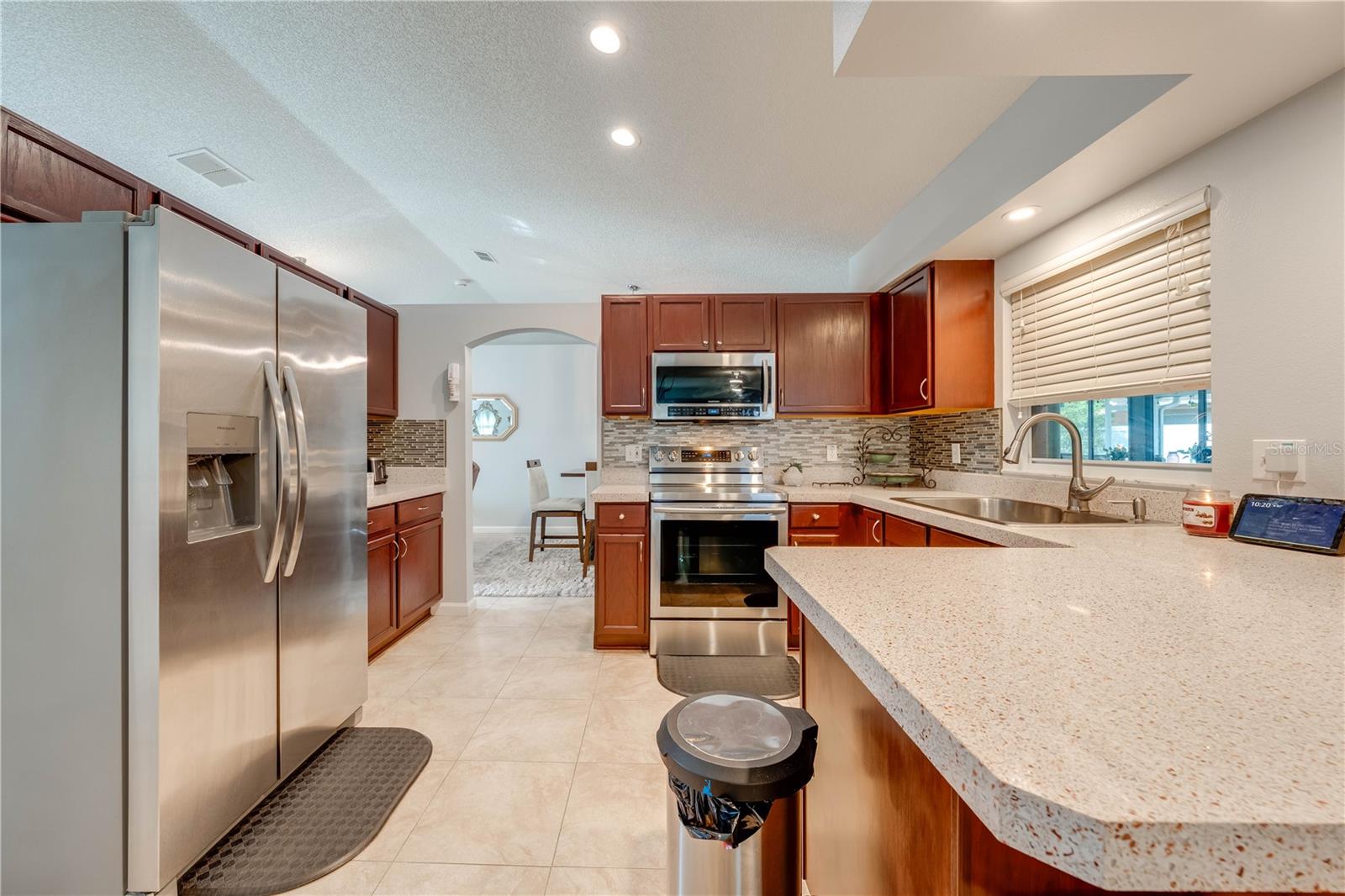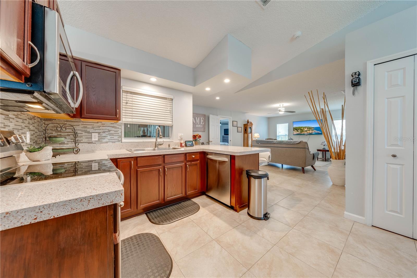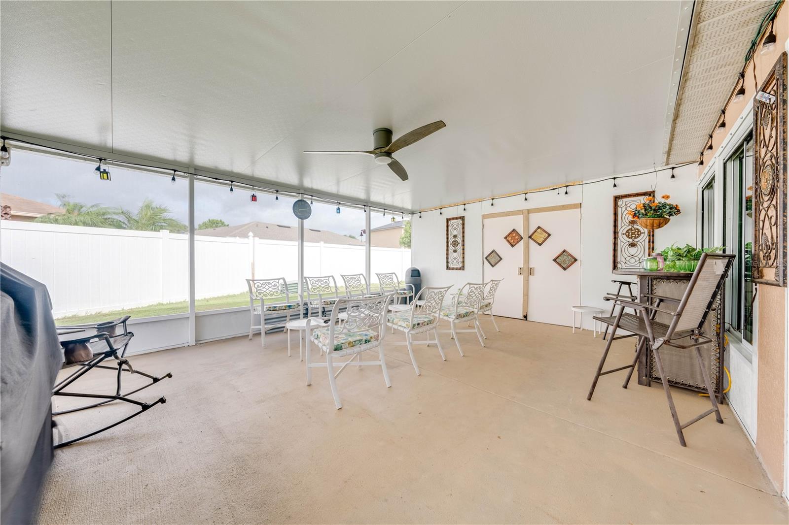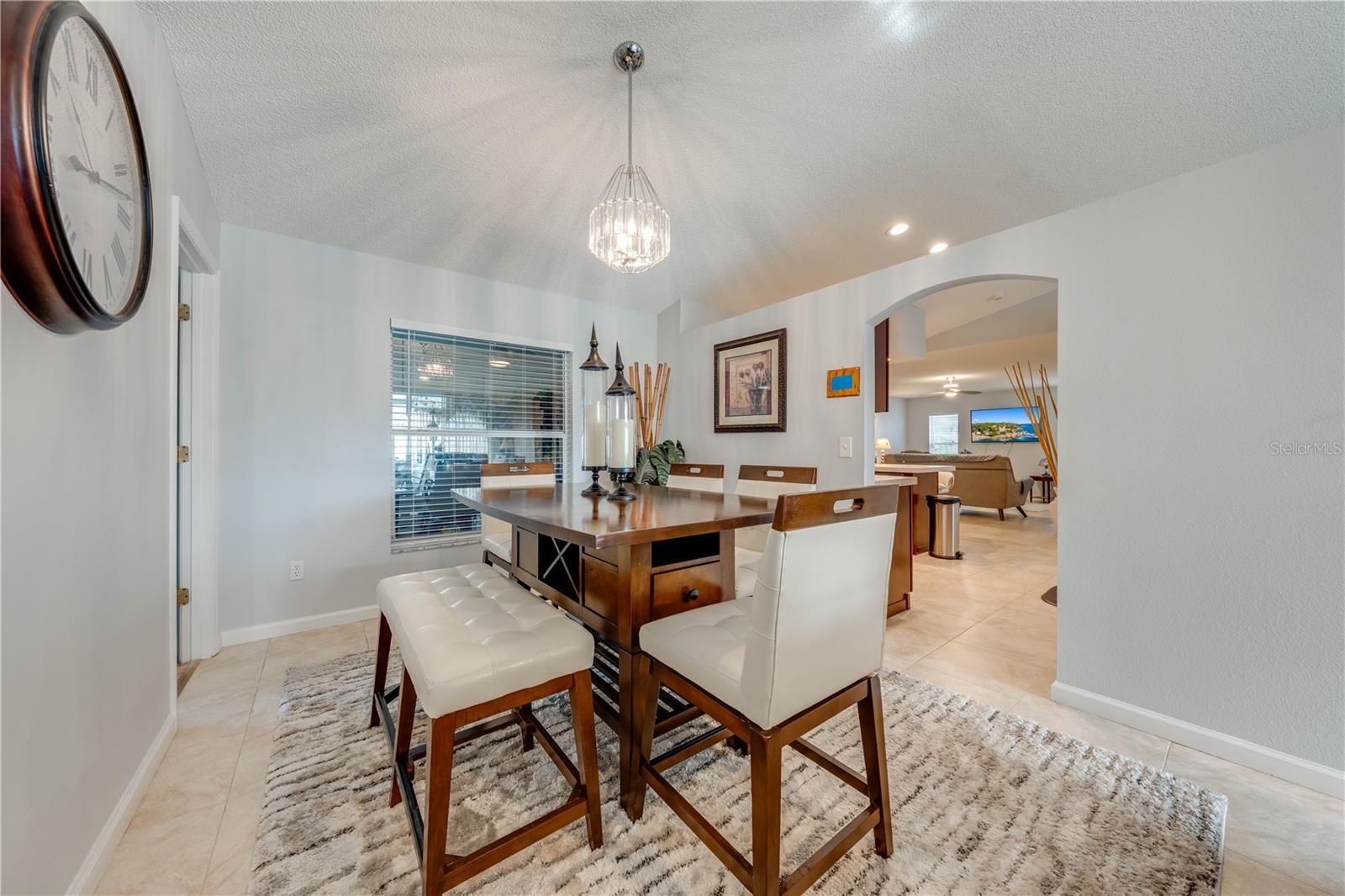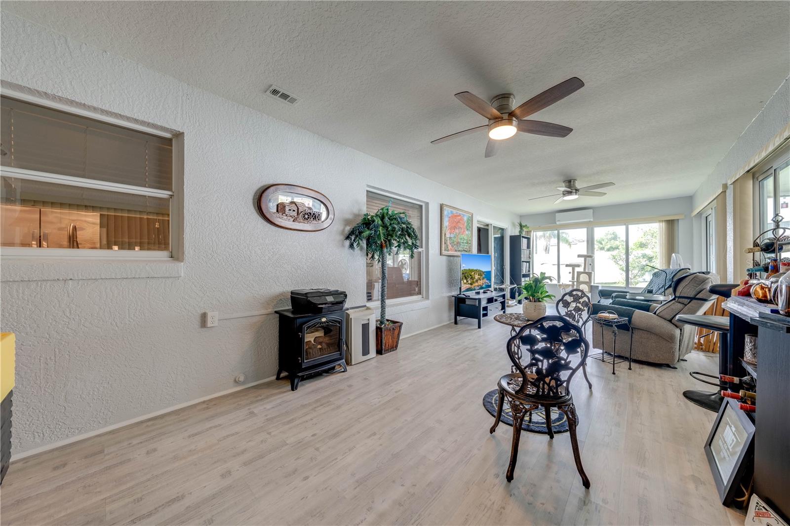 This beautifully updated home features a split floor plan with ceramic tile in the main living areas and new water-resistant laminate flooring in all bedrooms. The formal living room, dining room, family room, and updated kitchen with newer stainless steel appliances provide ample living space.Additional updates include a new tankless water heater installed in July 2024 and a roof replacement in 2017. Enjoy the large sunroom (30x12) and screened-in enclosure (30x16), perfect for outdoor relaxation. The backyard is fully fenced with white vinyl fencing for privacy, and the spacious paver driveway offers plenty of parking. The garage includes a new retractable garage door screen and an AC wall unit, which will stay with the home. Located in the Crescent Lakes subdivision, residents enjoy access to two playgrounds, tennis courts, a park, and a basketball court, with lighted walkways around the ponds. Close to schools, shopping, restaurants, and theme parks, this home offers convenience and community amenities.**Solar Panels are transferable**
