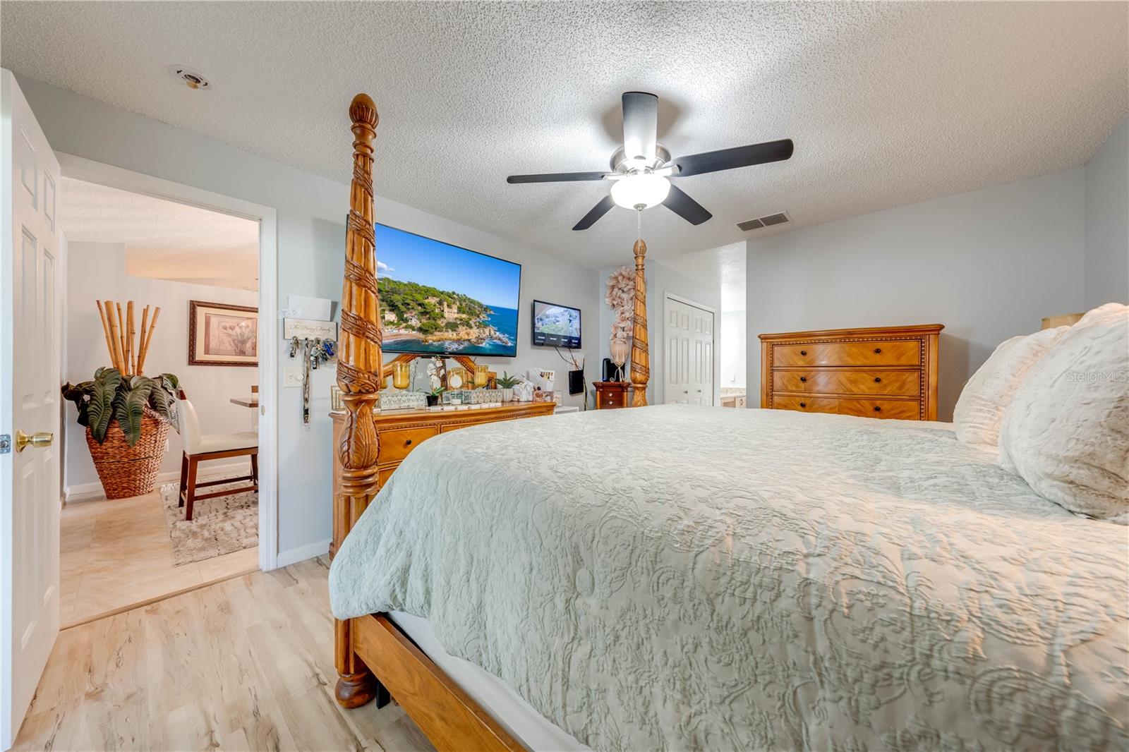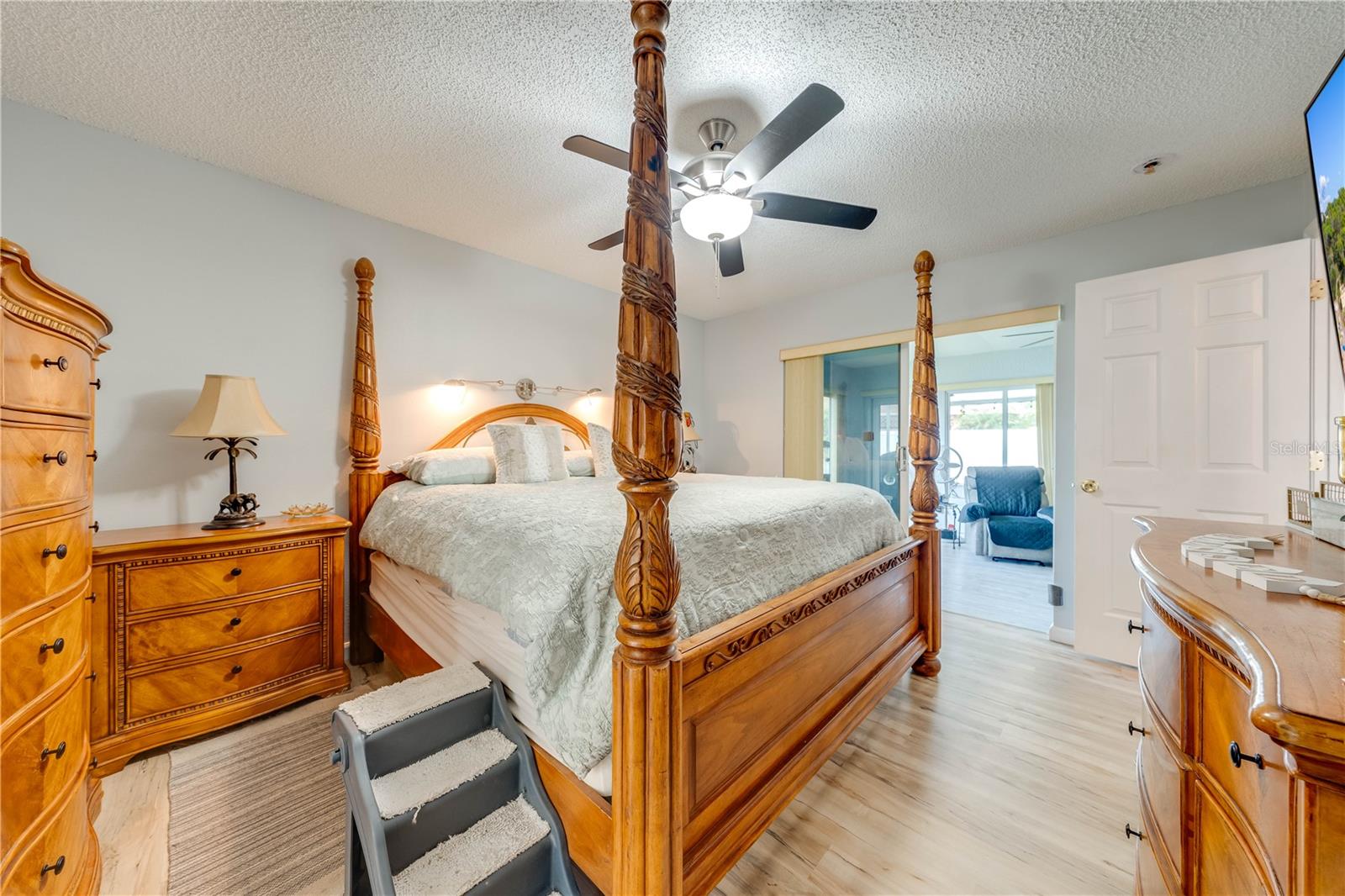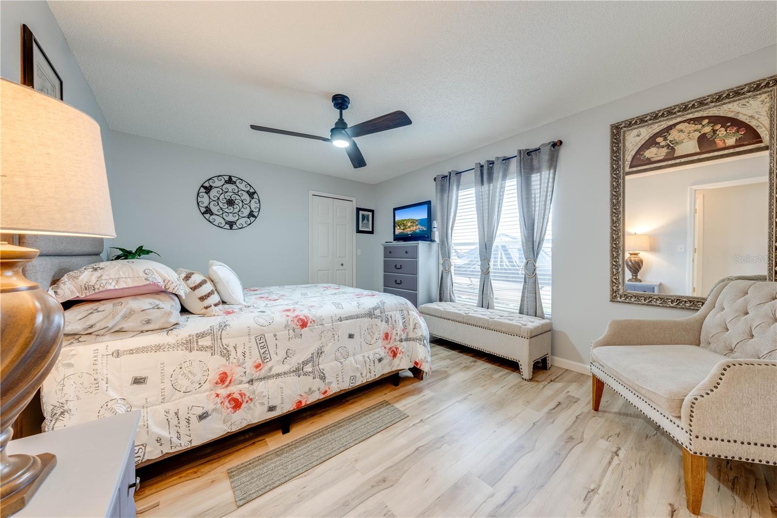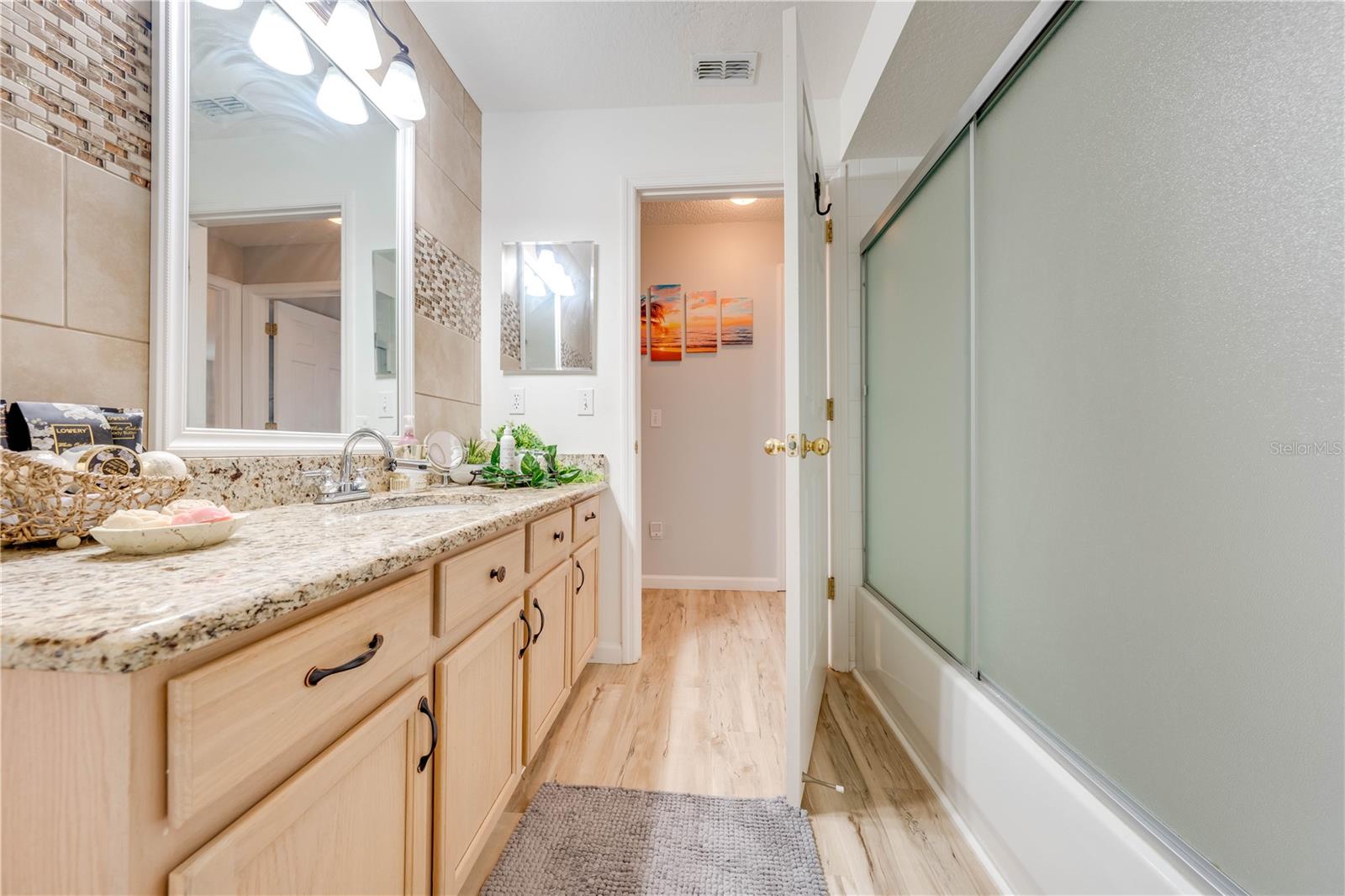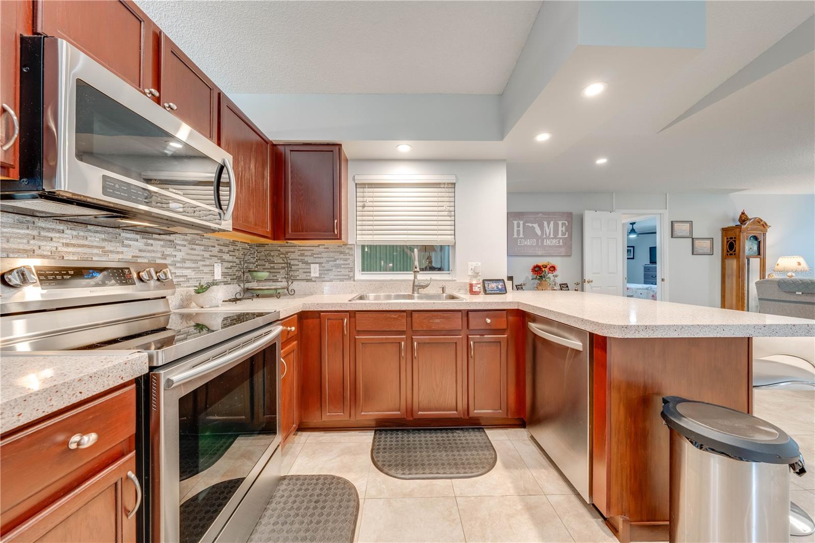 This beautifully updated home features a split floor plan with ceramic tile in the main living areas and new water-resistant laminate flooring in all bedrooms. The formal living room, dining room, family room, and updated kitchen with newer stainless steel appliances provide ample living space.Additional updates include a new tankless water heater installed in July 2024 and a roof replacement in 2017. Enjoy the large sunroom (30x12) and screened-in enclosure (30x16), perfect for outdoor relaxation. The backyard is fully fenced with white vinyl fencing for privacy, and the spacious paver driveway offers plenty of parking. The garage includes a new retractable garage door screen and an AC wall unit, which will stay with the home. Located in the Crescent Lakes subdivision, residents enjoy access to two playgrounds, tennis courts, a park, and a basketball court, with lighted walkways around the ponds. Close to schools, shopping, restaurants, and theme parks, this home offers convenience and community amenities.**Solar Panels are transferable**