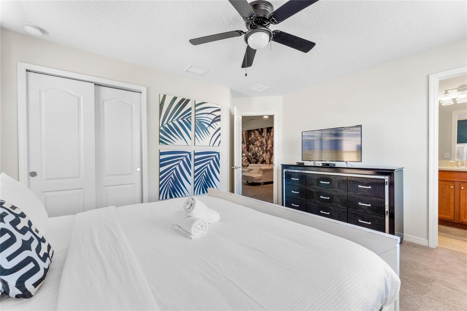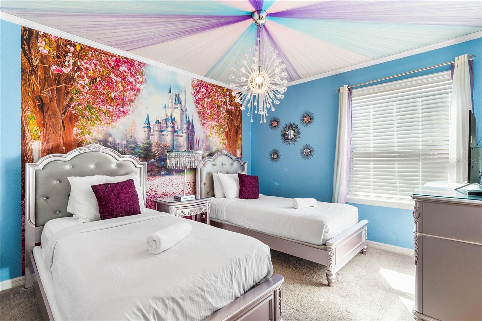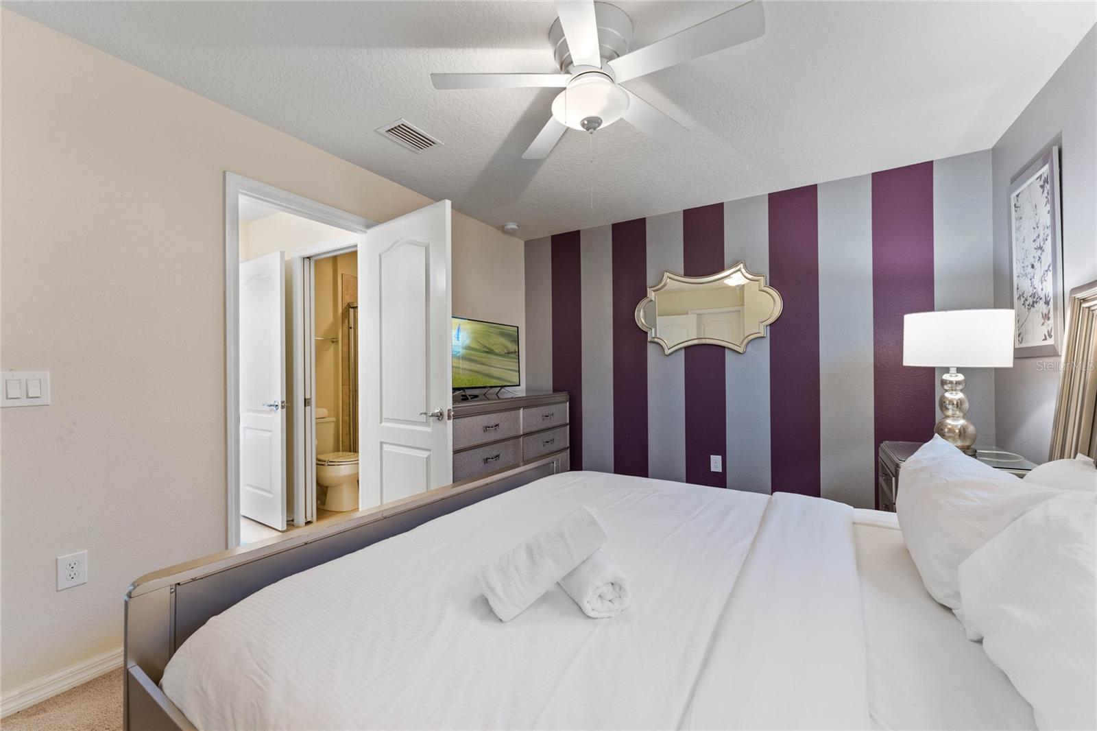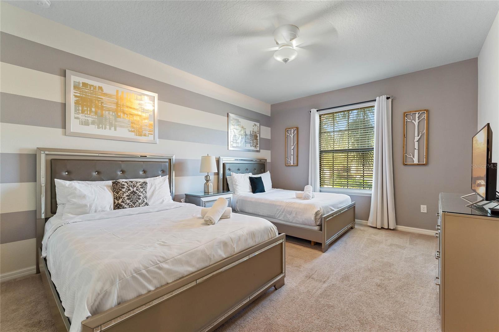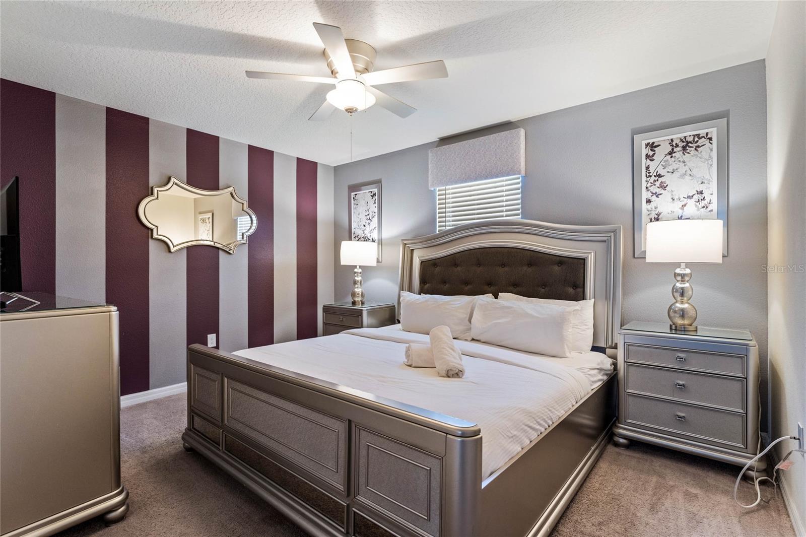 Welcome to this beautifully designed and fully furnished vacation retreat in the sought-after Windsor at Westside Resort! This bright and spacious home is perfect for entertaining or relaxing after a day exploring Central Florida. With themed bedrooms, multiple en suite rooms, and a large open-concept living space, there's plenty of room for everyone to spread out and enjoy.The kitchen features an oversized island that flows seamlessly into the dining and living areas—ideal for hosting family and friends. Step outside to your south-facing pool and spa, offering privacy and tranquility. Upstairs, you'll find a versatile loft with new wallpaper perfect for movie nights or game time. This home is not only stunning but also a smart investment, having generated over $70K in gross revenue in the last years. Future bookings are already in place for an easy start. Located just minutes from world-class golf, shopping, restaurants, and Orlando’s top attractions, Windsor Island Resort also offers unbeatable amenities. Enjoy the resort-style clubhouse, lazy river, splash pad, waterslides, tiki bar, sports courts, fitness center, and 24/7 guard-gated entry. HOA perks include cable, internet, valet trash service, and beautifully maintained landscaping.Whether you’re searching for a vacation home or an investment property, this is a rare opportunity to own in one of the area’s top communities. Paradise awaits!