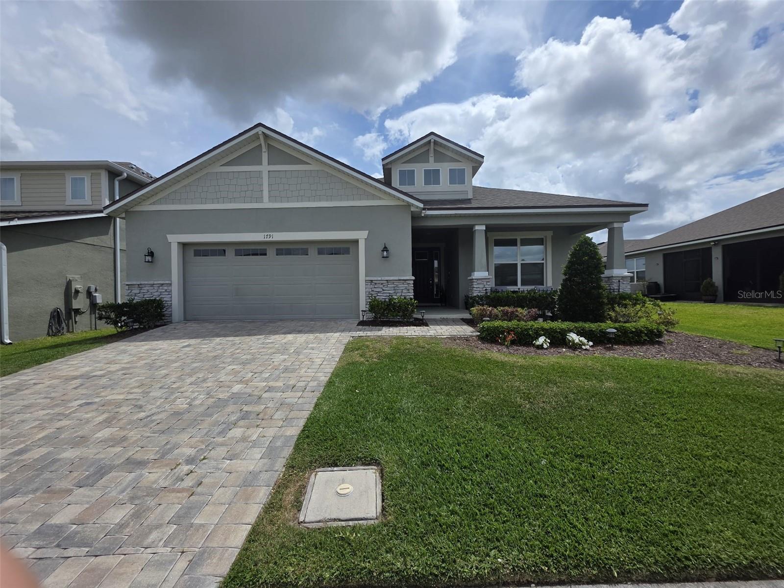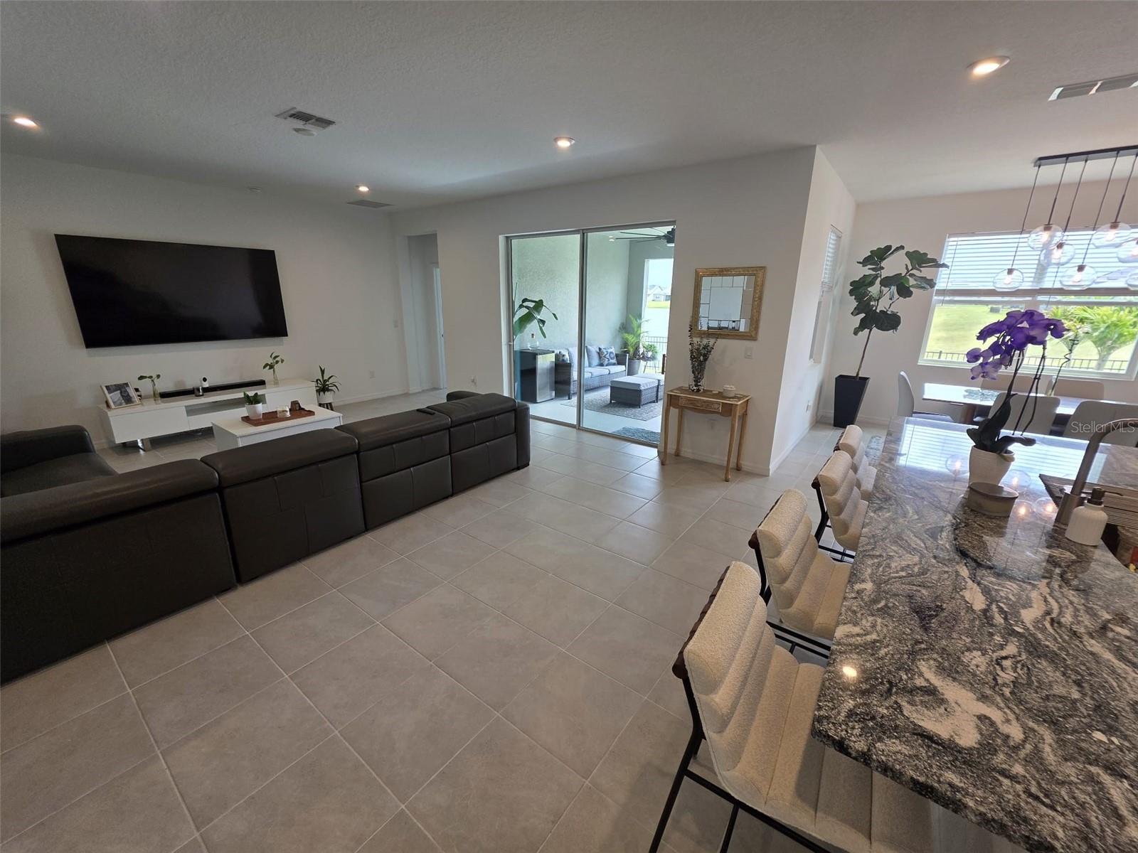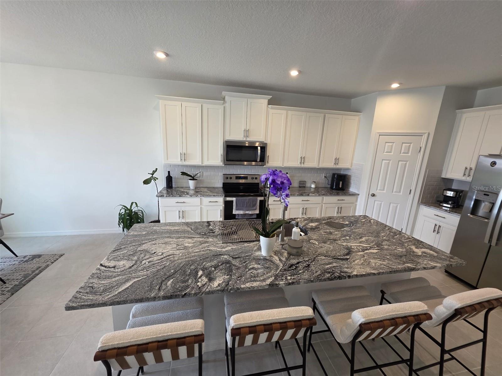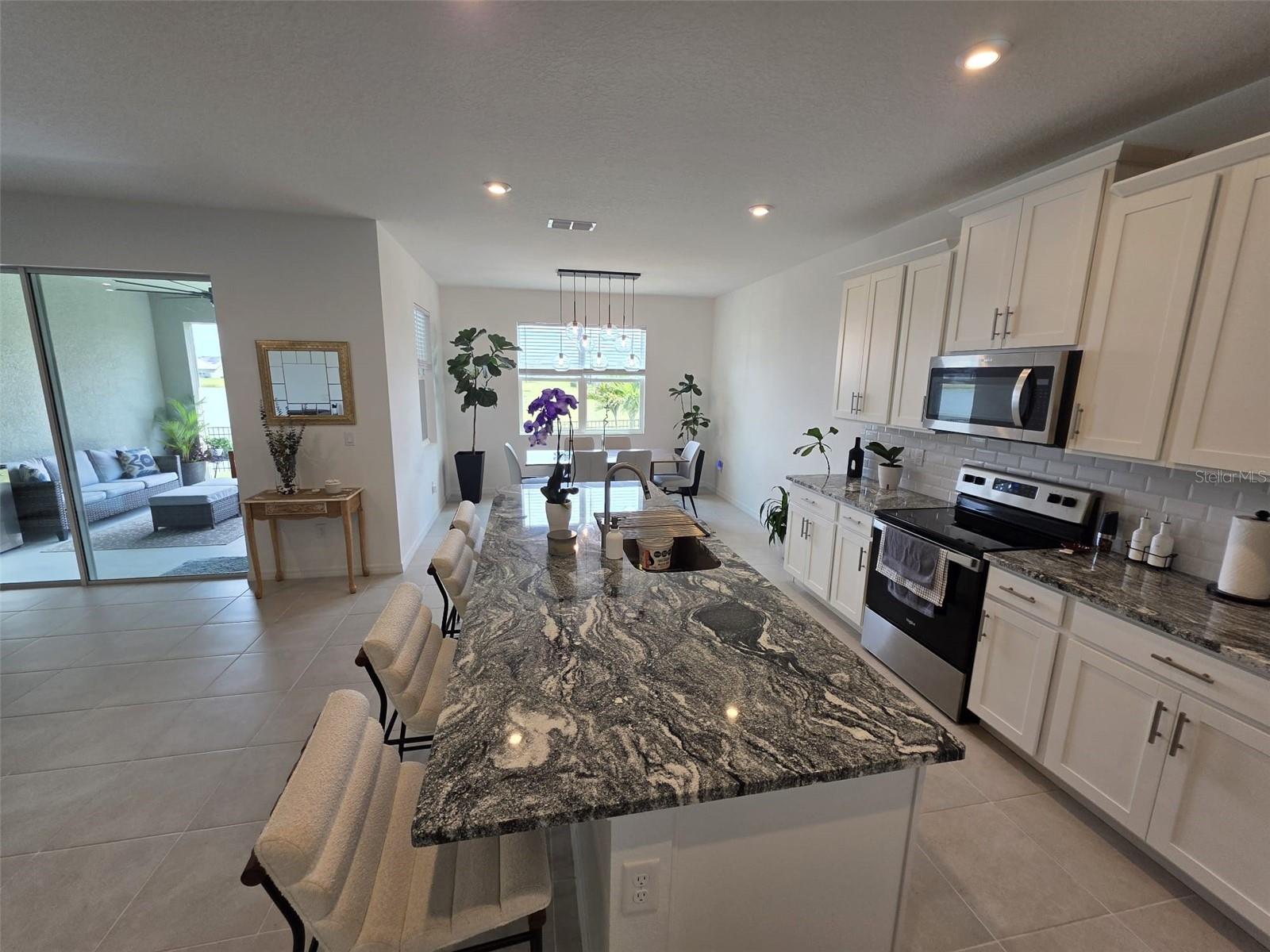 This single story home newly built in 2021 offers 2,500 square feet of living space with 4 beds and 3 baths. The open concept floor plan and high ceilings, a bright and spacious living area with brand new stainless steel appliances. The kitchen contains a large island, granite counter tops, and 42” cabinets. An expansive bonus room offers flexible living space. The master bedroom faces the water and features a master bathroom with a walk in closet, dual vanity and glass shower. This house is equipped with a smart lock and smart thermostat. There is a large screened in lanai with water views perfect for enjoying the Florida sunshine. This house belongs to the Tohoqua community with access to a resort-style pool, clubhouse, fitness center, walking trails, two tennis courts and a playground. A new high school and K-8 school is being planned within Tohoqua. Located less than 30 minutes from Disney and Universal and less than 10 minutes to the Florida Turnpike.