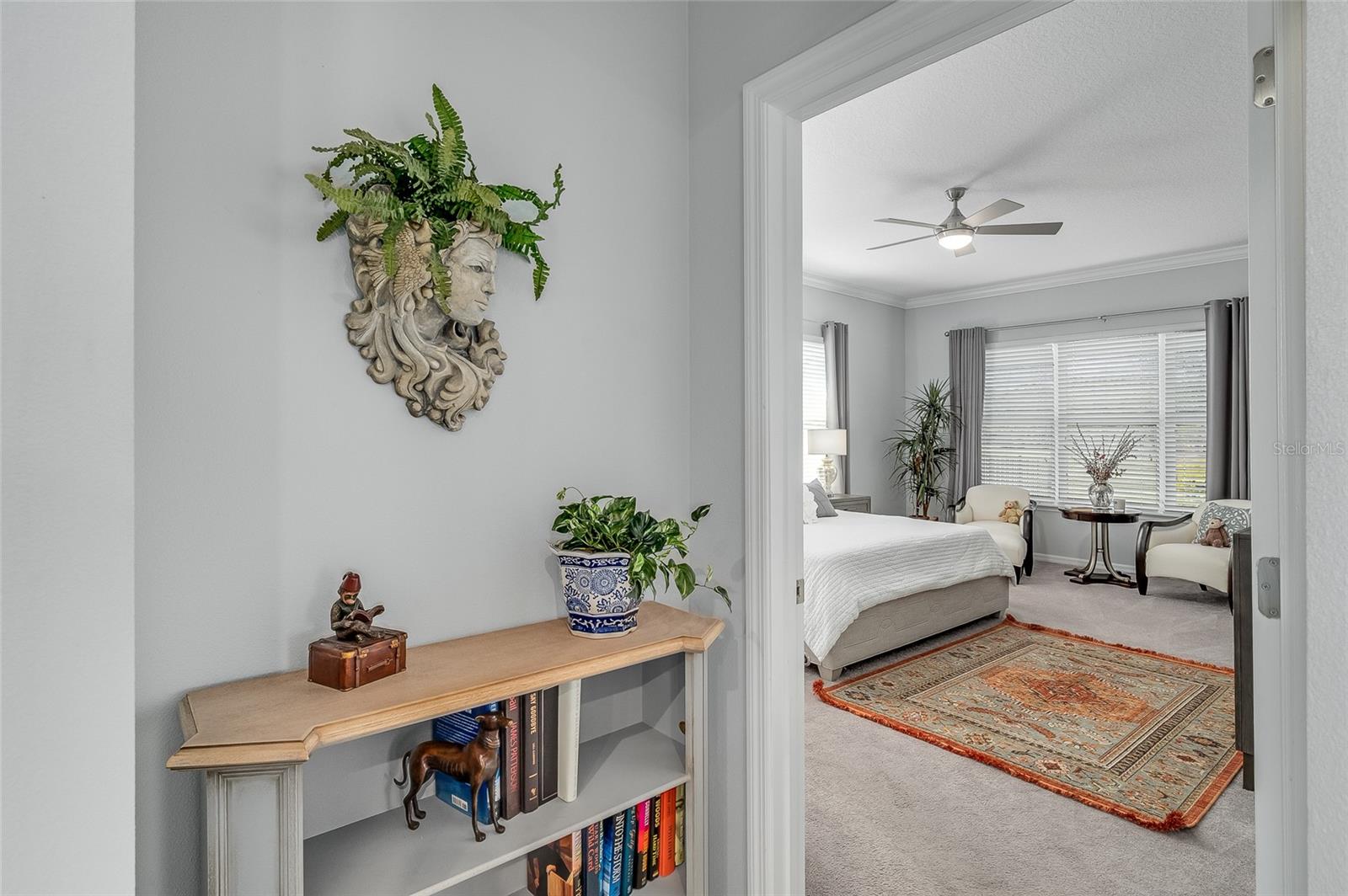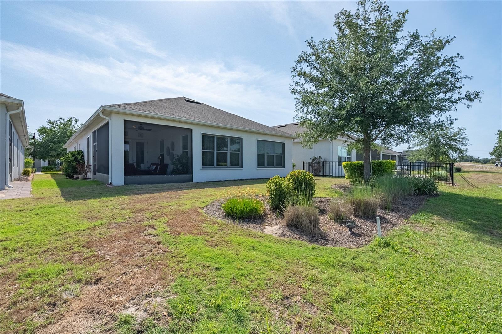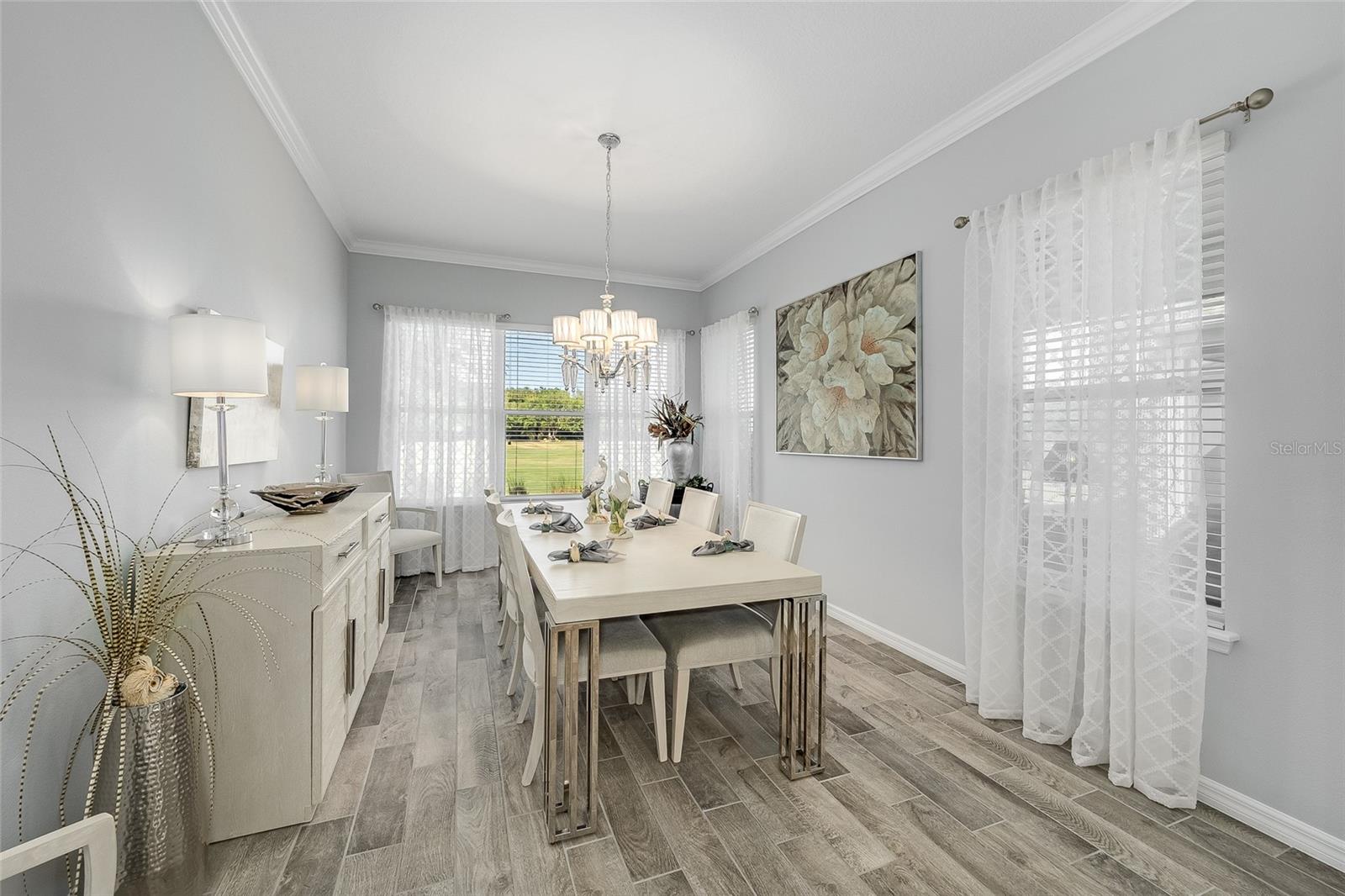 LARGE PRICE ADJUSTMENT! Come visit this Barbados model of the Four Season 55+ gated community located at the doorstep to Walt Disney World. Owner extended this model which enlarged the primary bedroom, dining room and lanai. This beautiful home overlooks the 1st hole of the Mystic Dunes 18 hole professional Golf Course. Upon entering, you will see the pride of ownership shine through! From the 10 foot high ceilings to the crown molding to the wood-look tile in living and wet areas and plush carpet in the bedrooms, you will be impressed! The kitchen has a gas stove, large corner pantry, granite countertops, large island that doubles as a breakfast bar. Owner chose to open the original 3rd bedroom to use as a den and office but will give a concession to convert back to a full bedroom. The guest bedroom has a full bath right outside its door. Interior laundry makes life easier. Double car garage with golf cart parking area and additional storage room. The luxurious 12,000 Sq ft clubhouse is the center for activities. Featuring a state-of-the-art fitness center, social hall, card room, billiards, arts and crafts room and more! A full time activities director is also on site. If you are not into golf, you can take a dance class or yoga or play pickleball, tennis , bocce ball, swim laps in the pool, water aerobics and more! Your dues also cover your lawn maintenance. Come today and take a look at your new home! Furniture is available separately.