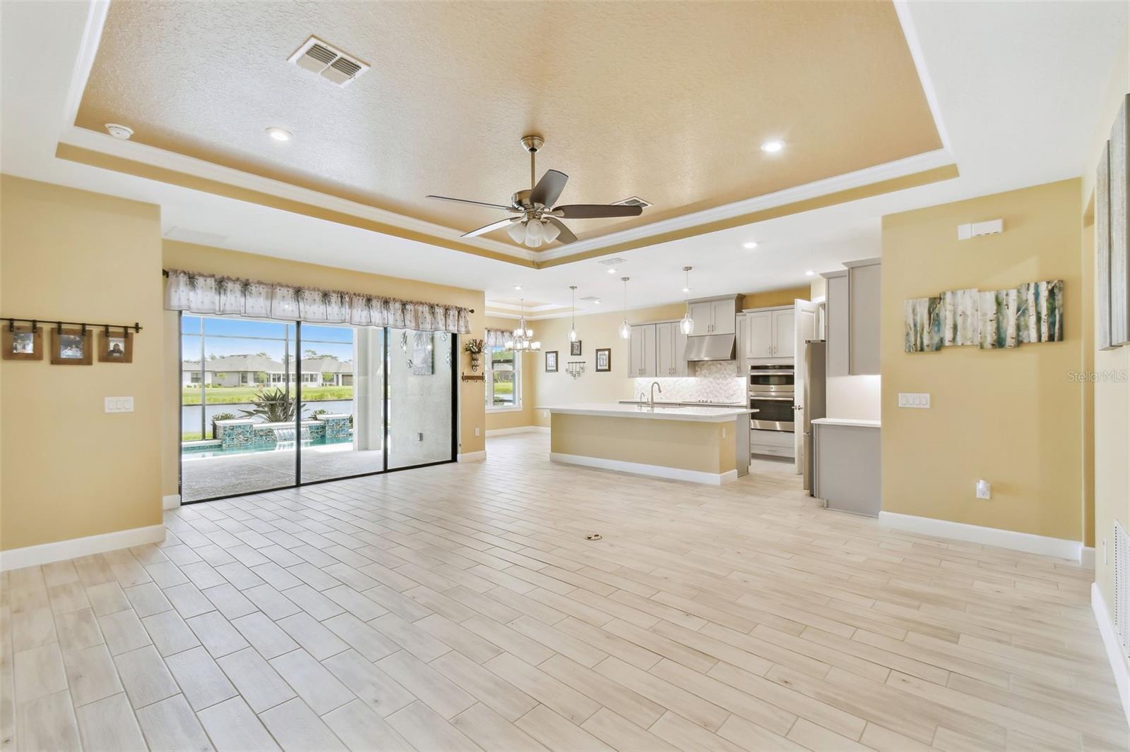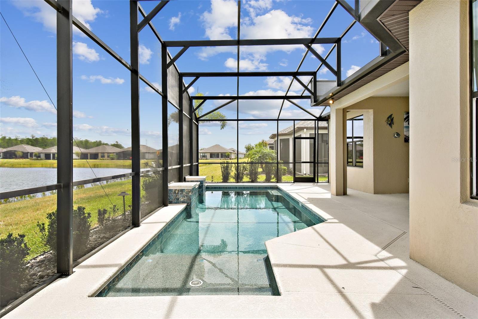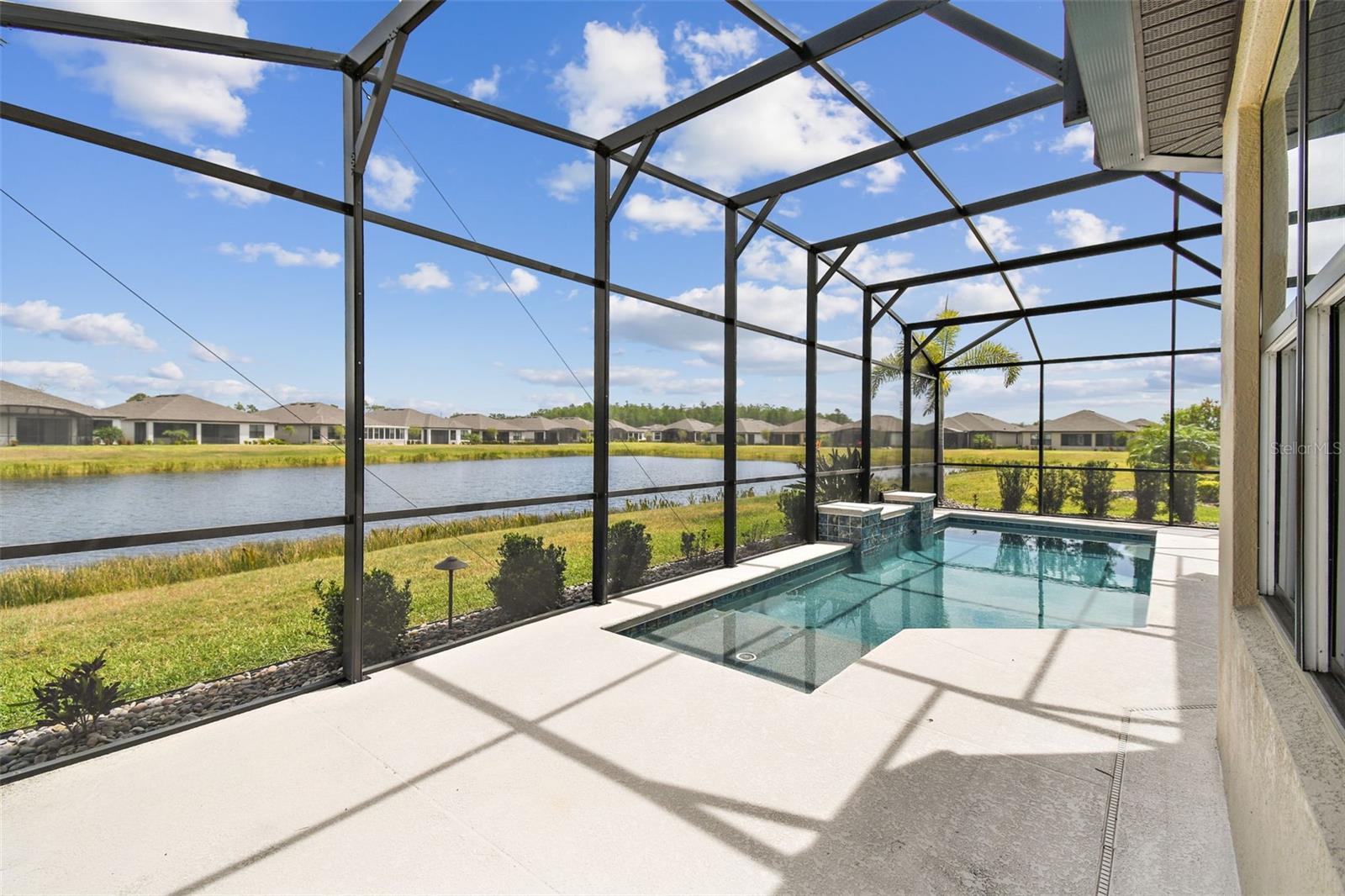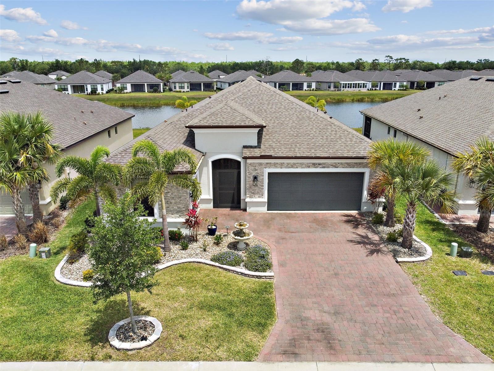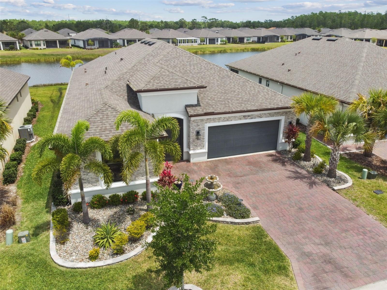 One or more photo(s) has been virtually staged. Huge Market Adjustment! Welcome to your dream home in the award-winning, resort-style 55+ gated community of Solivita! This 3-YEAR-NEW BASTA-model residence combines luxury, comfort, and functionality, offering a relaxed lifestyle with high-end upgrades and serene surroundings. With OVER $130,000 in UPGRADES, you are sure to love this beautifully maintained home. Those upgrades include tray ceilings in the entry way, living area, dining room, and primary bedroom, a private and peaceful SALT WATER heated POOL with a waterfall on a timer – to enjoy at your convenience and leisure – stunning LANDSCAPING, including a beautiful fountain, stonework added to the front of the house, giving it a polished feel, water filtration and softener system, custom kitchen pantry shelving, garage storage shelves, and so much more!! This home has 3 bedrooms, 3 FULL BATHS, and a BONUS ROOM with French doors that can be used as a Den/Study/Office/Hobby Room, or even an additional guest space. You will find a GOURMET KITCHEN with double ovens, perfect for the chef-enthusiast, a large sized island with room for seating, all as a central point to your living and dining area, which make this OPEN-CONCEPT an entertainer’s dream! Enjoy BREATHTAKING WATER VIEWS from all of the main living areas and the primary bedroom, offering a peaceful backdrop to your everyday living. This home features NO CARPET, providing a clean, modern look throughout, and includes a DEDICATED GOLF CART GARAGE. Located less than half a mile from Solivita’s Village Center, you’ll have easy access to year-round activities, dining, entertainment, and festive holiday events—all just a short walk or golf cart ride away. Solivita is a vibrant and gated 55+ community offering a resort-style lifestyle in a beautifully landscaped setting. Residents enjoy access to two championship golf courses, 1 indoor and 13 outdoor swimming pools, two state-of-the-art fitness centers with ongoing wellness and exercise classes, and multiple clubhouses. The community also features tennis, pickleball, and bocce ball courts, a spa, on-site dining options, and numerous multipurpose spaces for arts, crafts, games, and social gatherings. The Village Center serves as the social hub, featuring on-site dining, a spa, and frequent events, including concerts, festivals, and seasonal celebrations. With over 200 clubs and interest groups, along with a golf cart-friendly layout, Solivita provides the perfect balance of relaxation, recreation, and connection for today’s active adult.