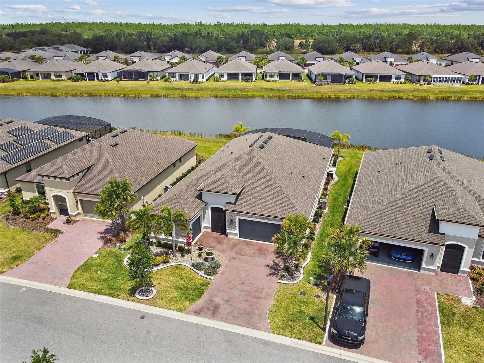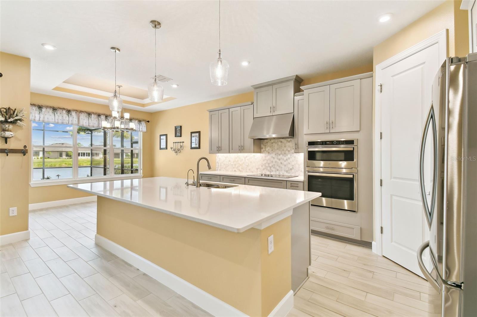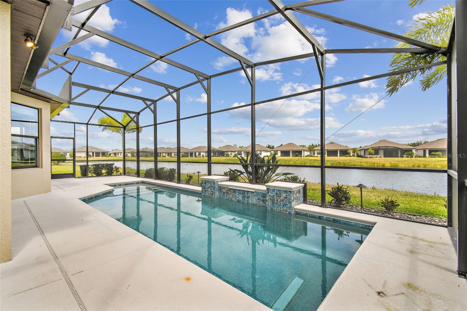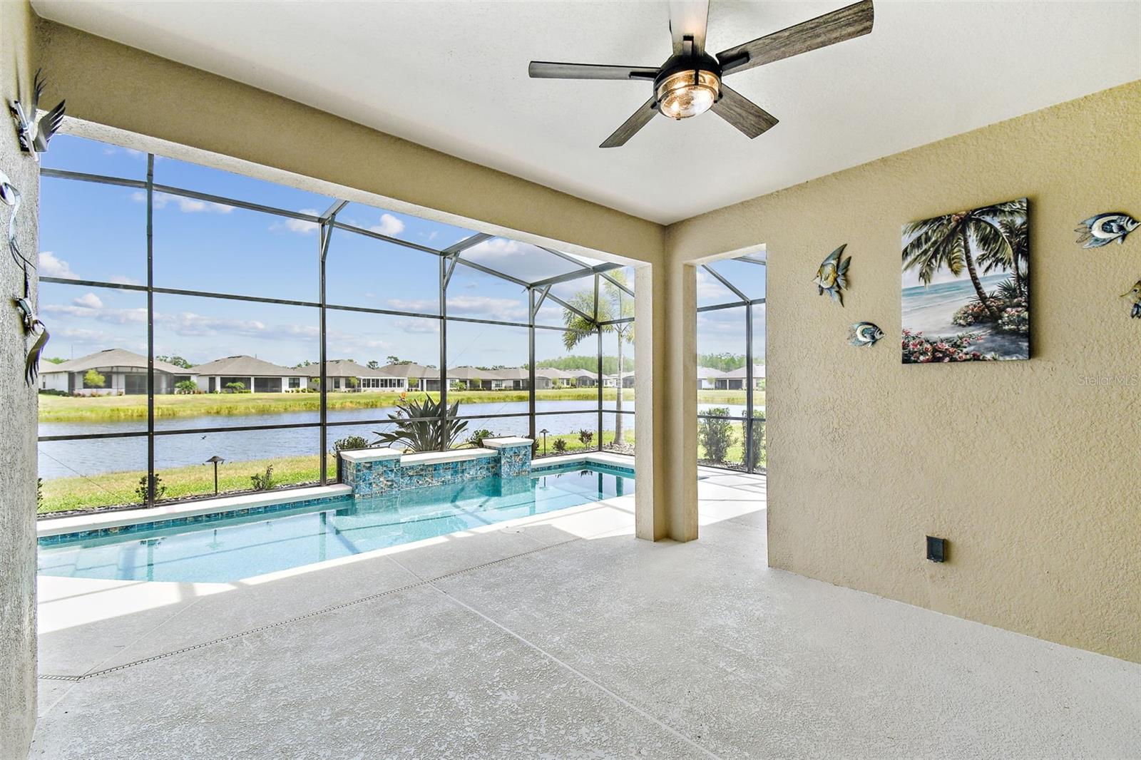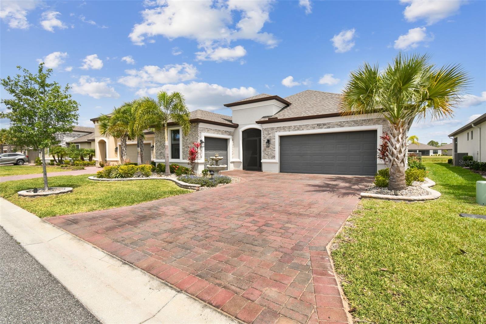 One or more photo(s) has been virtually staged. Huge Market Adjustment! Welcome to your dream home in the award-winning, resort-style 55+ gated community of Solivita! This 3-YEAR-NEW BASTA-model residence combines luxury, comfort, and functionality, offering a relaxed lifestyle with high-end upgrades and serene surroundings. With OVER $130,000 in UPGRADES, you are sure to love this beautifully maintained home. Those upgrades include tray ceilings in the entry way, living area, dining room, and primary bedroom, a private and peaceful SALT WATER heated POOL with a waterfall on a timer – to enjoy at your convenience and leisure – stunning LANDSCAPING, including a beautiful fountain, stonework added to the front of the house, giving it a polished feel, water filtration and softener system, custom kitchen pantry shelving, garage storage shelves, and so much more!! This home has 3 bedrooms, 3 FULL BATHS, and a BONUS ROOM with French doors that can be used as a Den/Study/Office/Hobby Room, or even an additional guest space. You will find a GOURMET KITCHEN with double ovens, perfect for the chef-enthusiast, a large sized island with room for seating, all as a central point to your living and dining area, which make this OPEN-CONCEPT an entertainer’s dream! Enjoy BREATHTAKING WATER VIEWS from all of the main living areas and the primary bedroom, offering a peaceful backdrop to your everyday living. This home features NO CARPET, providing a clean, modern look throughout, and includes a DEDICATED GOLF CART GARAGE. Located less than half a mile from Solivita’s Village Center, you’ll have easy access to year-round activities, dining, entertainment, and festive holiday events—all just a short walk or golf cart ride away. Solivita is a vibrant and gated 55+ community offering a resort-style lifestyle in a beautifully landscaped setting. Residents enjoy access to two championship golf courses, 1 indoor and 13 outdoor swimming pools, two state-of-the-art fitness centers with ongoing wellness and exercise classes, and multiple clubhouses. The community also features tennis, pickleball, and bocce ball courts, a spa, on-site dining options, and numerous multipurpose spaces for arts, crafts, games, and social gatherings. The Village Center serves as the social hub, featuring on-site dining, a spa, and frequent events, including concerts, festivals, and seasonal celebrations. With over 200 clubs and interest groups, along with a golf cart-friendly layout, Solivita provides the perfect balance of relaxation, recreation, and connection for today’s active adult.