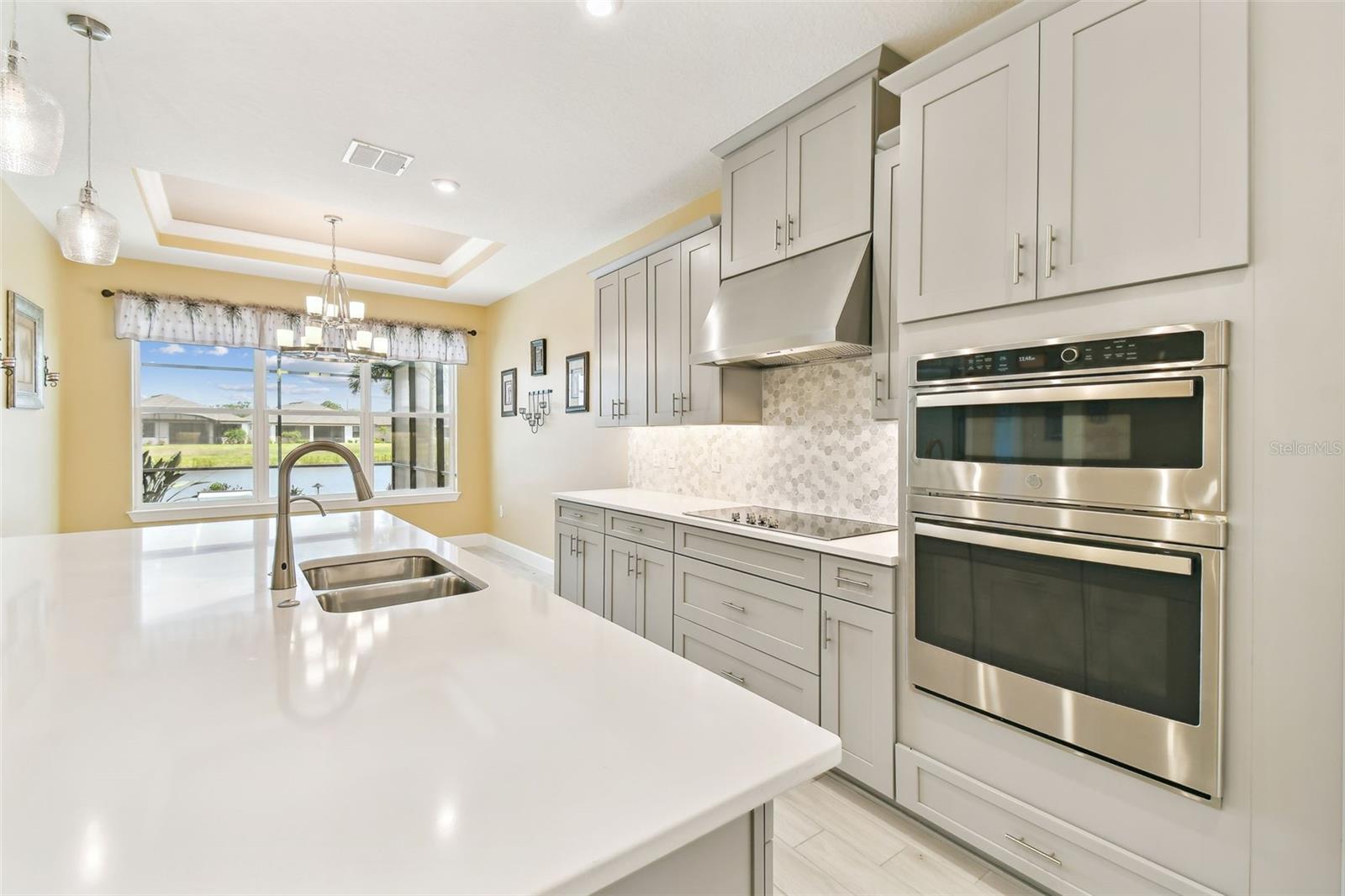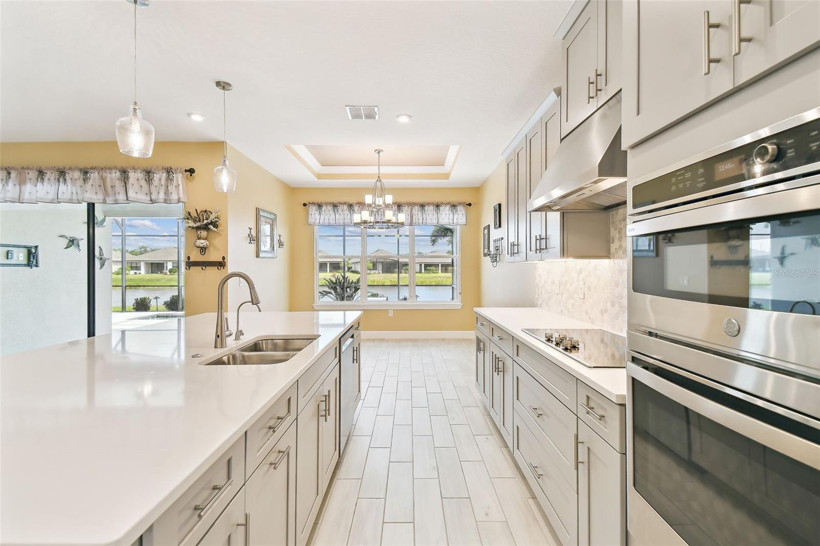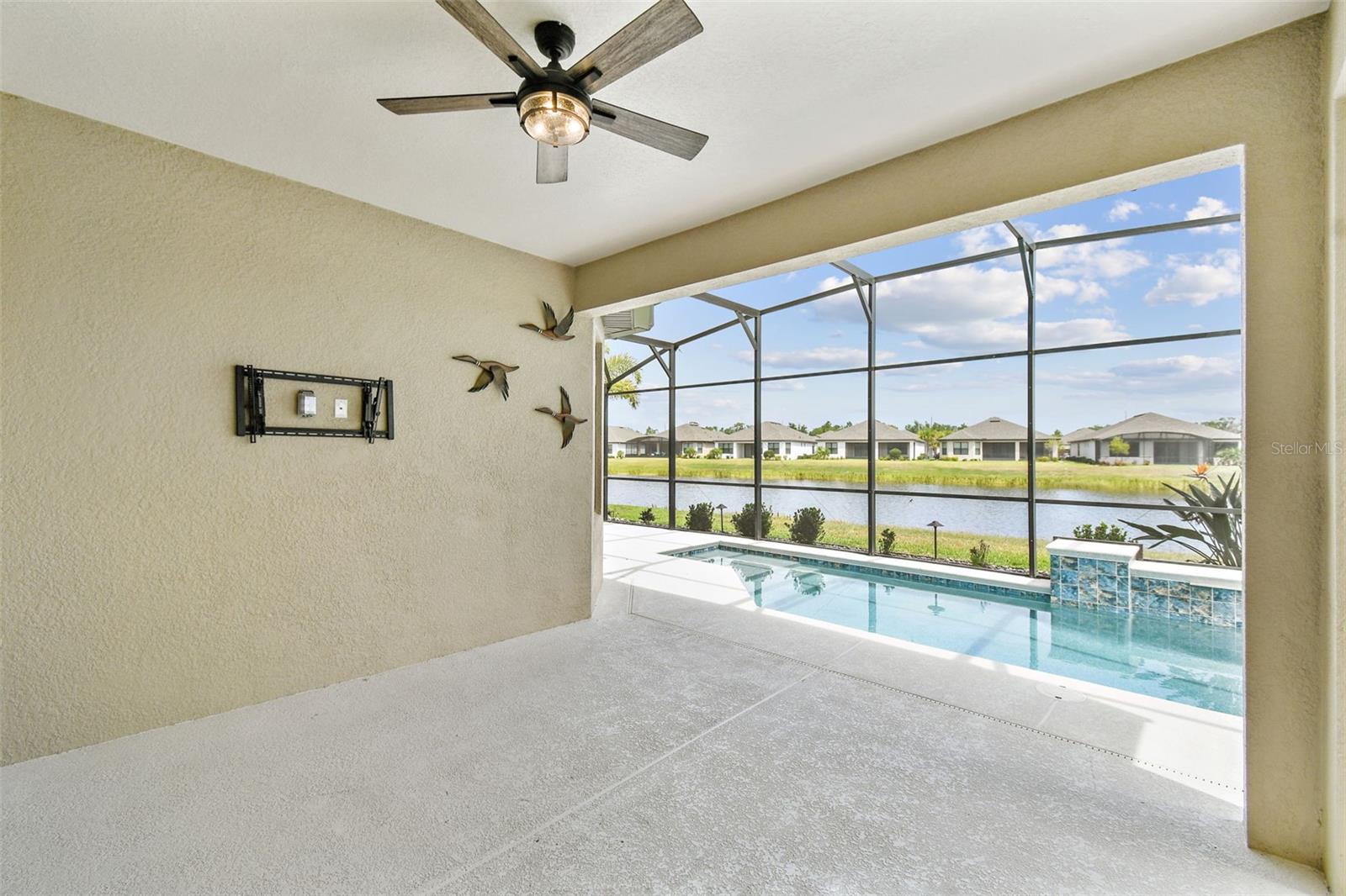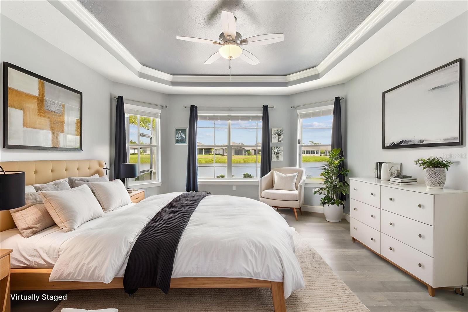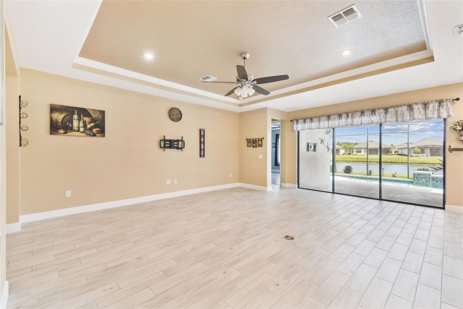 One or more photo(s) has been virtually staged. Huge Market Adjustment! Welcome to your dream home in the award-winning, resort-style 55+ gated community of Solivita! This 3-YEAR-NEW BASTA-model residence combines luxury, comfort, and functionality, offering a relaxed lifestyle with high-end upgrades and serene surroundings. With OVER $130,000 in UPGRADES, you are sure to love this beautifully maintained home. Those upgrades include tray ceilings in the entry way, living area, dining room, and primary bedroom, a private and peaceful SALT WATER heated POOL with a waterfall on a timer – to enjoy at your convenience and leisure – stunning LANDSCAPING, including a beautiful fountain, stonework added to the front of the house, giving it a polished feel, water filtration and softener system, custom kitchen pantry shelving, garage storage shelves, and so much more!! This home has 3 bedrooms, 3 FULL BATHS, and a BONUS ROOM with French doors that can be used as a Den/Study/Office/Hobby Room, or even an additional guest space. You will find a GOURMET KITCHEN with double ovens, perfect for the chef-enthusiast, a large sized island with room for seating, all as a central point to your living and dining area, which make this OPEN-CONCEPT an entertainer’s dream! Enjoy BREATHTAKING WATER VIEWS from all of the main living areas and the primary bedroom, offering a peaceful backdrop to your everyday living. This home features NO CARPET, providing a clean, modern look throughout, and includes a DEDICATED GOLF CART GARAGE. Located less than half a mile from Solivita’s Village Center, you’ll have easy access to year-round activities, dining, entertainment, and festive holiday events—all just a short walk or golf cart ride away. Solivita is a vibrant and gated 55+ community offering a resort-style lifestyle in a beautifully landscaped setting. Residents enjoy access to two championship golf courses, 1 indoor and 13 outdoor swimming pools, two state-of-the-art fitness centers with ongoing wellness and exercise classes, and multiple clubhouses. The community also features tennis, pickleball, and bocce ball courts, a spa, on-site dining options, and numerous multipurpose spaces for arts, crafts, games, and social gatherings. The Village Center serves as the social hub, featuring on-site dining, a spa, and frequent events, including concerts, festivals, and seasonal celebrations. With over 200 clubs and interest groups, along with a golf cart-friendly layout, Solivita provides the perfect balance of relaxation, recreation, and connection for today’s active adult.