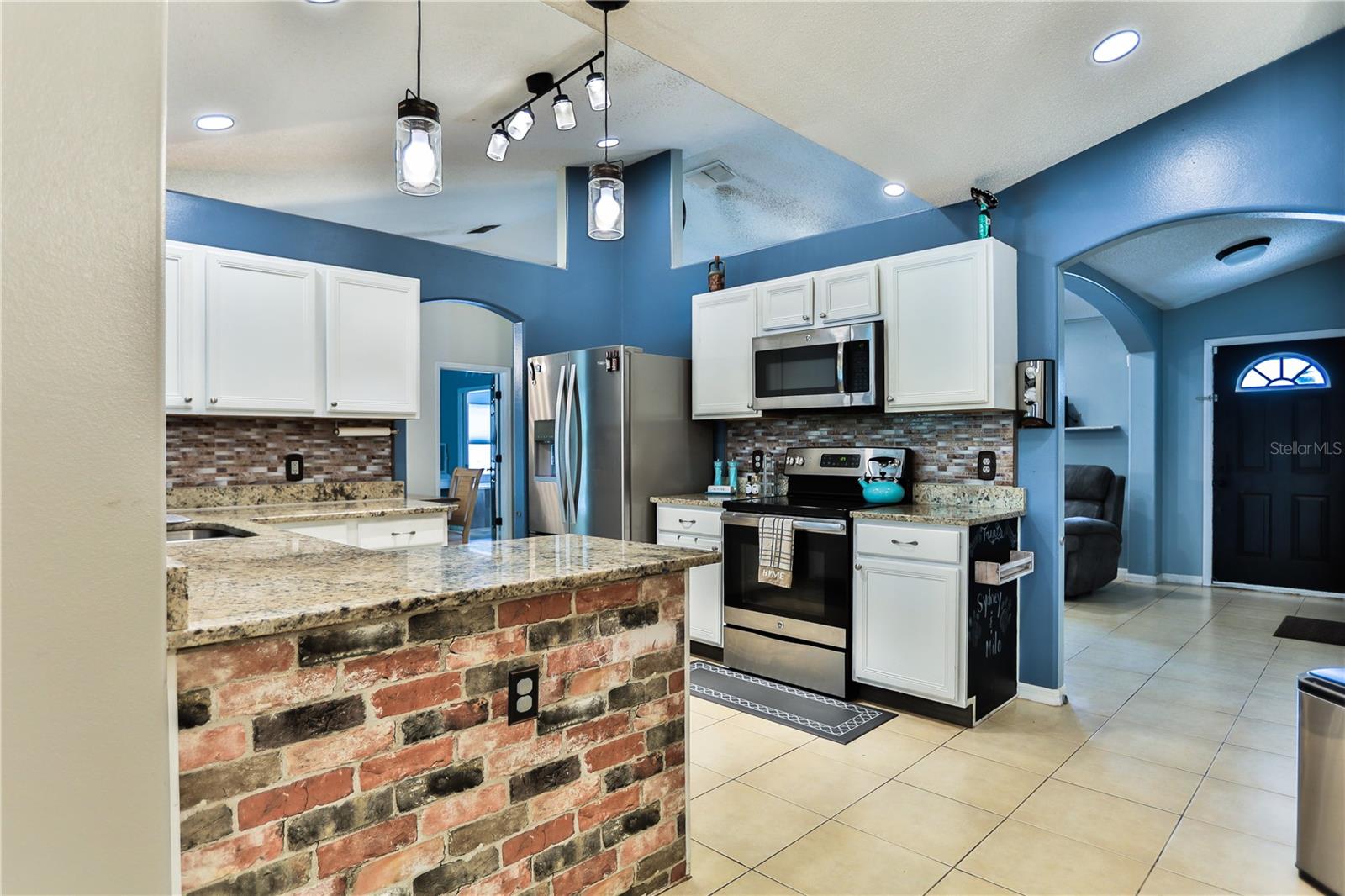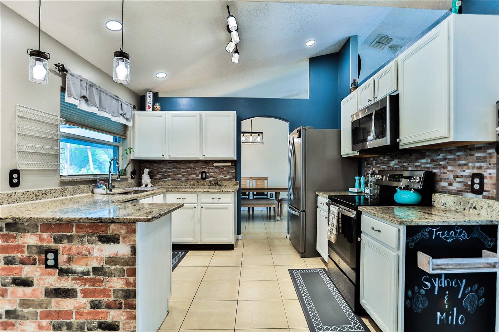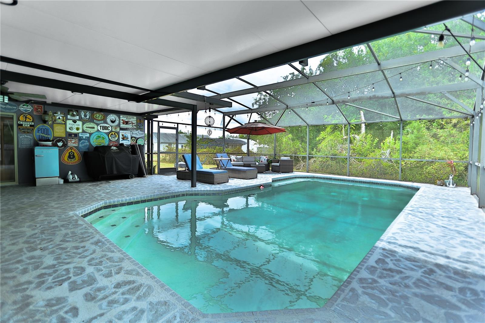 Buyer financing could not be obtained. Now is the opportunity to come see and own this spectacular 3-bedroom, 2-bath house with private, screened pool and patio. Upon arriving you'll pull into a long driveway leading to the two-car garage and the front lawn adorned with 2 beautiful palm trees. Welcome to Florida living!!! You'll find this house has plenty of outdoor space and backs up to a conservation area providing wonderful privacy. Upon entering this house you'll be invited to rest and relax in the living room which features a distressed wood-paneled accent wall. Straight ahead you'll find yourself walking through the walkway leading to the kitchen and dinette, the bonus/flex room featuring a barn door entry with a granite counter wet bar and built-in cabinets. To your left will be the first and second bedrooms. Off to the right of the living room is the dining room and the owner's suite. As you walk through, you'll feel the spaciousness of the home accented by the high ceilings. The owner's suite feelings grand with the array of windows in front of you and the high ceilings. The en-suite owner's bathroom was renovated with porcelain tile, a rainfall walk-in shower, separate jacuzzi jet bathtub, and luxurious double vanity. Both the owner's bathroom and second bathroom feature SMART Bluetooth-controlled streaming exhaust fans. The kitchen features stainless steel appliances and granite countertops. All the bedrooms, dining room, kitchen, and owner's bath feature custom-sized cellular blinds for the windows. Bedroom 2 has a custom-built closet organization system. Leading out to the patio and pool is a sliding glass patio door with built-in blinds (installed in 2022). The screened pool enclosure was rescreened on the top in November 2024. The private pool was resurfaced and retiled. The pool deck features fully hand-stenciled painted work. The partial covered patio roof with ceiling fan and lighting was added in 2021. The house also features beautiful polychromatic architectural shingles. The roof was installed in 2019. You'll find a second stainless steel refrigerator housed in the garage that will convey to the new owner with the purchase of the house. This home is move-in ready and waiting. Come see for yourself.