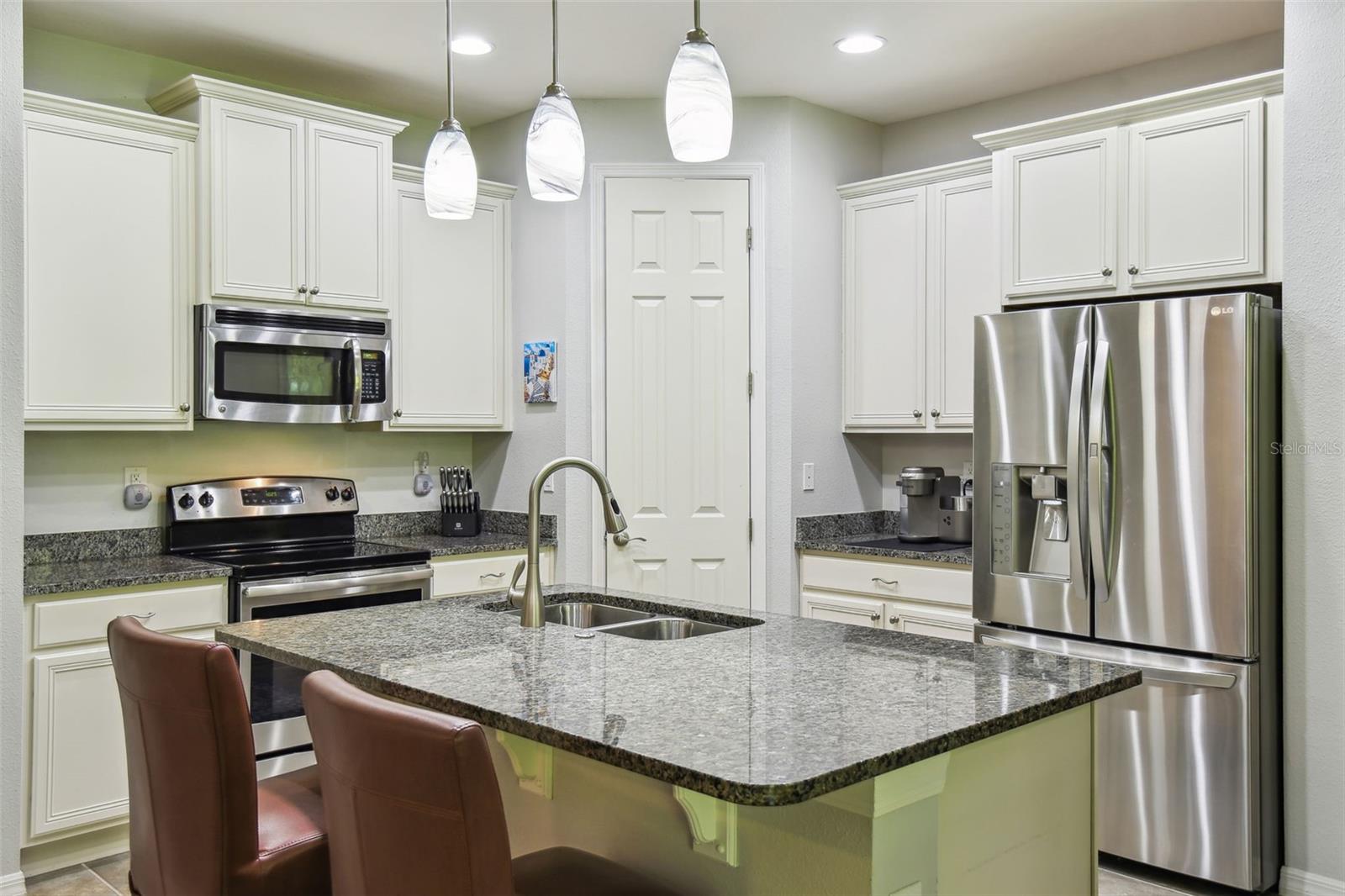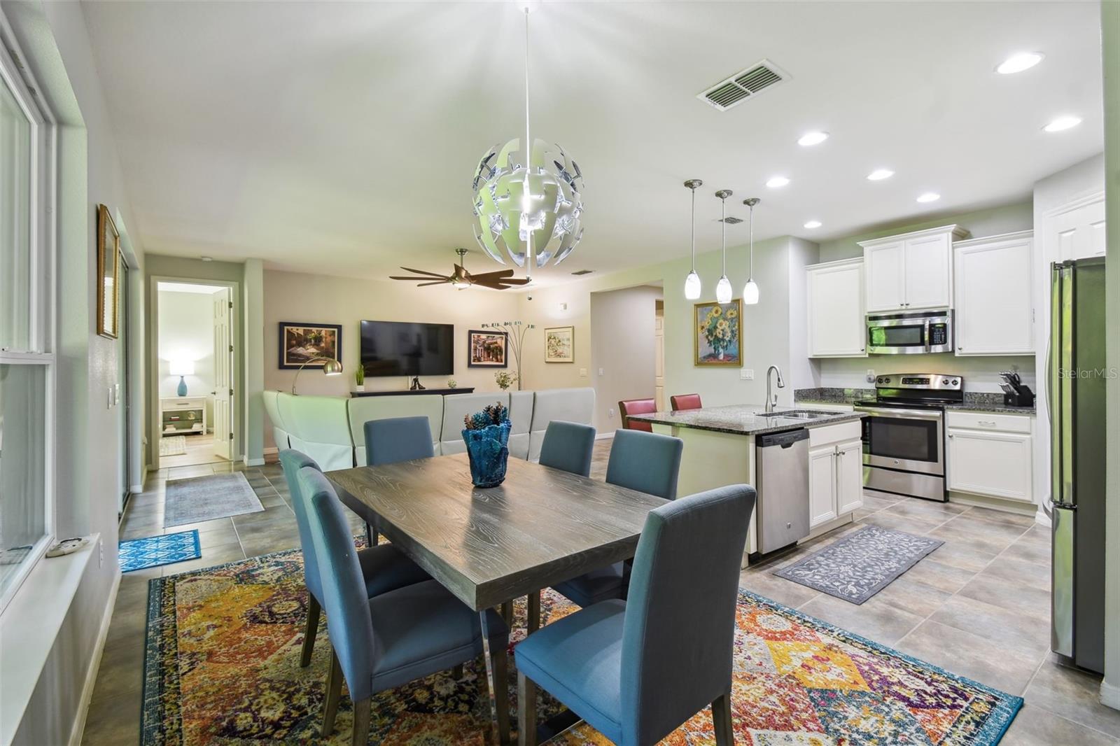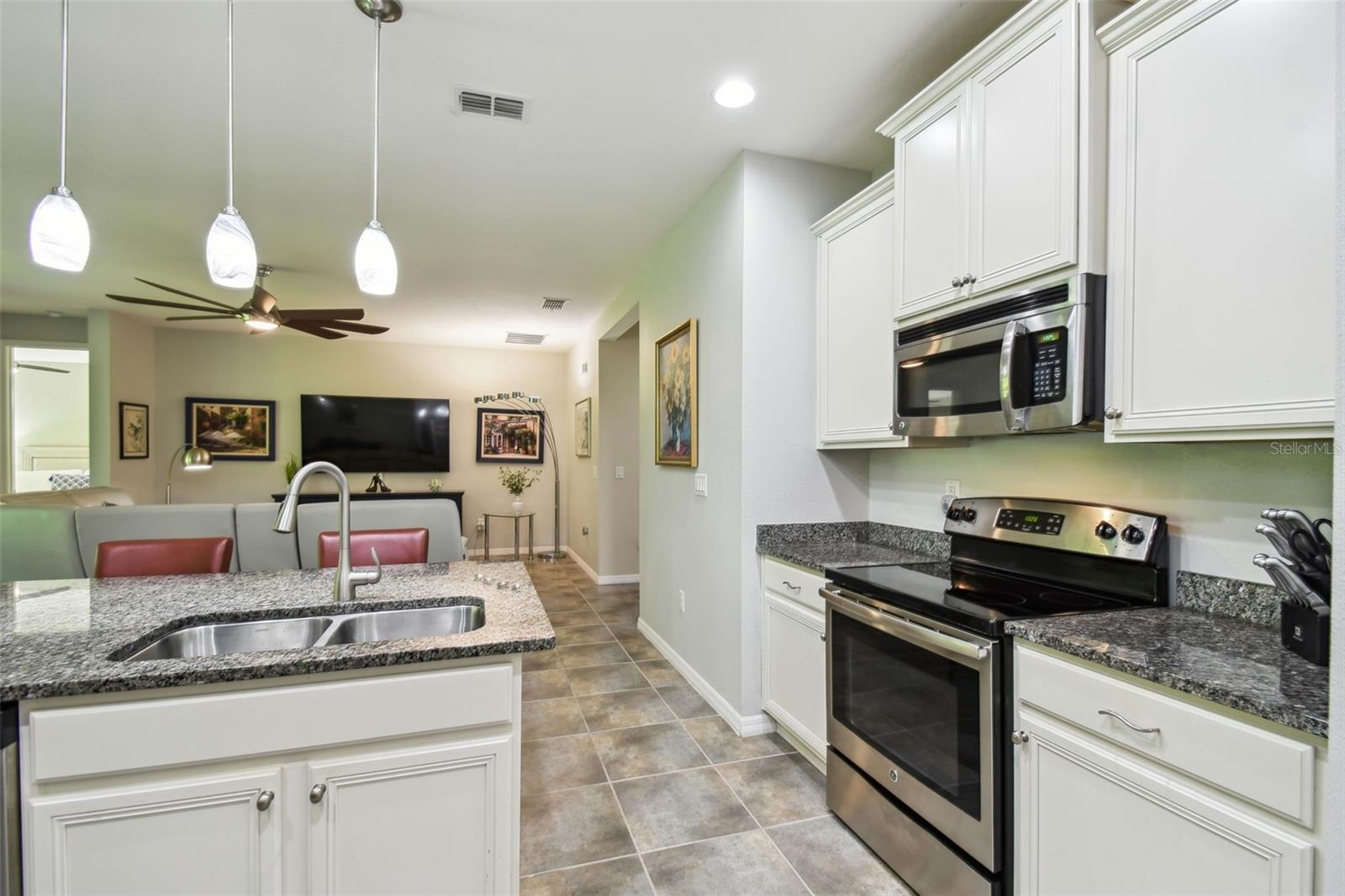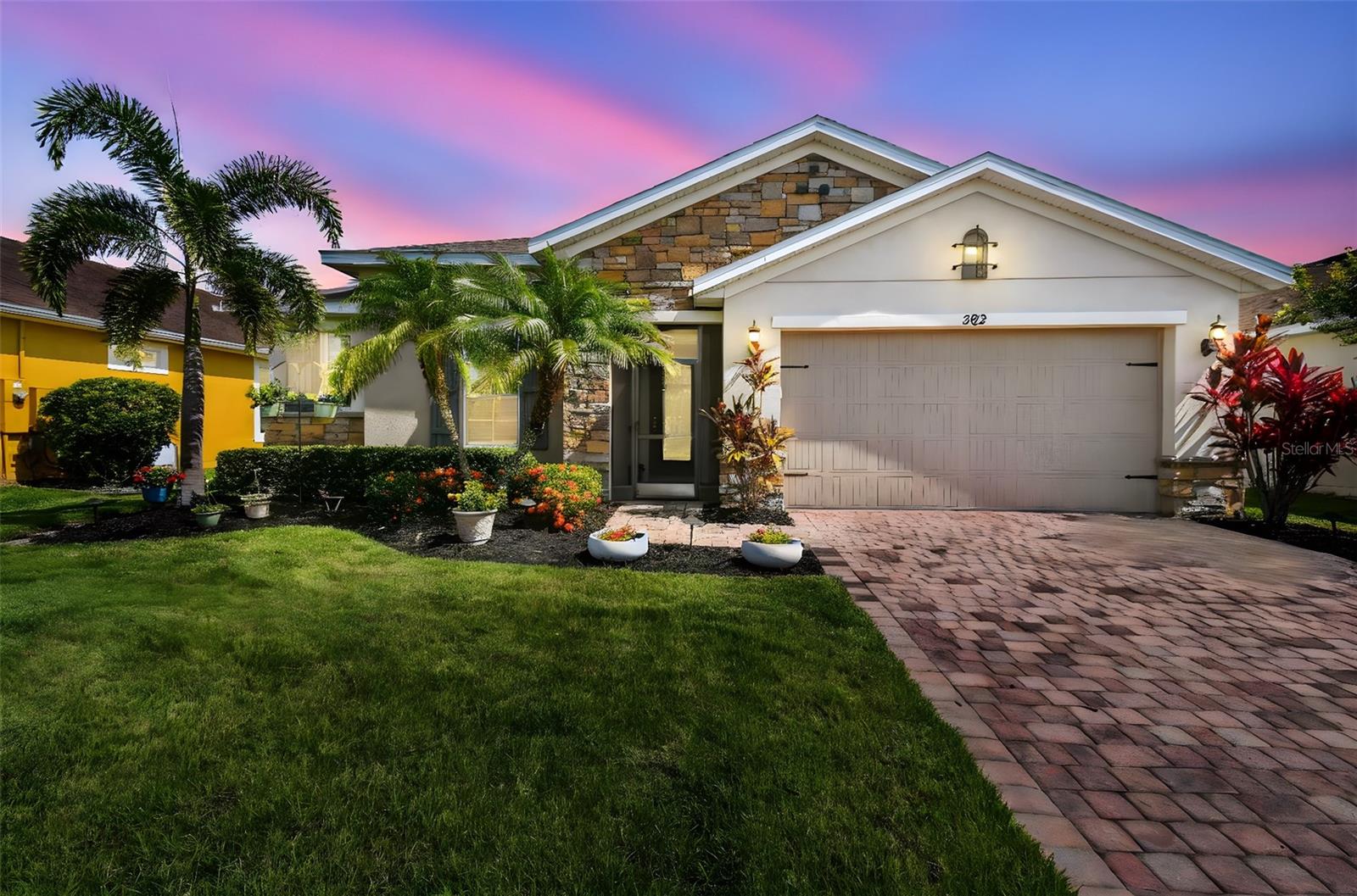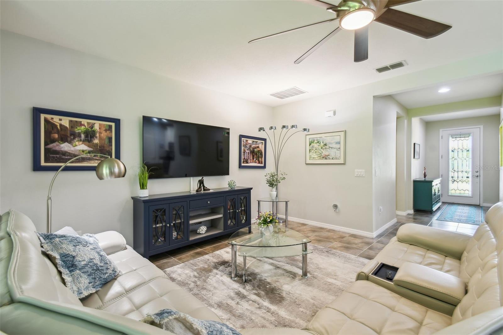 MOTIVATED SELLERS. DON'T PASS THIS ONE UP. HUGE PRICE REDUCTION. NEW PRICE $369,900. FURTHER, REDUCED HOMESTEAD TAXES BENEFIT THE BUYER THROUGH 2026. WINDOW TREATMENTS, EXTRA REFRIGERATOR, LANAI FURNITURE AND GARAGE STORAGE RACKS CONVEY WITH THE HOME. OTHER FURNITURE NEGOTIABLE OUTSIDE OF CONTRACT. This popular Cabella model has a 3-bedroom floor plan ALL with walk-in closets and LVT tile, NO CARPETS in this home. An extended garage with room for two cars AND a golf cart offering plenty of storage. The home has a large backyard with room for a pool and a fence for your furry friends. Open concept layout allows for seamless entertaining; The large great room gives you plenty of options for your furniture layout along with a spacious dining area offering a picturesque view of the Conservation. Prepare to be amazed by the kitchen with a large island, plenty of granite counter space, top-of-the-line stainless steel appliances, upgraded cabinets, and recessed lighting that makes this kitchen both stylish and functional. Plus, the walk-in pantry and additional storage space ensure you'll never run out of room. Retreat to the expansive primary bedroom, where you'll find ample space for a king-size bed and a great view of the conservation area. The en-suite primary bath features solid surface counters, a large walk-in shower and a large walk-in closet. The covered lanai has a beautiful waterfall feature that helps you relax with your favorite beverage while enjoying the tranquil atmosphere. Upgraded landscaping and outdoor lighting make your new home even more inviting no matter what the time. A new garage door opener and whole house surge protector round out all the fantastic features this home offers to the lucky new owner! This beautiful home is located near the Palms amenity center and the West Gate for easy entry and exit from the community. Solivita is a Tuscany Inspired 55+ active community located approximately 40 minutes from Disney World, Sea World, and the Orlando International Airport. Solivita amenities include more than you will ever have time for! 2 state of the art amenity centers with exercise & meeting rooms; a SOFTBALL diamond & field; 3 restaurants - 14 HEATED POOLS; PICKLEBALL and TENNIS courts; BOCCE BALL; Shuffleboard; Horseshoe; a BILLIARDS room; LIBRARY; a DOG PARK; over 250 resident clubs; 36 holes of CHAMPIONSHIP GOLF and SO MUCH MORE!! The HOA fees include 24 hour gated security and complete landscape maintenance and watering. Welcome to the "Solivita Family"!