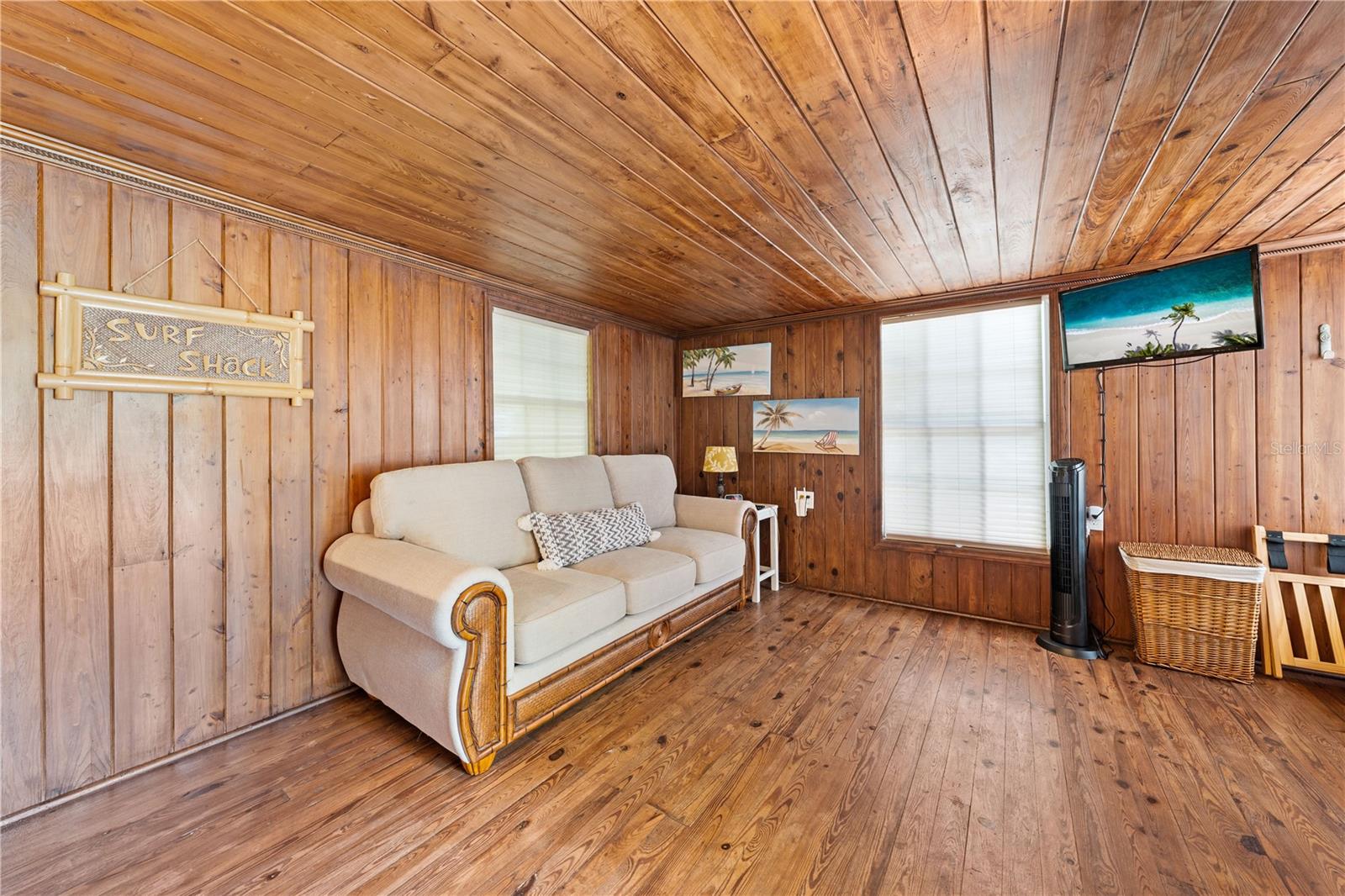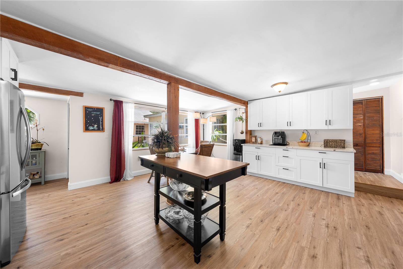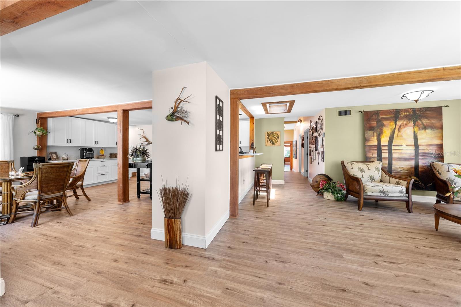 TROPICAL LAKEFRONT OASIS with GUEST COTTAGE on 1.64 acres - No HOA + 2 Large DETACHED GARAGES(3 Bays) and WORKSHOP. Escape to this beautifully updated 4-bedroom, 3-bath single-story home + Cottage situated on a true lakefront lot along the private shores of Fish Lake. The main home features 2,556 sq ft of living space (5,396 sq ft under roof), thoughtfully designed with natural light, soothing colors, and warm finishes throughout. The open-concept layout flows seamlessly for everyday living and entertaining, while the home’s tasteful updates and abundant windows create a serene, welcoming atmosphere. A fully equipped detached guest cottage includes its own kitchen and offers excellent flexibility for multigenerational living, private guest accommodations, or potential rental income. Outdoors, enjoy lush, Key West-inspired landscaping with mature plumeria, tabebuia, bougainvillea, cypress trees, and natural Florida brush. A charming bench swing hangs in the shade, adding to the peaceful, resort-style ambiance. The property also includes two detached garages — one of which could be converted into additional living or recreational space. The seller already has plans for the conversion. A wooden dock structure is already in place and and is ready to be rebuilt — offering incredible potential for enjoying lakefront living at its best. RECENT UPGRADES: Kitchen Remodel with Quartz countertops. The property has 2 AC units both have been updated(2018 &2023) Kitchen Remodel with Quartz countertops. Metal Roof front half & sky lights of Main Home(2019), Metal Roof on front half(2021) RUN BY PROPANE GAS: Kitchen Stove, Kitchen Water Heater & additional Rinnai Water Tankless Water Heater(2020) & Dryer. Exterior Main Electrical Panel and Pole(2021) Pool Heater(2017) Garage Doors(2018) Asphalt Driveway (2020) New Electrical Main Panel Outside & Pole(2021) The south side of Ames Haven is scheduled to become a Cul De Sac. Tucked away on 1.64 acres, this property offers the perfect blend of privacy, charm, and convenience — with easy access to the Turnpike, shopping, dining, and major commuter routes.