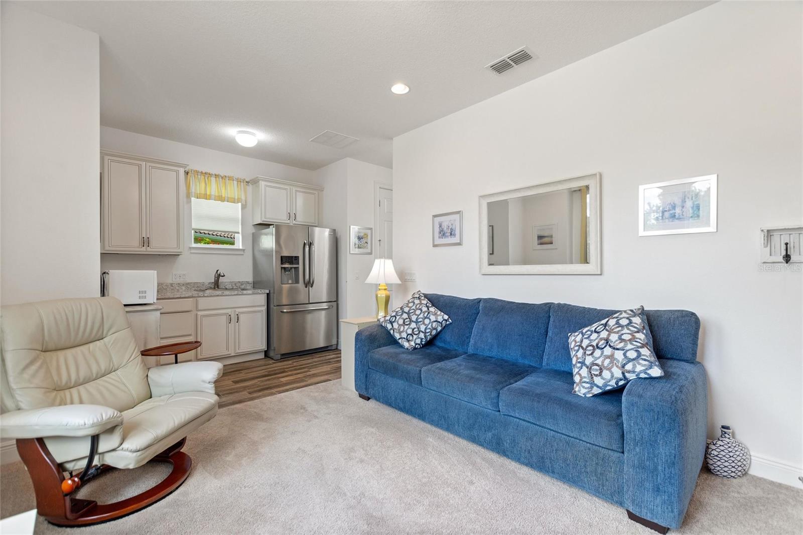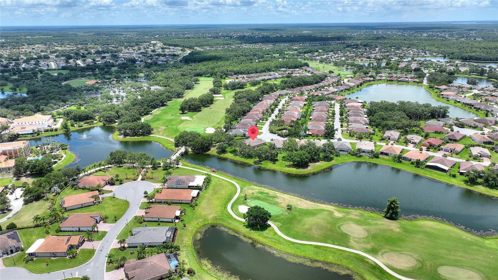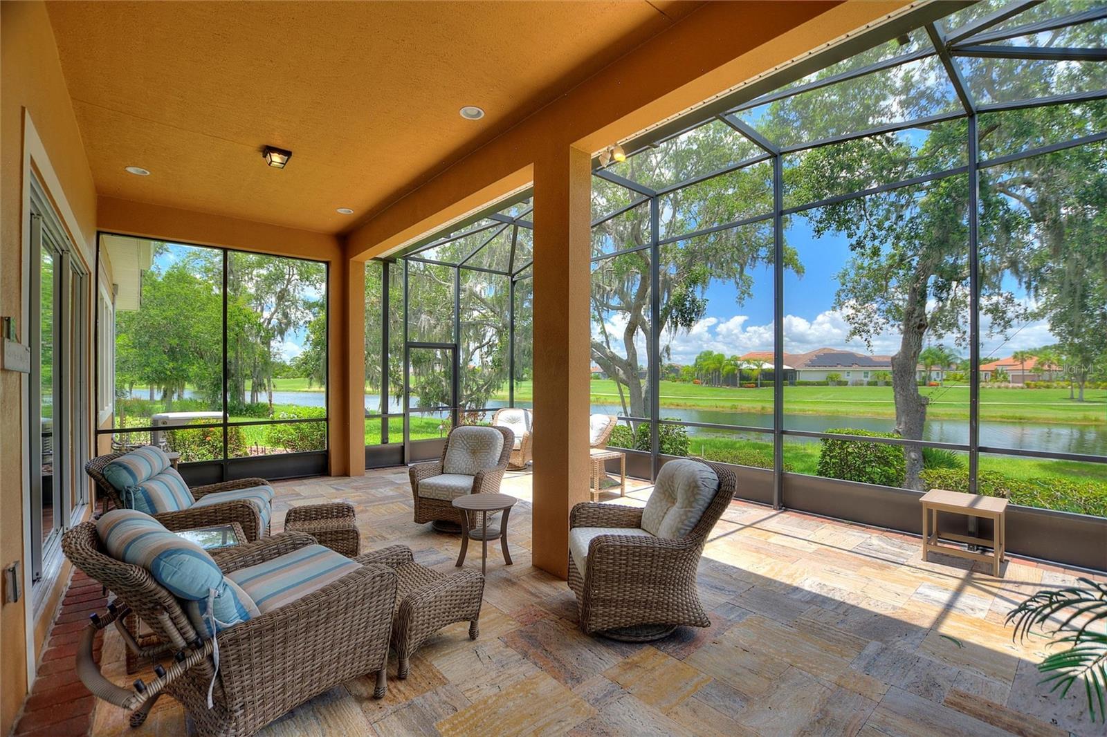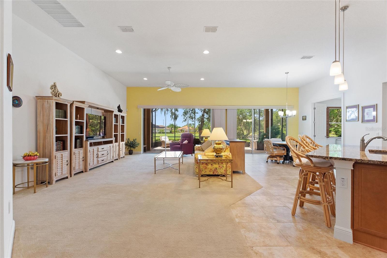 Discover luxury living in Solivita at 346 Treviso Drive with this rarely available MARSALA model, featuring a PRIVATE MULTI-GEN SUITE and sweeping WATER & GOLF VIEWS on a spacious pie-shaped lot. This unique home provides the ultimate private WORK-FROM-HOME option, in-law arrangement, or spacious retreat for family and friends! Find breathtaking views in every direction and the charming Solivita village, a short walk away. Step inside a large welcoming foyer and find thoughtful upgrades throughout; from a leaded glass entry door to 8-foot interior doors and custom trim work; every detail meticulously considered. The great room impresses with twin 12’ triple sliders with views to the water, creating a seamless indoor-outdoor experience into a large lanai featuring travertine flooring and recessed lighting. The home is open plan, the kitchen displays upgraded cabinetry, premium hardware, a striking backsplash, and a custom glass pantry entry—a perfect mix of style and practicality. Retreat to the deluxe over-sized owner’s suite, and a spa-inspired bathroom including a step-in hydro tub and separate shower, dual sinks, a water closet, and a spacious walk-in closet that has a convenient with direct access to the well-designed laundry room. The rest of the main home includes a well-sized guest bedroom with walk-in closet, a full bath with a transom window, and an adjacent double-door den/flex space with large windows. The STANDOUT FEATURE that makes this luxurious home unique is the fully functional private suite with southern exposure, with separate portico entry, a cozy living room, a galley-style kitchenette, well-appointed bath complete with a shower, double vanity sink, walk-in closet, and bedroom. This separate space offers comfort and privacy, making it perfect for hosting family or friends. Additional practical luxuries include dual AC controllers, a Propane Tankless Hot-Water Heater switchable to the standard electric hot water heater, and a Pentair whole-house cartridge water filtration system, a hardwired security system, a handy drop zone at the garage entry, and propane Automatic Whole-House Generator for peace of mind. The spacious 3-car garage features a new epoxy coating with decorative chips, Saf-T-Racking for storage. Other items upgrade exterior landscaping with border curbing and extensive nighttime lighting, full tile roof, and fresh exterior paint, rounding out this amazing package. Don’t let the opportunity slip by to own this incredible property; schedule your private tour of 346 Treviso today and start living your Florida dream. **PLEASE SEE THE 3D MATTERPORT TOUR** Make the award-winning Active 55+ Community of Solivita your new home today. Featuring 14 Pools, 2 Championship 18 Hole Golf Courses, Tennis, Pickleball, basketball, softball, over 240 clubs, spa services, state-of-the-art exercise facilities on 4,200 acres of conservation. Take your golf cart for a spin to dine and share a cocktail with friends; or to enjoy the many activities that Solivita COMMUNITY enjoys. The HOA includes landscaping, irrigation AND high-speed fiber TV and Internet. HCA Florida Poinciana Hospital is directly across the street along with the new Poinciana Lakes Plaza, with lots of shopping and restaurants.