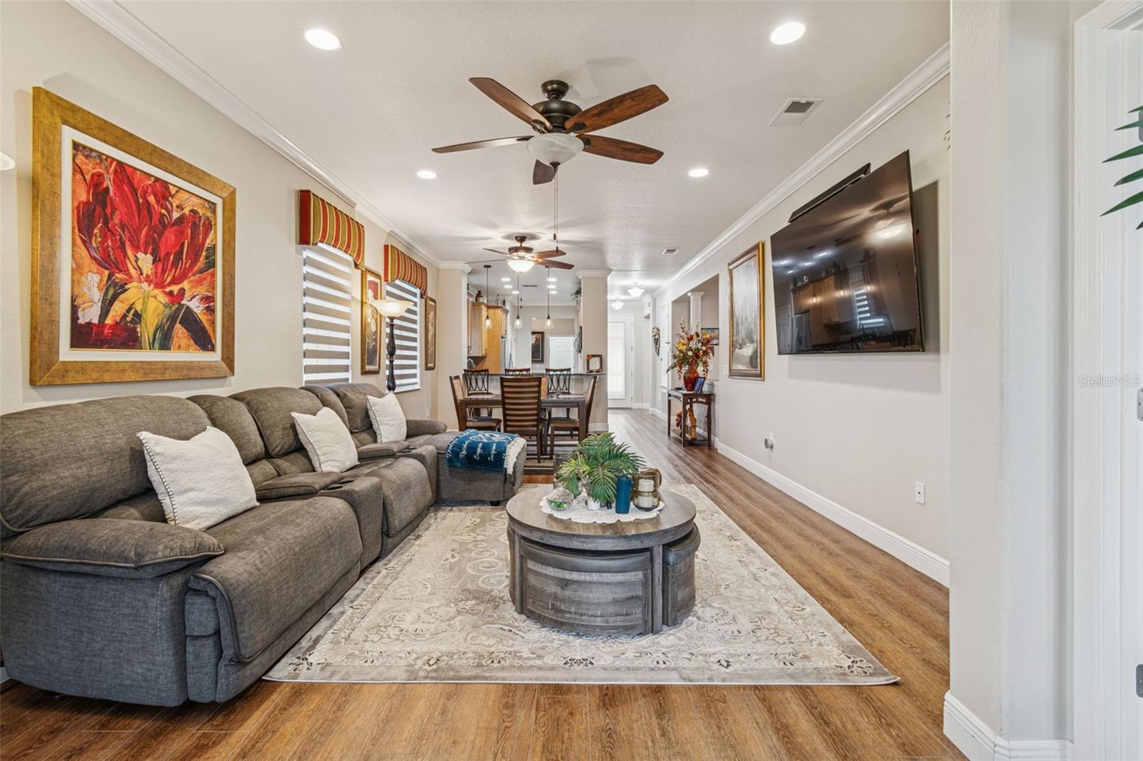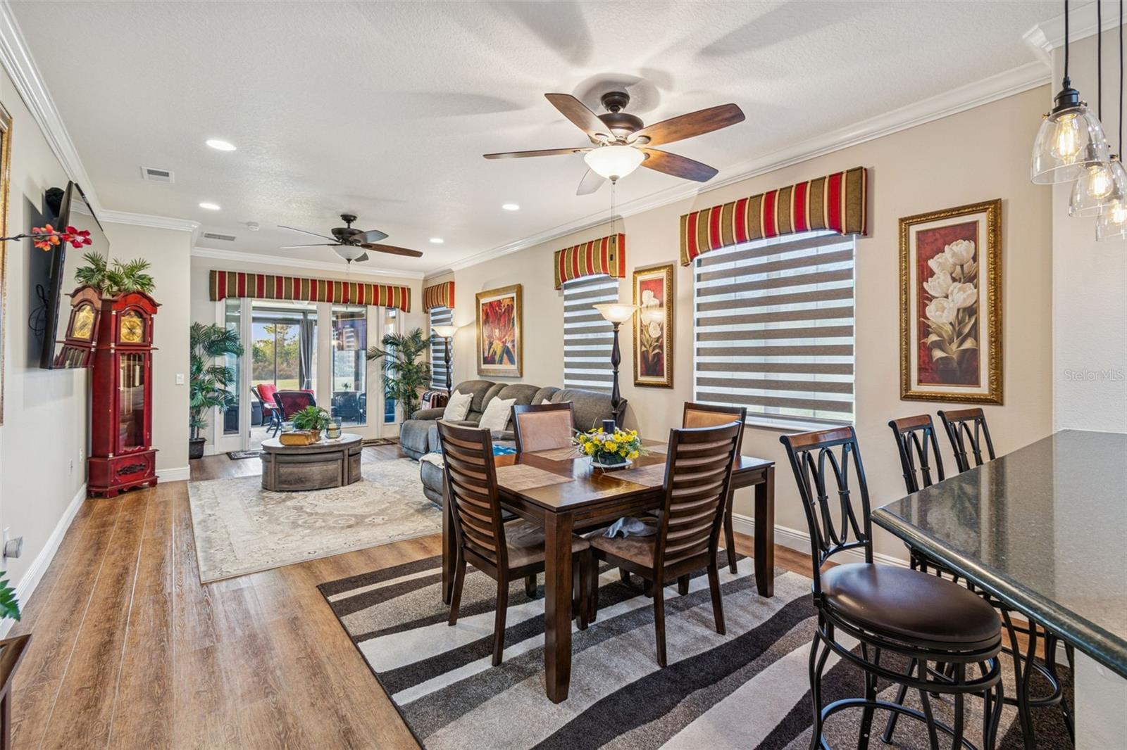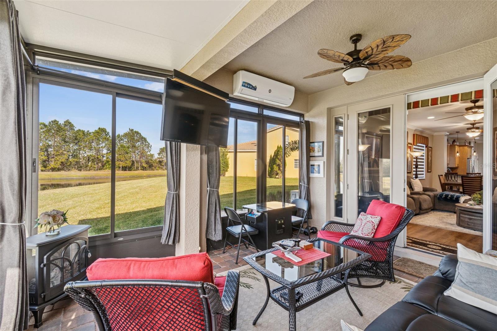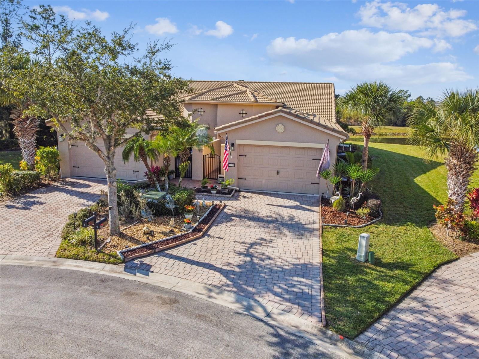 One or more photo(s) has been virtually staged. Come see one of the finest homes in Solivita’s Courtyards of Montelena! This sought-after Cortina model offers 2 bedrooms, 2 bathrooms, and a den/study, perfectly situated on a rare double lot at the end of a quiet cul-de-sac with stunning water and conservation views—just minutes from the Village Center amenities. Enter through the private, screened front courtyard and leaded glass door into a bright, open-concept living space with views of the water and conservation. The kitchen features granite countertops, tile back splash, an eat-at bar, a separate breakfast nook, and ample storage, making it ideal for both everyday living and entertaining. The primary bedroom suite enjoys serene water and conservation views and includes a walk-in closet and an en-suite bath with dual sinks and a large walk-in shower with built-in seating. A versatile den/study or media room is conveniently located between the primary and guest bedrooms. The guest bedroom and bath are positioned at the front of the home, offering privacy for visitors. You’ll spend most of your time in the four-season Lanai, complete with its own split A/C system, where you can enjoy majestic sunsets and daily visits from deer and waterfowl. Additional features include a 1.5-car garage with abundant storage and a dedicated golf cart bay. Recent upgrades include a new HVAC system, new water heater, and new refrigerator, dishwasher, and range. HOA fees cover resort-style amenities, complete landscape maintenance, cable and internet, exterior painting, and power washing, providing low-maintenance Florida living at its best. This exceptional home truly captures the Solivita lifestyle—don’t miss it!  Solivita is a premier 55+ community, offering residents an exceptional lifestyle with state-of-the-art amenities. Enjoy a fully equipped fitness center, dance and aerobics studios, and an impressive array of recreational options including 14 heated swimming pools, two heated spas, tennis courts, pickleball courts, shuffleboard, bocce ball, billiards, and an art gallery. The community also features three on-site restaurants and two championship 18-hole golf courses. With a full calendar of activities and events, there’s always something new to explore and enjoy. This home is conveniently located near a hospital and medical office complex, shopping, dining, and a brand-new shopping center—featuring Sprouts, Outback and other popular retailers—offering the perfect balance of privacy, convenience, and an active lifestyle.
