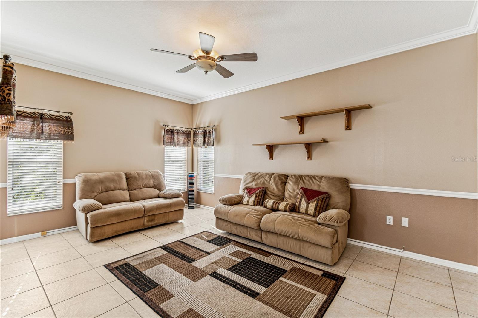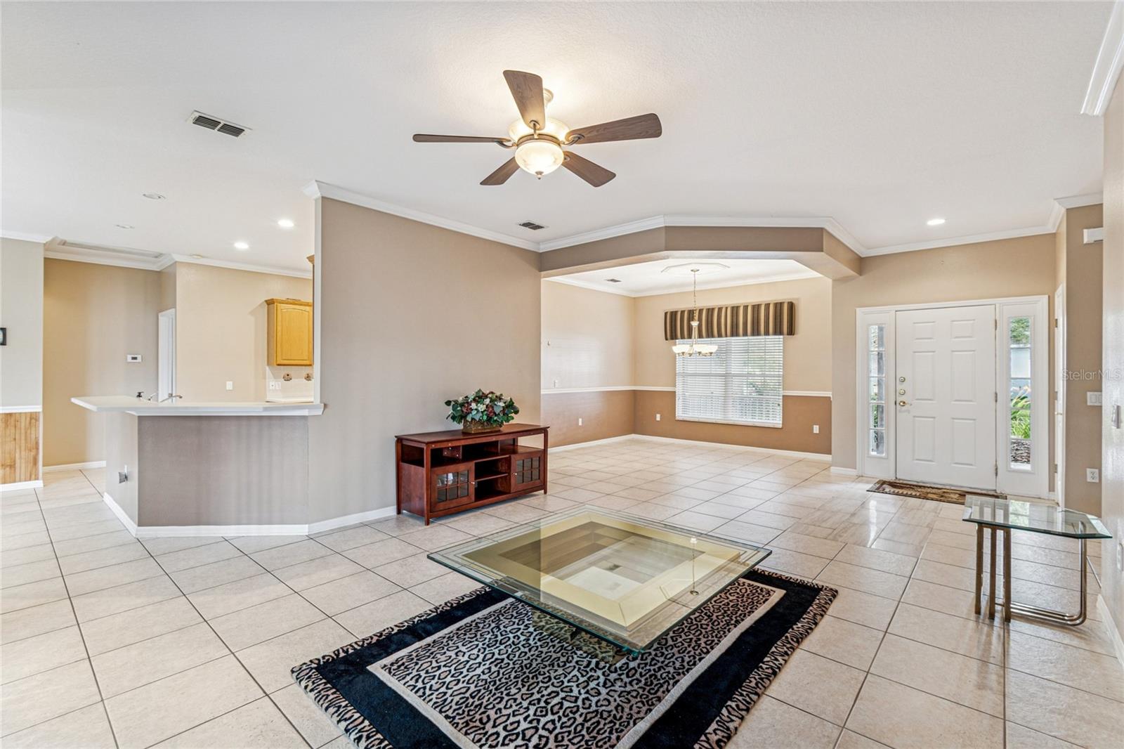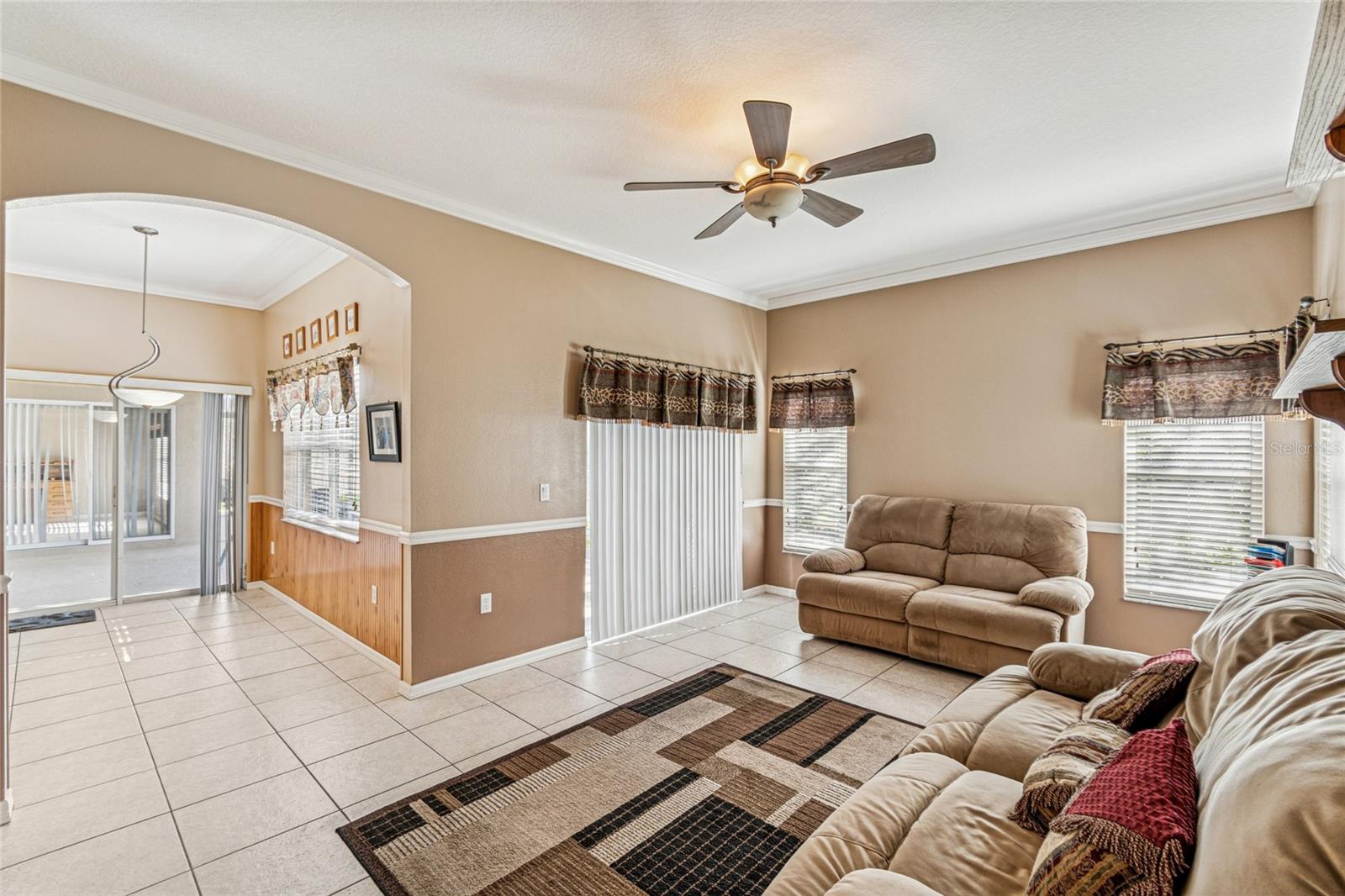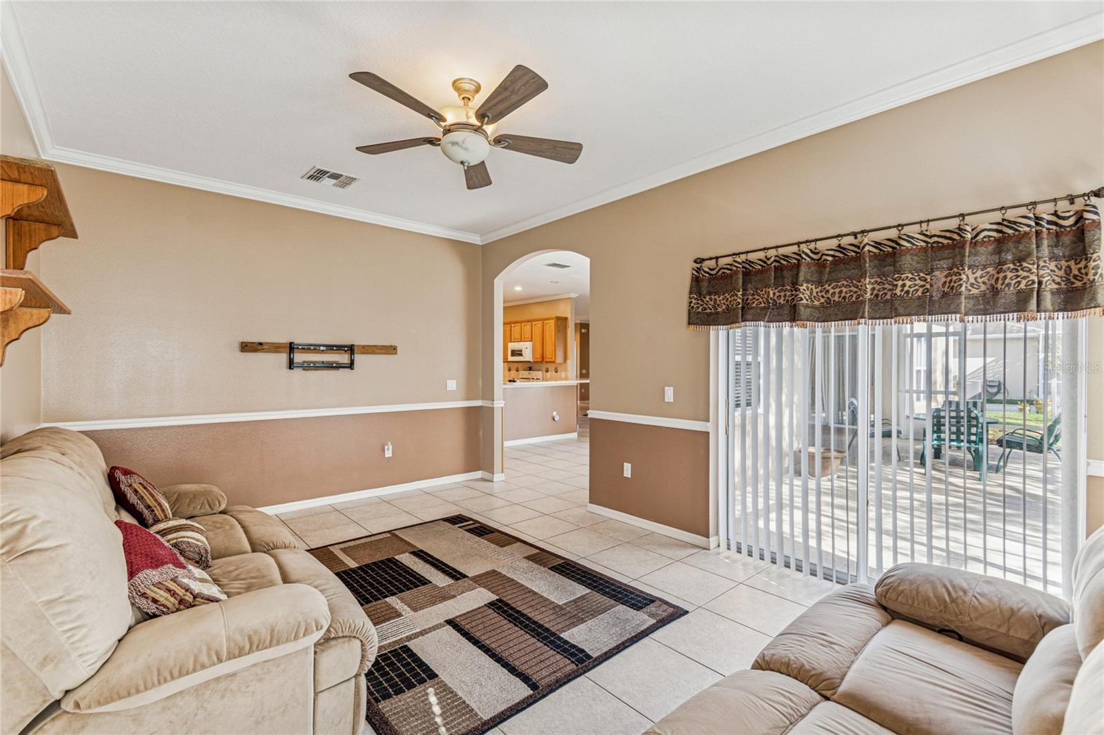 Located in a quiet neighborhood this popular Carnegie model offers comfort, style, and thoughtful design. Crown molding throughout adds a refined touch, while the split-bedroom floor plan provides privacy with two bedrooms on opposite sides of the home. The spacious primary suite features two walk-in closets and a well-appointed en-suite bath. The kitchen is both functional and inviting with maple cabinets with pull-out shelves, Corian countertops, tile backsplash, and a cozy eat-in area accented with wainscoting. Chair rail detailing enhances the dining room and family room, adding classic character. Enjoy Florida living on the extended lanai with covered ceilings, perfect for relaxing or entertaining. Additional highlights include two full bathrooms, a new roof (2016), and new HVAC system (2020) for peace of mind. A wonderful opportunity to own a well-maintained home in a desirable, amenity-rich location. Ltd. Home Warranty transfers with ownership.Solivita is a premier 55+ community, offering residents an exceptional, resort-style lifestyle with outstanding amenities. Enjoy a state-of-the-art fitness center, dance and aerobics studios, and an impressive variety of recreational options including 14 heated swimming pools, two heated spas, tennis courts, pickleball courts, shuffleboard, bocce ball, billiards, and an art gallery. The community also features three on-site restaurants and two championship 18-hole golf courses. With a full calendar of activities, clubs, and events, there is always something new to explore and enjoy. This home is conveniently located near a hospital and medical office complex, shopping and dining, and a new shopping center featuring Sprouts, Outback, and other popular retailers, offering the perfect balance of privacy, convenience, and an active lifestyle.