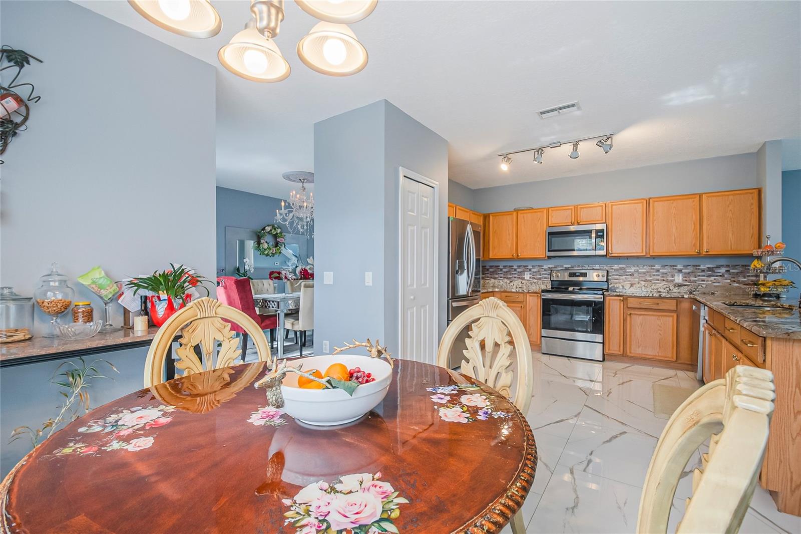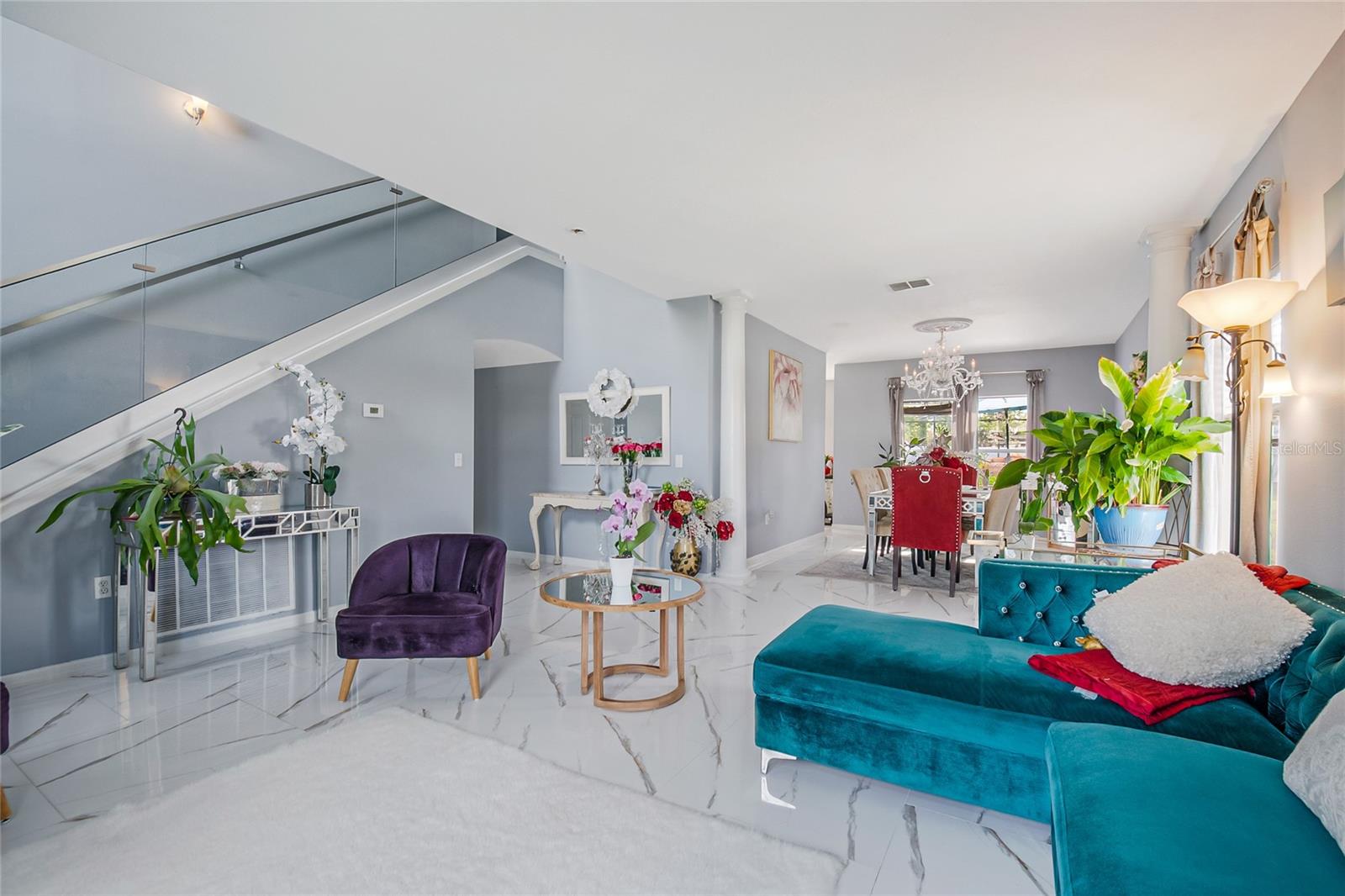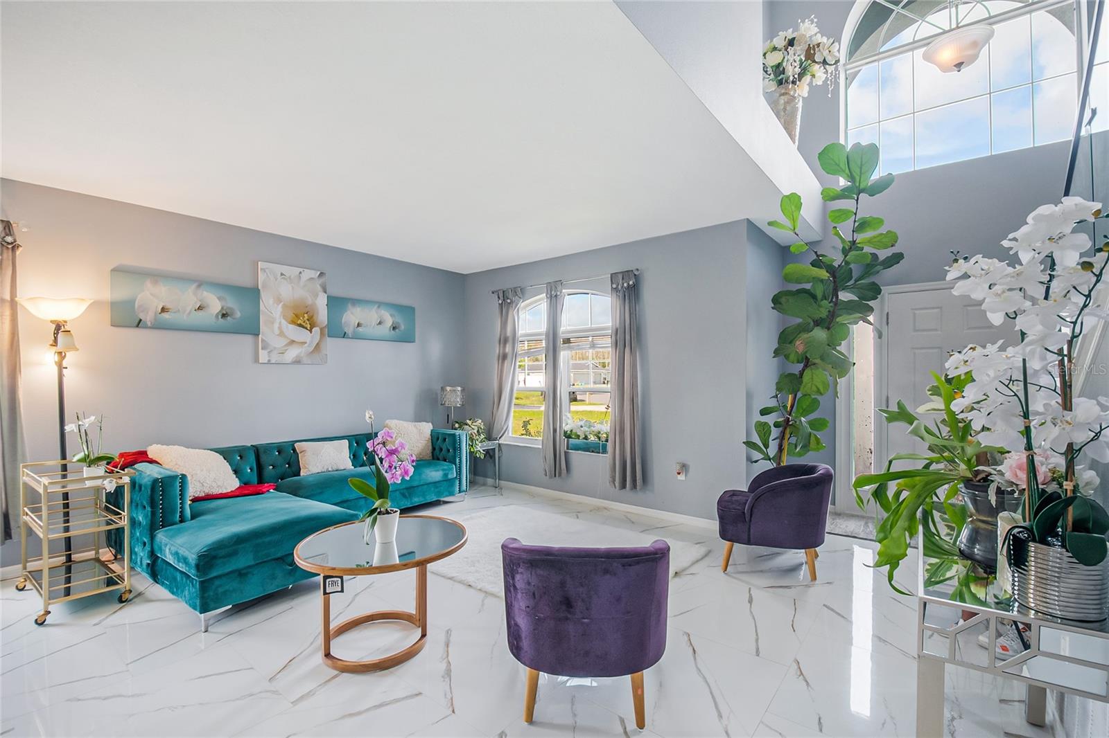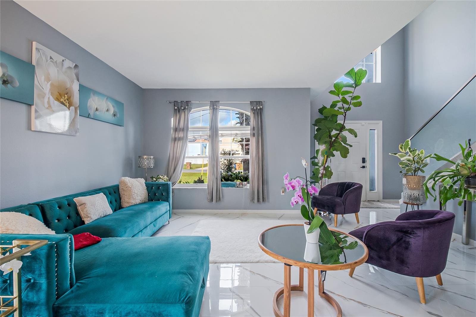 Welcome to this beautifully upgraded two-story pool home offering spacious living, stylish finishes, and the perfect Florida outdoor lifestyle. From the moment you enter, you’ll notice the soaring ceilings, abundant natural light, and open layout designed for both everyday living and entertaining. The main living areas feature oversized tile flooring, while the bedrooms and staircase showcase rich wood-look flooring for added warmth and character. The kitchen is well-appointed with granite countertops, stainless steel appliances, ample cabinet space, and a breakfast bar that opens to the main living and dining areas. The spacious primary suite provides a relaxing retreat with a large bedroom, soaking tub, separate shower, and plenty of room to unwind. Step outside to your own private backyard oasis featuring a screened-in pool and spa, dramatic rock-style waterfall accents, expansive paver deck, covered lanai, and fenced yard—ideal for entertaining, relaxing, or enjoying the Florida sunshine year-round. This home combines comfort, function, and resort-style outdoor living in one impressive package. Conveniently located near shopping, dining, major roadways, and area attractions.