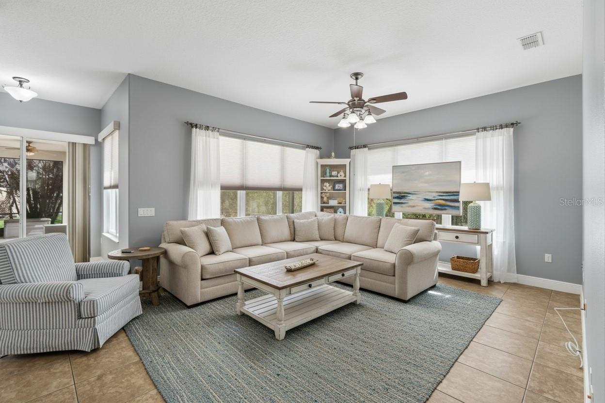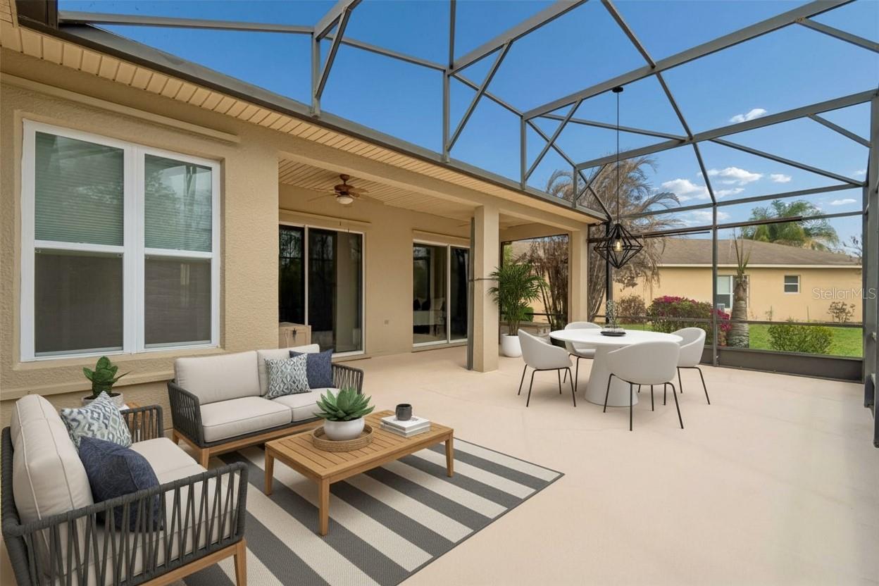 One or more photo(s) has been virtually staged. Nestled on a quiet cul-de-sac, this well-maintained Operetta model sits on an oversized, custom-landscaped conservation home site offering both privacy and serene natural views. This spacious home features 3 bedrooms, 2.5 bathrooms, a den/study, dining area, Florida room, and an extended screened lanai—perfect for comfortable living and entertaining. Enter through the screened front porch into a bright and open great room, where sliding glass doors frame peaceful conservation views and lead to the expansive screened lanai. The chef’s kitchen is a true centerpiece, complete with skylights, abundant custom cabinetry, generous counter space, a breakfast bar, and a sunny breakfast nook overlooking the backyard. The Florida room provides additional flexible living space with lanai access and beautiful backyard views—ideal for entertaining or relaxing. A private den/study with double-door entry offers the perfect space for a home office or hobby room. The primary suite is a tranquil retreat featuring a tray ceiling, two walk-in closets, and scenic conservation views. The en-suite bathroom includes a garden tub, separate walk-in shower, dual vanities, and a dedicated makeup space. Two guest bedrooms and a fully updated guest bathroom with a custom walk-in shower (2023) are thoughtfully positioned on the opposite side of the home for added privacy. Step outside to the extended screened lanai and enjoy expansive, private views of the oversized backyard and conservation area. There’s ample room to add a pool or fence—perfect for outdoor living and pets. Additional features include: Laundry room with custom cabinetry. Extended 2-car garage with epoxy storage space, utility tub, pull-down attic stairs, a side entry door and Phantom screen doors for added airflow and convenience. CDD DEBT PAID OFF! The HOA fee offers exceptional value and includes landscape maintenance, irrigation, cable TV, and Fiber Optic internet. Major upgrades include: Generac whole-house generator; Double-pane hurricane-rated windows & shutters; New roof (2021); Solar attic fan (2021); HVAC system with UV light; Upgraded bathrooms and window treatments;This exceptional home combines space, privacy, and thoughtful upgrades—ready for you to enjoy Florida living at its best. Solivita is a premier 55+ community, offering residents an exceptional lifestyle with state-of-the-art amenities. Enjoy a fully equipped fitness center, dance and aerobics studios, and an impressive array of recreational options including 14 heated swimming pools, two heated spas, tennis courts, pickleball courts, shuffleboard, bocce ball, billiards, and an art gallery. The community also features three on-site restaurants and two championship 18-hole golf courses. With a full calendar of activities and events, there’s always something new to explore and enjoy. This home is conveniently located near a hospital and medical office complex, and shopping center.