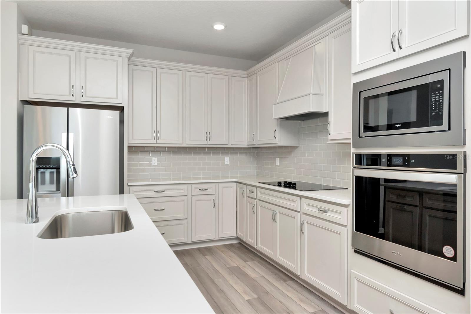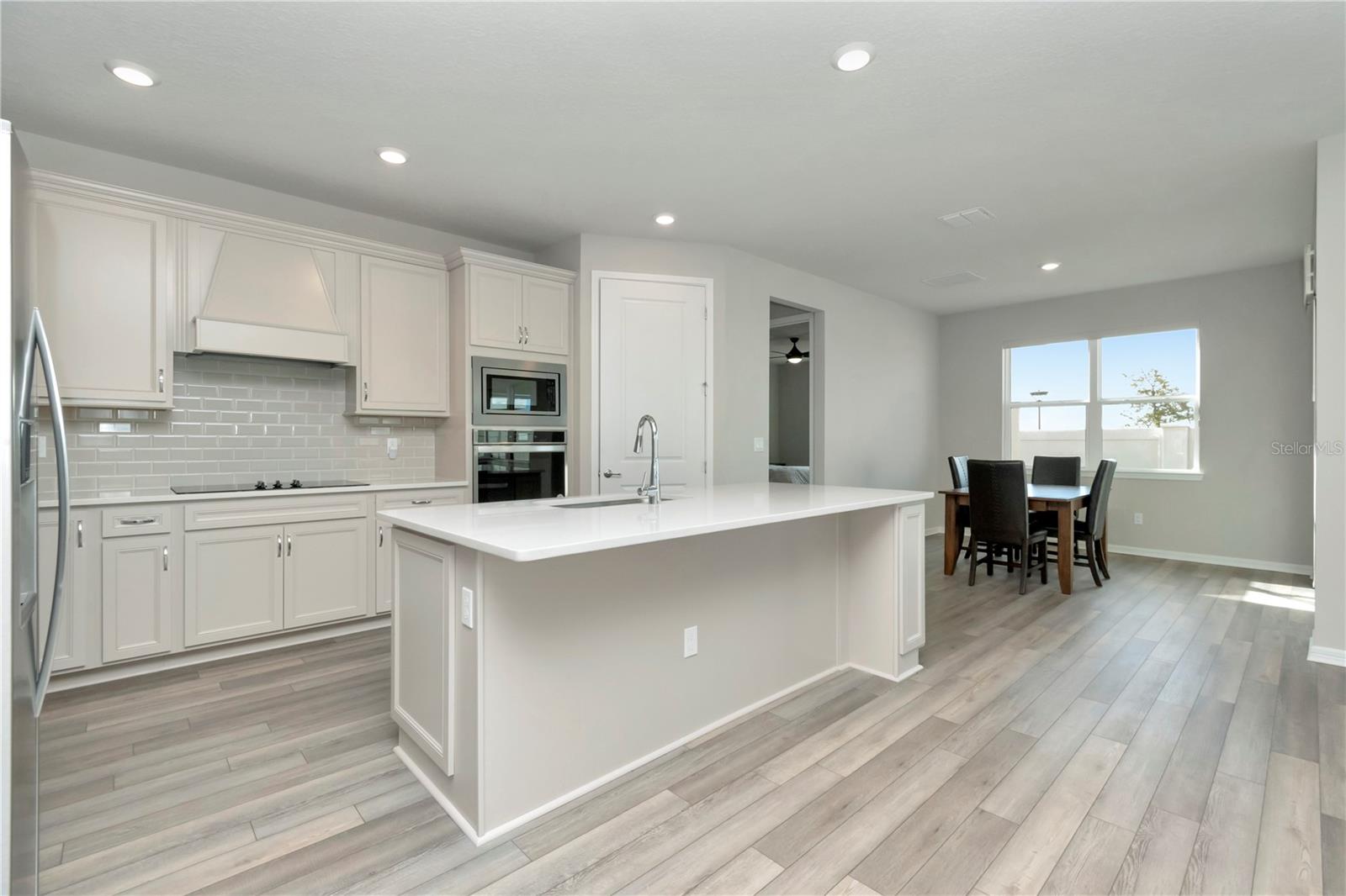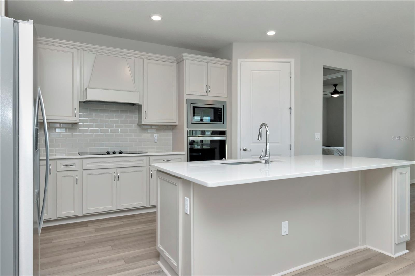 Prepare for the next exciting chapter of your life in the BRAND-NEW 55+ gated community of Tohoqua Reserve in Kissimmee. Built by Pulte Homes in 2023, this TURN-KEY move-in ready residence features the coveted Mystique floor plan, enhanced with numerous custom upgrades, and is situated on a homesite with no rear neighbors. This spacious home spans 2,056 square feet of heated living space and includes 3 bedrooms, 2 bathrooms, a great room, and a bonus/flex room, all designed with an open-concept layout. All doors are 8' tall. The exterior front is complete with a lush green lawn, landscaping, outdoor lighting, and full irrigation system. Decorative designer 8’ modern glass-inlay on the front door opens to an impressive foyer, featuring NEW luxury vinyl flooring that seamlessly flows throughout the great room, flex/bonus room, hallways, kitchen, and café. For the culinary enthusiast, the gourmet kitchen boasts upgraded 42” wood Glacier Gray cabinets topped with crown molding, a coordinating wood canopy hood over a smooth cooktop, a light gray beveled subway-style tile backsplash, color coordinated Quartz countertops, a suite of stainless appliances, including a built-in wall oven and microwave, a walk-in pantry, and counter height center island with breakfast bar and space for bar stools. Adjacent to the kitchen is the café area, bathed in natural light from strategically placed windows and sliding glass doors, to the lanai. The kitchen is open to the spacious great room, making it an ideal space for gatherings and relaxation. The primary suite is a luxurious retreat with an ensuite bath, featuring a double vanity in Glacier Gray, Quartz countertops with rectangle undermount sinks, a stunning seamless glass and tiled walk-in shower with bench seat, a private water closet, and linen closet, and generously size walk-in closet. The 3-way split bedroom floor plan ensures privacy for family and guests, with the secondary bathroom mirroring the Glacier Gray vanity with Quartz counter and rectangle undermount sink, along with a tiled tub shower. Both bathrooms boast Heather Gray porcelain tile floors, as does the laundry room which also features a wash sink. A door from the laundry room leads to a spacious storage area. The bedrooms offer stain-resistant Ornamental Gate carpets. The garage floor has an upgraded epoxy finish. Step outside to the covered lanai patio with a pull-down shade screen which is adorned with brick pavers. A huge backyard with a luxurious green lawn has a vinyl fence along the property line and is large enough for a pool. Tohoqua Reserve offers a range of amenities for both indoor and outdoor enthusiasts, including a clubhouse with meeting rooms, space for social events, a fitness center, a resort-style pool, sports courts, fire pits, a dog park, miles of outdoor fitness trails, and a Village Center featuring restaurants, shops, a farmers' market, and more. The location provides easy access to major roadways, including US-192 and the Florida Turnpike, as well as proximity to the Orlando International Airport, Orlando's renowned amusement parks, outlet malls, medical facilities, sporting events, and much more. Don't miss out on this opportunity to own a model-perfect home extensively upgraded in Tohoqua Reserve. Why wait to build when you can make this exceptional residence yours today? Schedule your appointment without delay! Room Feature: Linen Closet In Bath (Primary Bedroom).
