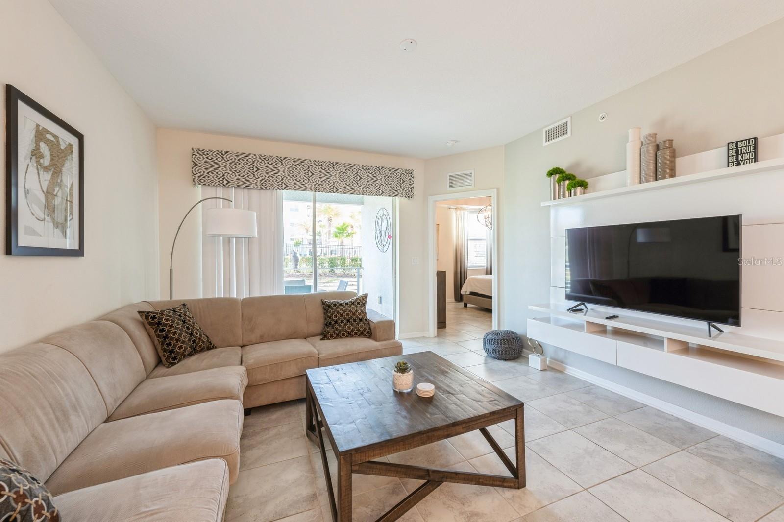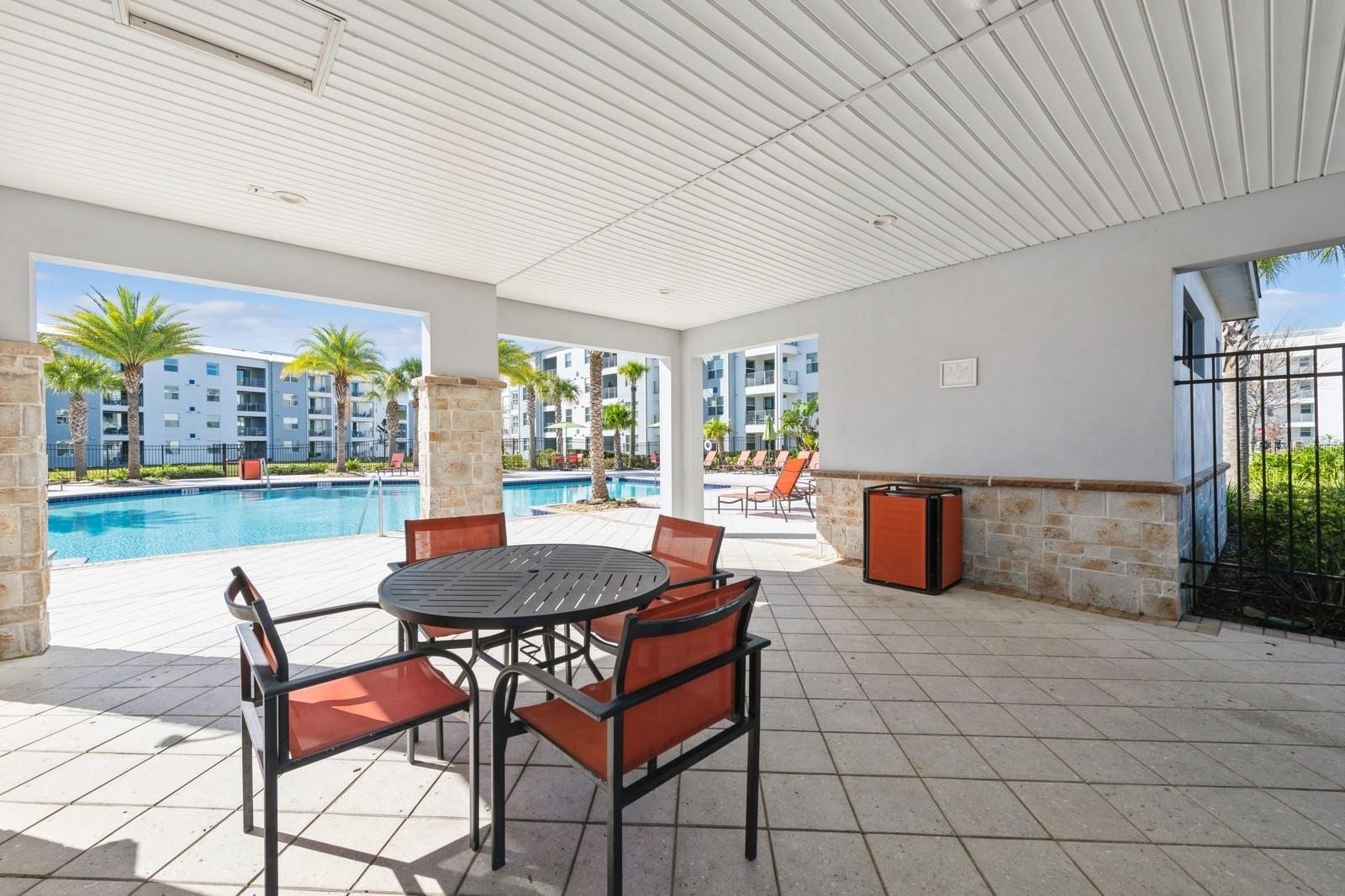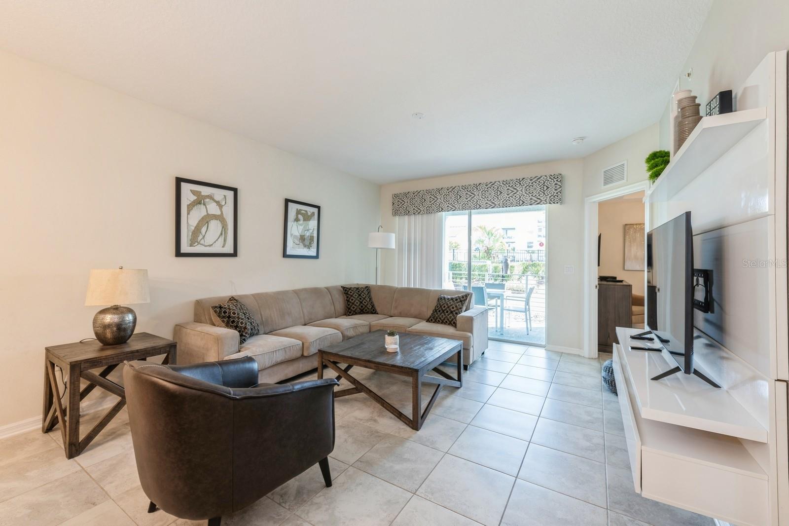 Beautiful end unit with 3 beds and 2 baths. It has been upgraded to tile floors throughout the entire unit. Features a covered lanai with beautiful pool view. Spacious kitchen with big island and quartz countertops. It has been professionally decorated.