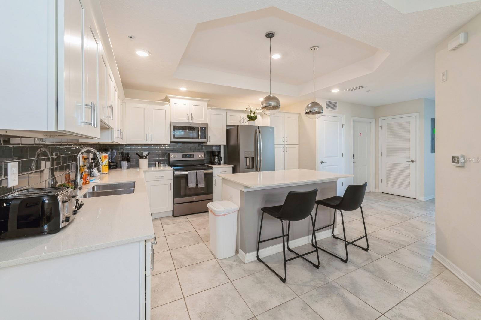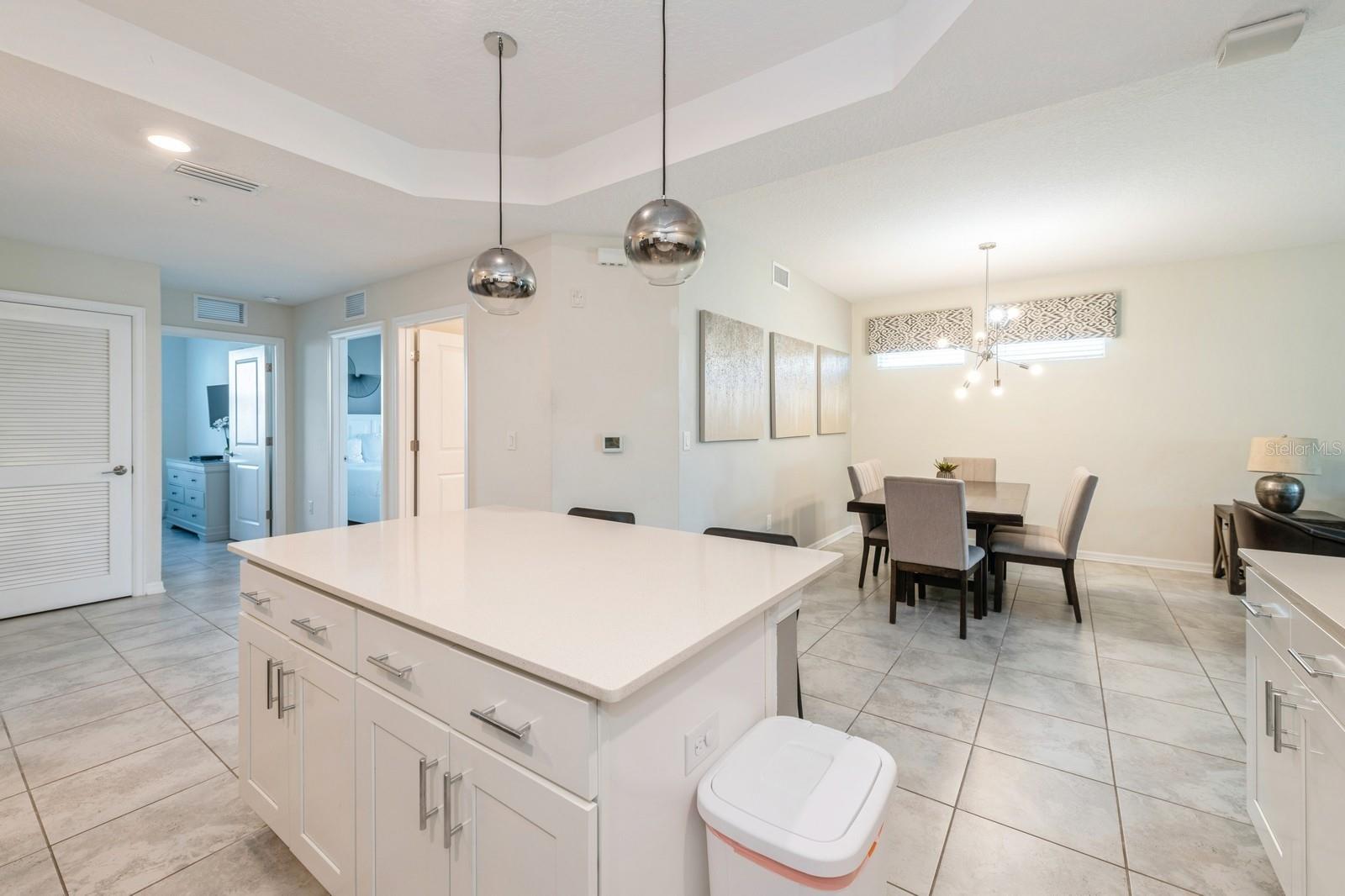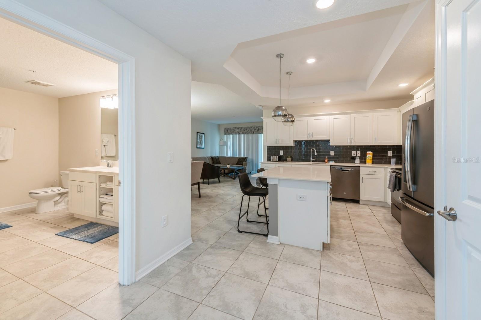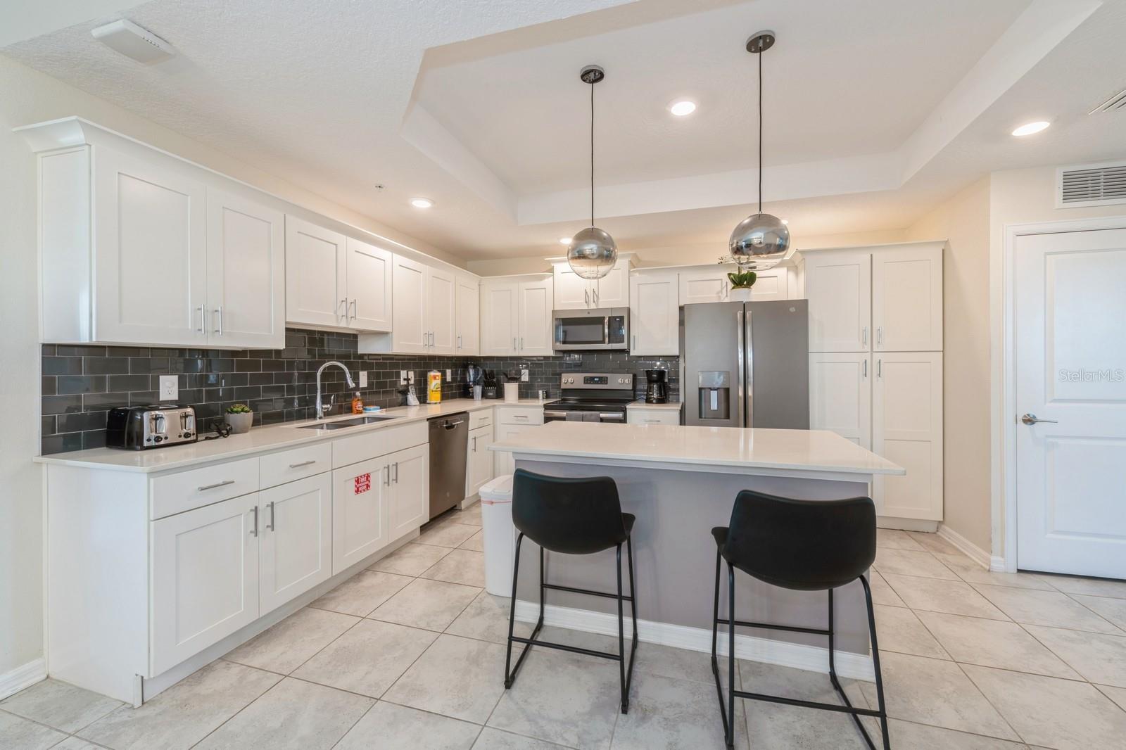 Beautiful end unit with 3 beds and 2 baths. It has been upgraded to tile floors throughout the entire unit. Features a covered lanai with beautiful pool view. Spacious kitchen with big island and quartz countertops. It has been professionally decorated.