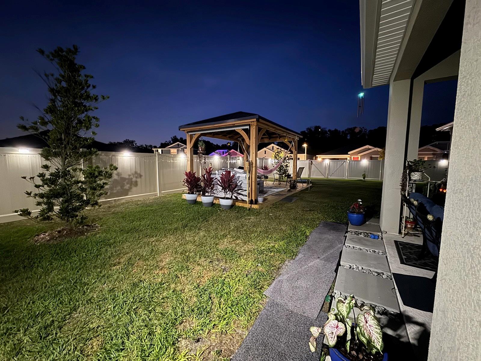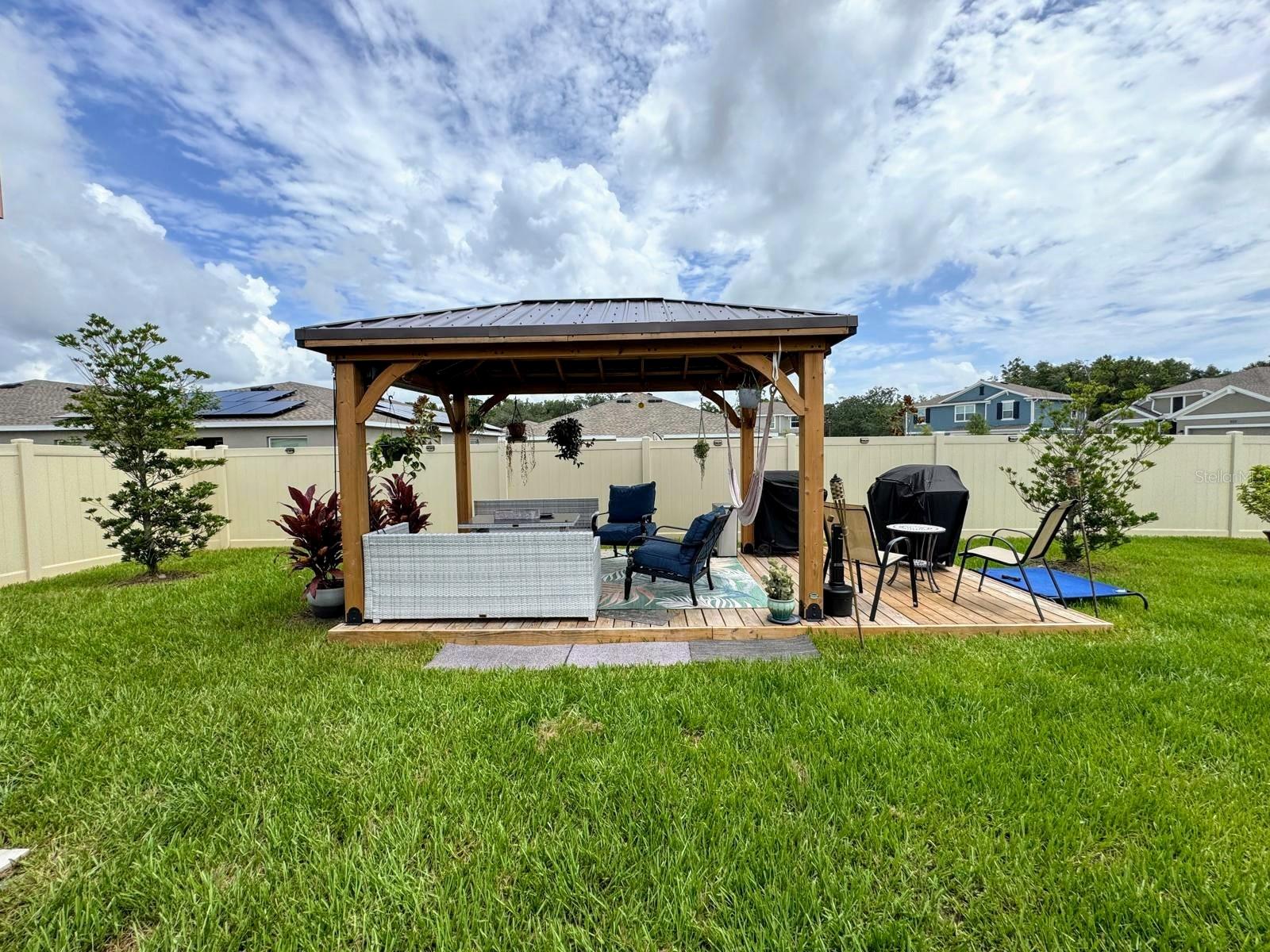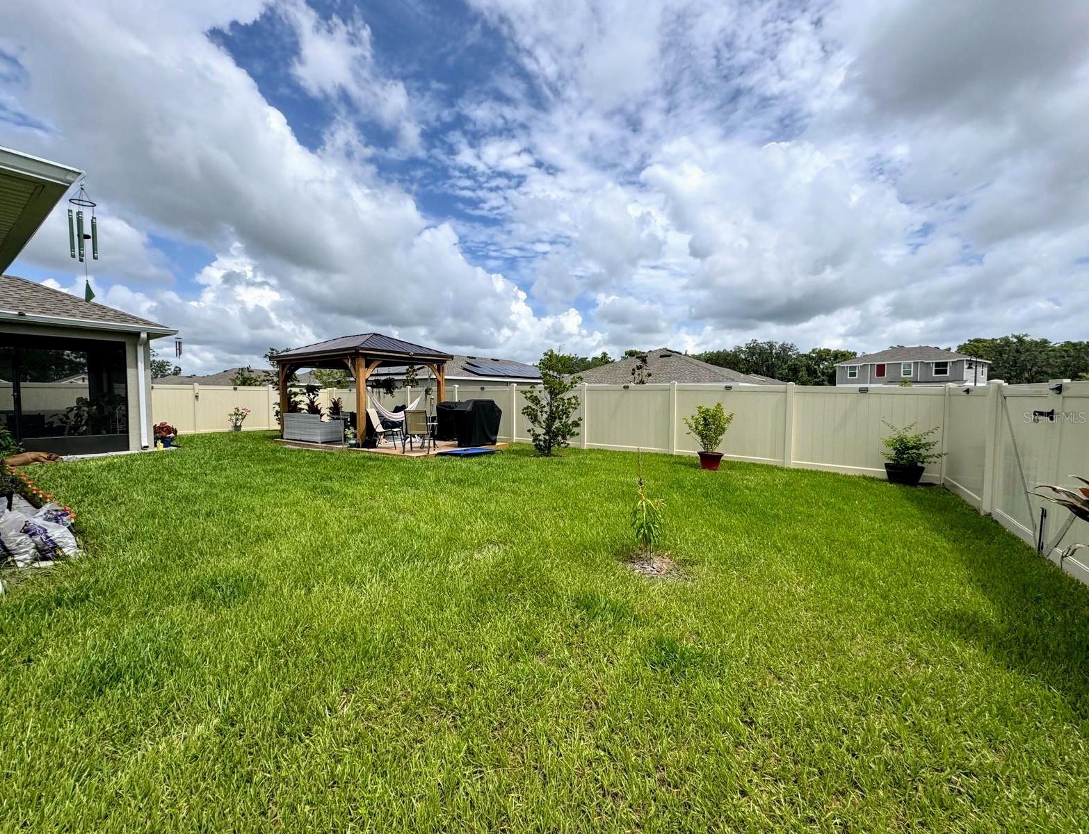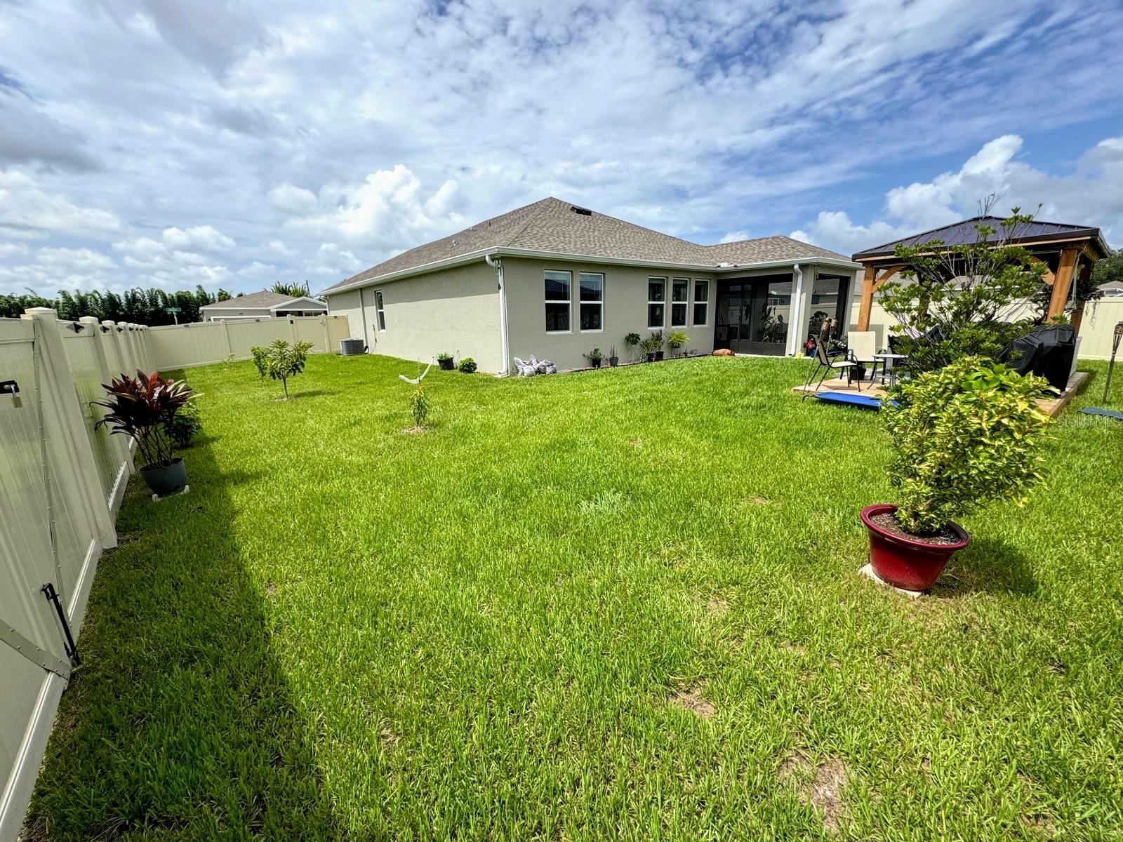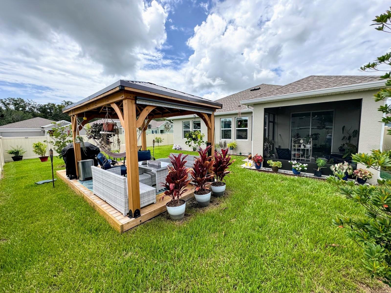 This amazing corner lot home includes 4 bedrooms and 2 full bathrooms. The heart of the home has a center island which overlooks the dining and living room, great for entertaining. The owner's suite features a spacious bathroom and a roomy walk-in closet. Your family and guests will enjoy 3 additional bedrooms and extra bathroom. Built in 2023, so almost new. This home has over 15,000 in upgrades that you won't find in a newer model. These include the following: the lanai was screened, fence all around property and solar lights at the fence for a nice ambiance at night. The gazebo and deck with its hammock create relaxing times in this beautiful oasis of plants, fruit trees and flowers. The patio is extensive with enough space left to build your own private pool. Storey Creek offers residents luxury amenities in a great location and easy access to major Florida highways, such as SR 535, I-4, and US 192. Amenities include a fully equipped fitness center, clubhouse, resort-style swimming pool, tennis courts, soccer park, basketball court, dog park, playground and walking trails. Great location near shopping, dining, entertainment and within 30 min to theme parks like Disney, Universal and other main attractions. Schedule a showing today! It won't last in the market!