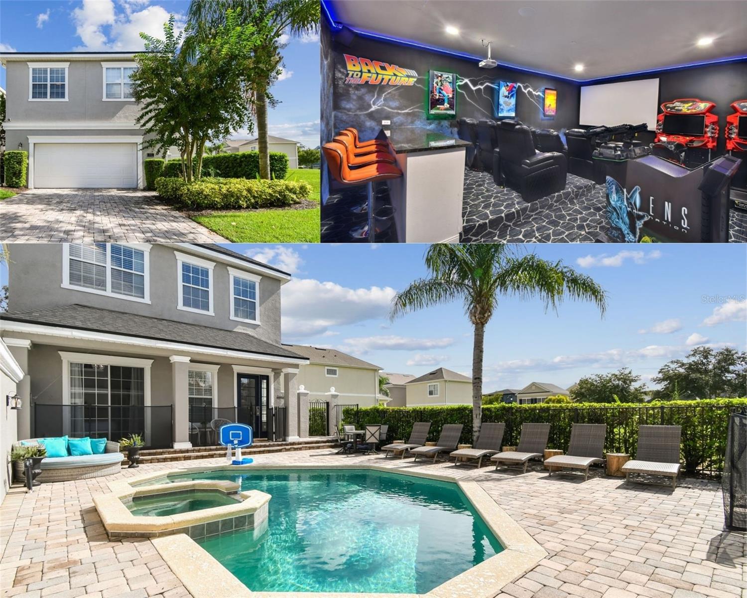 UPGRADES and more upgrades have been done recently on this professionally themed and furnished, turn-key home. Seller is motivated. ACTIVE CLUB Membership! Brand new roof and exterior painting done March 2024; brand new patio and balcony furniture; A/C system brand new! Use it as primary, second home or an investment. It comes fully furnished with high-end furniture and electronics. Over $200,000 of upgrades in this destination home. Located in this world class Reunion Resort and Golf, water parks and dining, is six miles away from Disney World. This courtyard-style home features the main house and detached apartment separated by heated pool. Home is 3,091 sq ft has 5 bedrooms/4 full bathrooms and 2 half baths PLUS private theater/arcade room, gives you plenty of space to have privacy, entertain and play. Also comes with an oversized heated pool and spa and brand-new lounge chairs. ‘Back to the Future’ theme custom painted murals movie theater, Dolby surround sound, 4K HD projector and large 120-inch screen PLUS arcade area; “Fast and Furious’ Super Bike side-by side racing games; ‘Aliens’ arcade shooting game. Upstairs will take you to ‘Star Wars’ theme domain. Great size bedroom and huge loft area converted to a tie-fighter themed bunkbed bedroom and private space with Xbox/Nintendo switch gaming systems. The main house opens to a private room downstairs then to the living and kitchen area. Relax and spread out in the living and to outside patio for more seating and entertainment space. Looking out to open space of play area. Comes with fully equipped kitchen and dining area. Every space is utilized in this home. Experience ‘Harry Potter’ custom mural themed under stairs nook with PS4 games and bathroom. Upstairs experience ‘Disney’ theme! Custom mural painted to the stair wall. Bedroom and bath with ‘Mickey Mouse playhouse’ custom mural painted theme with full size bunk beds and Pluto’s doghouse with slide. The room comes with an Obie projector interactive playground with over 100 games. The back room leads to the owner’s suite with elegant bed and light fixtures. Seating area for extra space. Glass doors lead you to your private balcony with brand new patio furniture. The home is a destination and the resort offers Palmers, Watson, and Jack Nicklaus golf courses experience. Seller has active club membership and new owner will be eligible to membership. Call and schedule your showing today!