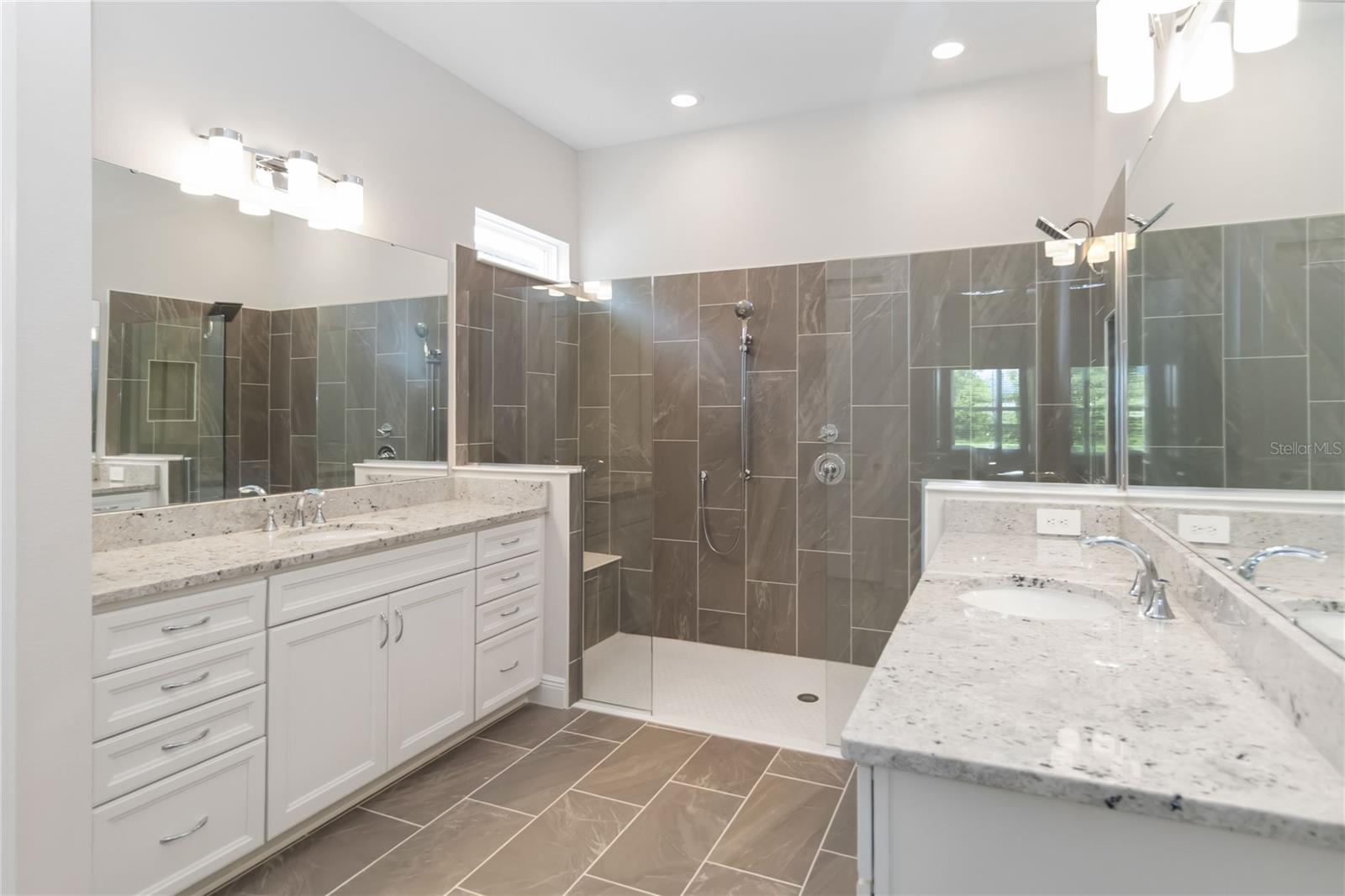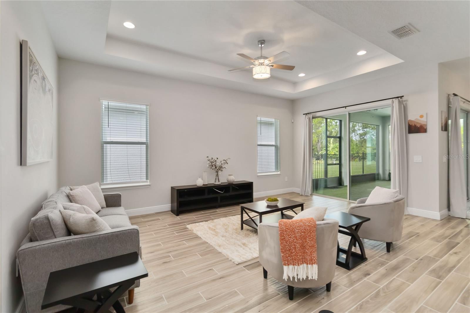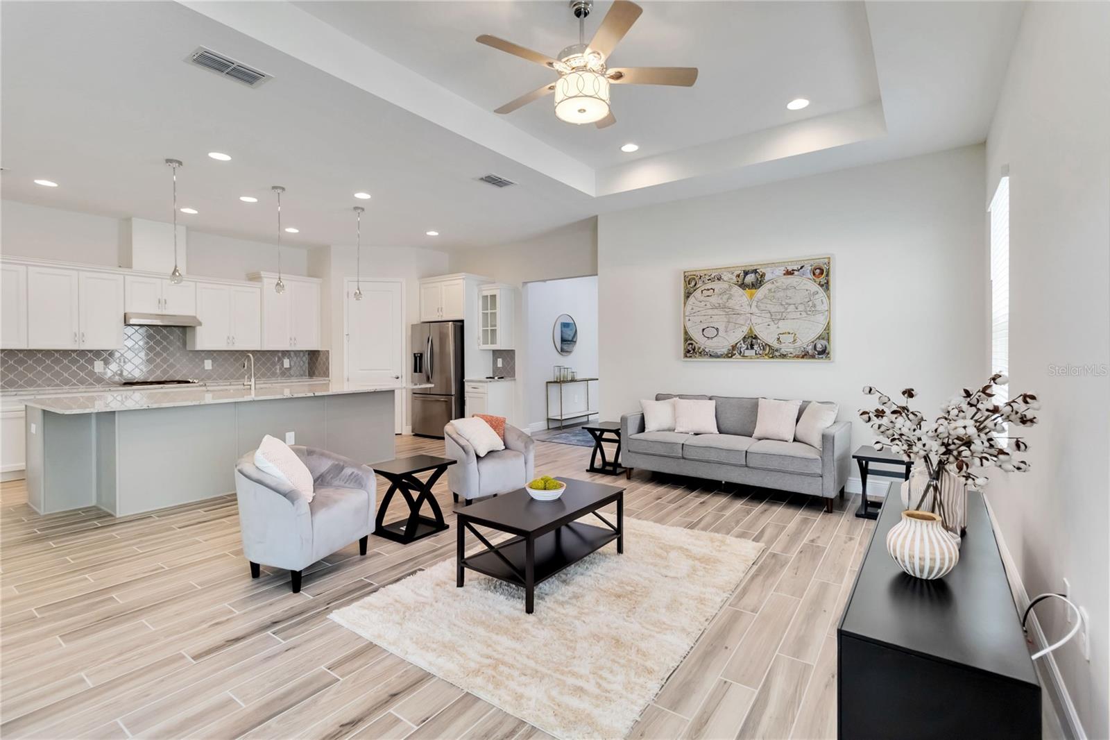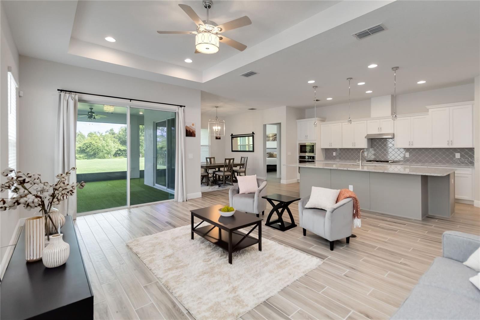 Make sure you view the 3D Walkthrough and video walkthrough! This spacious 3-bedroom home checks all the right boxes. With over 2,300 sq ft, it offers two ensuite bedrooms, 2.5 bathrooms, and gorgeous tile plank flooring throughout (yes, no carpet!). The kitchen feels fresh with granite countertops, white cabinetry, a tiled backsplash, and a generously sized pantry. You'll love the oversized laundry room with extra storage, and the primary suite has room to spread out, plus dual vanities in the bath. Out back, a large screened lanai with multiple ceiling fans overlooks peaceful green space—no rear neighbors, just you and the breeze. The Four Seasons in Orlando is the PREMIER 55+ active adult community, and situated in a convenient location; with direct access to all major roads & the turnpike, as well as grocery stores, medical facilities, shopping and restaurants; not to mention minutes away from Disney World Parks & Resorts, Universal Studios and Epic Universe. Piece of mind = 24 Hour Guard Gates, so you can feel comfortable not being at your home for weeks or months at a time. Countless amenities await you in the state of the art clubhouse; including an area for arts & crafts, yoga, aqua aerobics and private parties. Enjoy not only one, but two resort style & zero entry pools, as well as an 18-hole golf course. 24 HOUR GUARD GATED COMMUNITY | HOA INCLUDES LANDSCAPING, IRRIGATION WATER, ROOF MAINTENANCE & EXTERIOR PAINTING. Seller motivated, bring all reasonable offers!