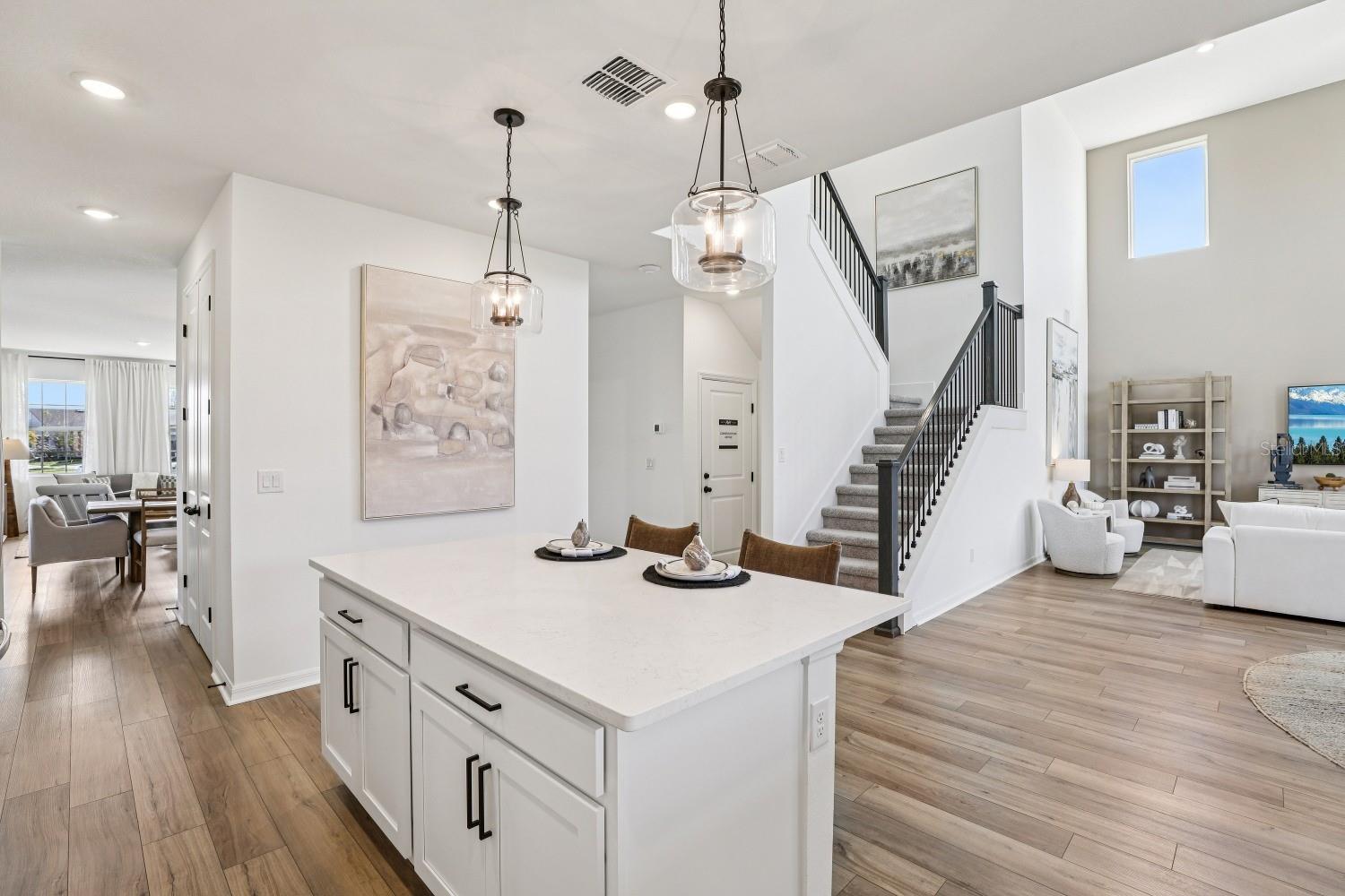 Model Home! Discover effortless living in this beautifully Griffin model featuring the AW Collection Harmony, showcasing warm and inviting finishes throughout. Nestled within a quiet Kissimmee community, this residence offers the perfect balance of comfort, style, and convenience. Inside, enjoy thoughtful design details such as quartz countertops, 42" cabinetry, and durable vinyl plank flooring throughout the main living areas. The open, two-story family room features soaring ceilings and abundant natural light, creating a bright and welcoming atmosphere. Step outside to the covered outdoor space—an ideal setting for relaxing or entertaining. Perfectly positioned near the best of Central Florida, this home is just 37 minutes from Orlando International Airport, 33 minutes from world-famous Disney theme parks, and 30 minutes from the charming town of Celebration. With great schools nearby and popular Harmony Collection features throughout, this home delivers everyday comfort with an elevated touch.